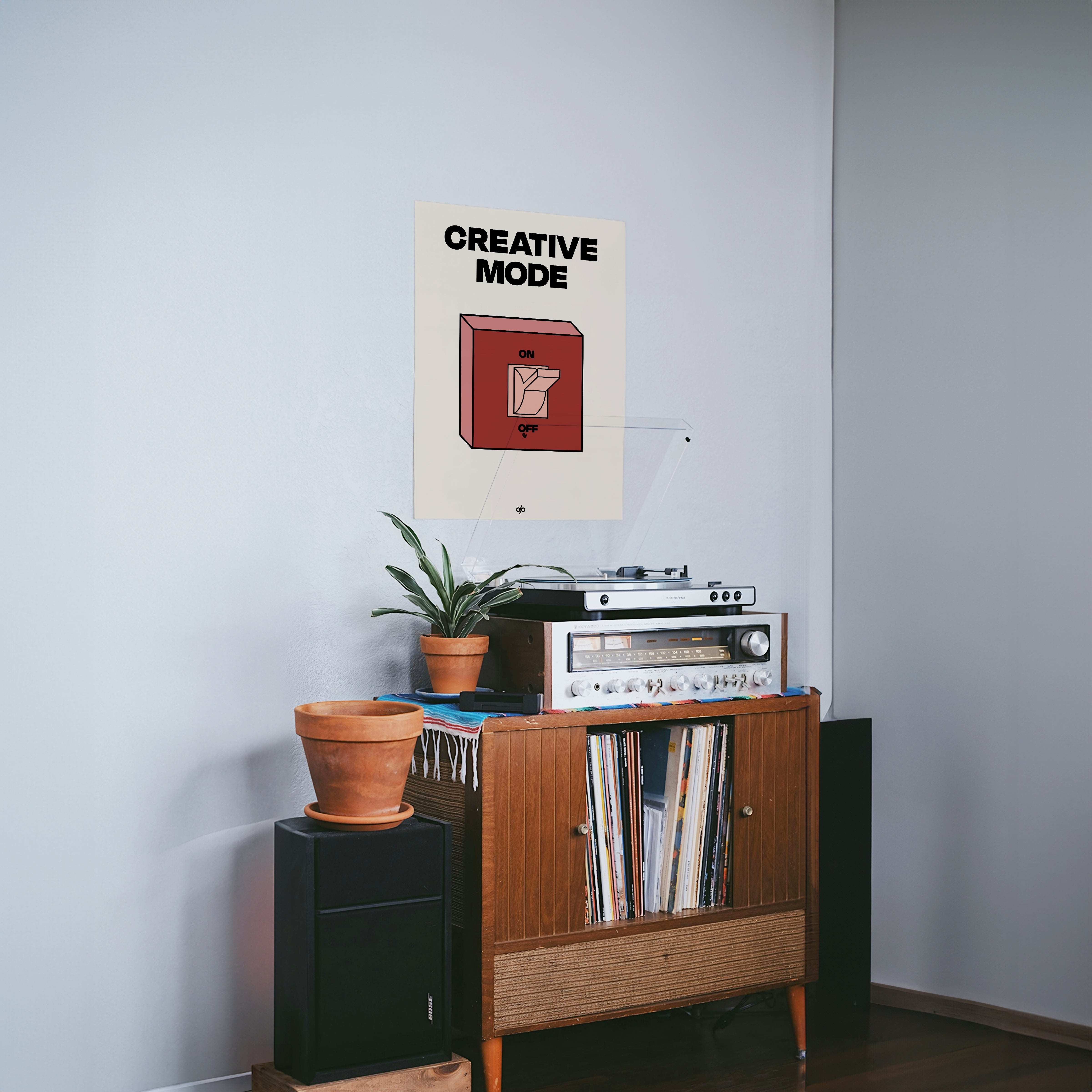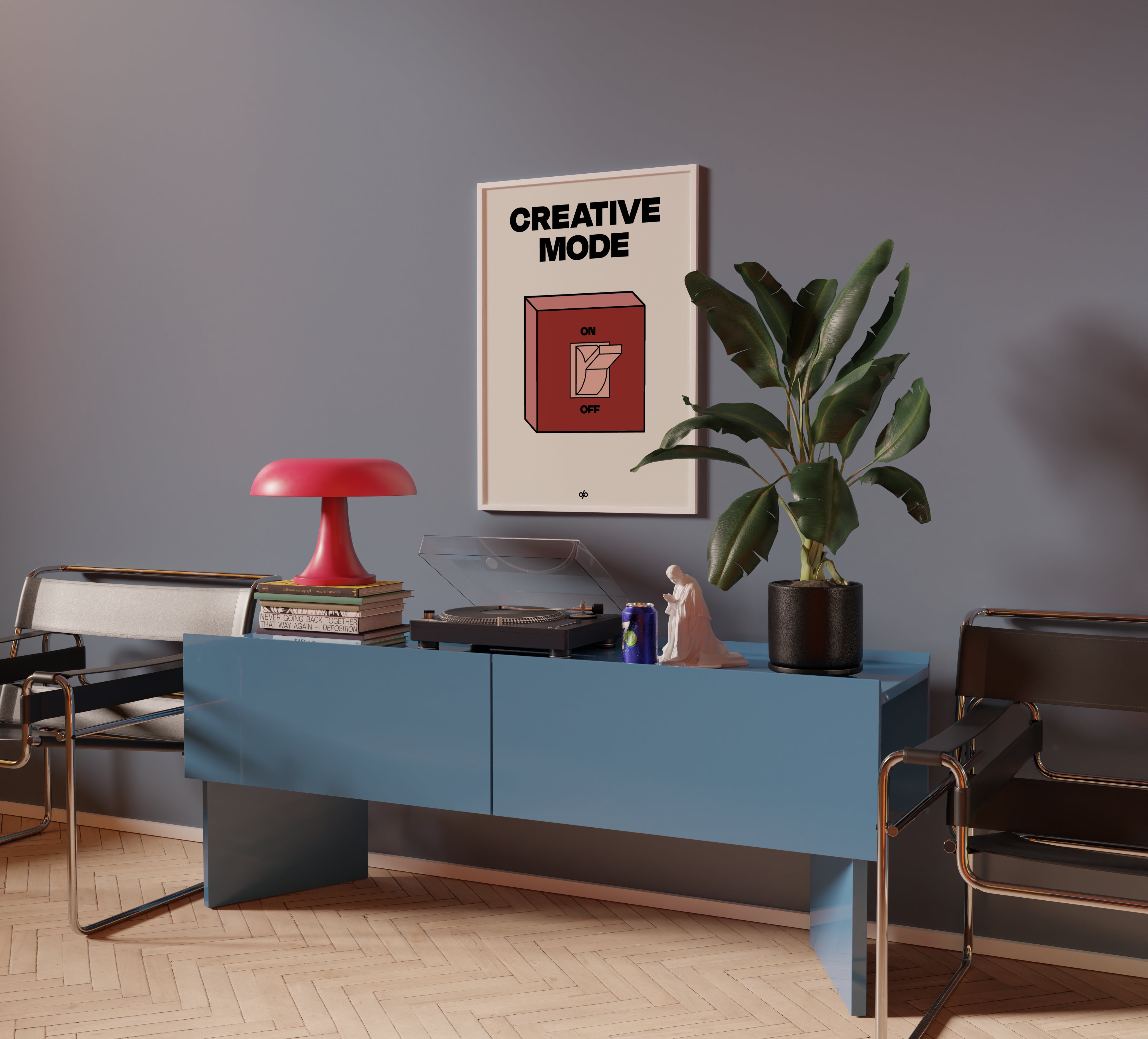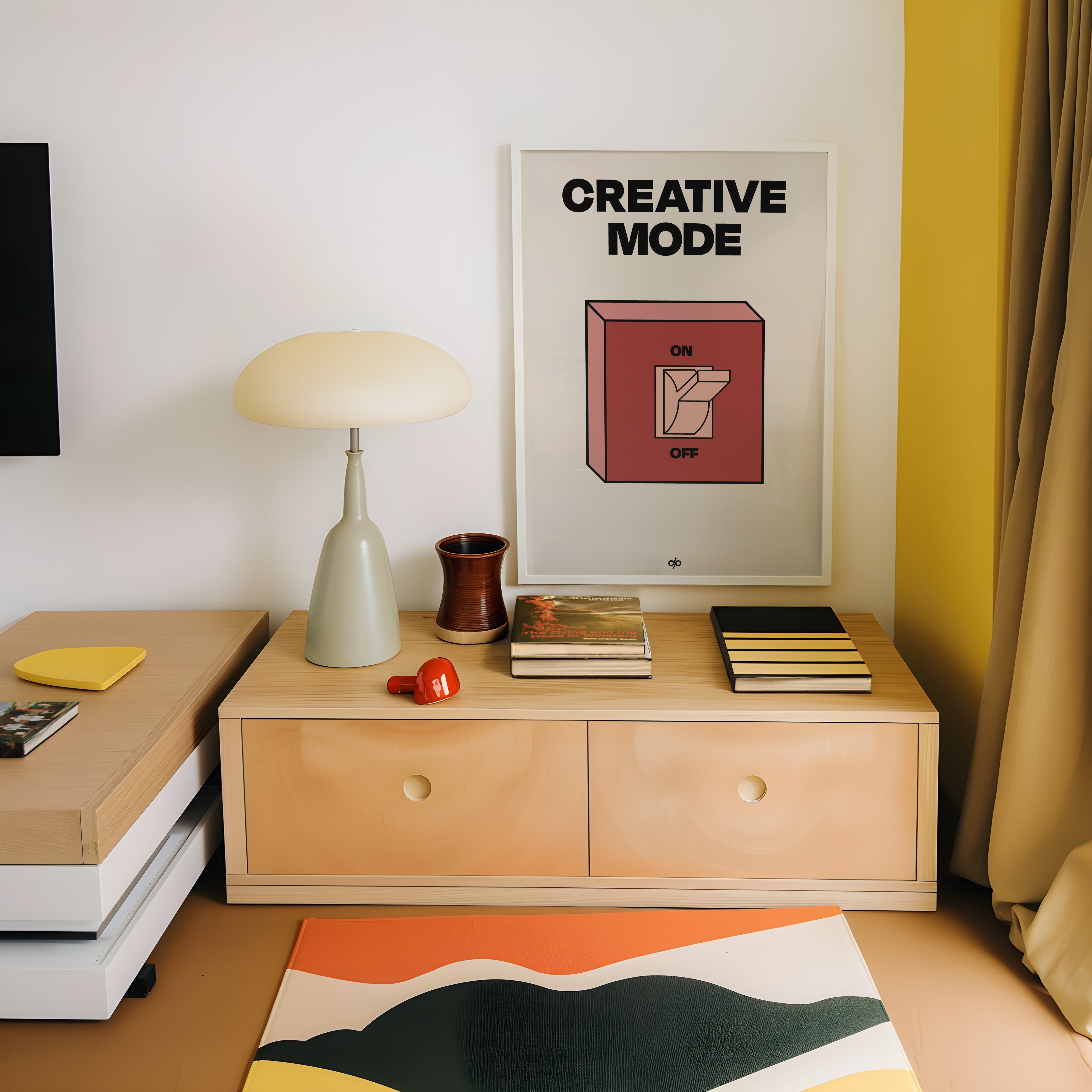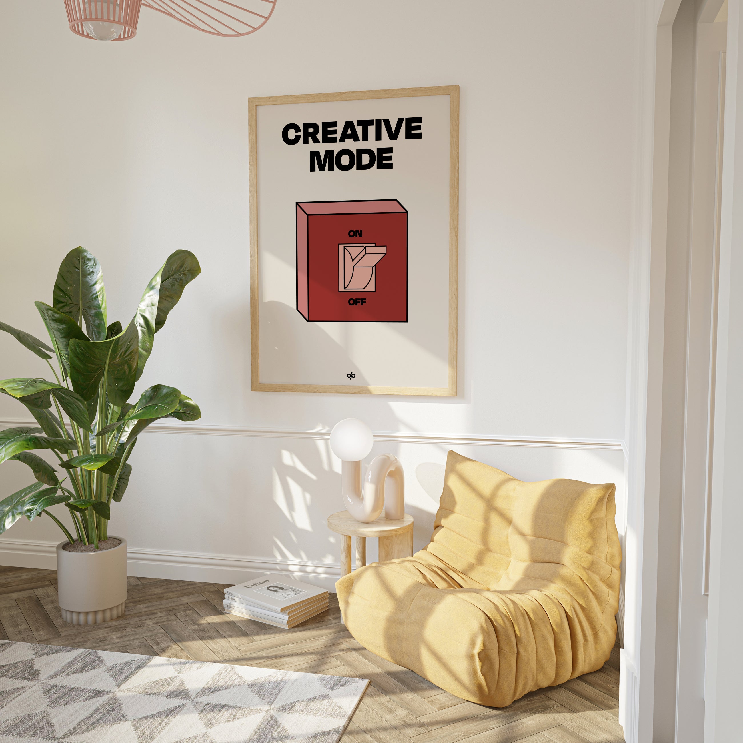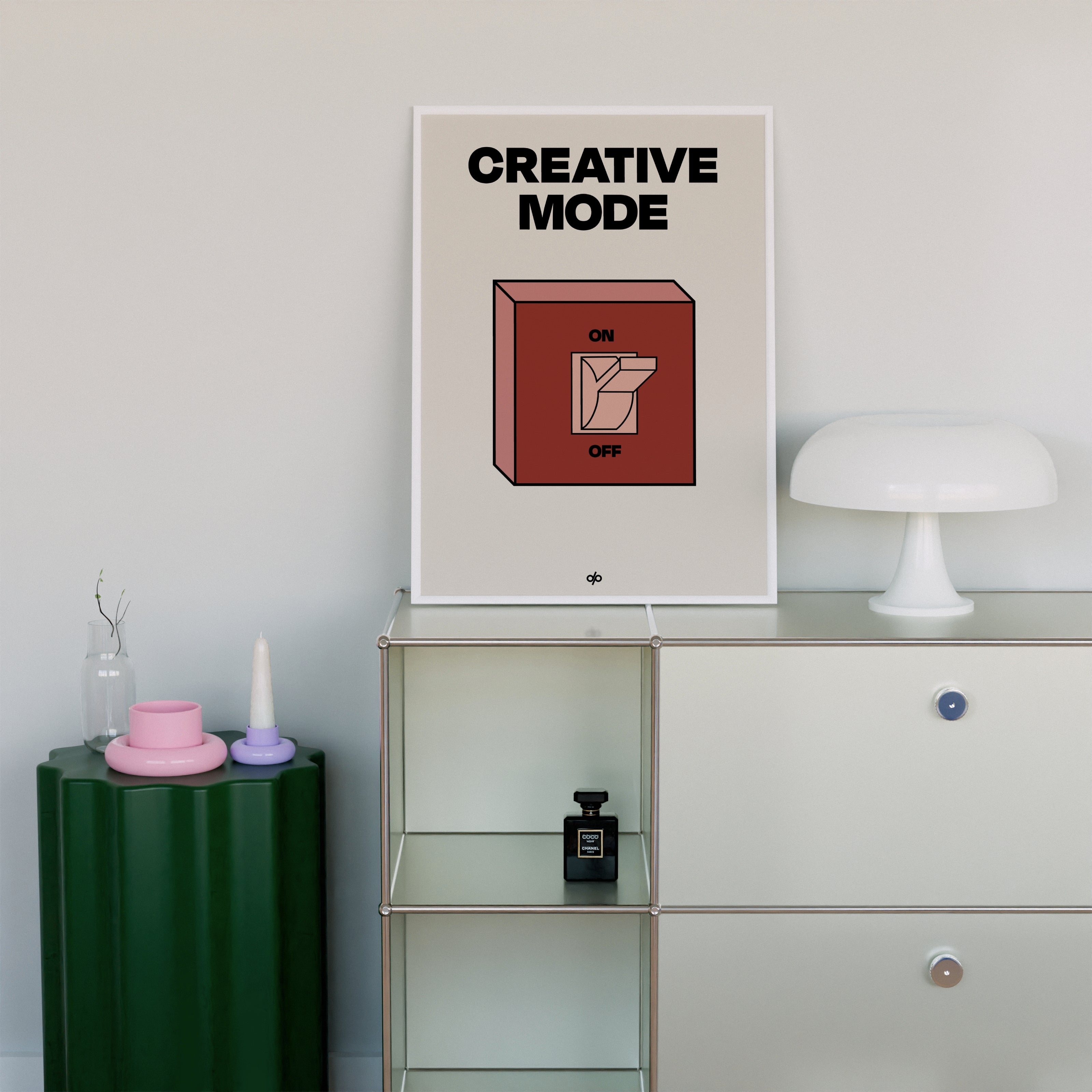 Creative Mode poster features a clean, bold illustration of a light switch labeled “ON/OFF,” playfully turned on under the words “Creative Mode.” It’s a visual cue that creativity is a mindset—one you can activate by choice. The minimalist layout makes it both stylish and instantly energizing in any workspace.