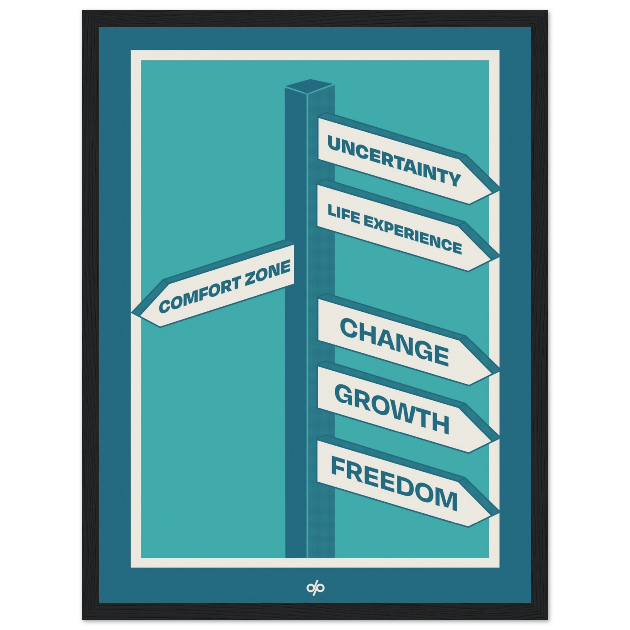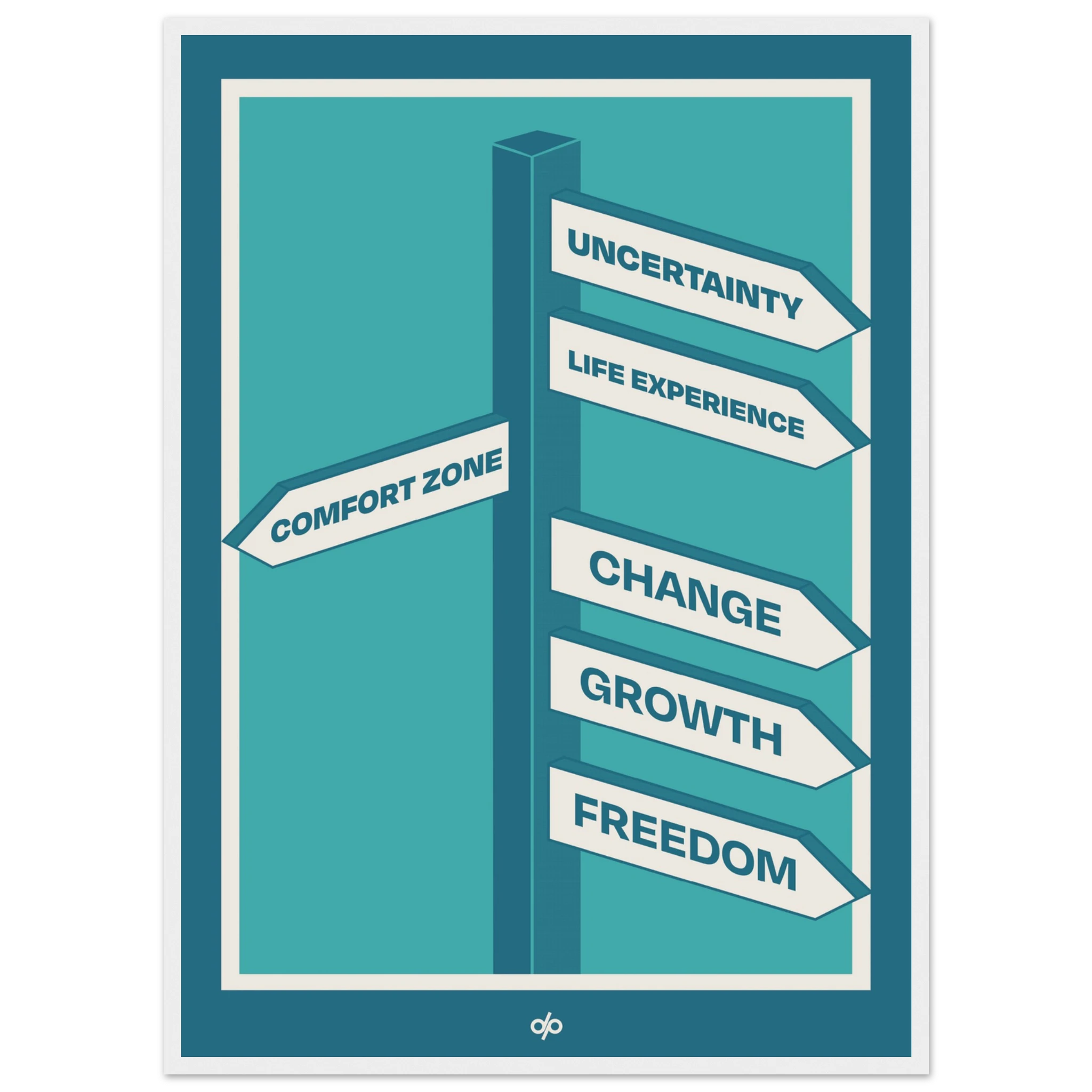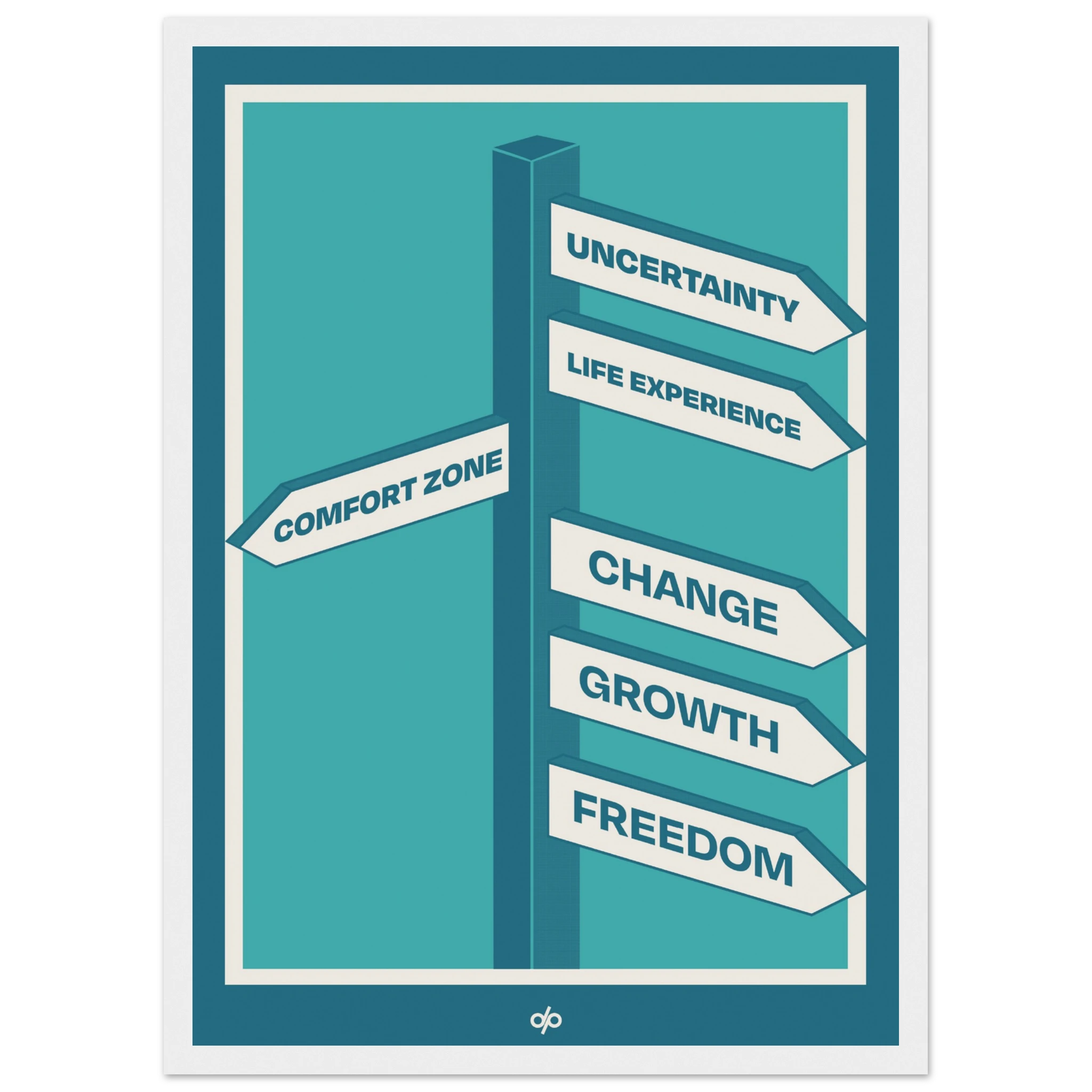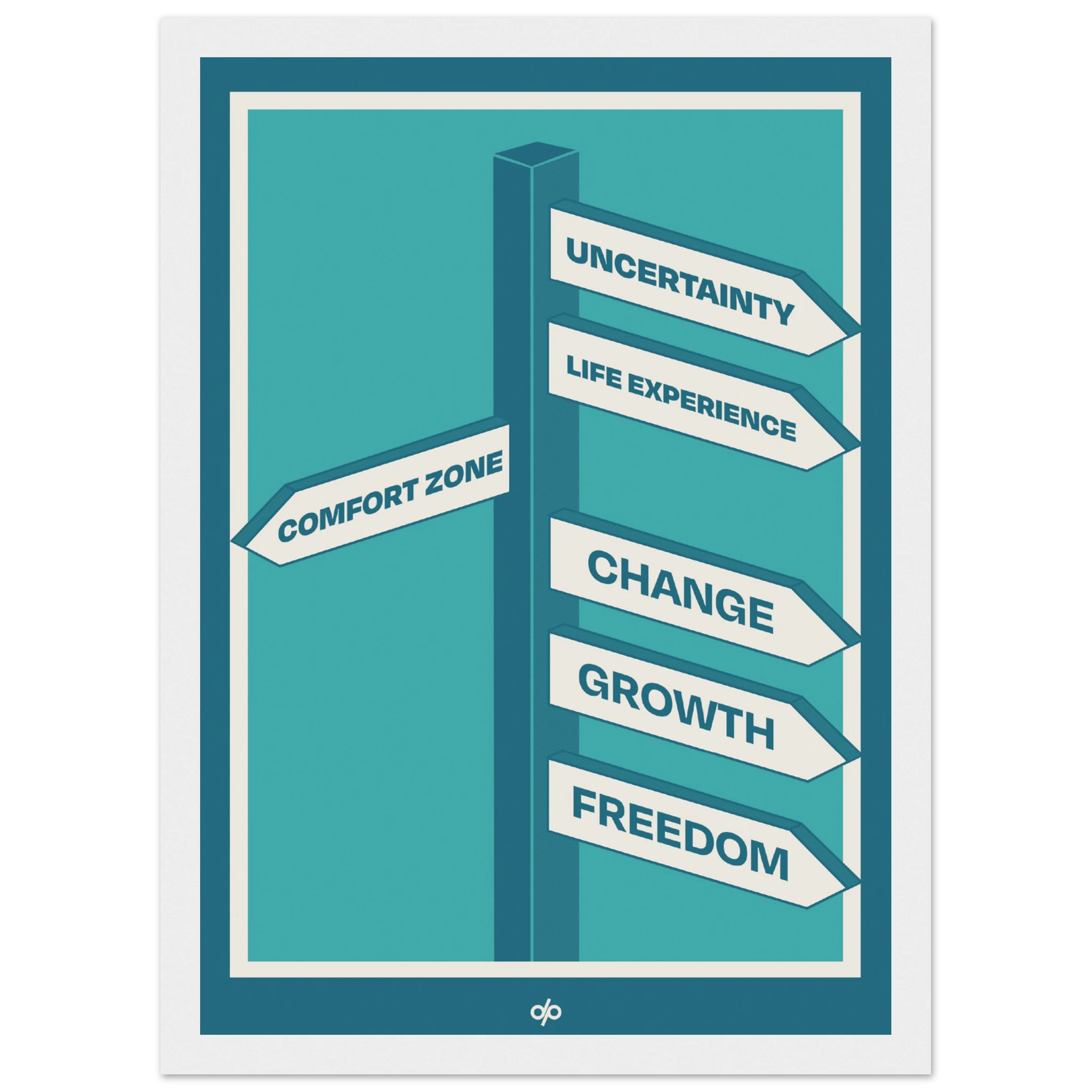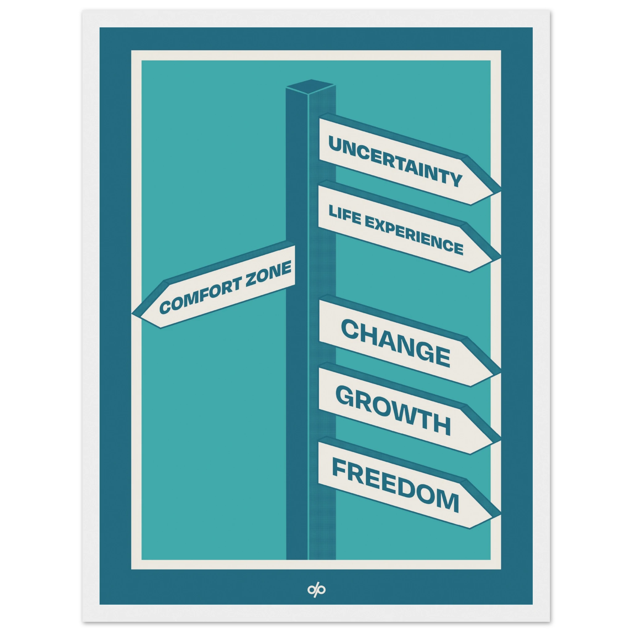 Comfort Zone poster illustrates a street-sign-style post pointing in two directions: one toward “Comfort Zone,” the others toward “Uncertainty,” “Life Experience,” “Change,” “Growth,” and “Freedom.” This visually compelling piece captures the pivotal moment we all face—stay in what’s familiar, or step into what’s possible.