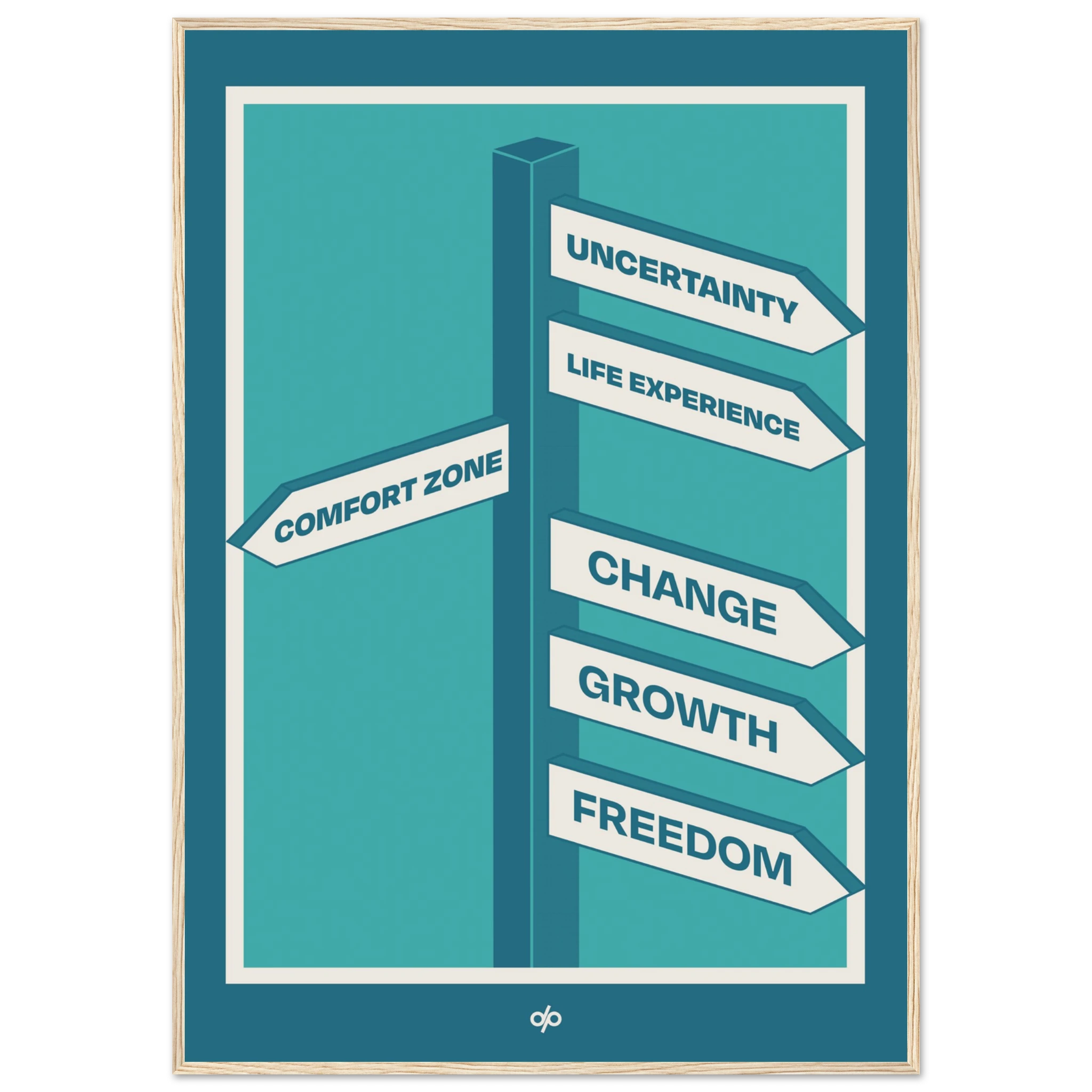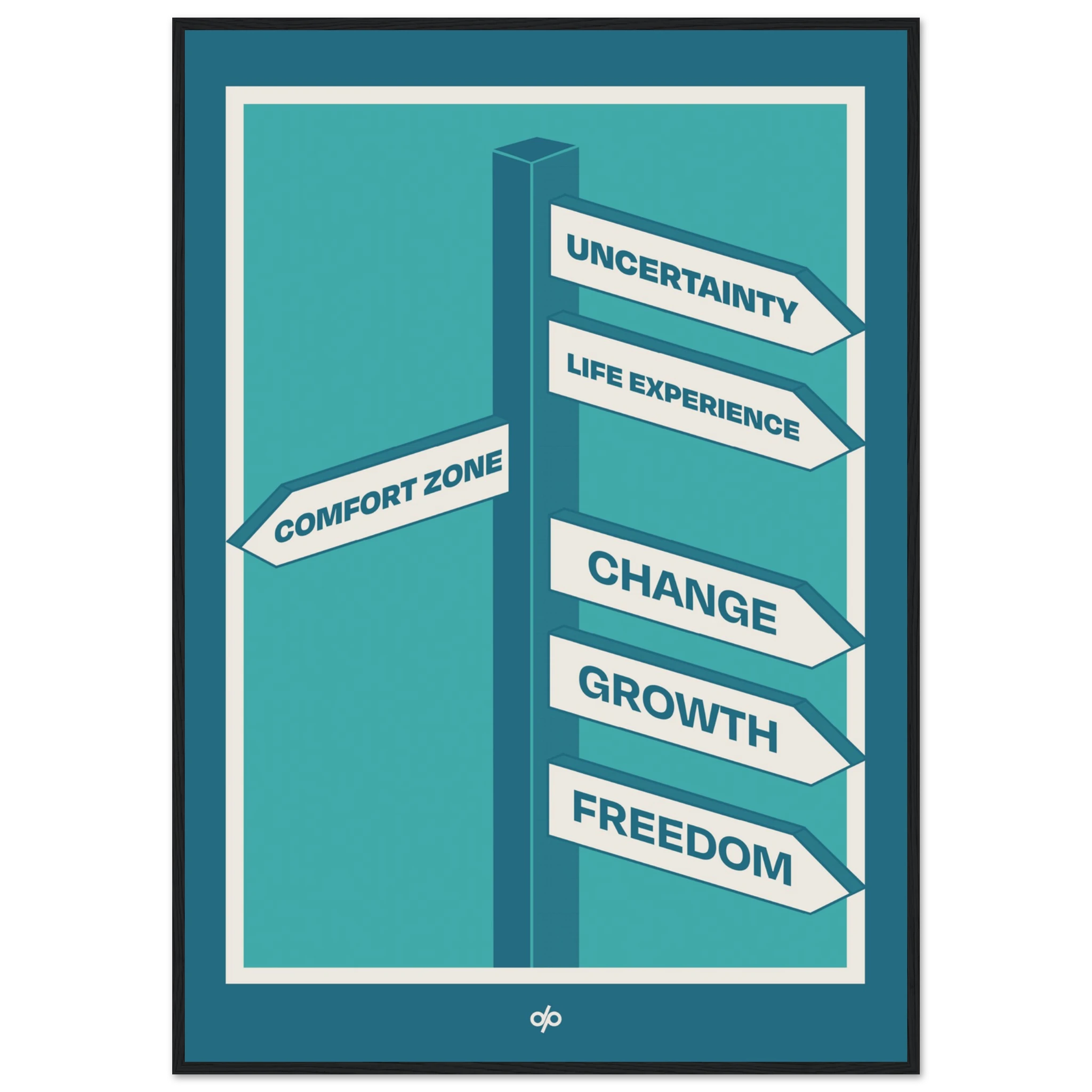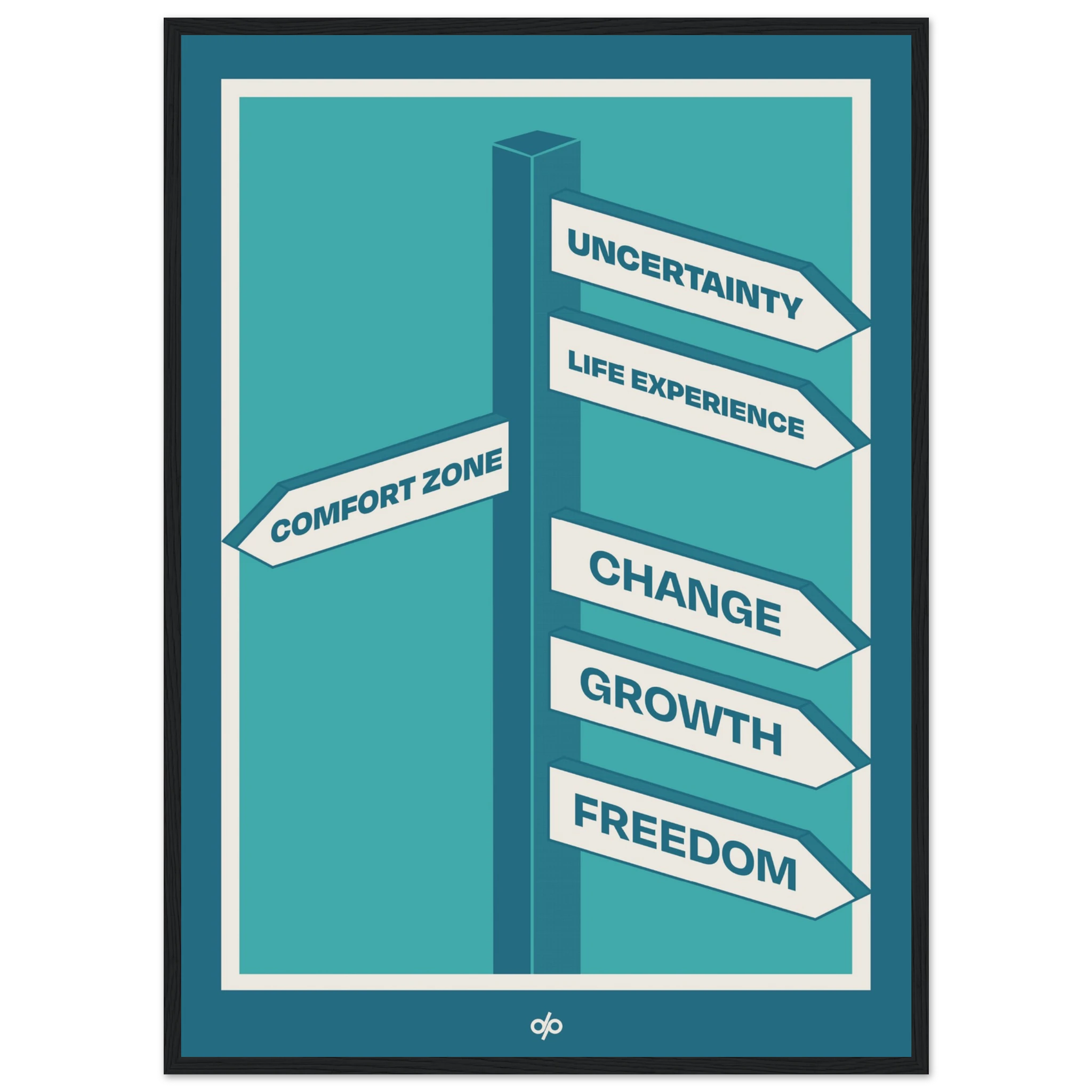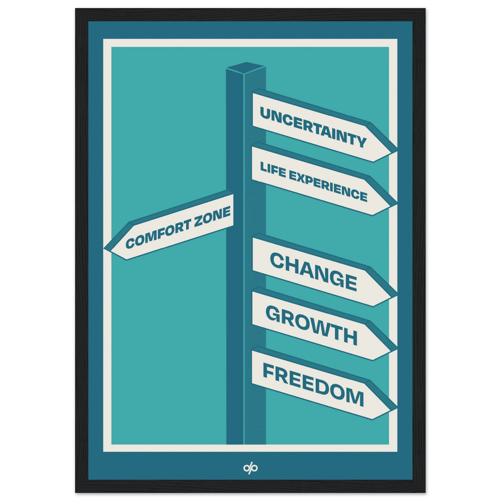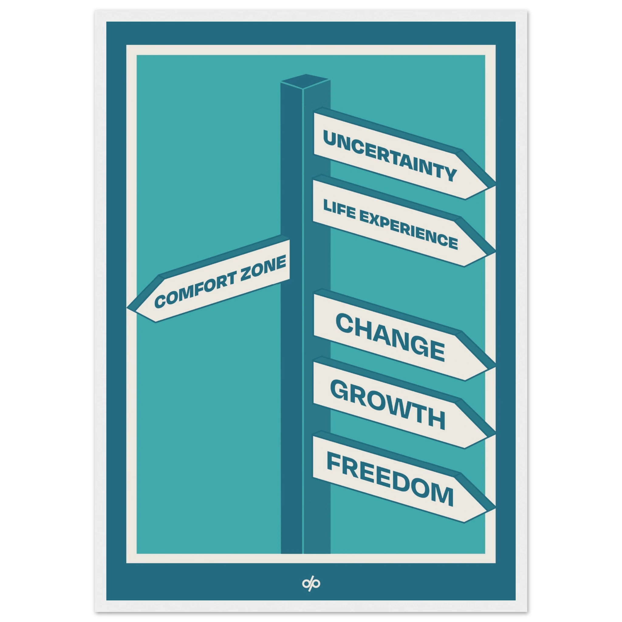 Comfort Zone poster illustrates a street-sign-style post pointing in two directions: one toward “Comfort Zone,” the others toward “Uncertainty,” “Life Experience,” “Change,” “Growth,” and “Freedom.” This visually compelling piece captures the pivotal moment we all face—stay in what’s familiar, or step into what’s possible.
