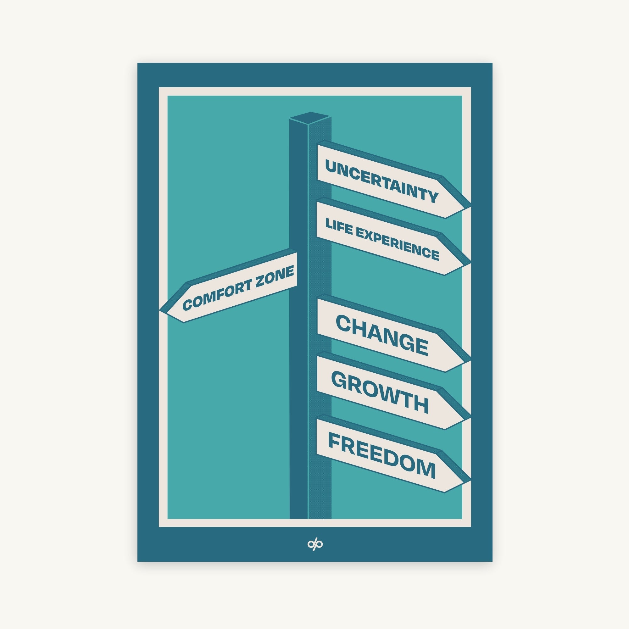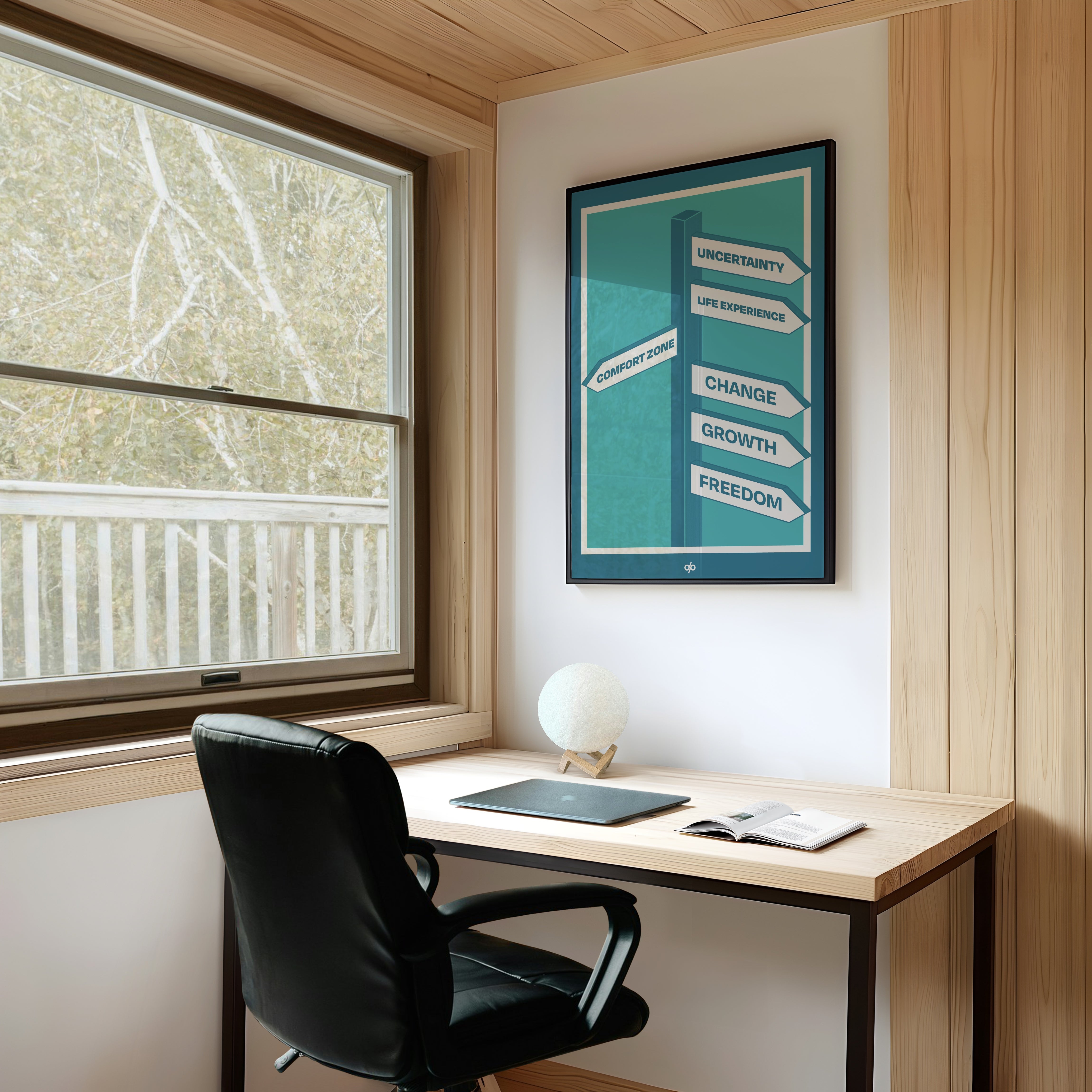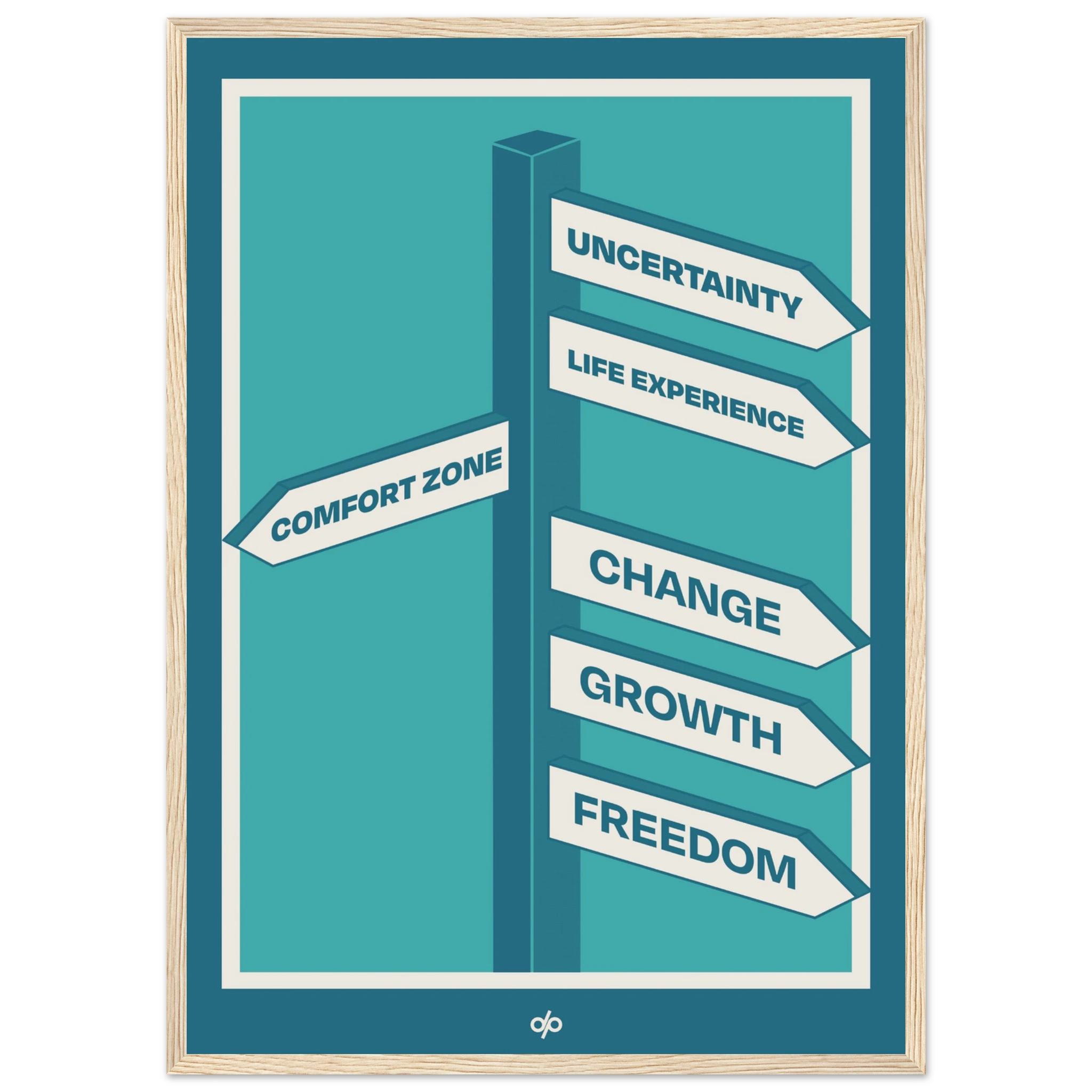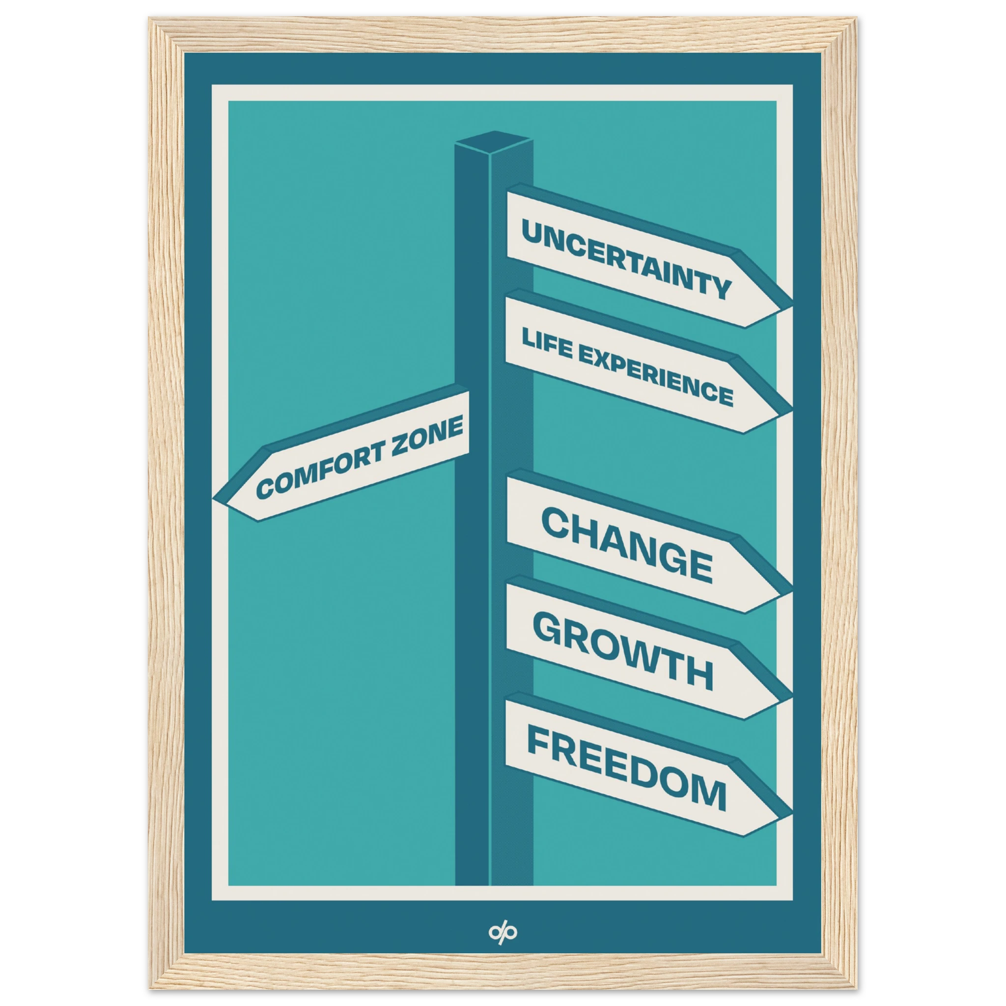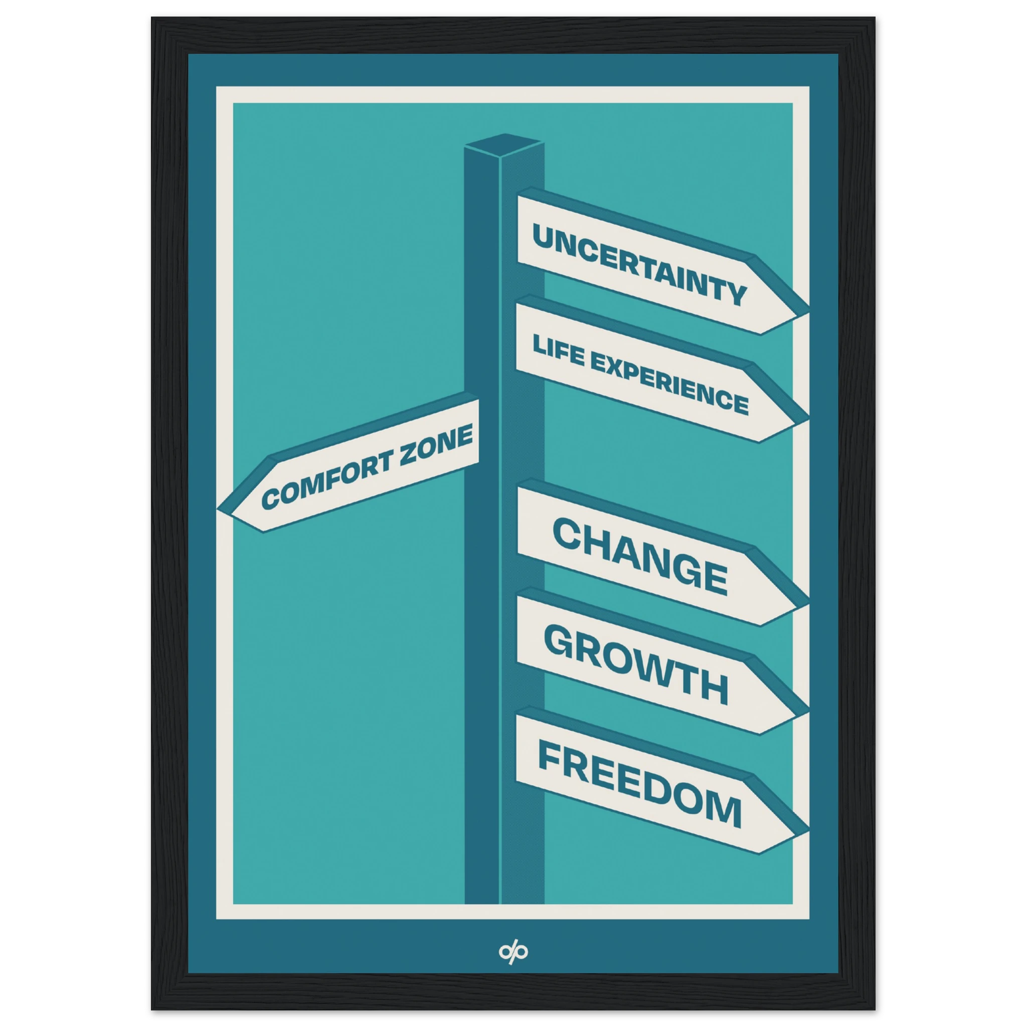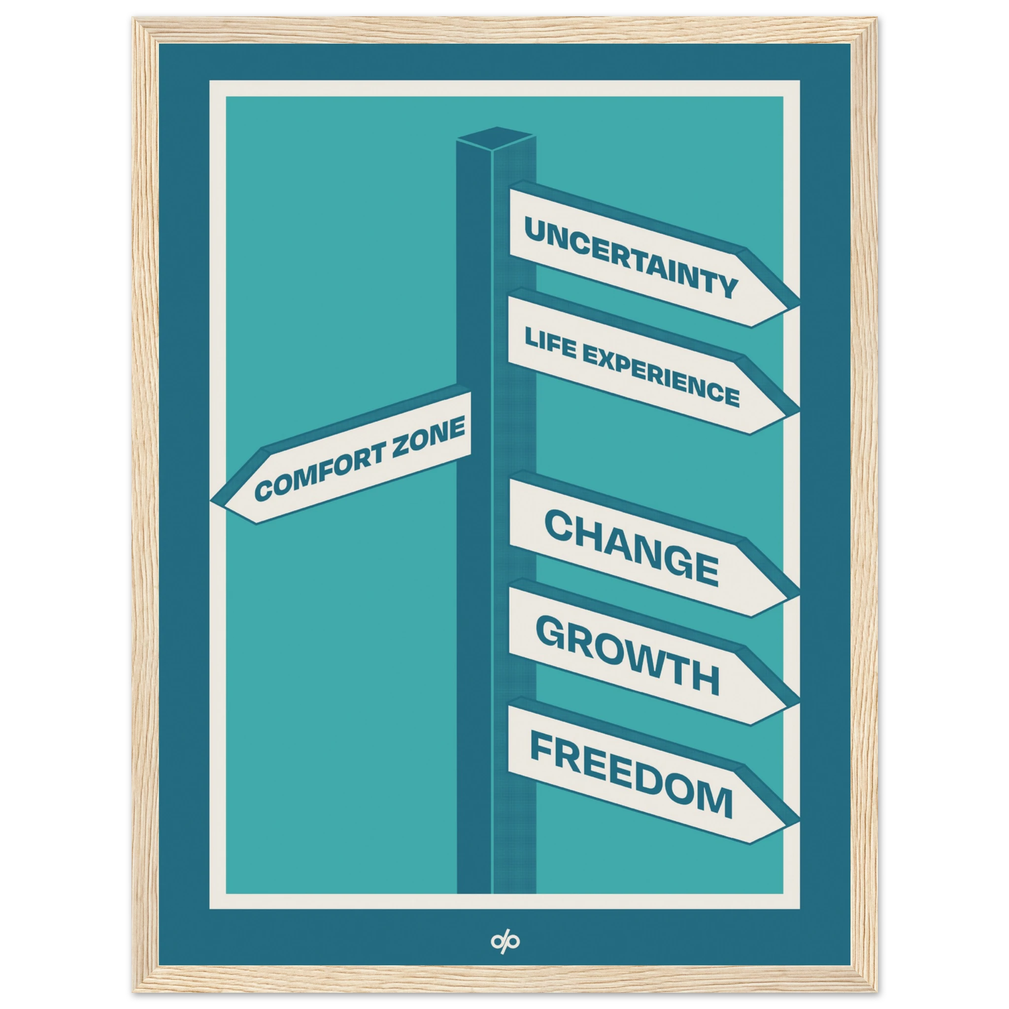 Comfort Zone poster illustrates a street-sign-style post pointing in two directions: one toward “Comfort Zone,” the others toward “Uncertainty,” “Life Experience,” “Change,” “Growth,” and “Freedom.” This visually compelling piece captures the pivotal moment we all face—stay in what’s familiar, or step into what’s possible.