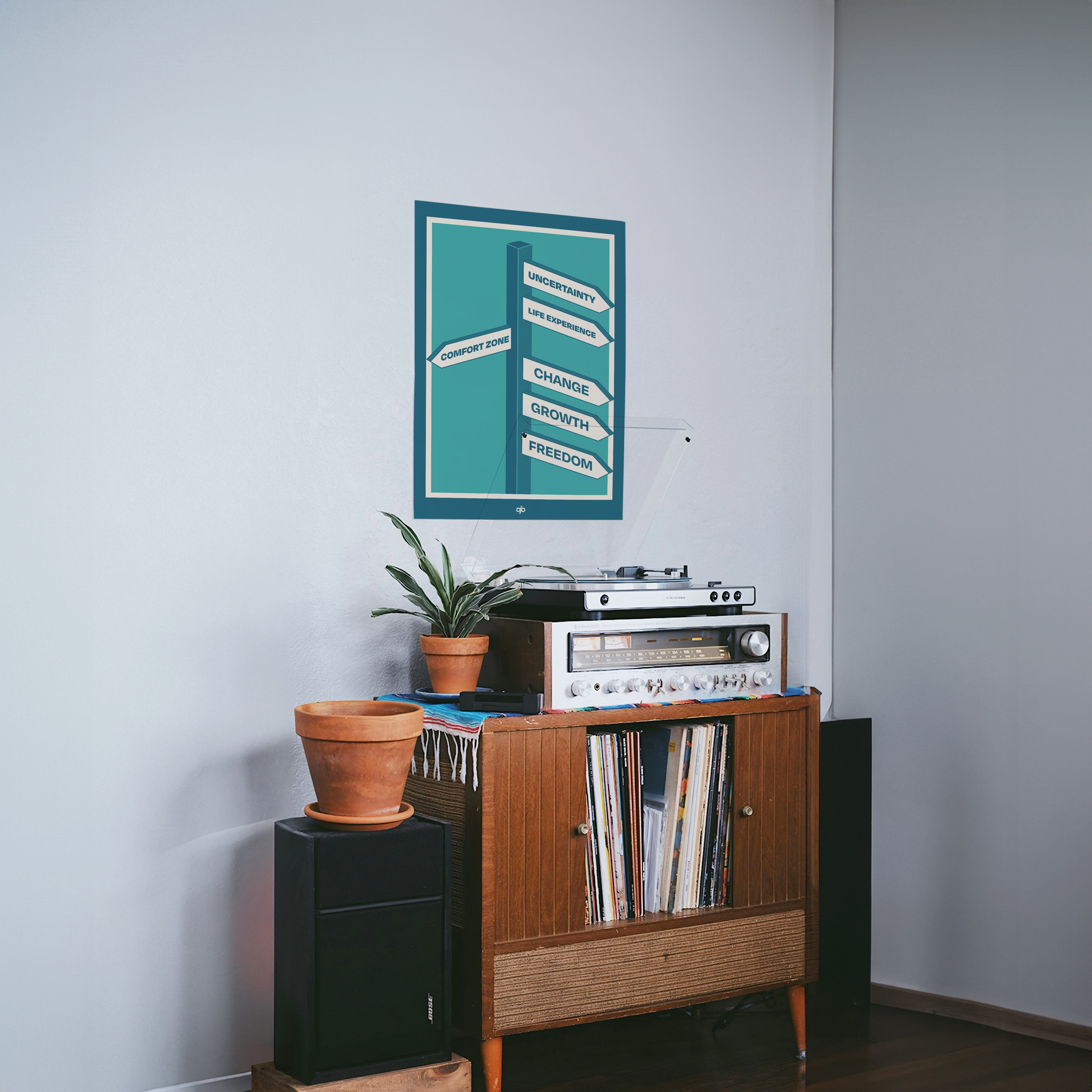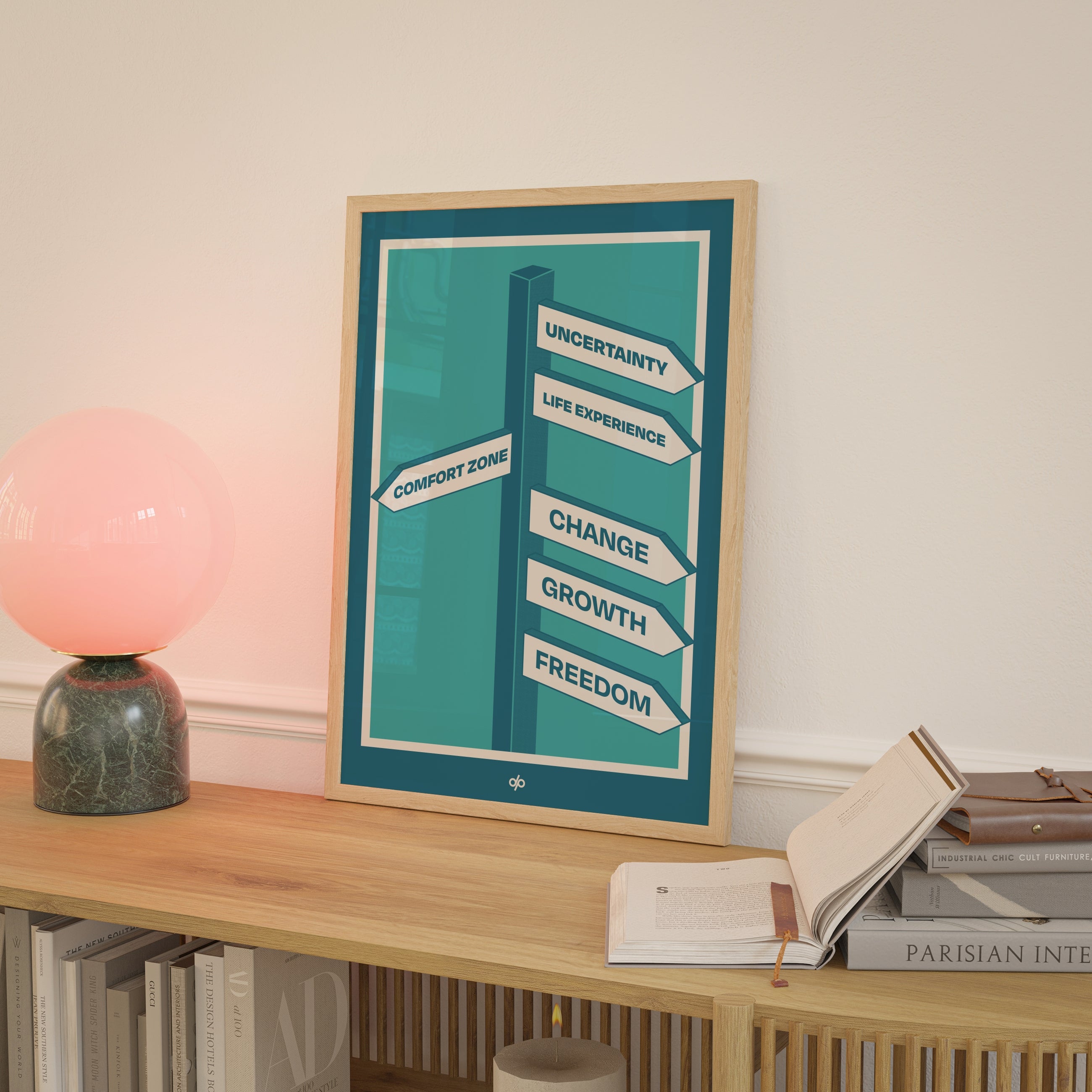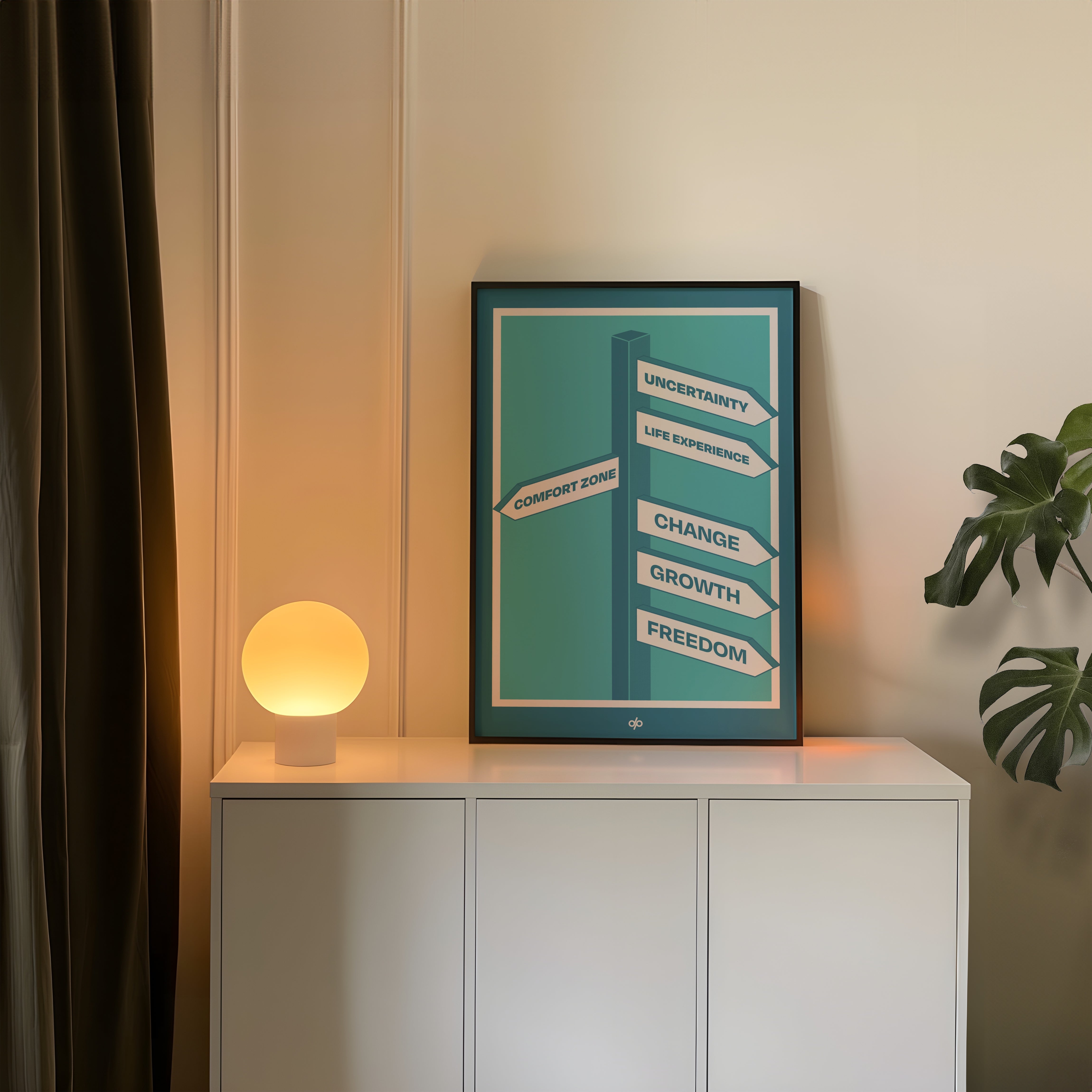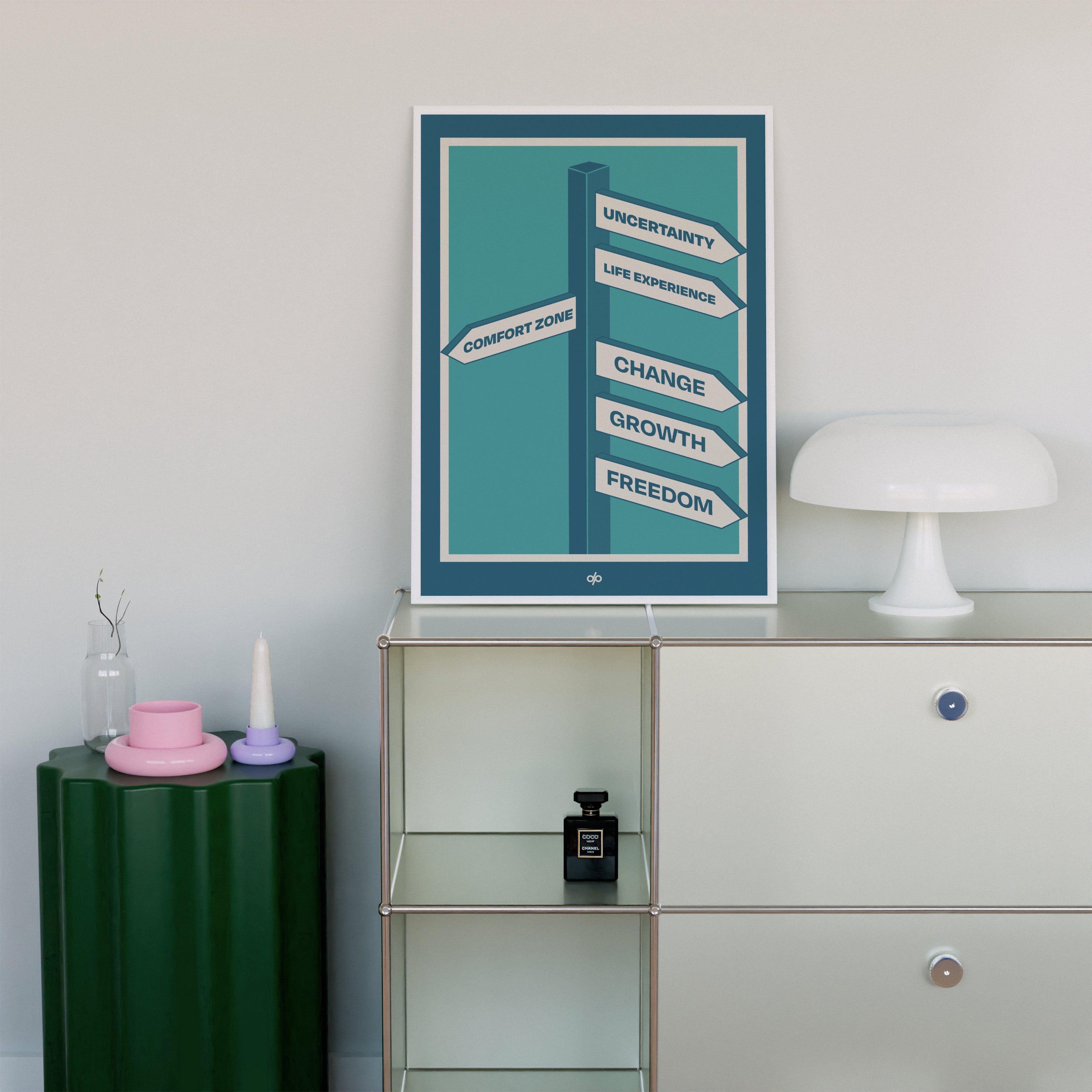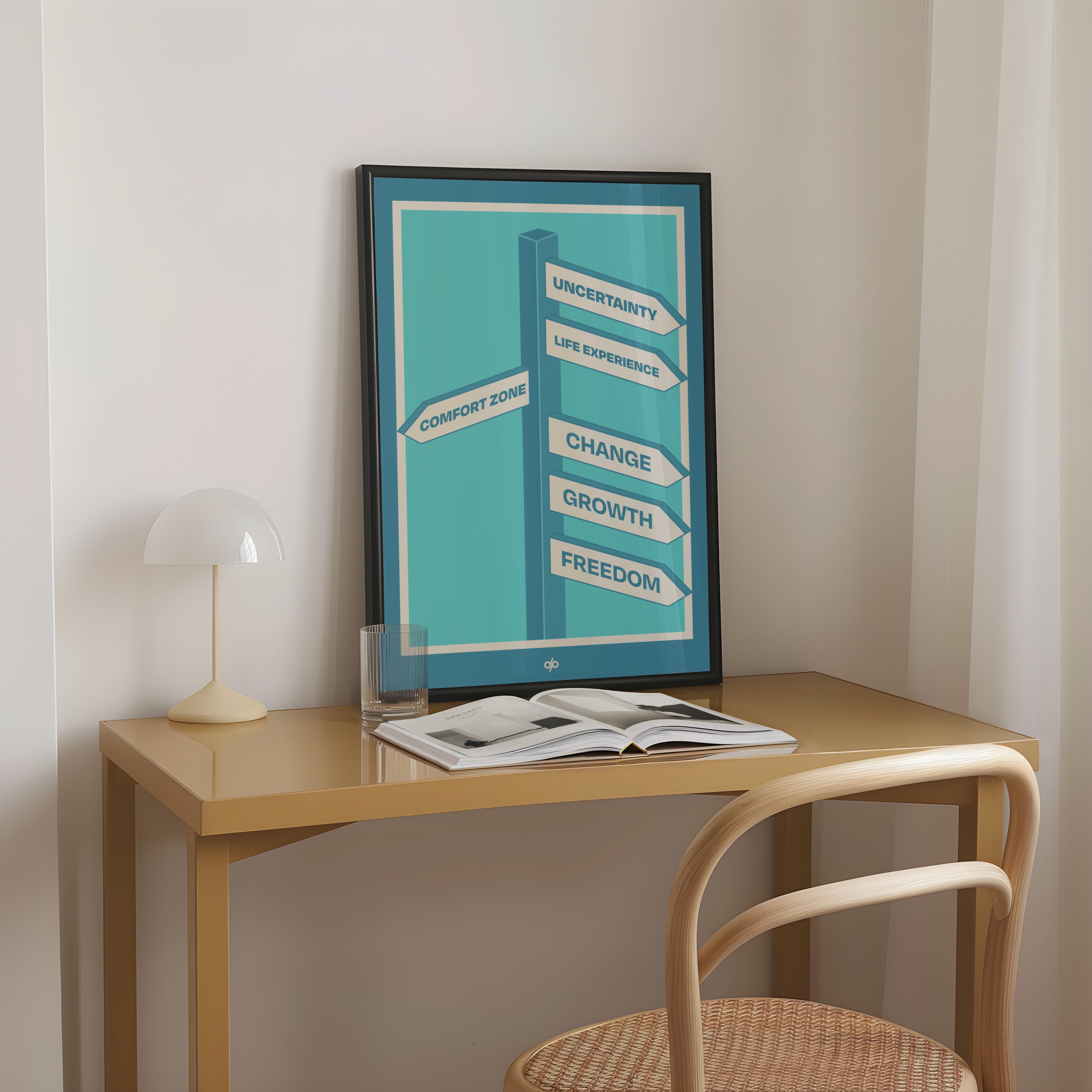 Comfort Zone poster illustrates a street-sign-style post pointing in two directions: one toward “Comfort Zone,” the others toward “Uncertainty,” “Life Experience,” “Change,” “Growth,” and “Freedom.” This visually compelling piece captures the pivotal moment we all face—stay in what’s familiar, or step into what’s possible.
