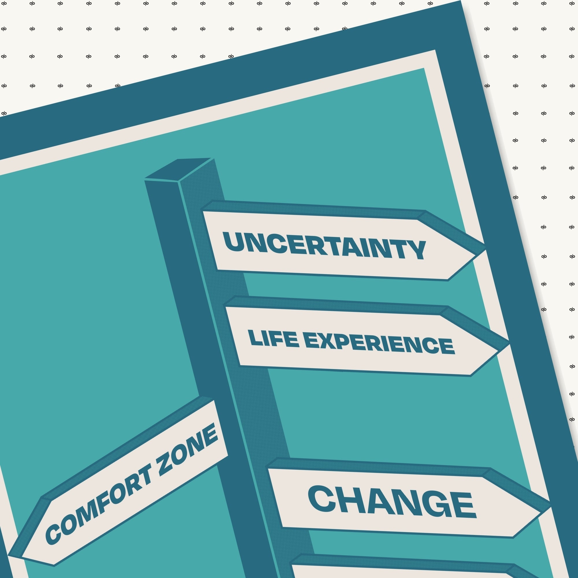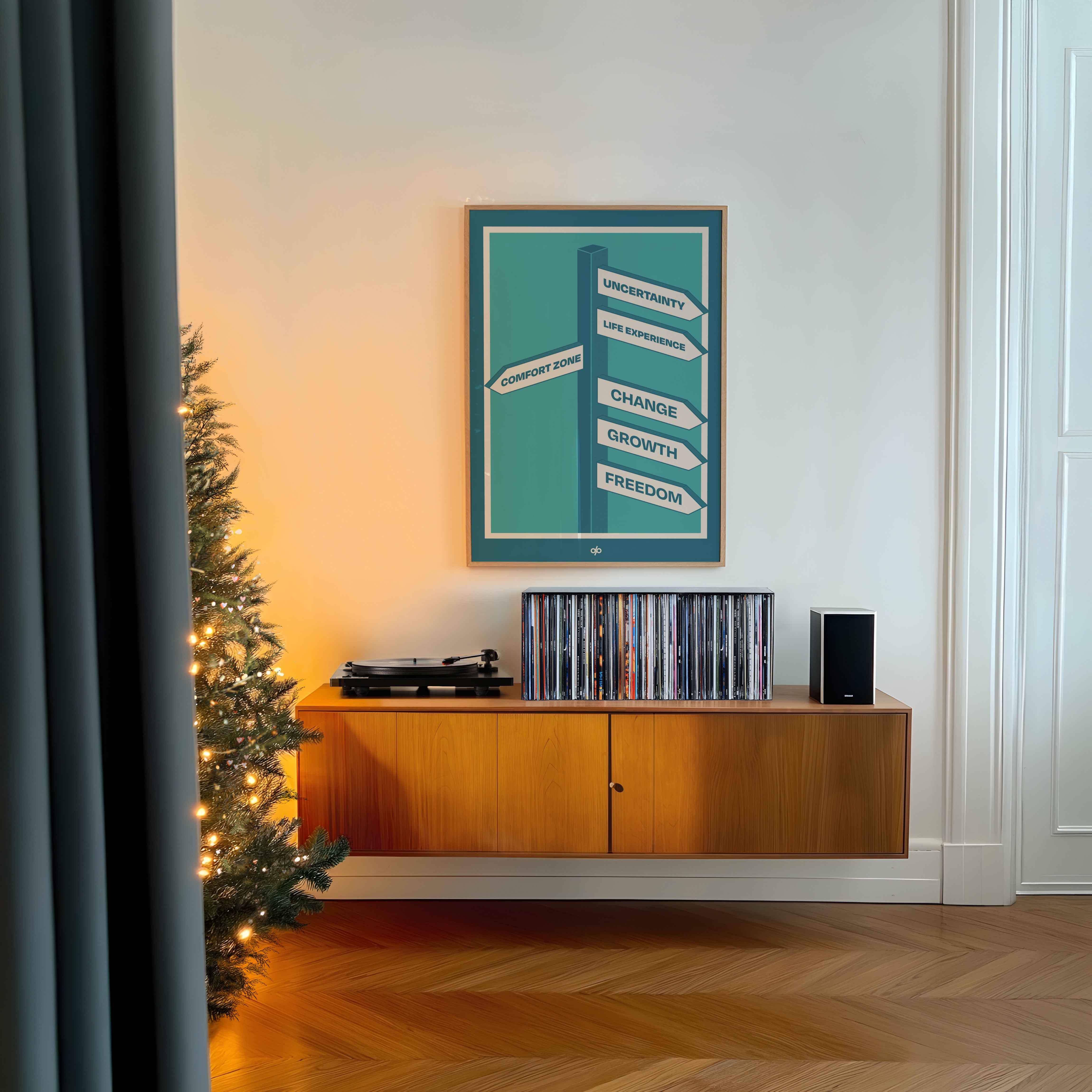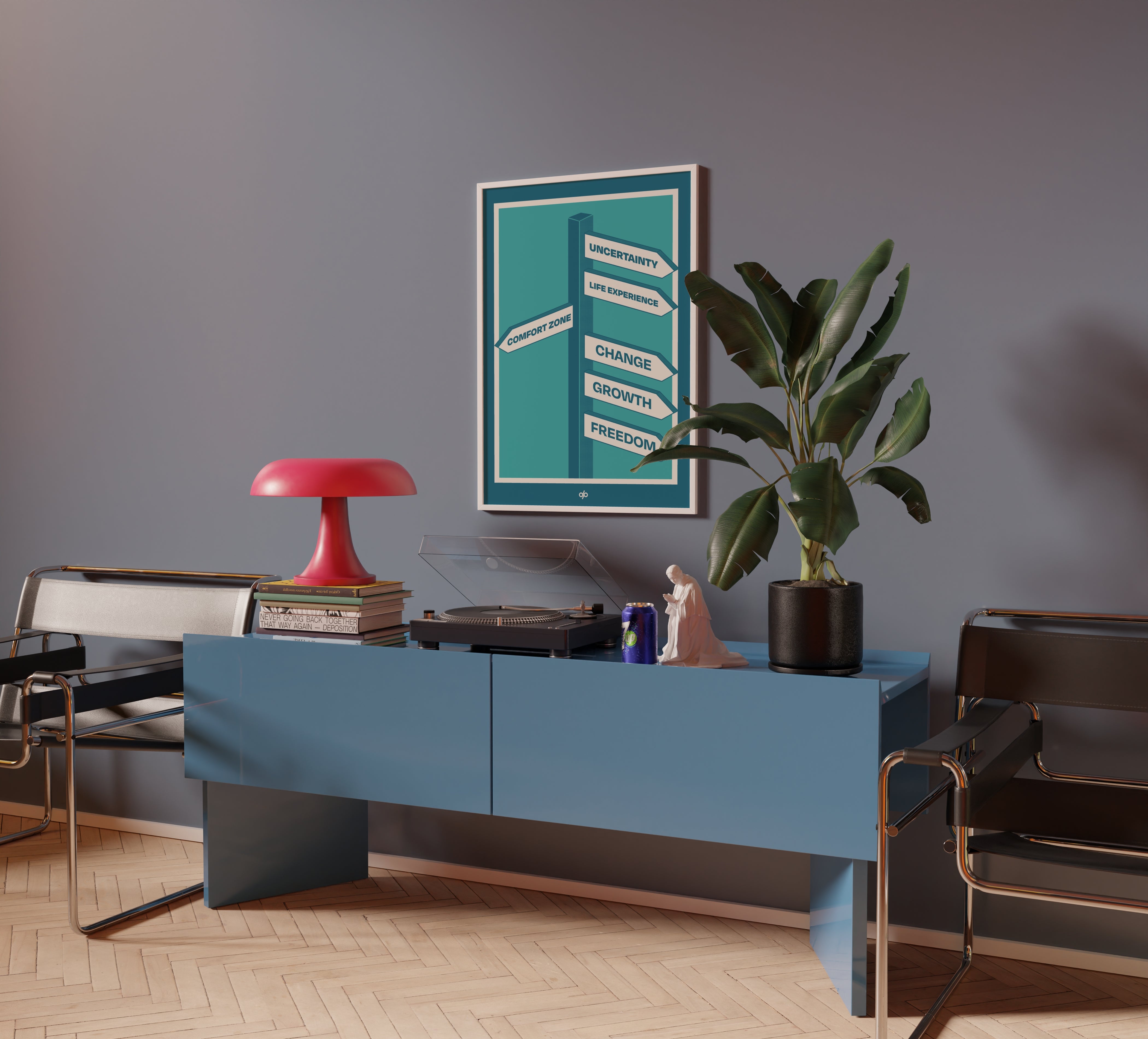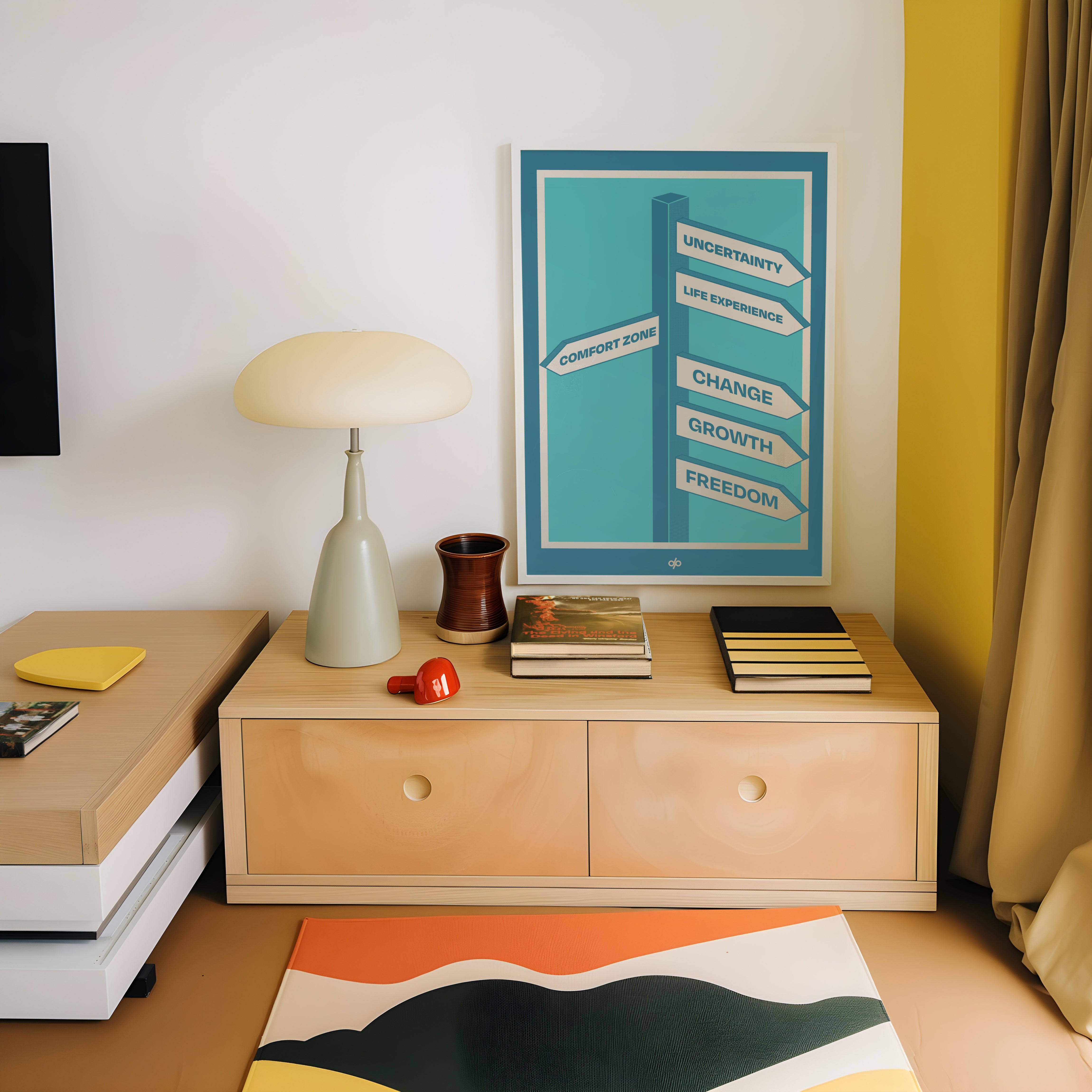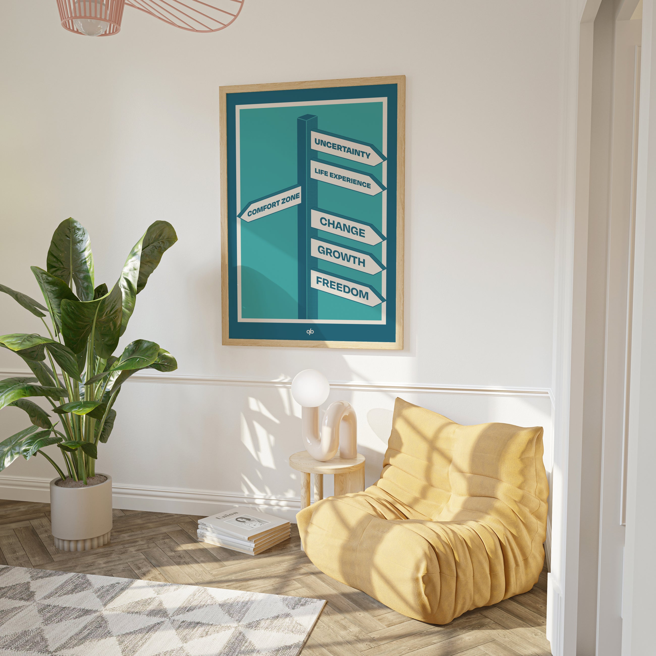 Comfort Zone poster illustrates a street-sign-style post pointing in two directions: one toward “Comfort Zone,” the others toward “Uncertainty,” “Life Experience,” “Change,” “Growth,” and “Freedom.” This visually compelling piece captures the pivotal moment we all face—stay in what’s familiar, or step into what’s possible.