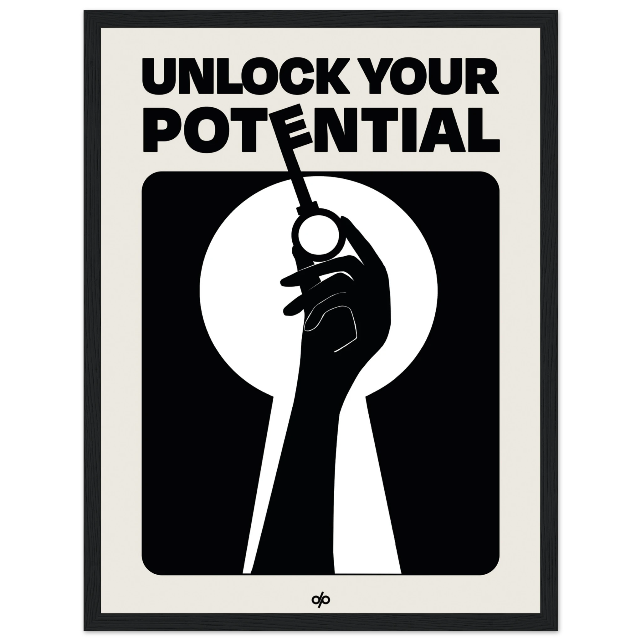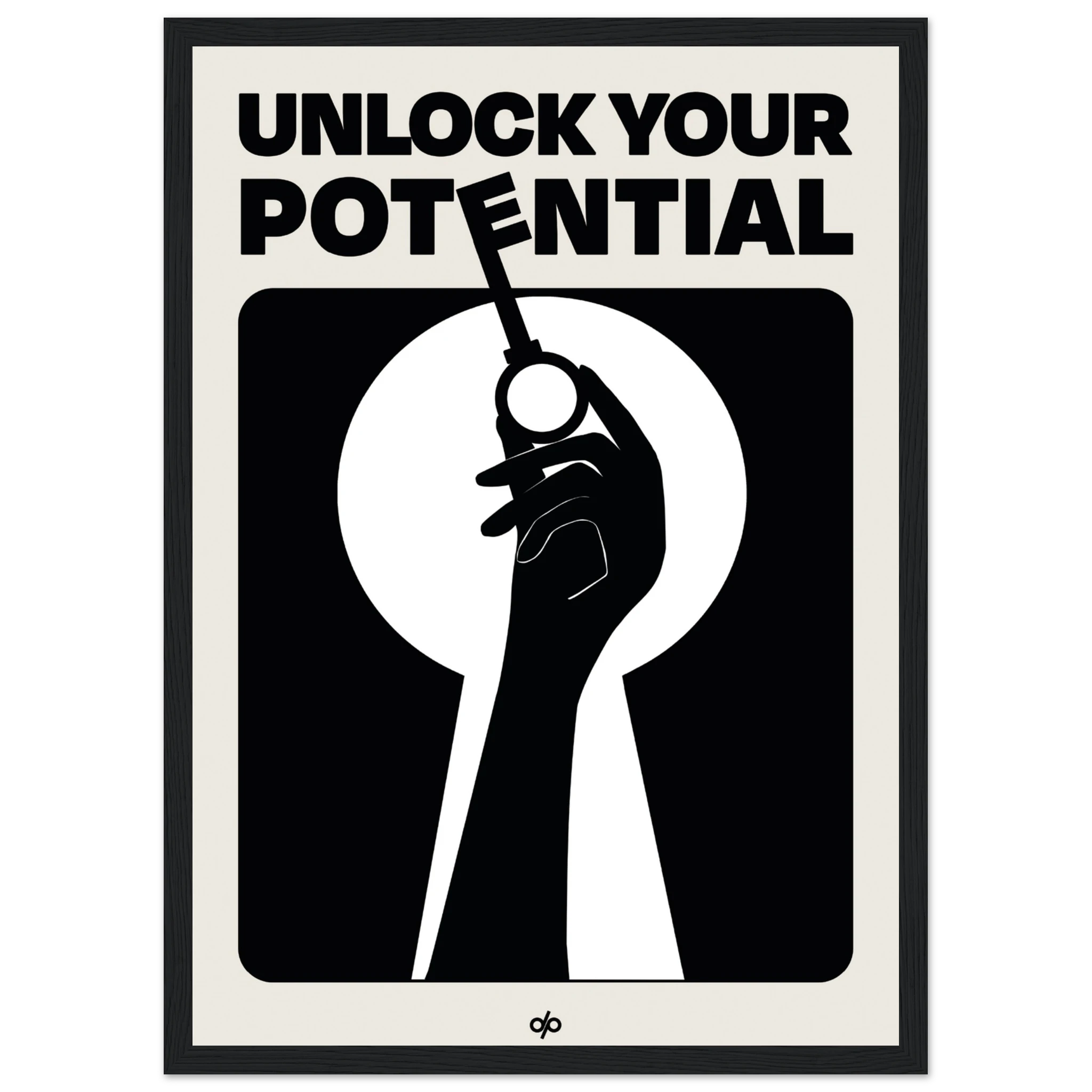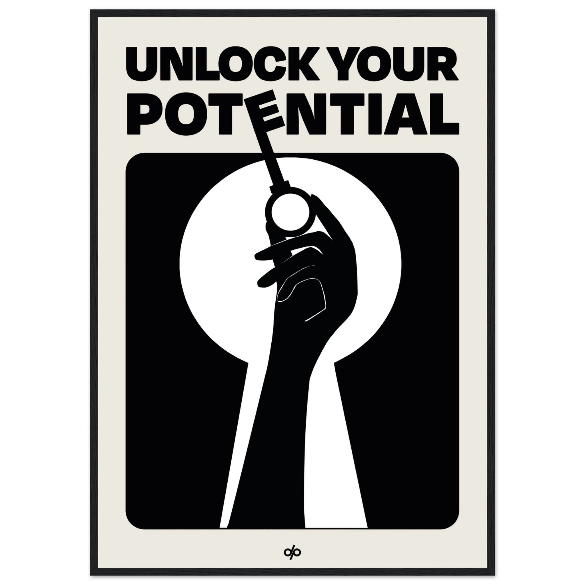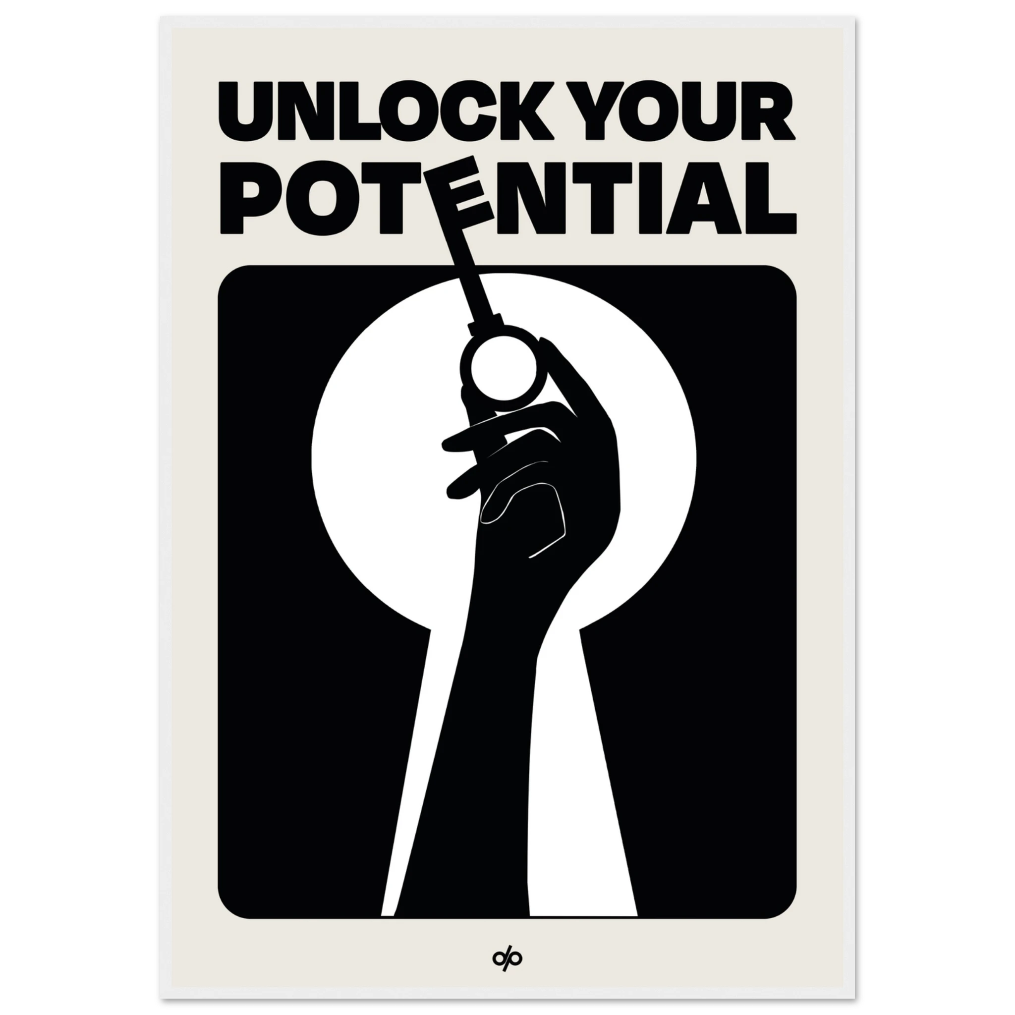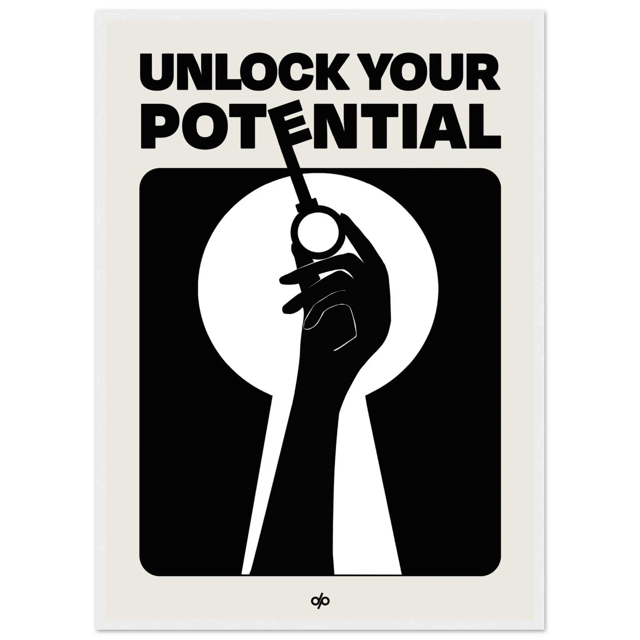 Unlock Potential poster captures a bold silhouette of a hand holding a key within the shape of a keyhole, backed by strong typography that reads “Unlock Your Potential.” This striking black-and-white composition becomes a visual mantra, reminding viewers of the power they already hold to open new doors.