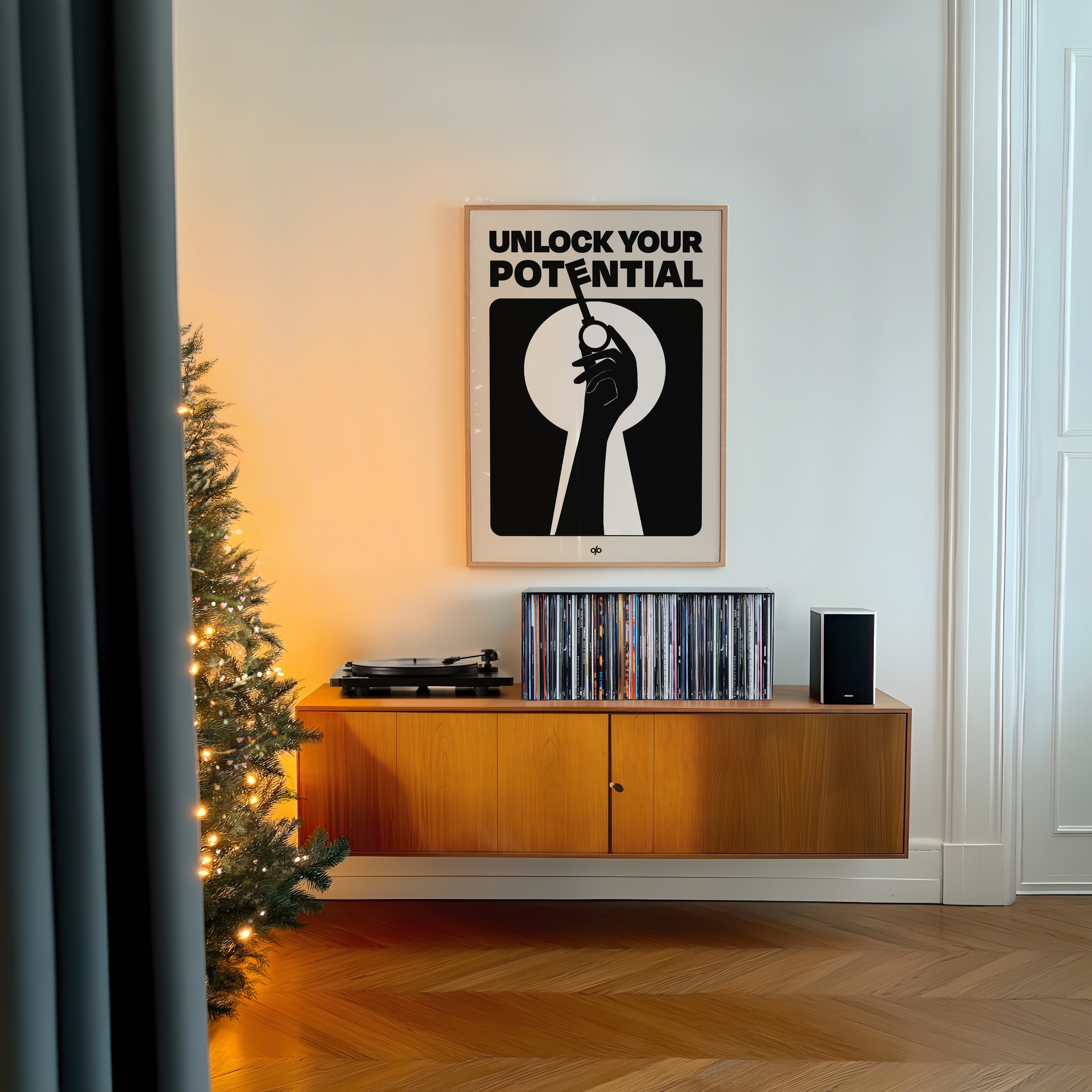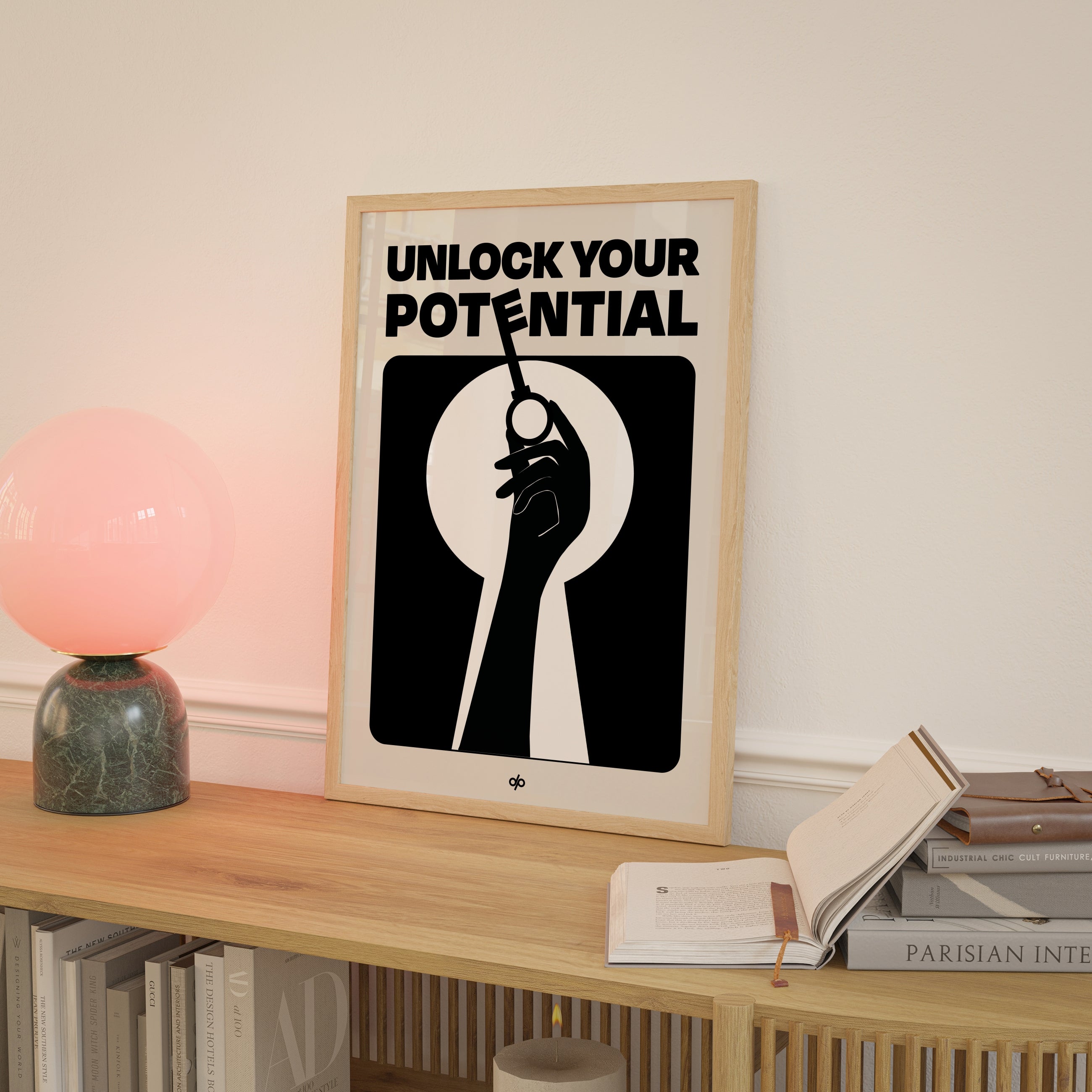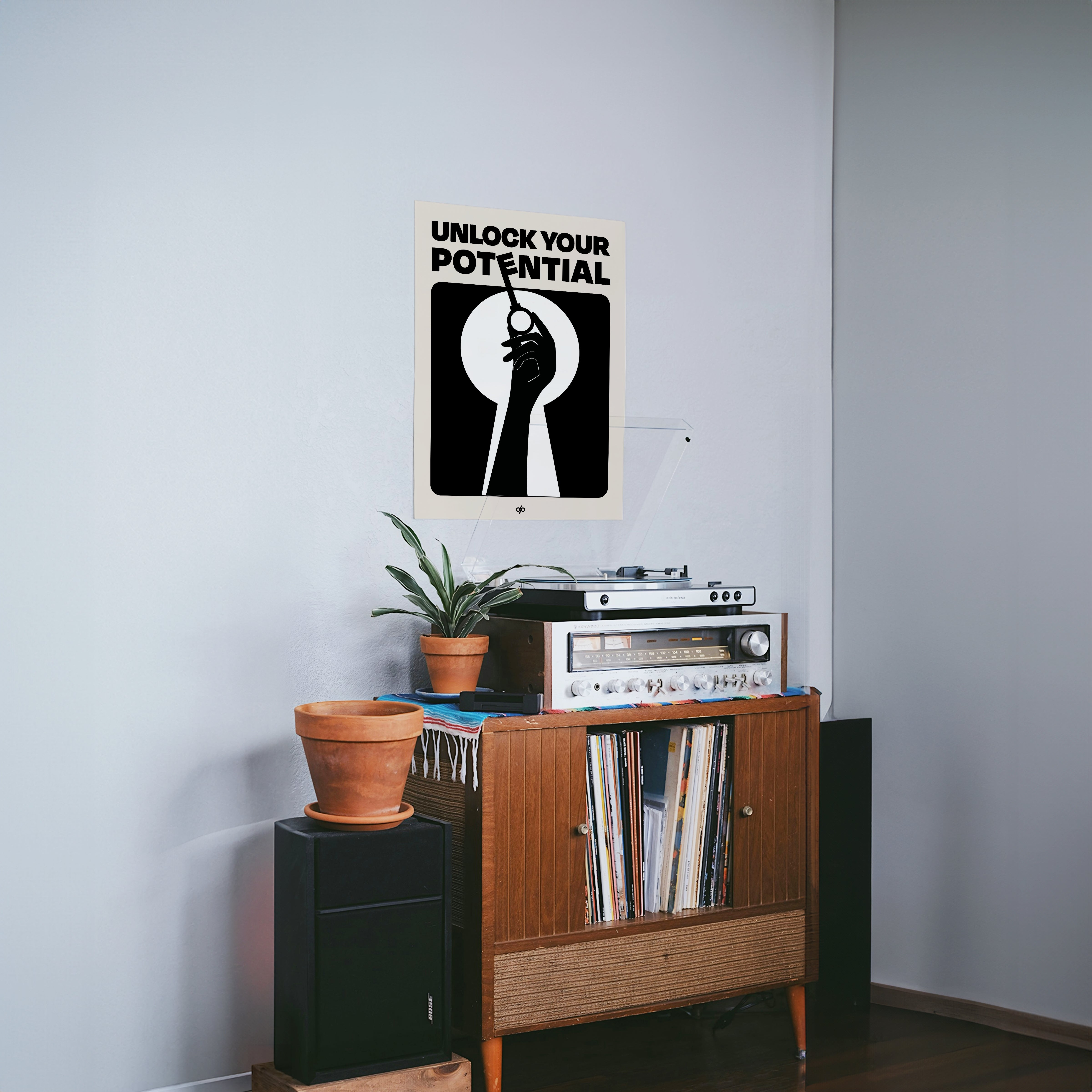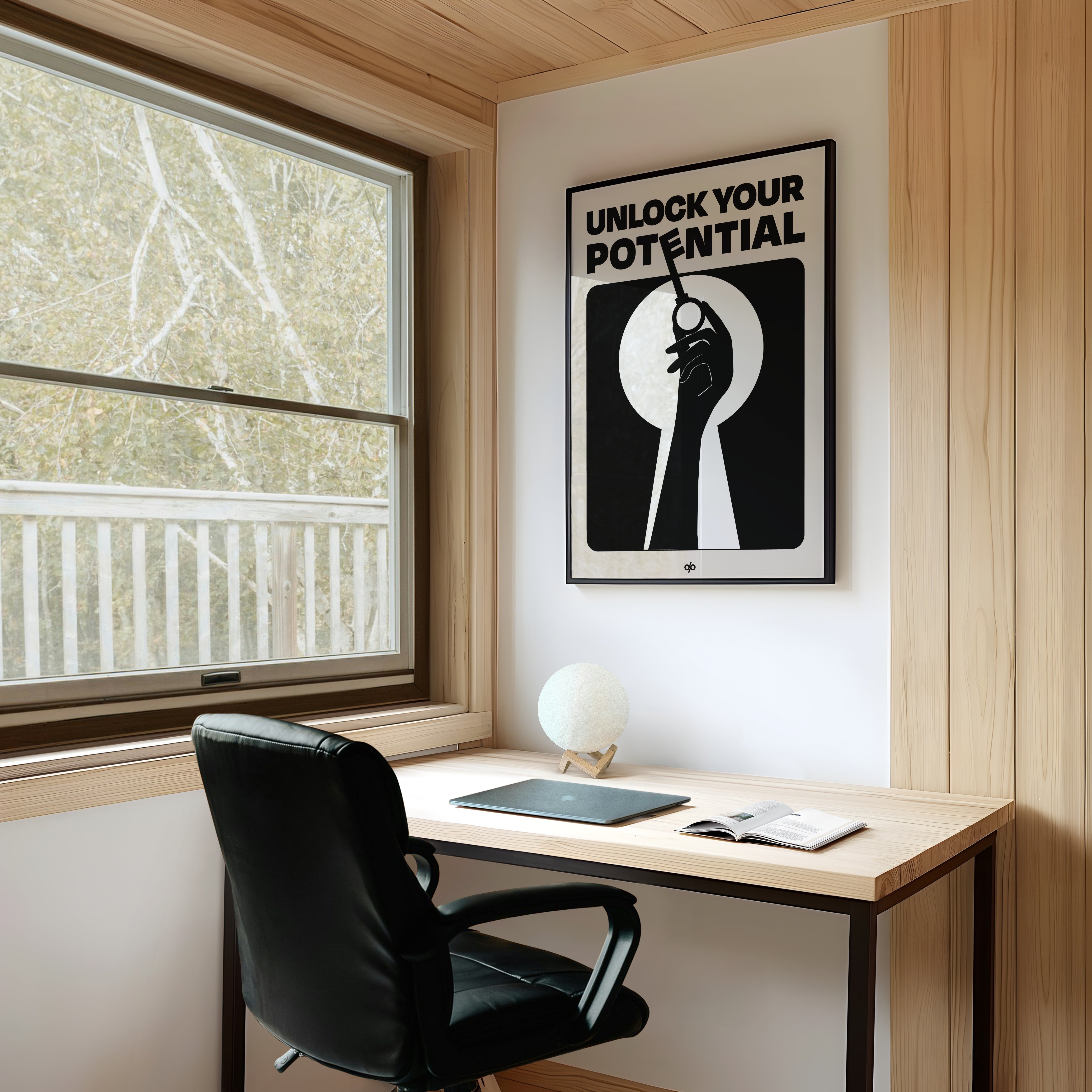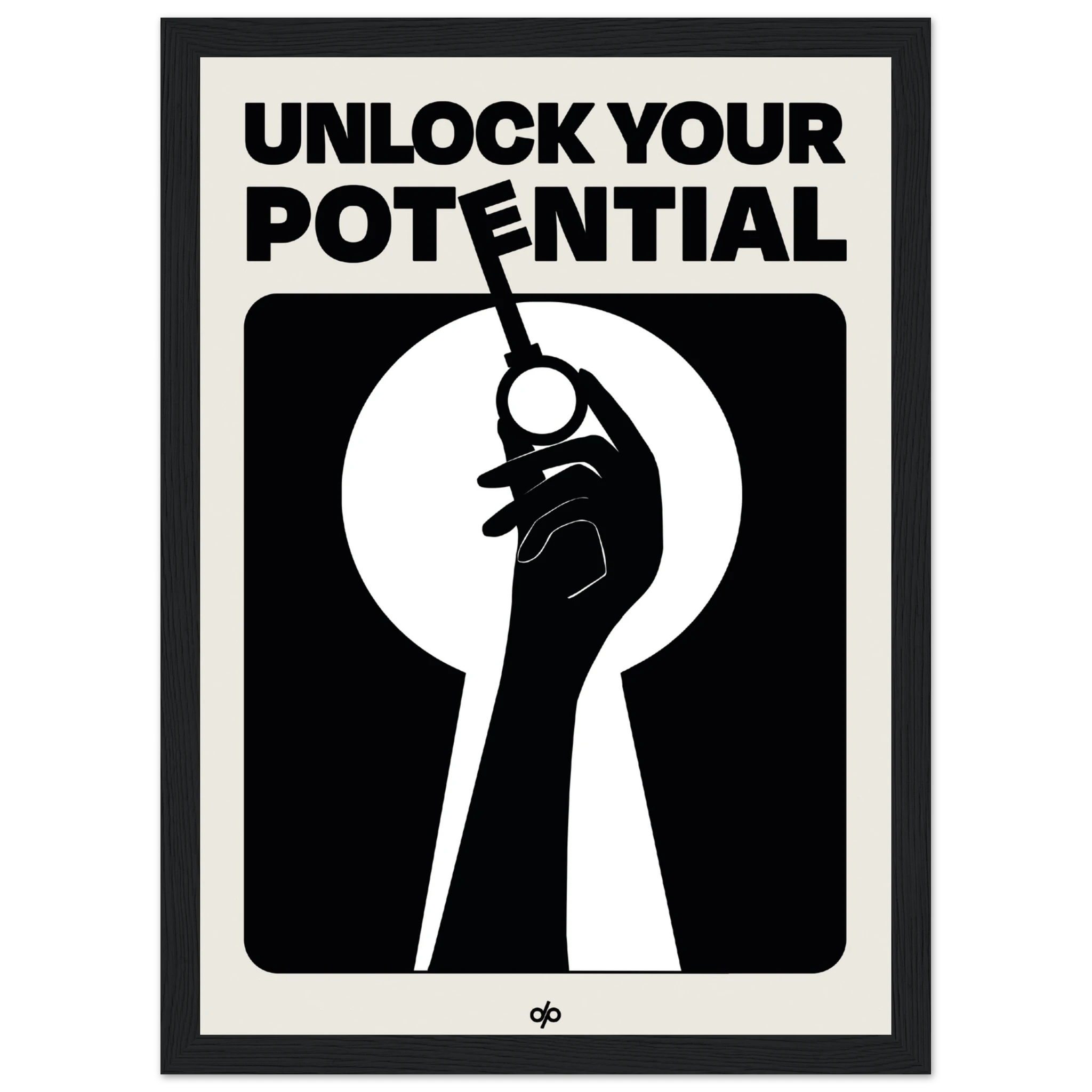 Unlock Potential poster captures a bold silhouette of a hand holding a key within the shape of a keyhole, backed by strong typography that reads “Unlock Your Potential.” This striking black-and-white composition becomes a visual mantra, reminding viewers of the power they already hold to open new doors.
