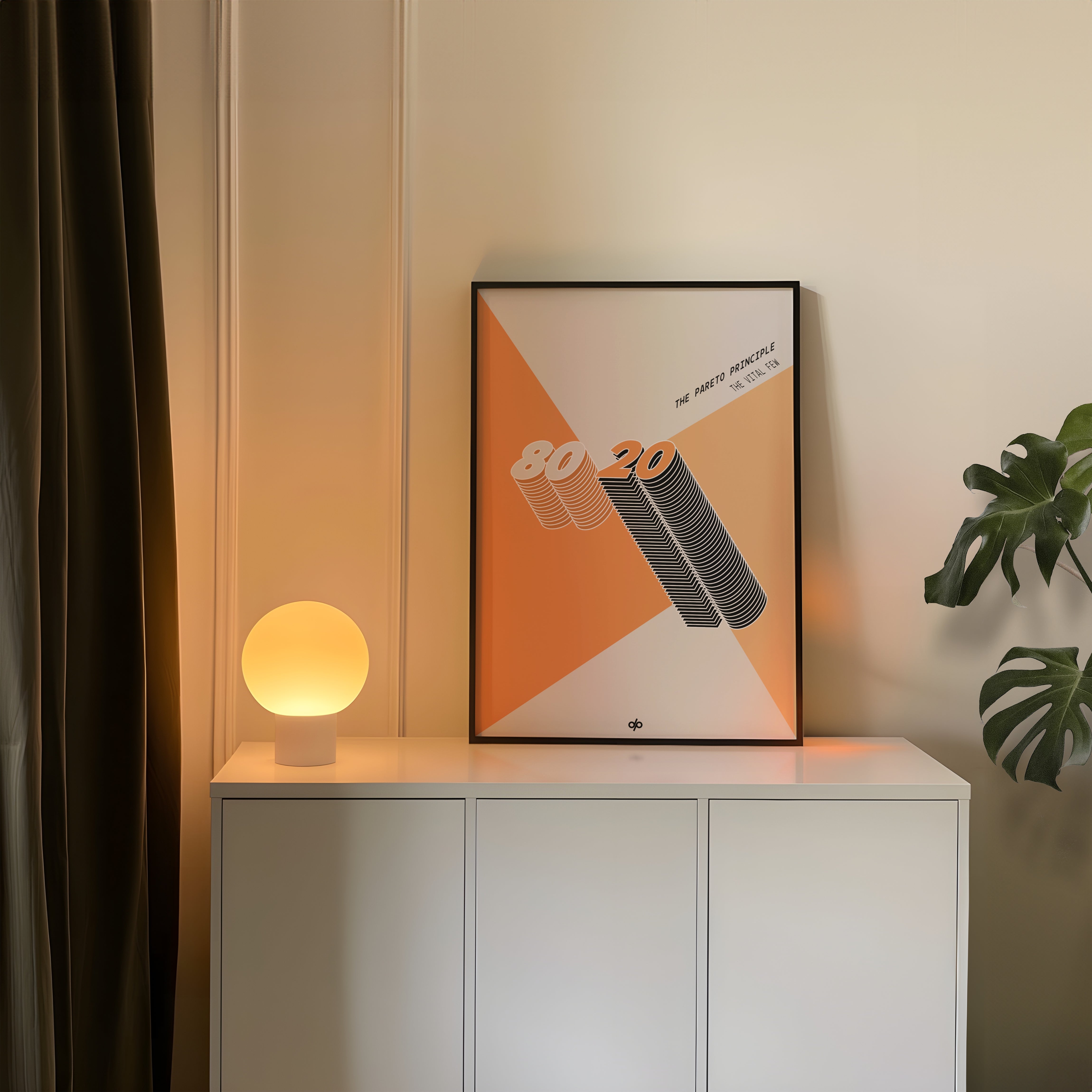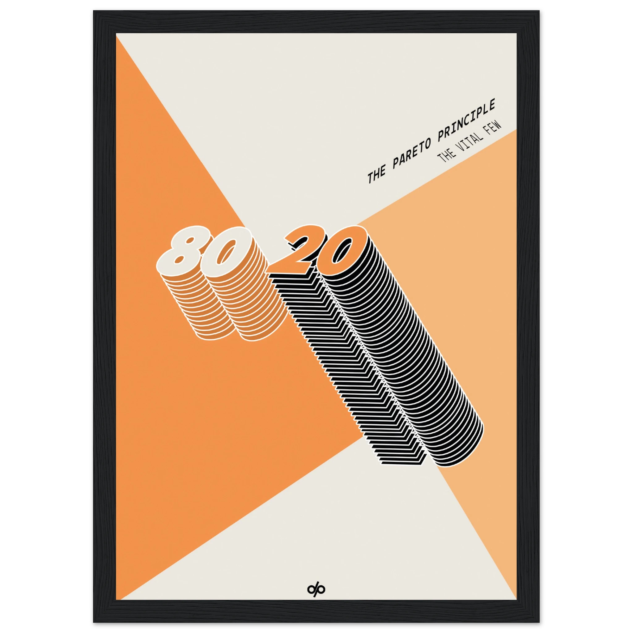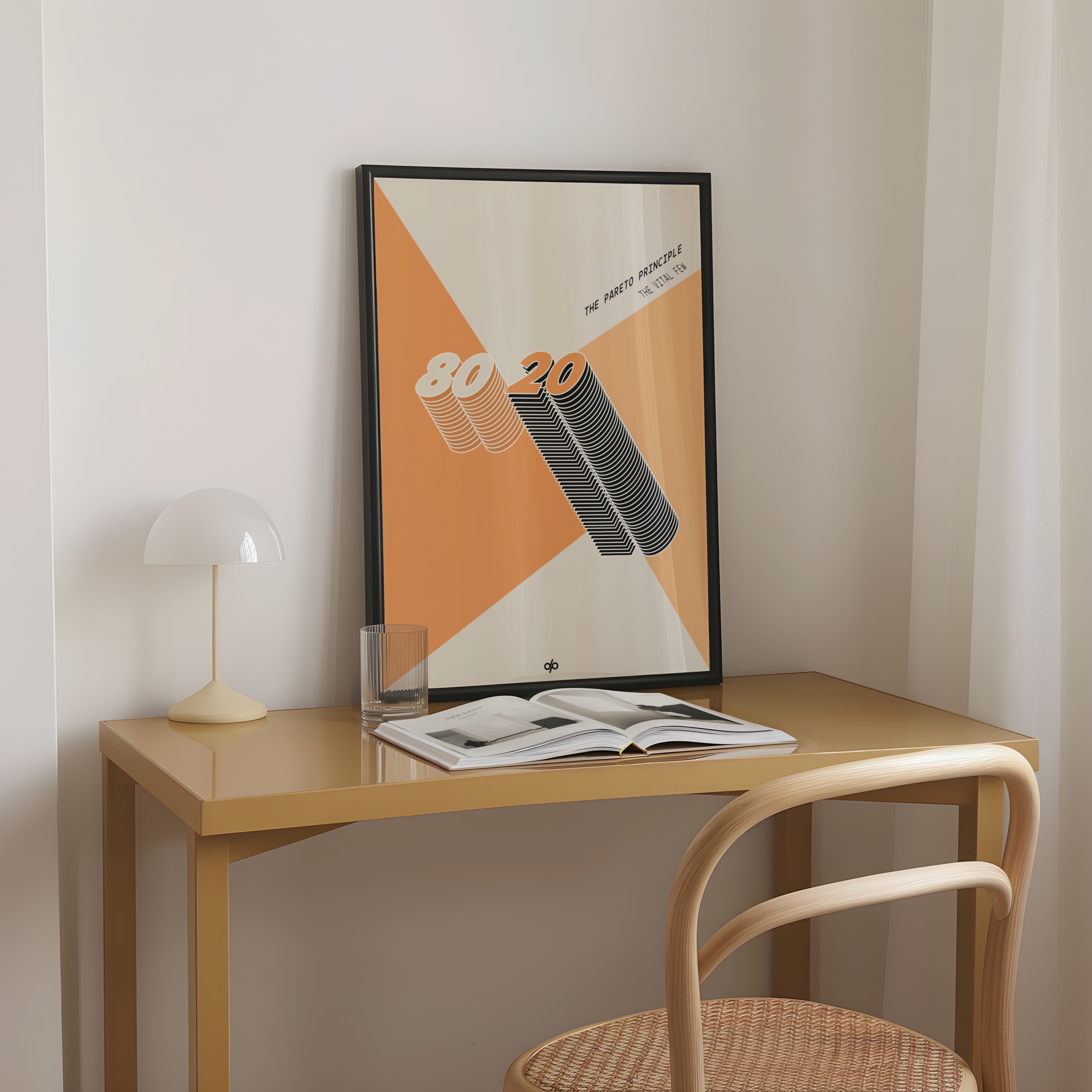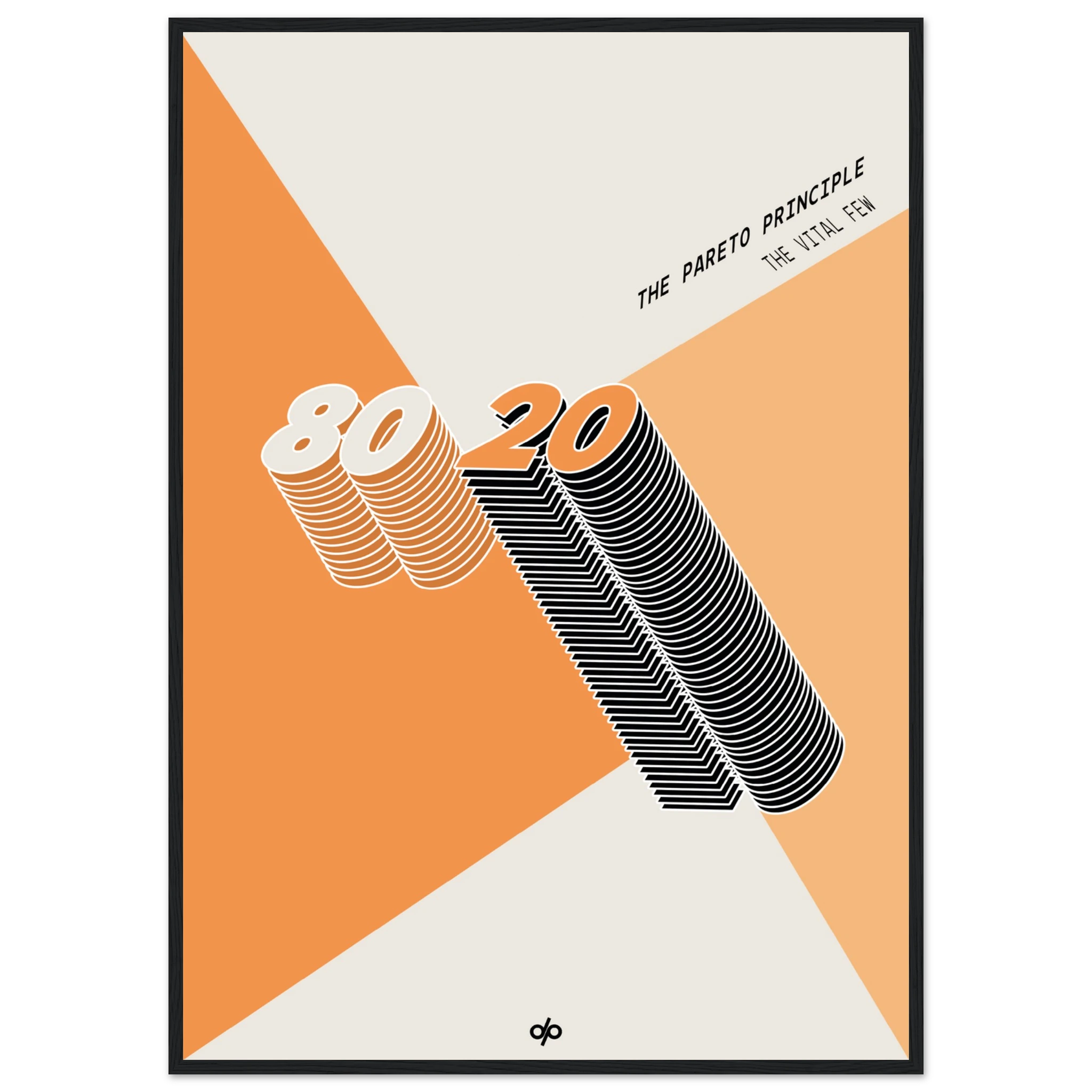 The 80/20 Rule poster brings to life the famed Pareto Principle with a bold visual metaphor: two stacked columns representing the contrast between the 80% of outcomes and the 20% of causes. Titled “The Vital Few,” this design reminds viewers that small, focused actions often lead to the most meaningful results. It’s a minimalist but impactful tribute to working smarter, not harder.