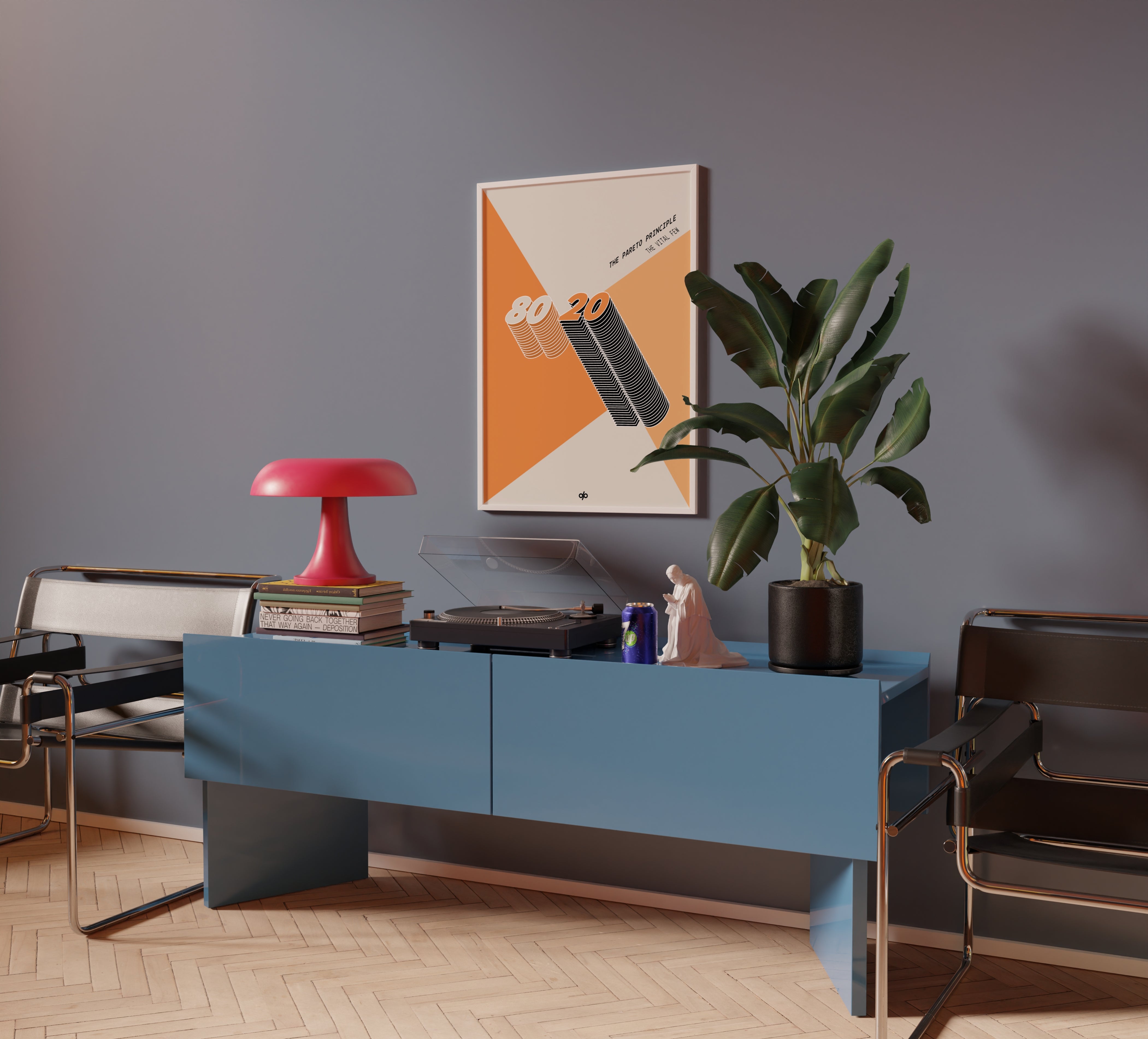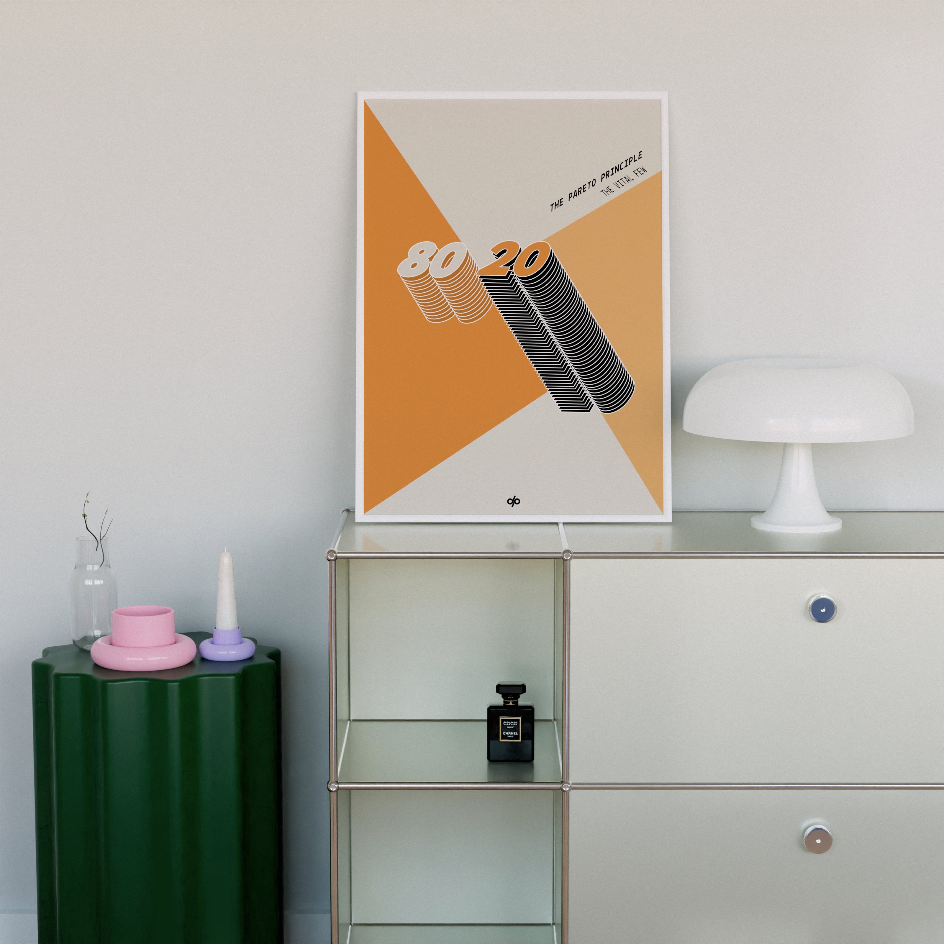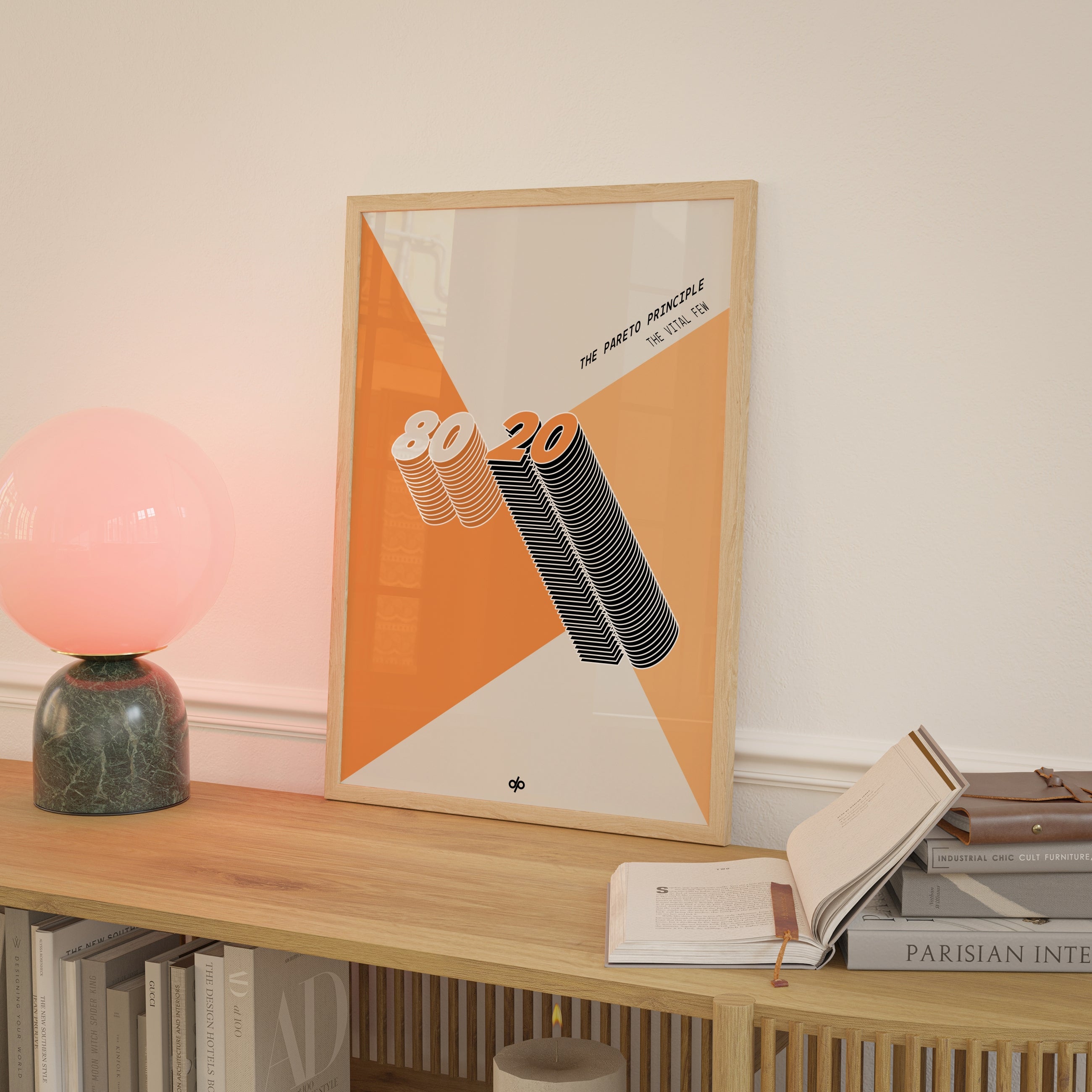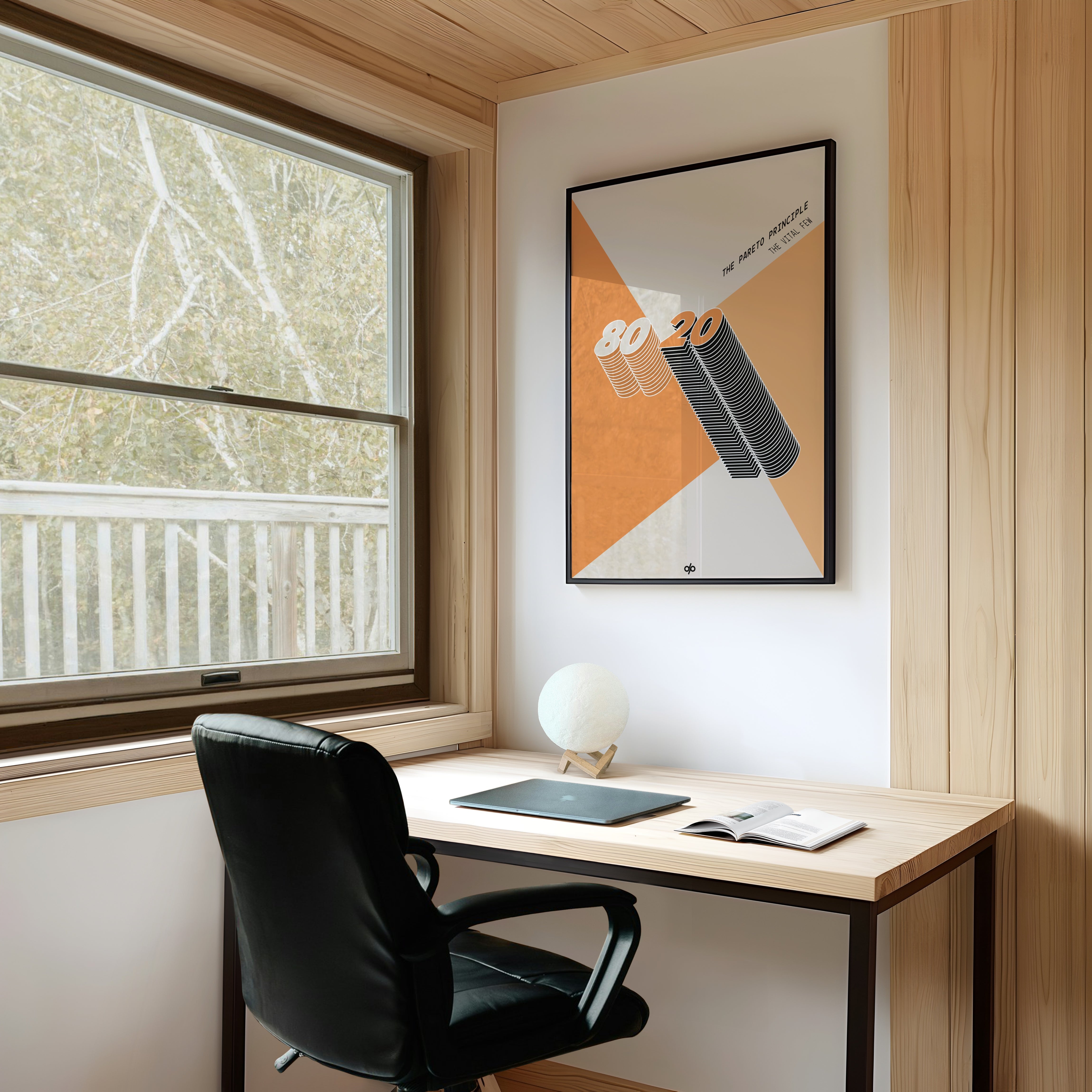 The 80/20 Rule poster brings to life the famed Pareto Principle with a bold visual metaphor: two stacked columns representing the contrast between the 80% of outcomes and the 20% of causes. Titled “The Vital Few,” this design reminds viewers that small, focused actions often lead to the most meaningful results. It’s a minimalist but impactful tribute to working smarter, not harder.