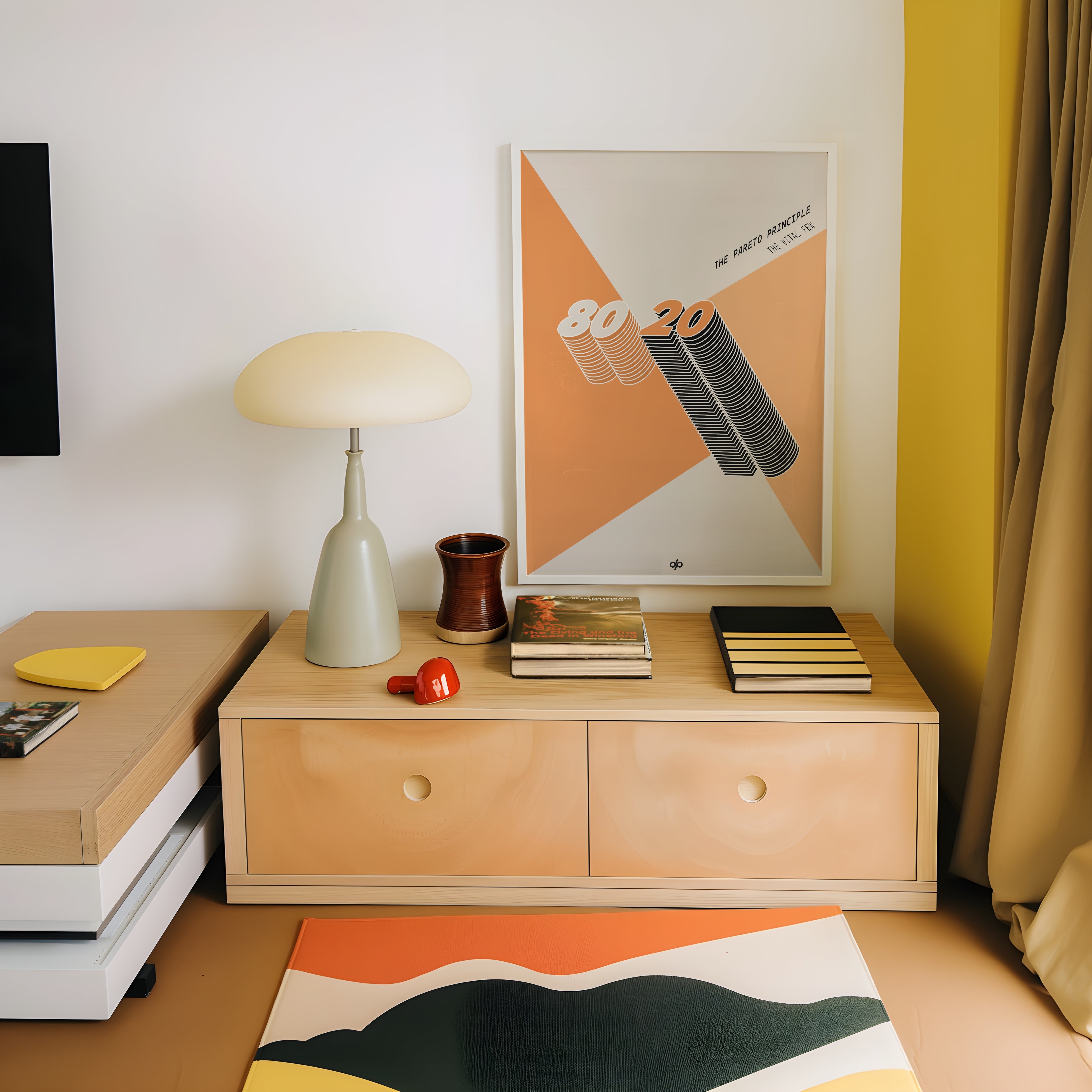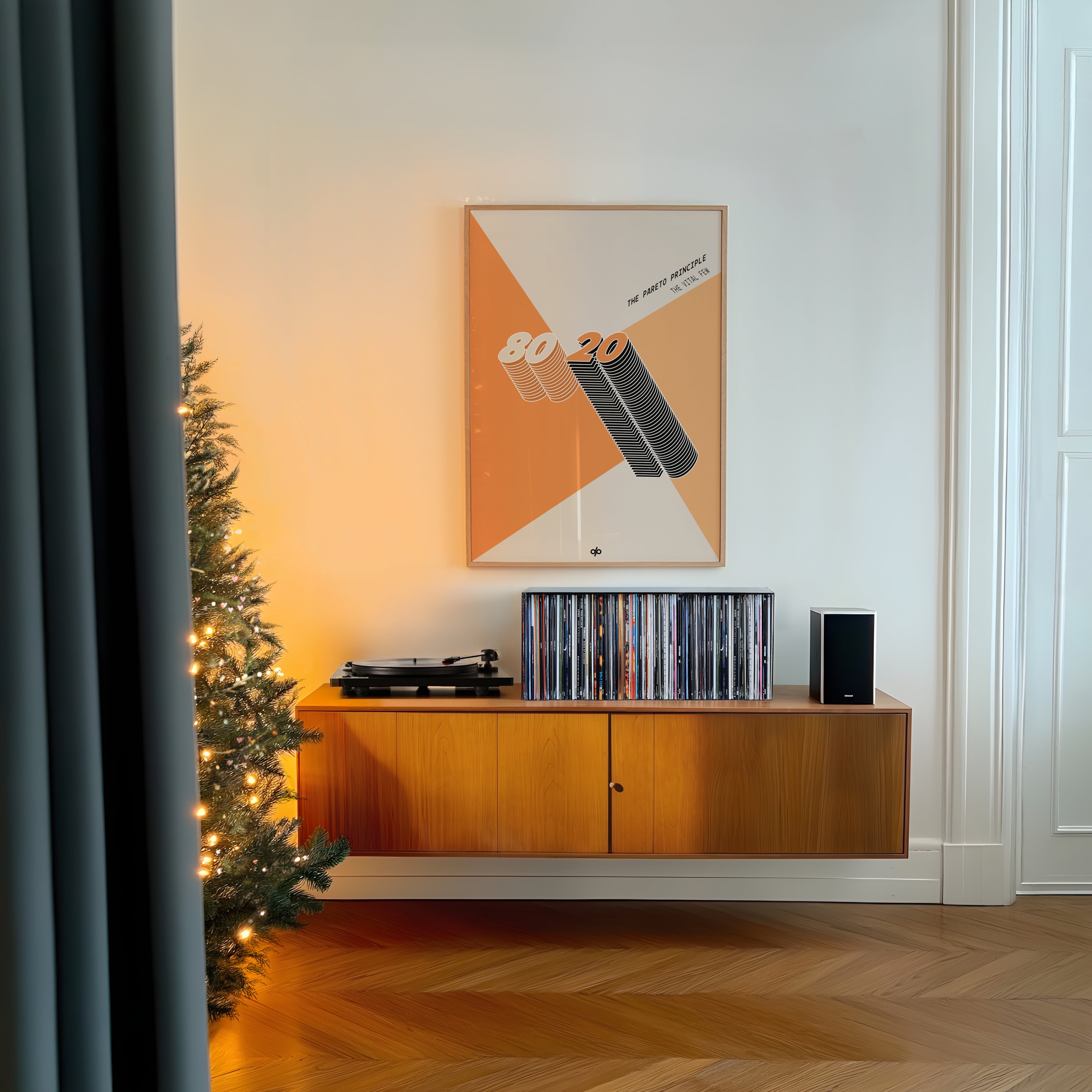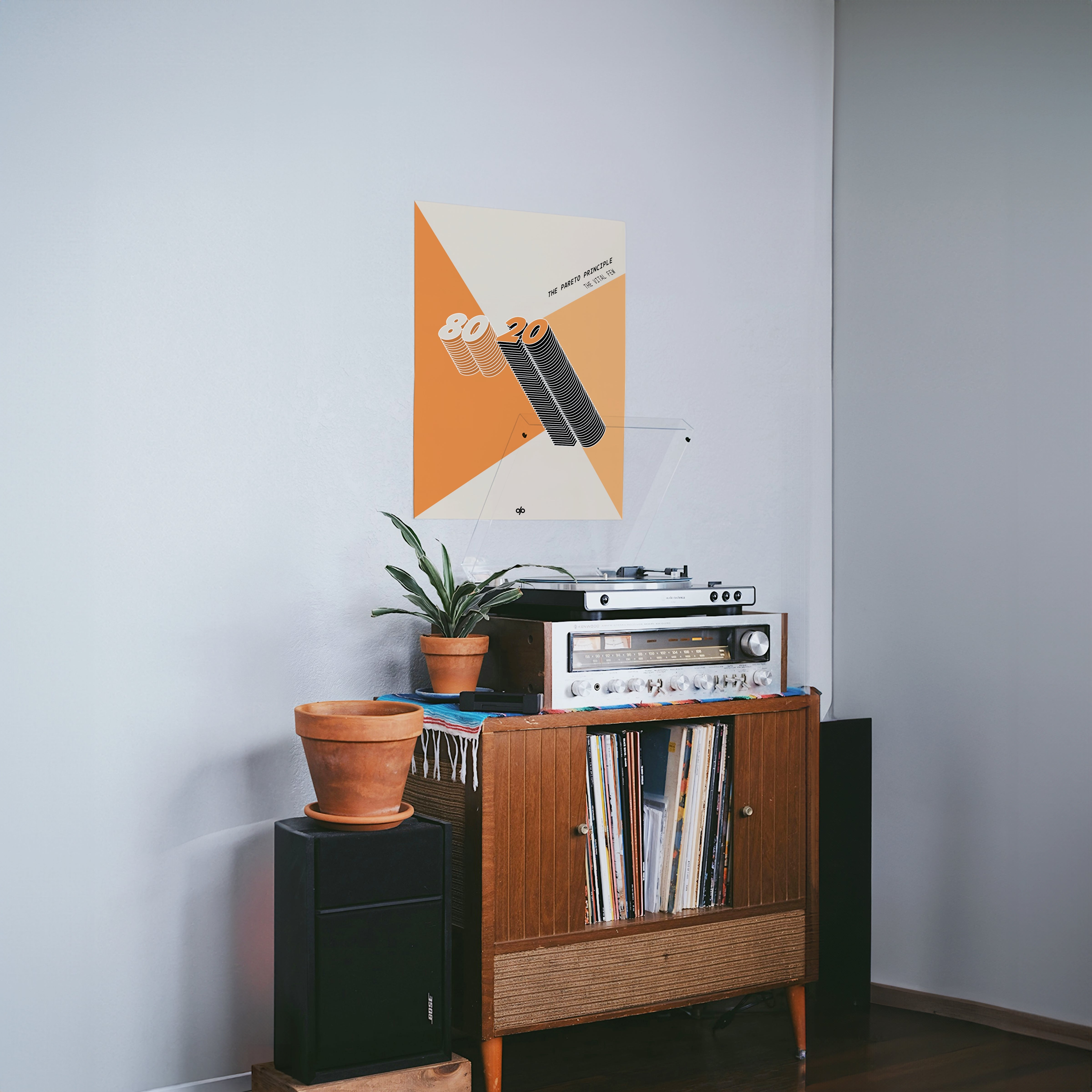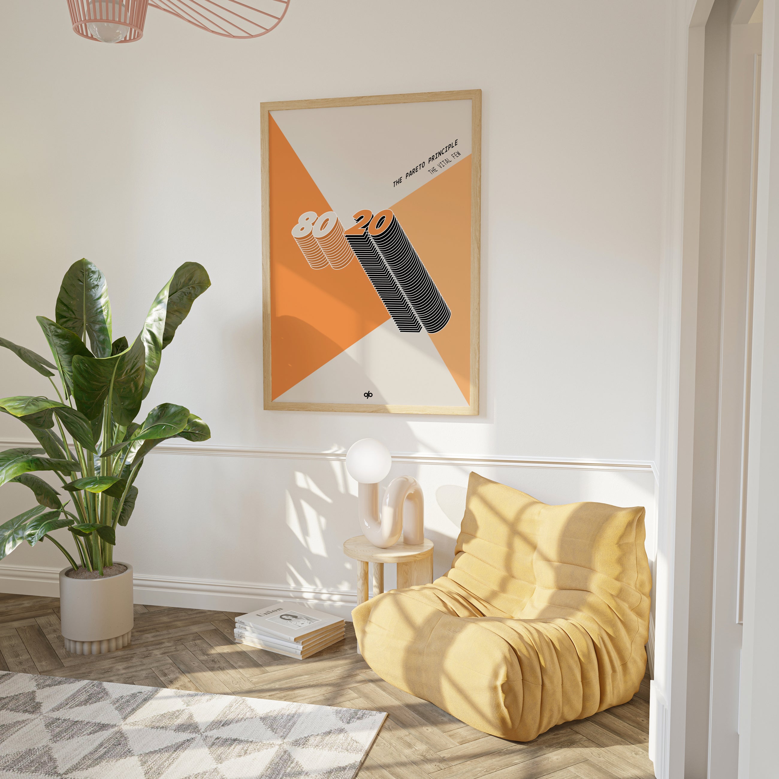 The 80/20 Rule poster brings to life the famed Pareto Principle with a bold visual metaphor: two stacked columns representing the contrast between the 80% of outcomes and the 20% of causes. Titled “The Vital Few,” this design reminds viewers that small, focused actions often lead to the most meaningful results. It’s a minimalist but impactful tribute to working smarter, not harder.