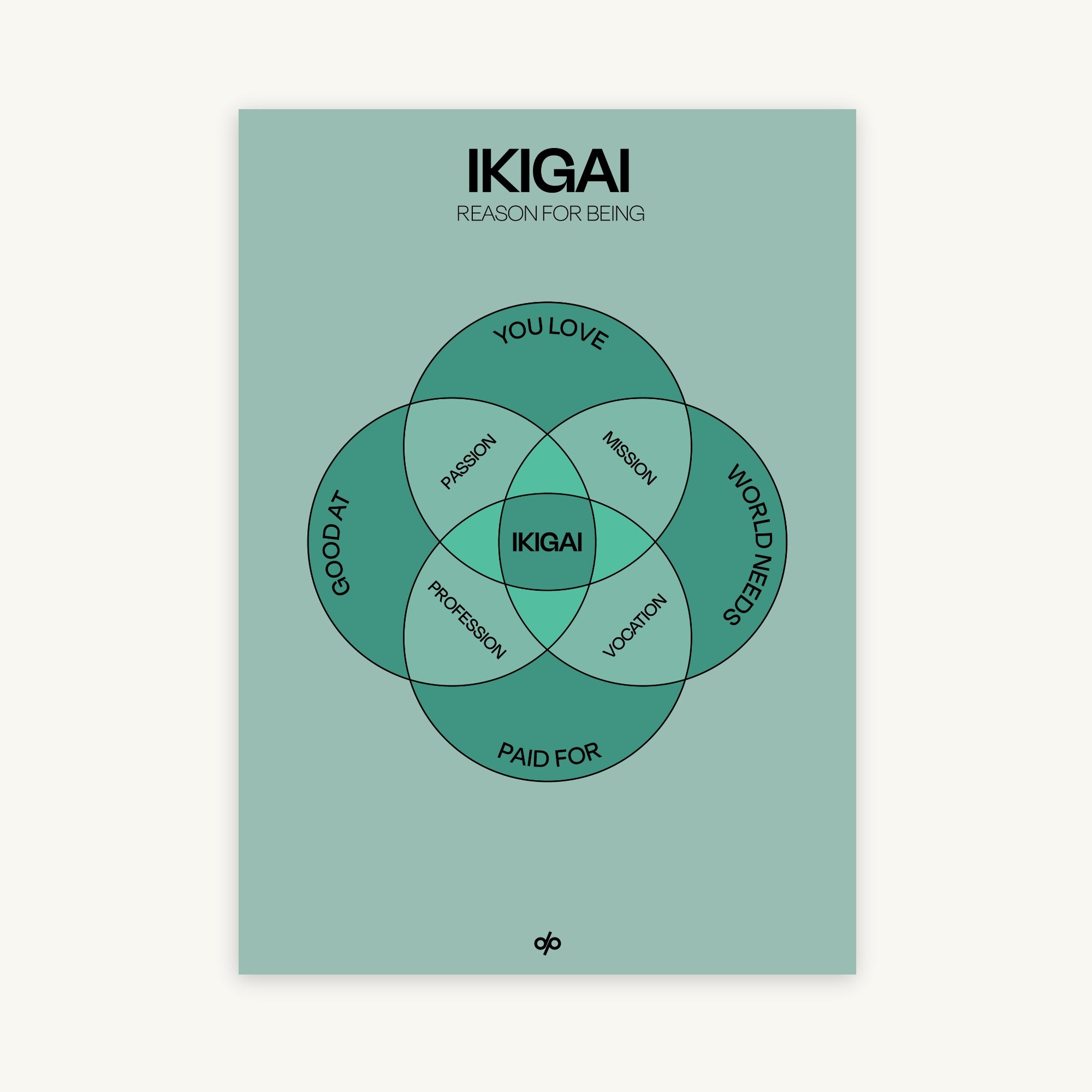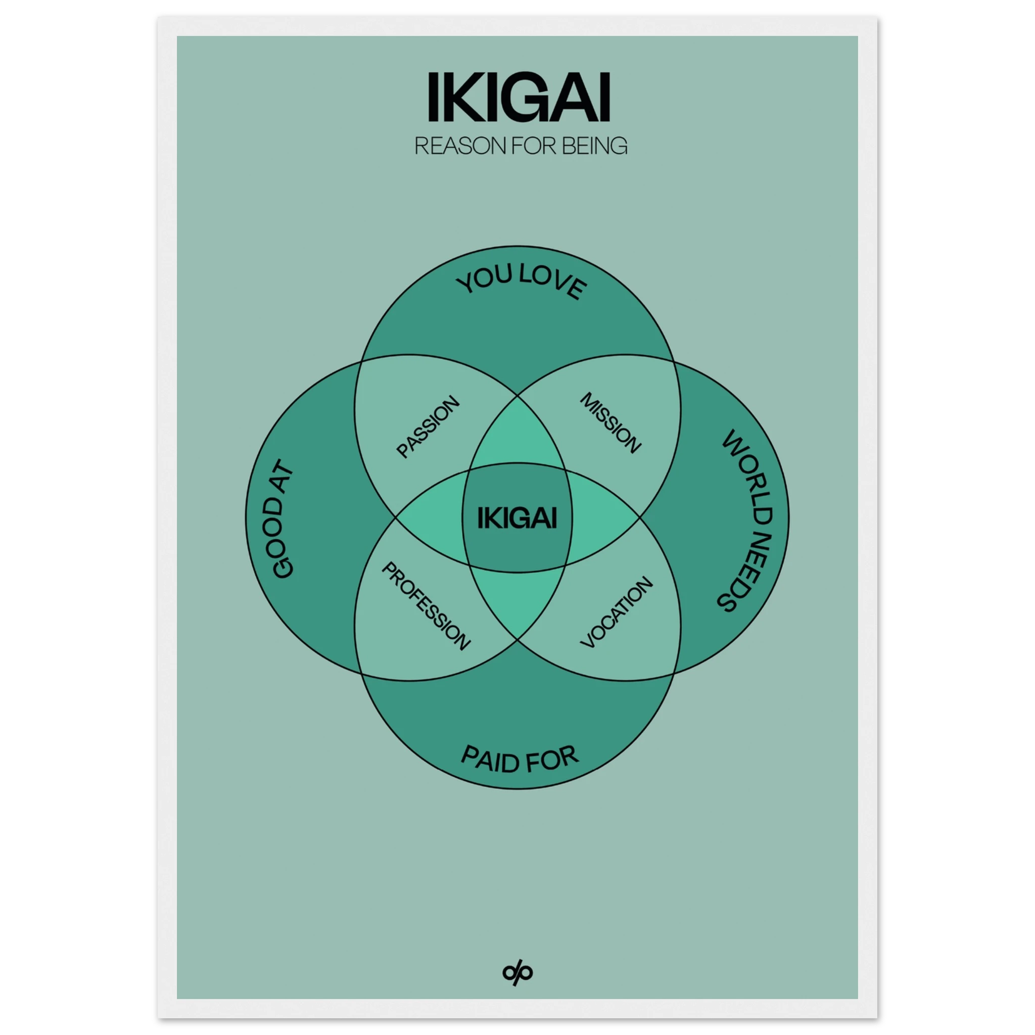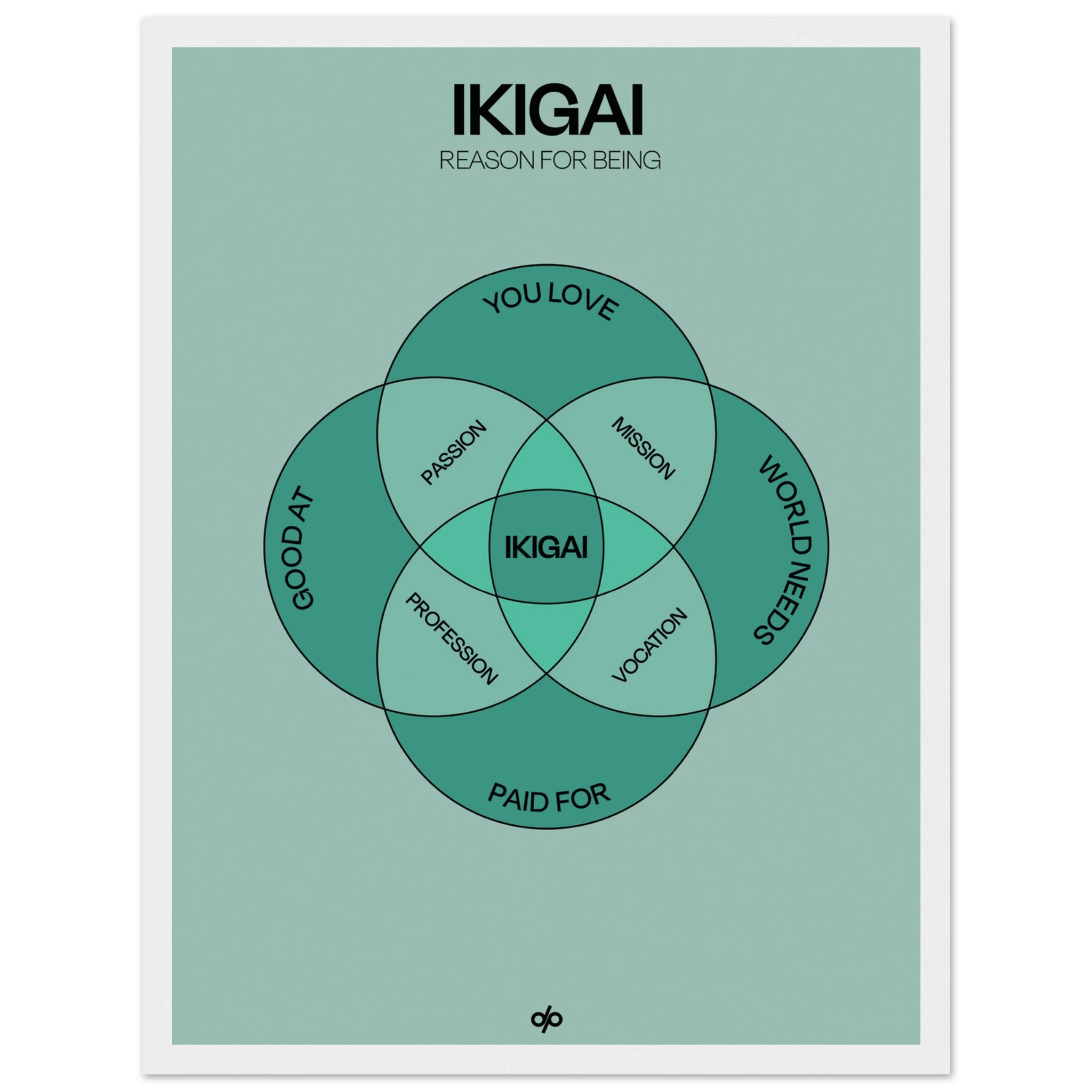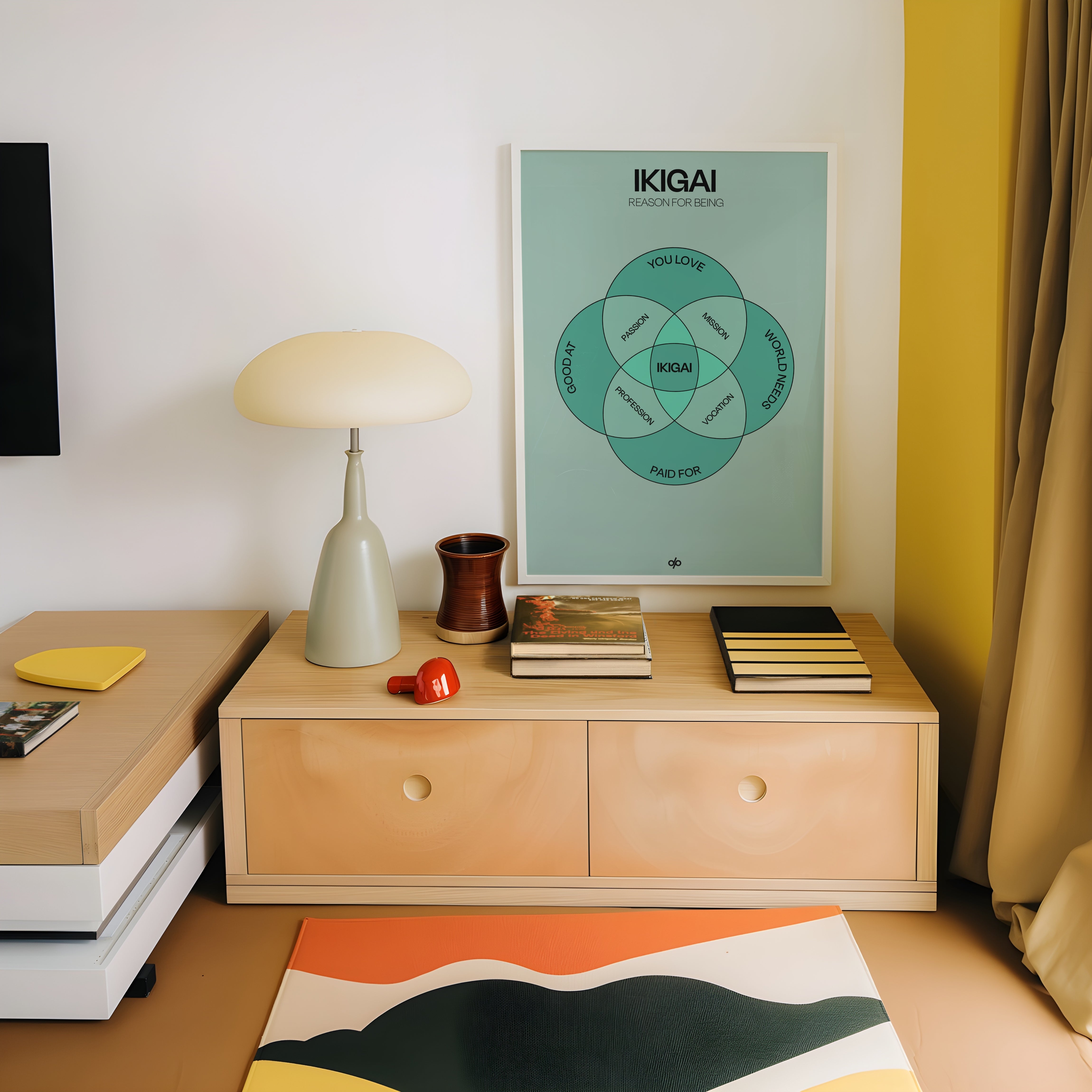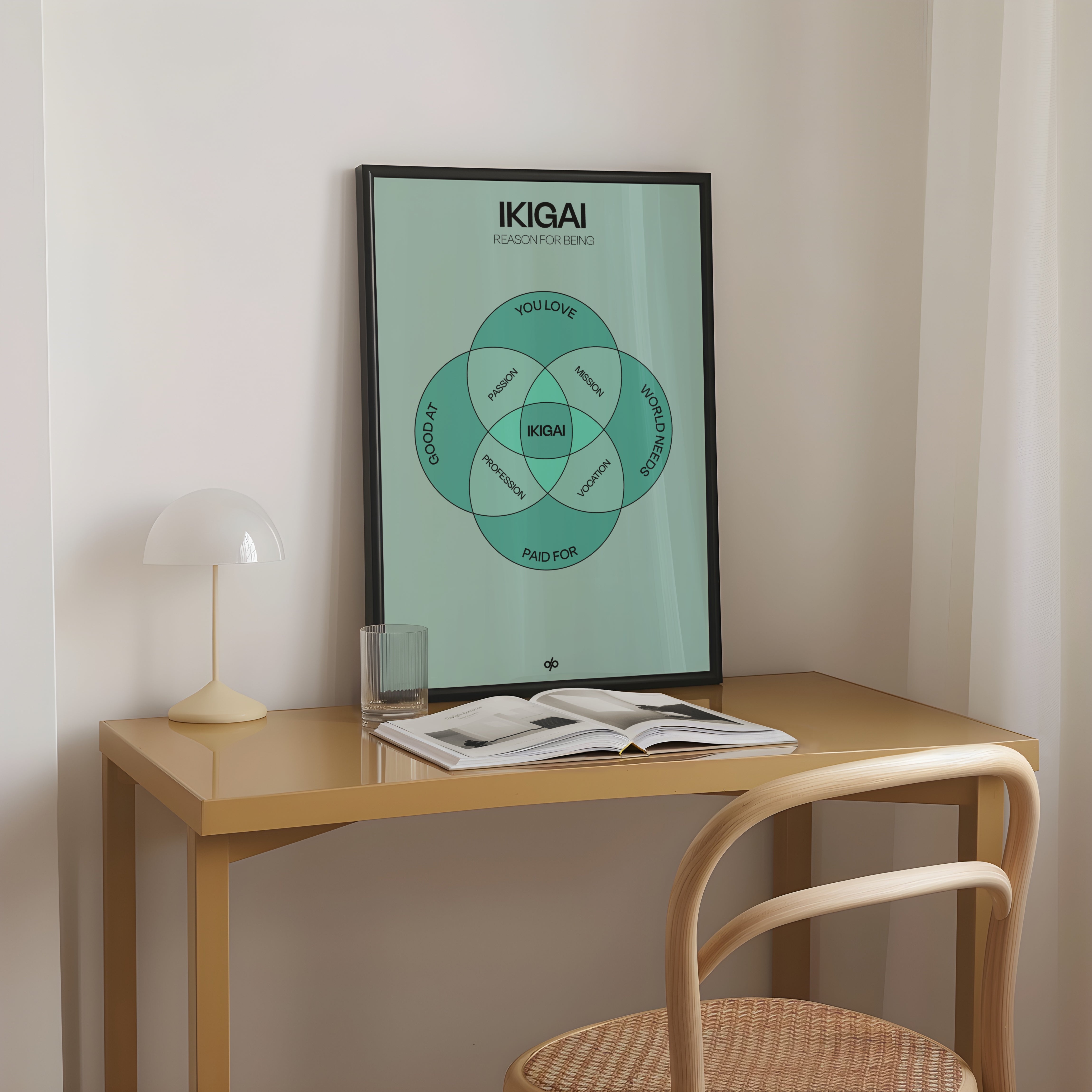 Ikigai art poster visualizes the Japanese concept of “reason for being” through a clean, calming Venn diagram that connects what you love, what you’re good at, what the world needs, and what you can be paid for. At the center lies Ikigai — the sweet spot of fulfillment. This design is a visual prompt for alignment, purpose, and personal clarity.