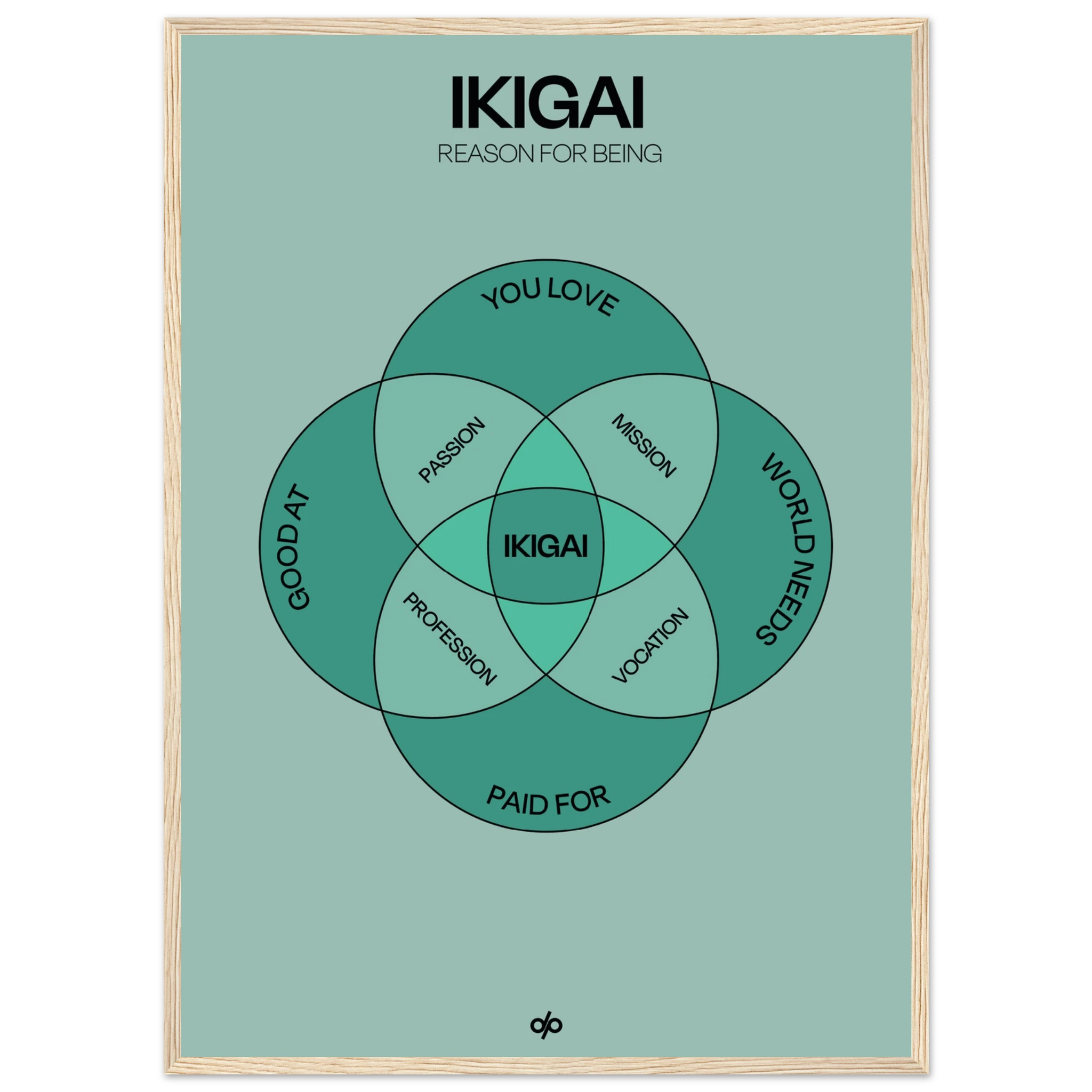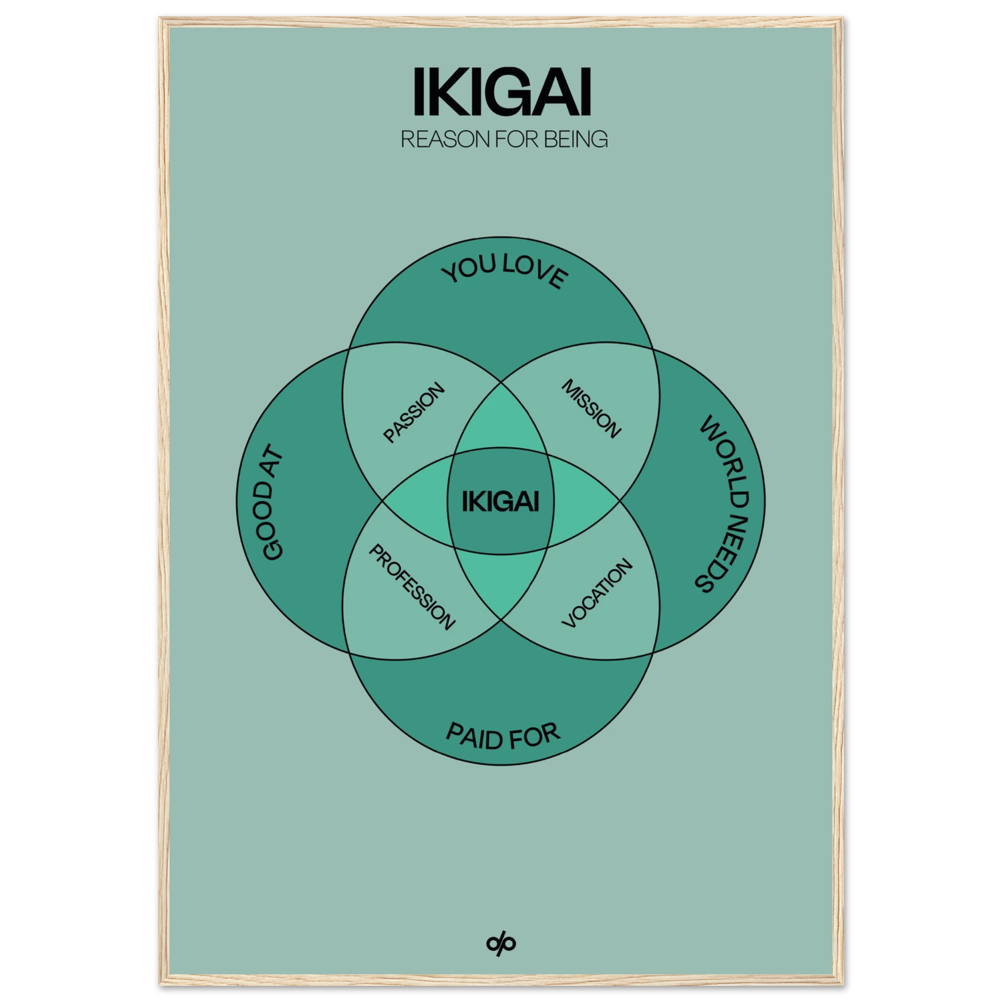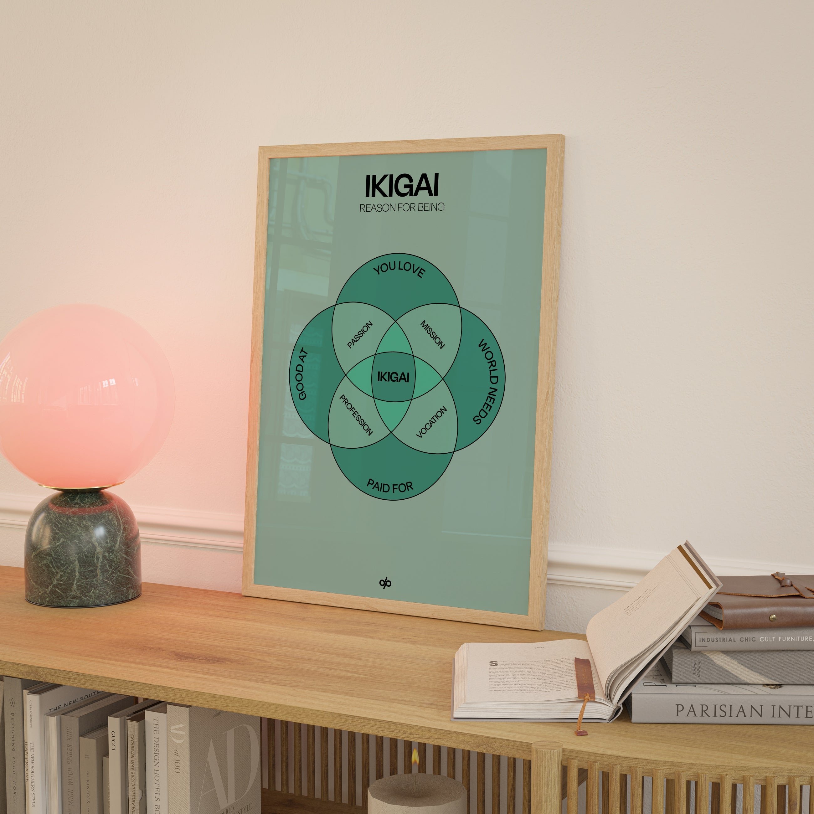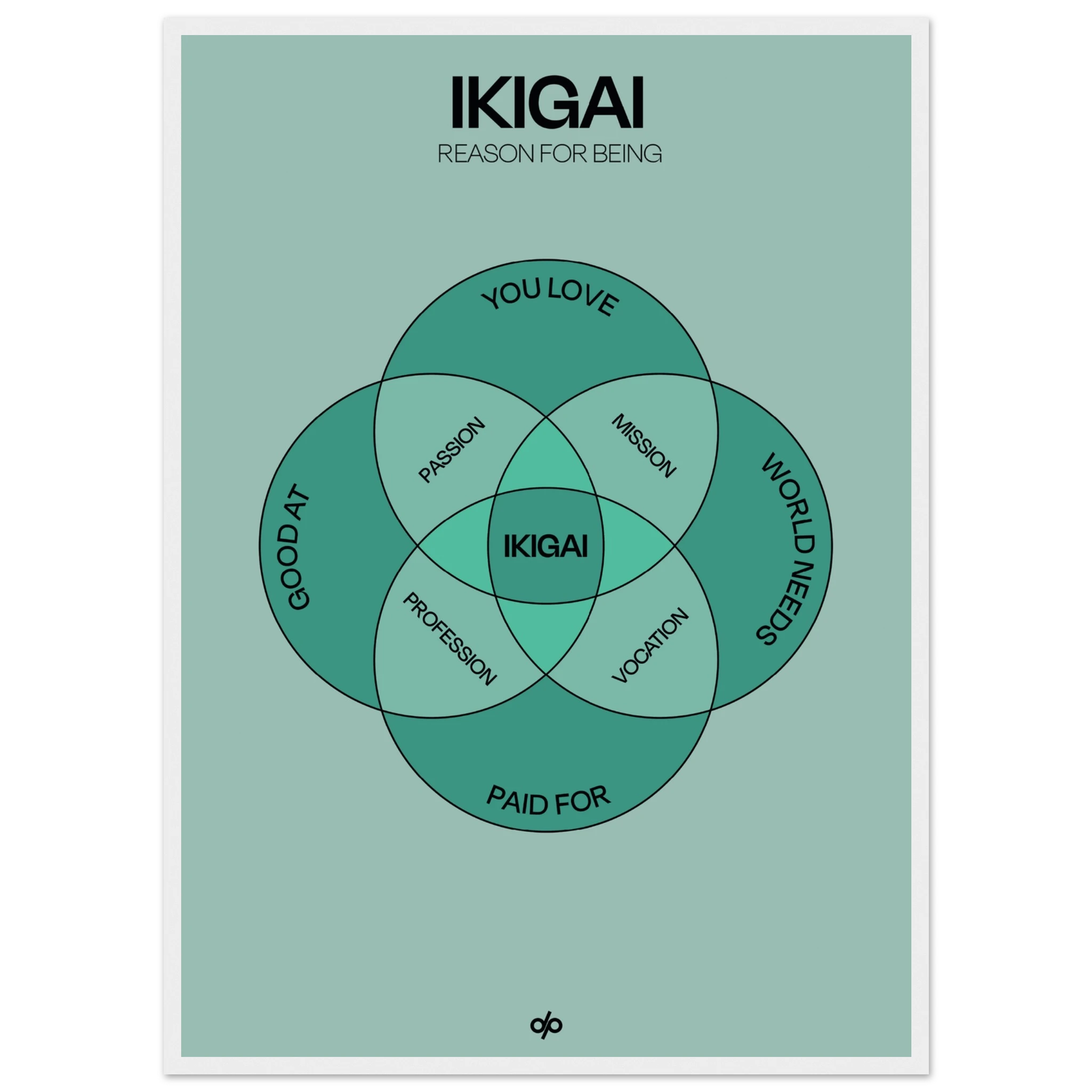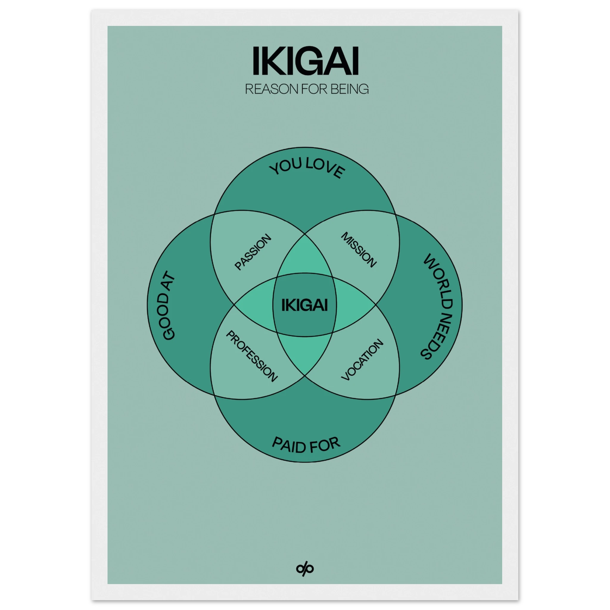 Ikigai art poster visualizes the Japanese concept of “reason for being” through a clean, calming Venn diagram that connects what you love, what you’re good at, what the world needs, and what you can be paid for. At the center lies Ikigai — the sweet spot of fulfillment. This design is a visual prompt for alignment, purpose, and personal clarity.