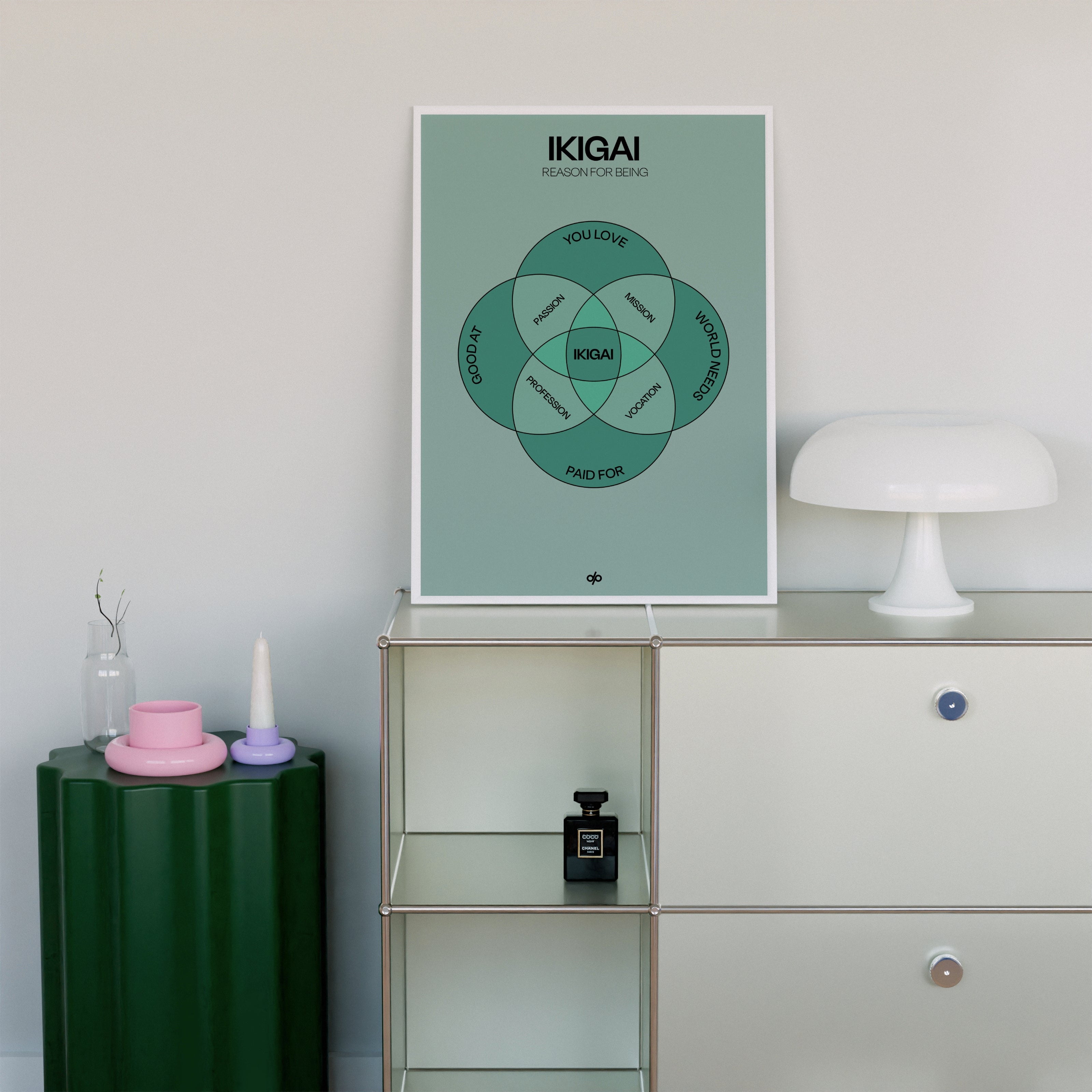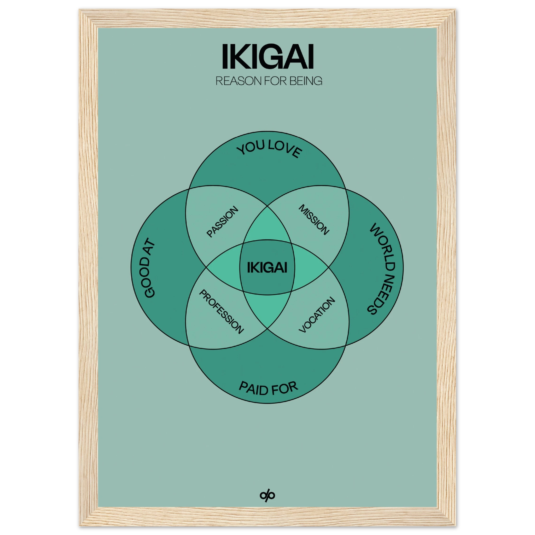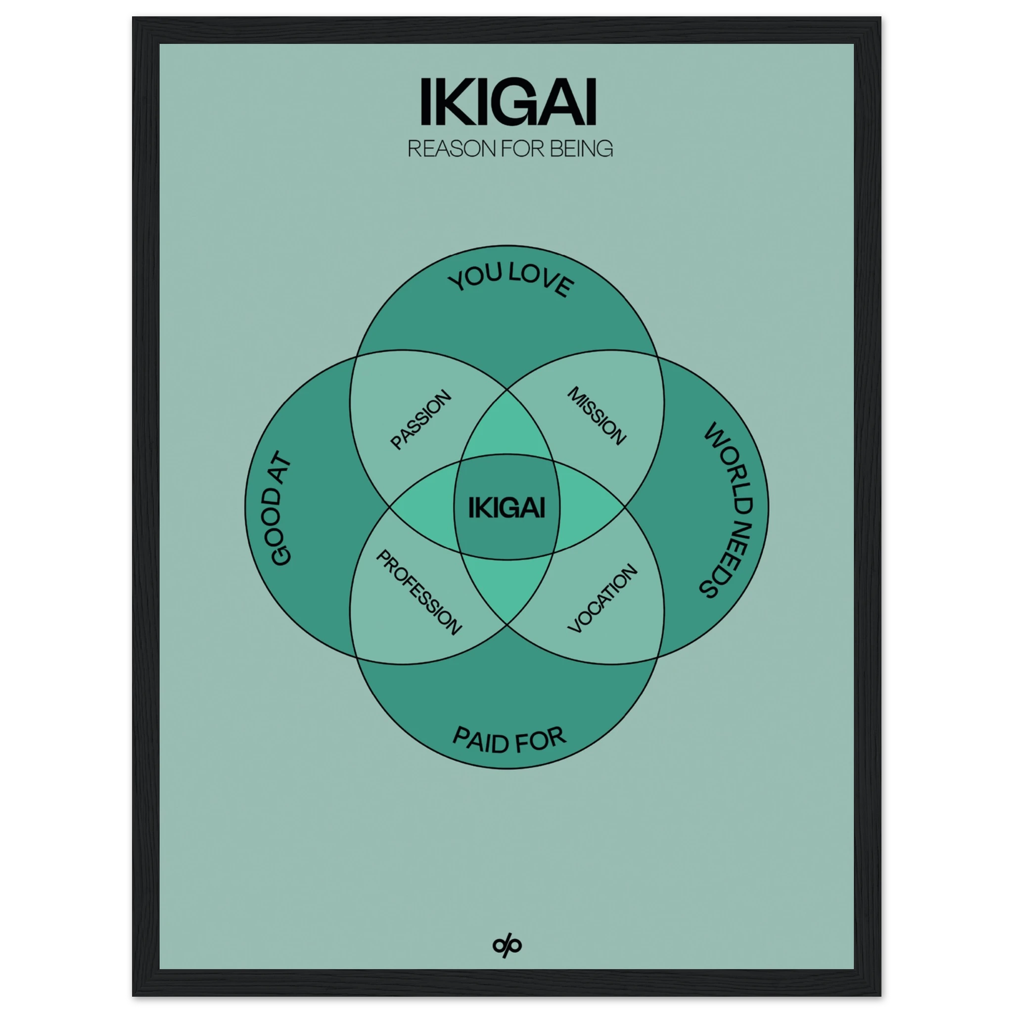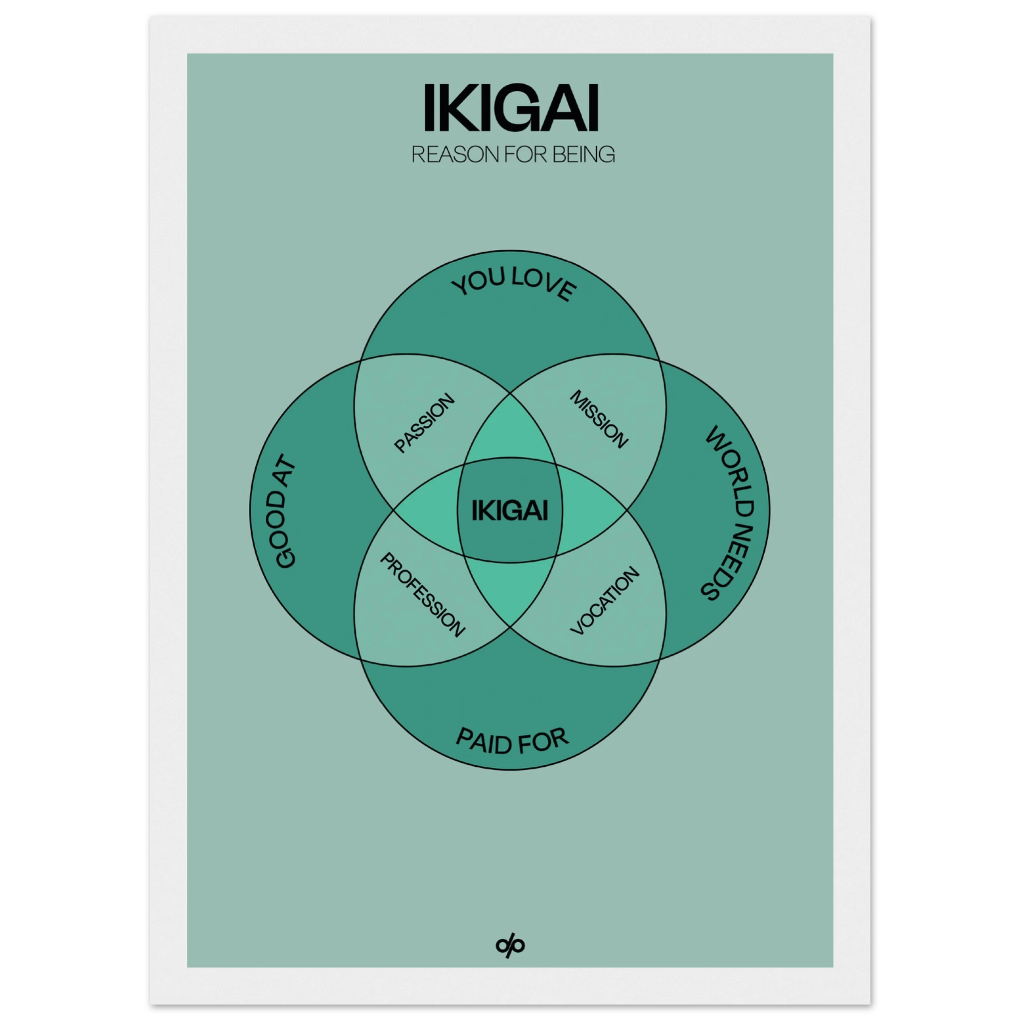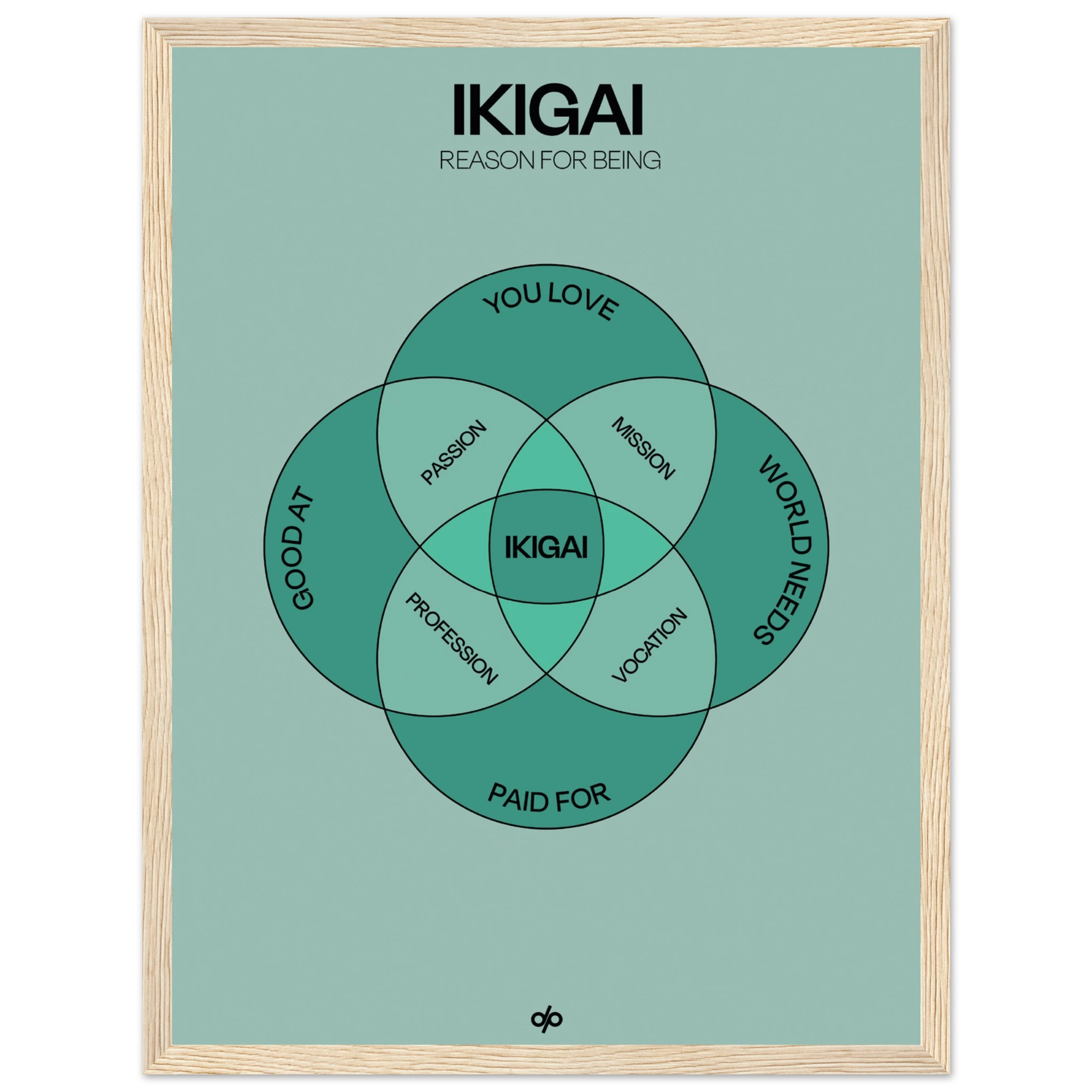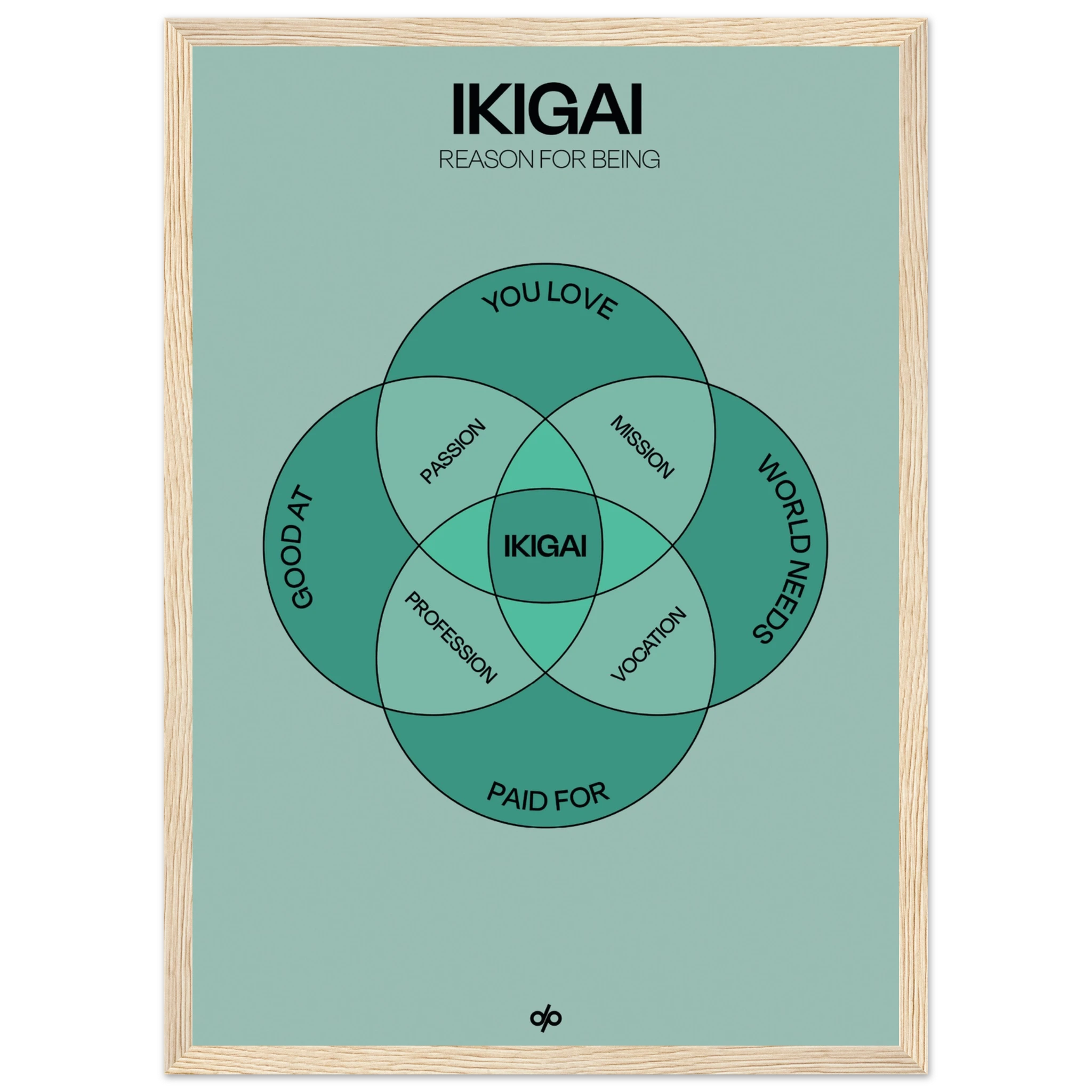 Ikigai art poster visualizes the Japanese concept of “reason for being” through a clean, calming Venn diagram that connects what you love, what you’re good at, what the world needs, and what you can be paid for. At the center lies Ikigai — the sweet spot of fulfillment. This design is a visual prompt for alignment, purpose, and personal clarity.