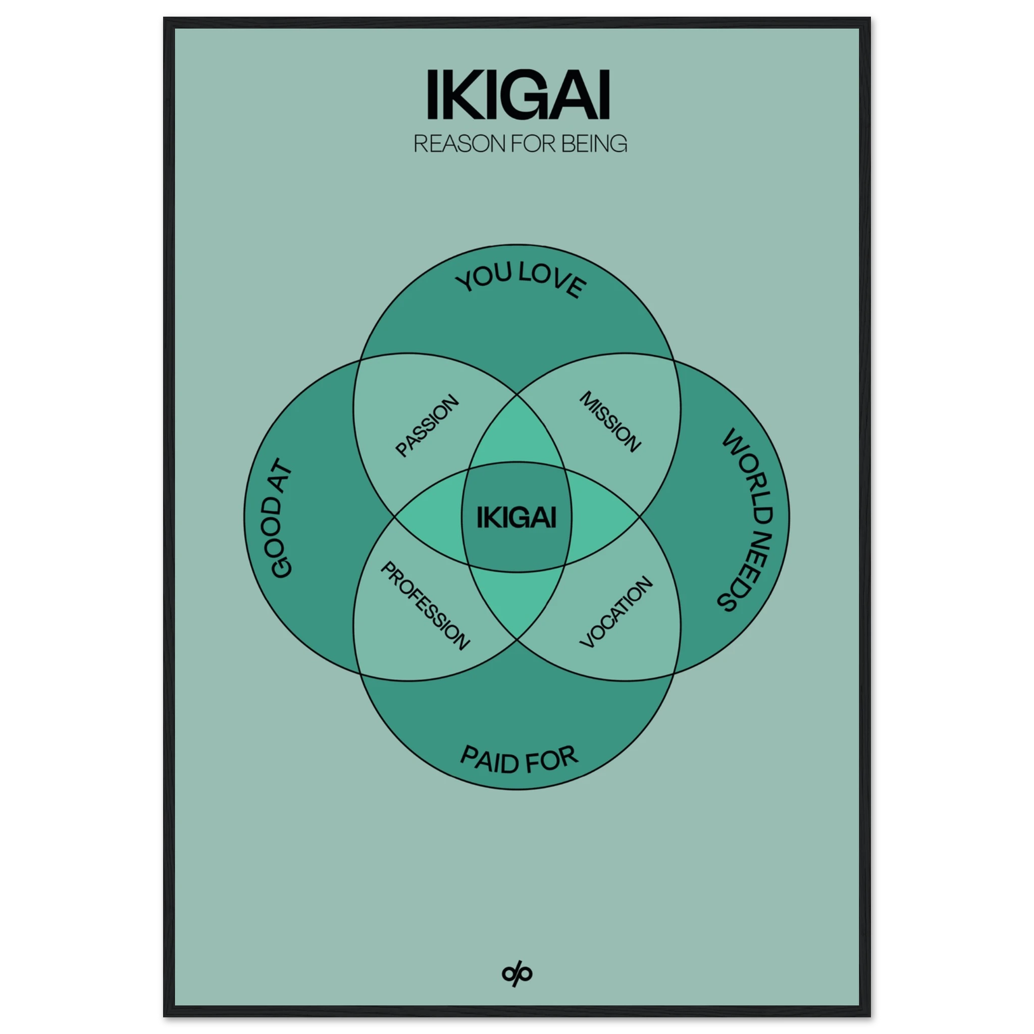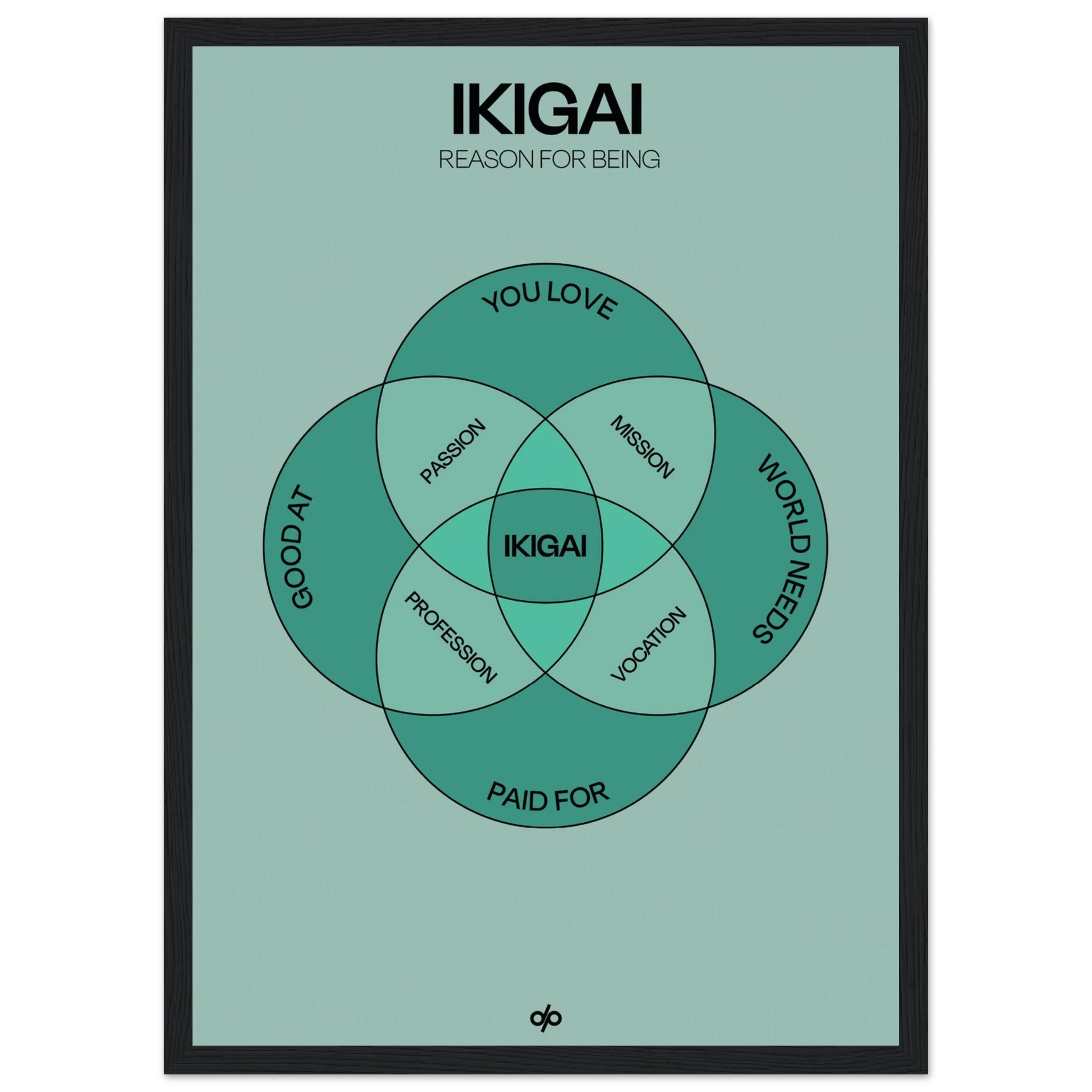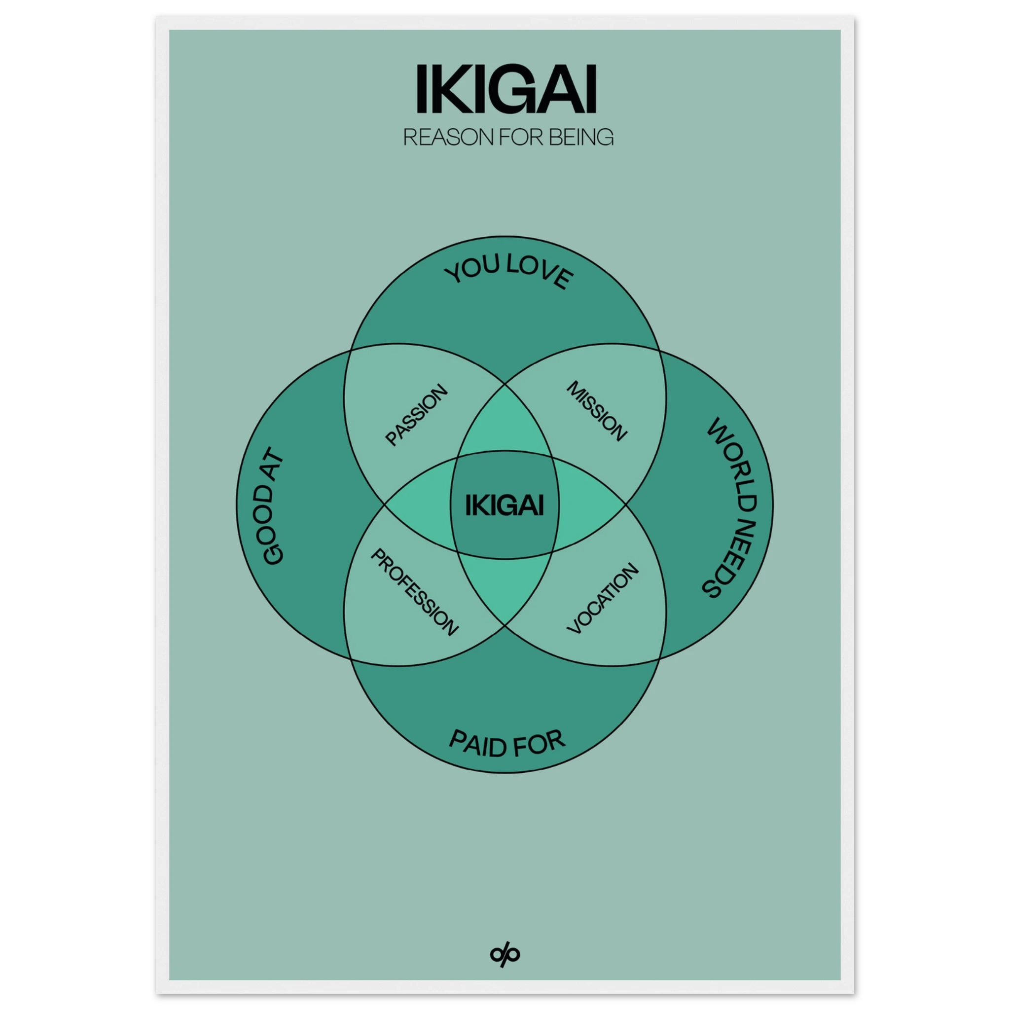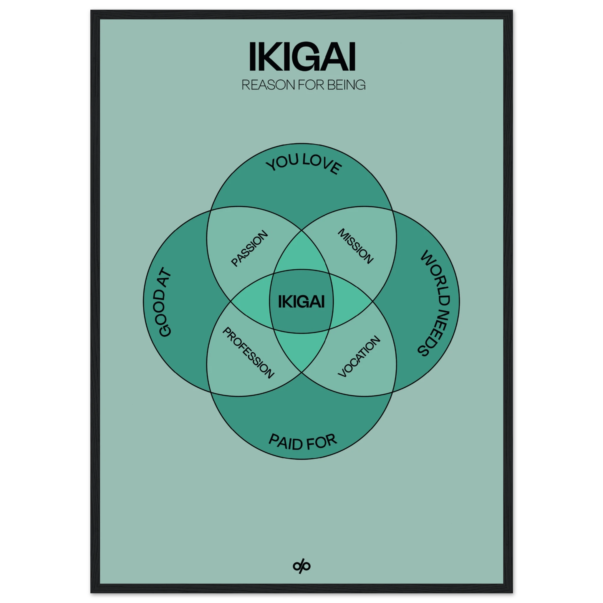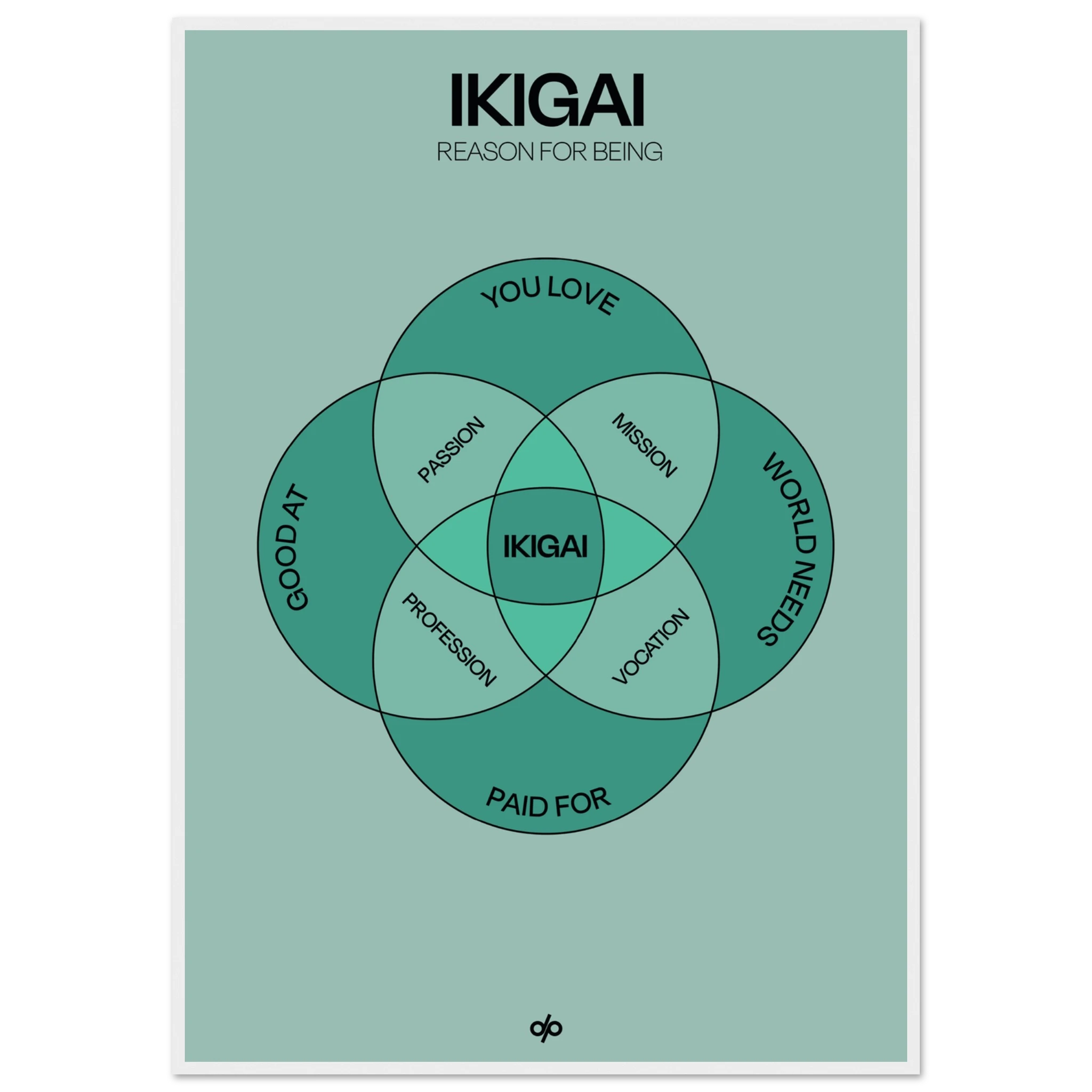 Ikigai art poster visualizes the Japanese concept of “reason for being” through a clean, calming Venn diagram that connects what you love, what you’re good at, what the world needs, and what you can be paid for. At the center lies Ikigai — the sweet spot of fulfillment. This design is a visual prompt for alignment, purpose, and personal clarity.