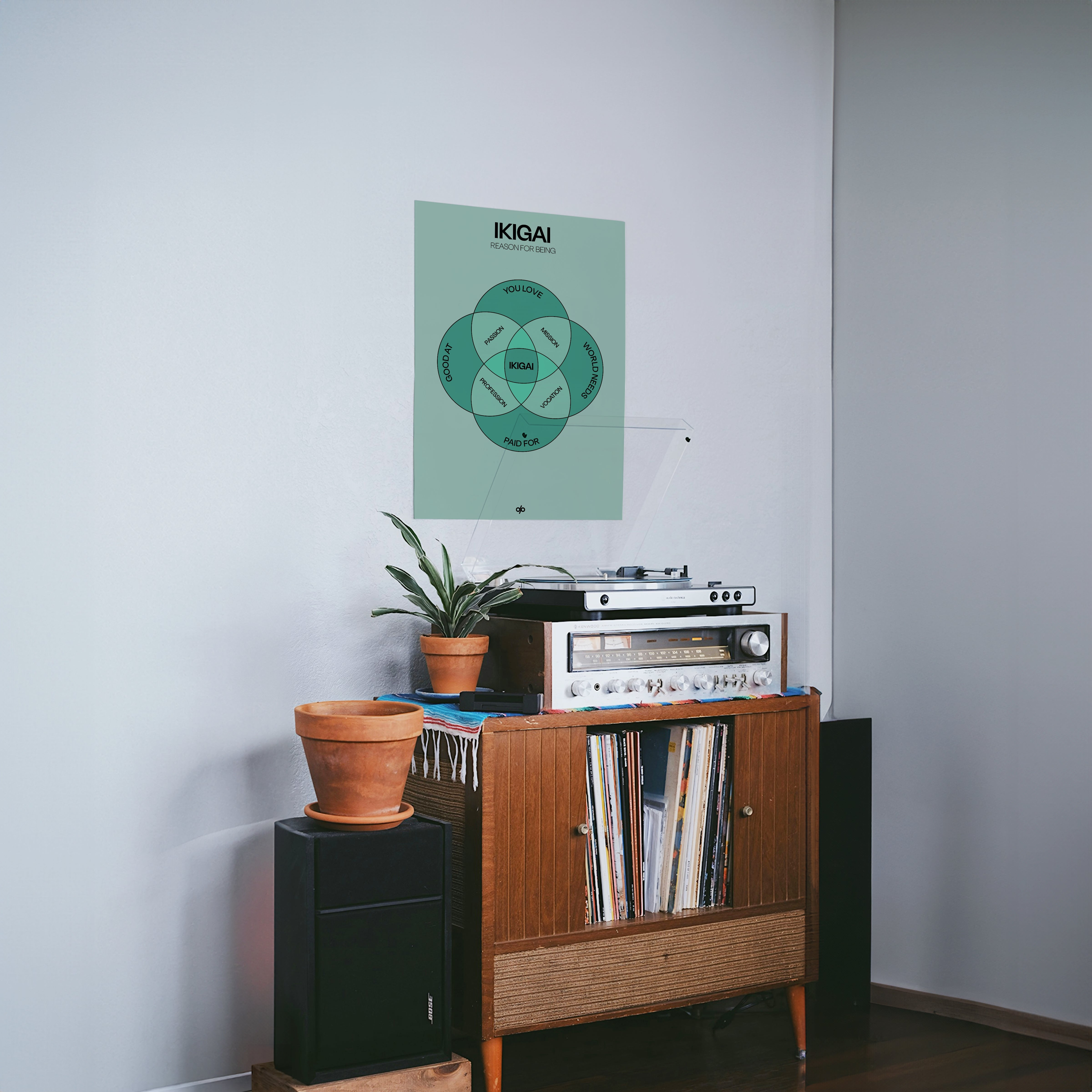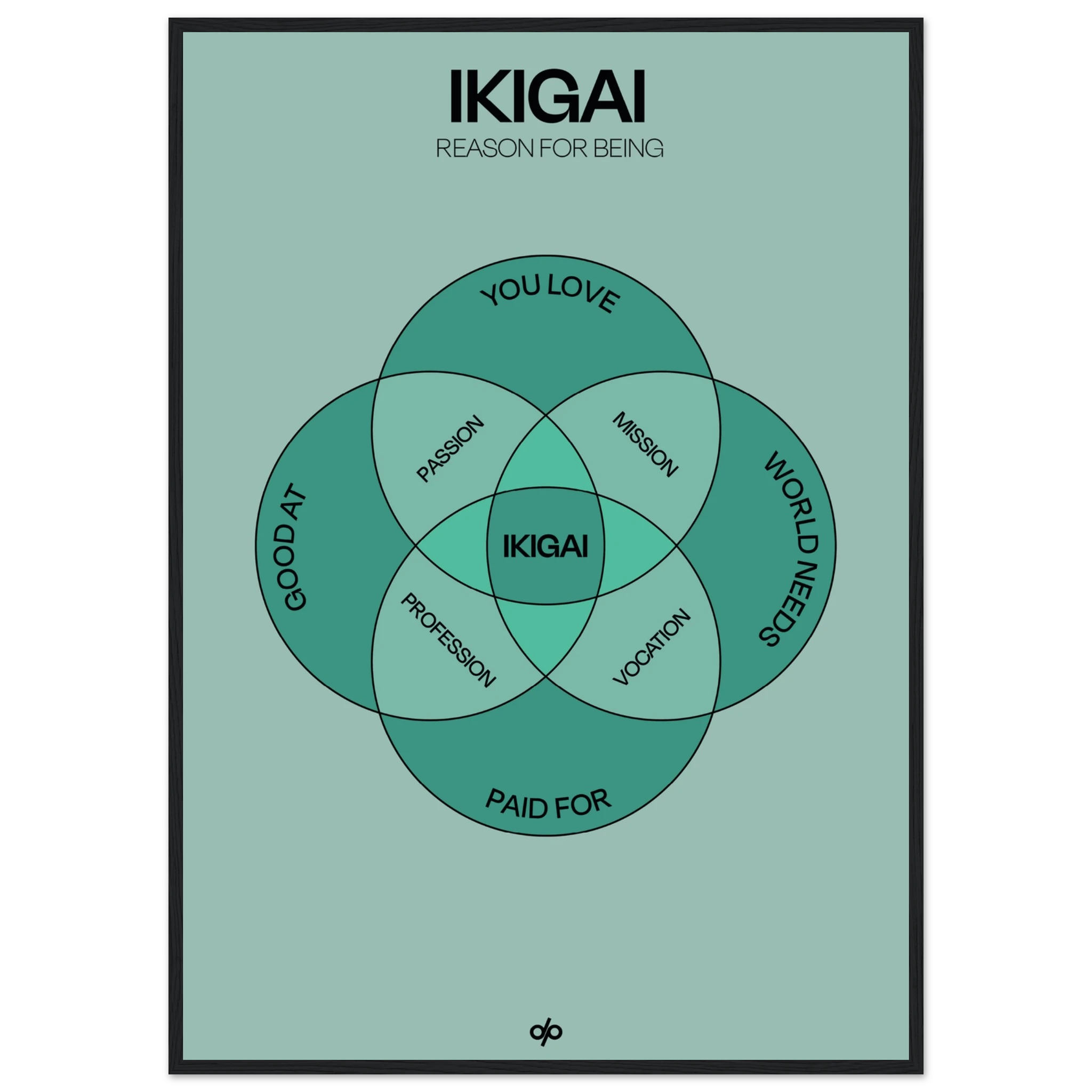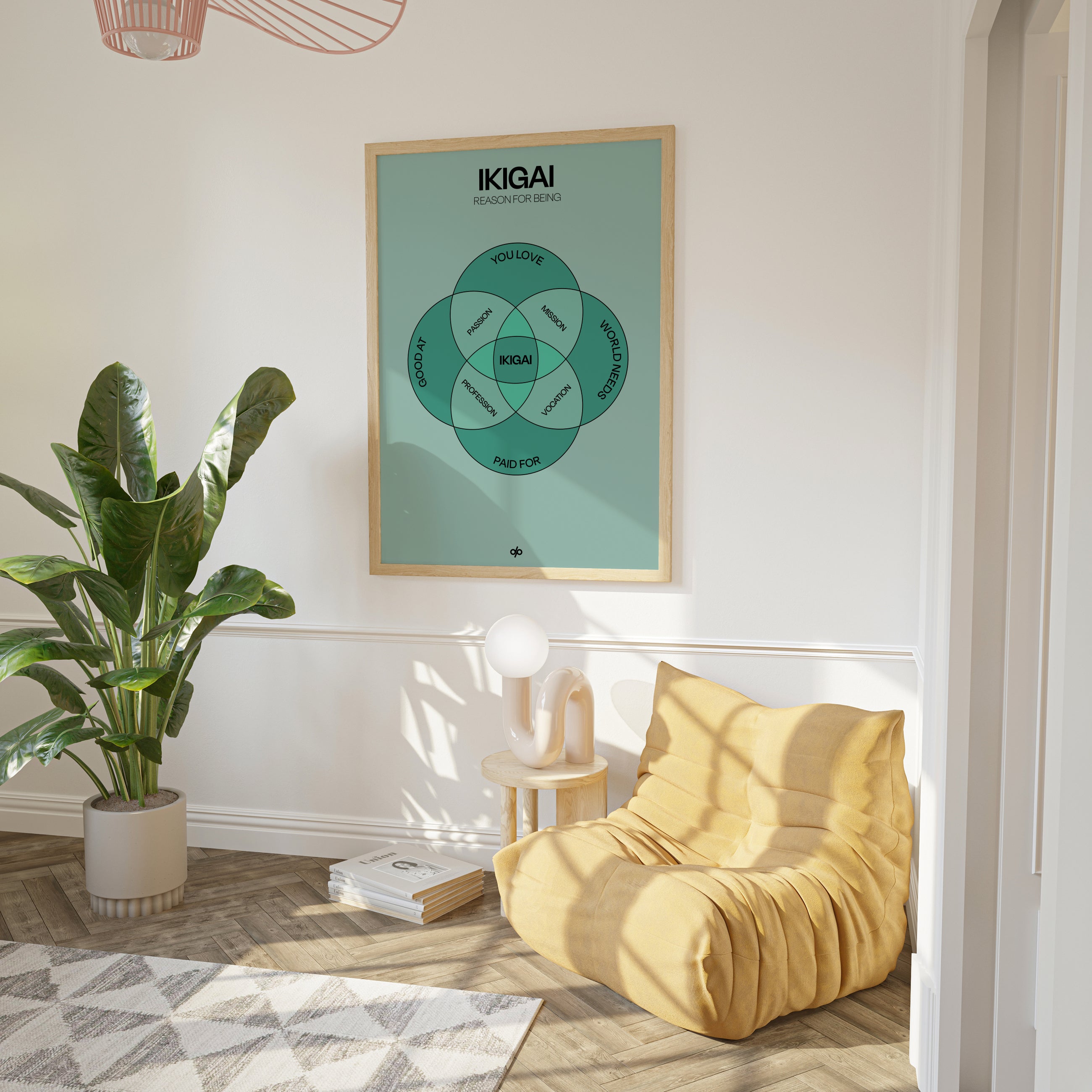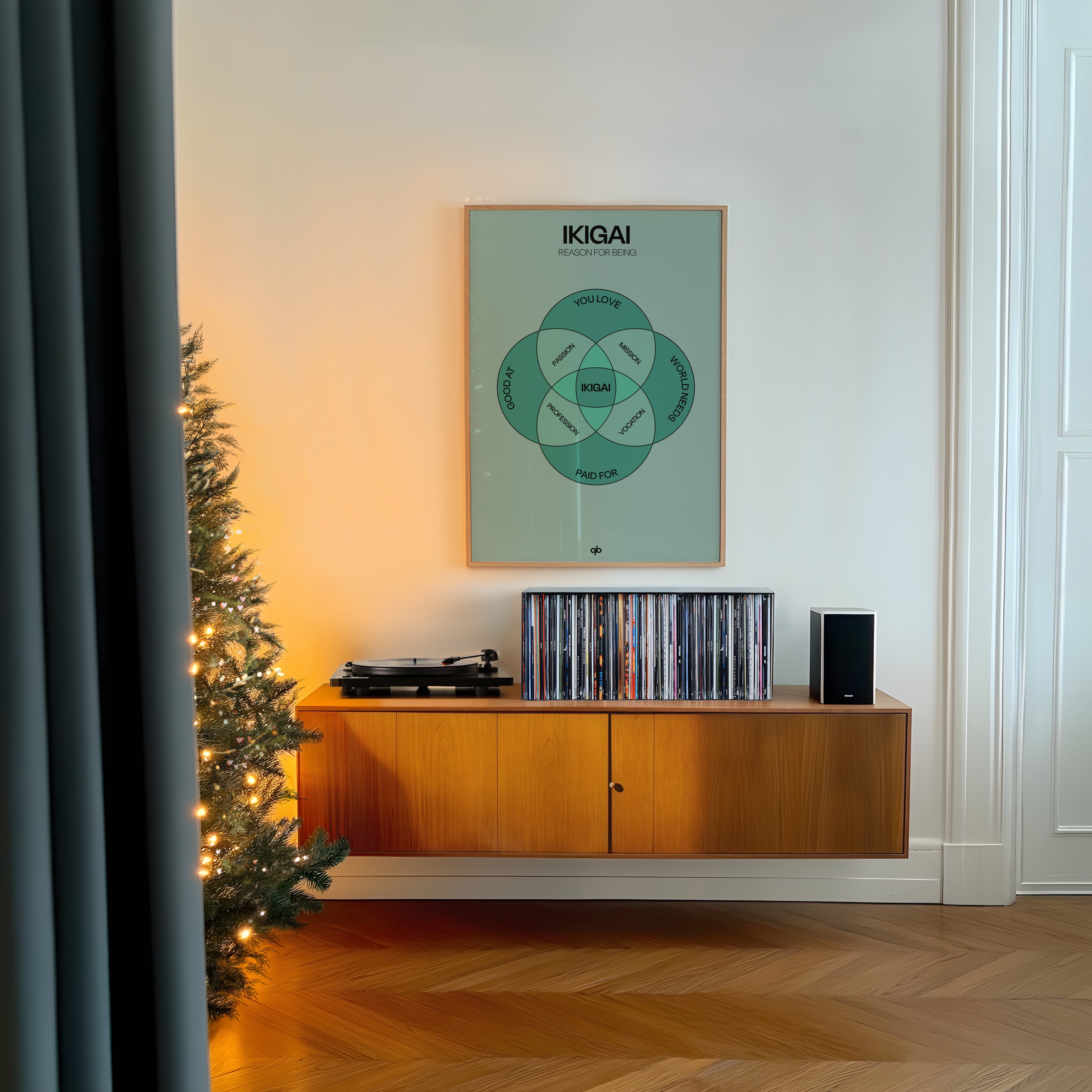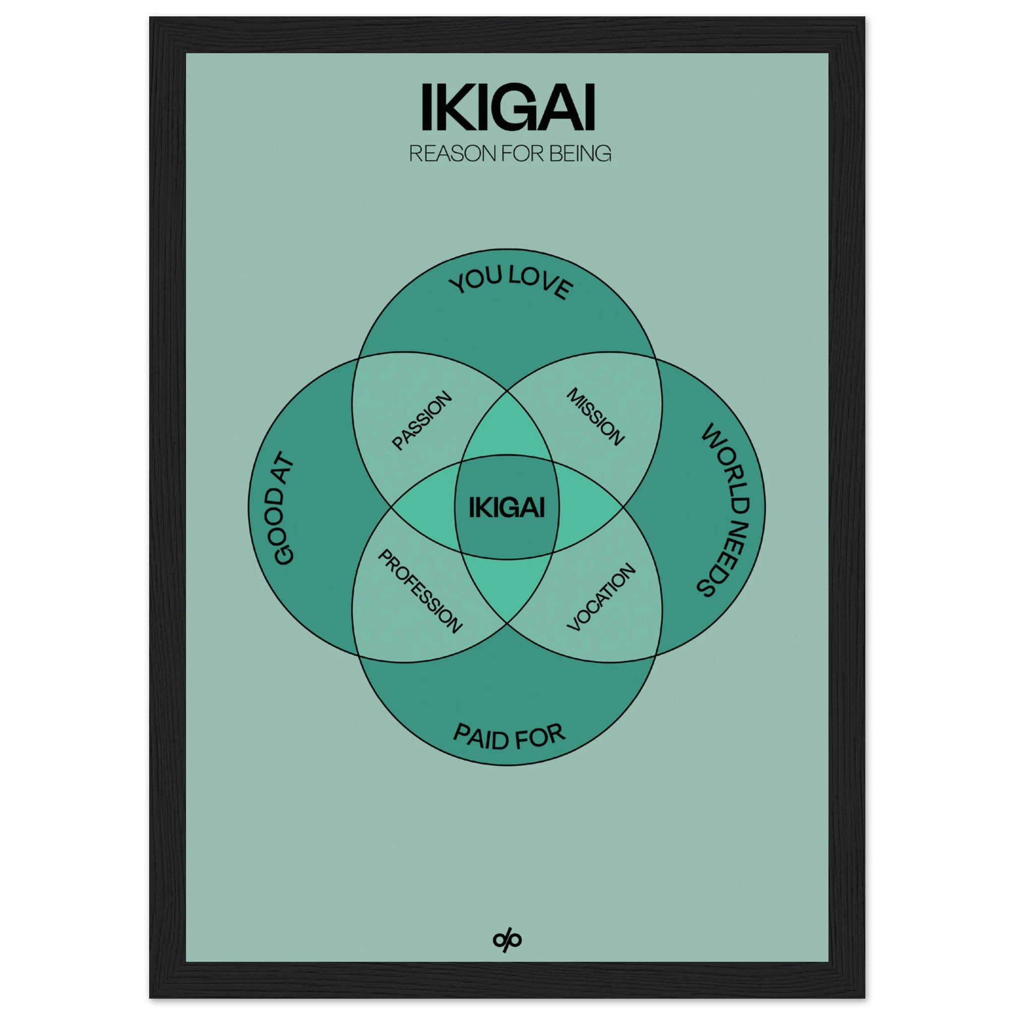 Ikigai art poster visualizes the Japanese concept of “reason for being” through a clean, calming Venn diagram that connects what you love, what you’re good at, what the world needs, and what you can be paid for. At the center lies Ikigai — the sweet spot of fulfillment. This design is a visual prompt for alignment, purpose, and personal clarity.