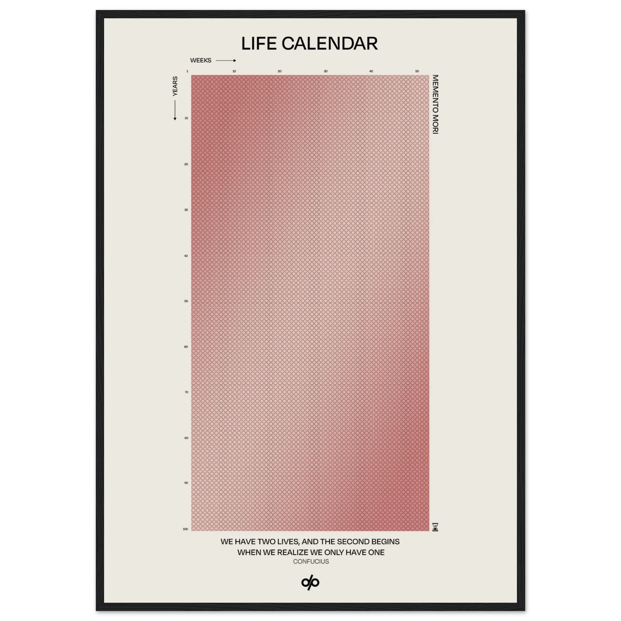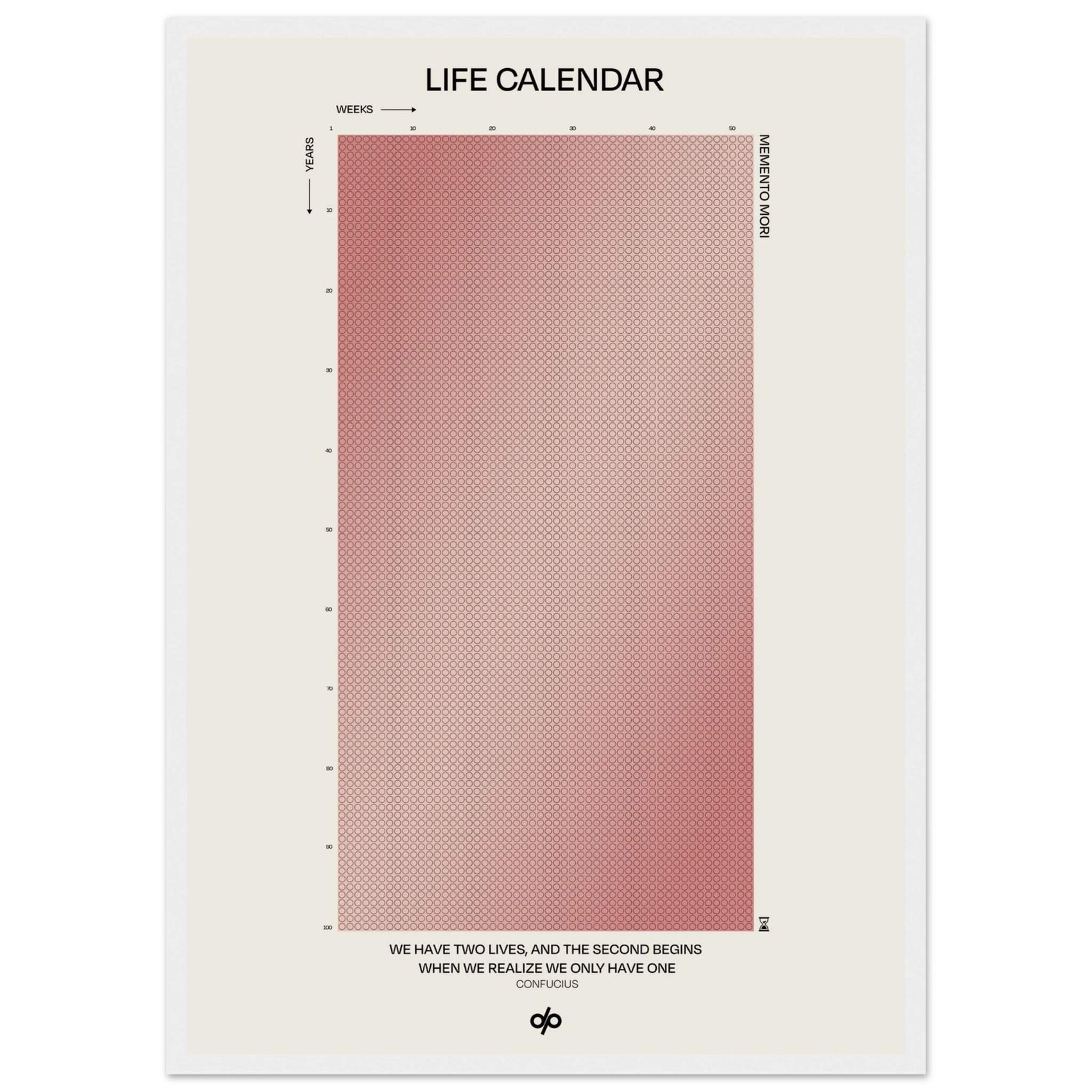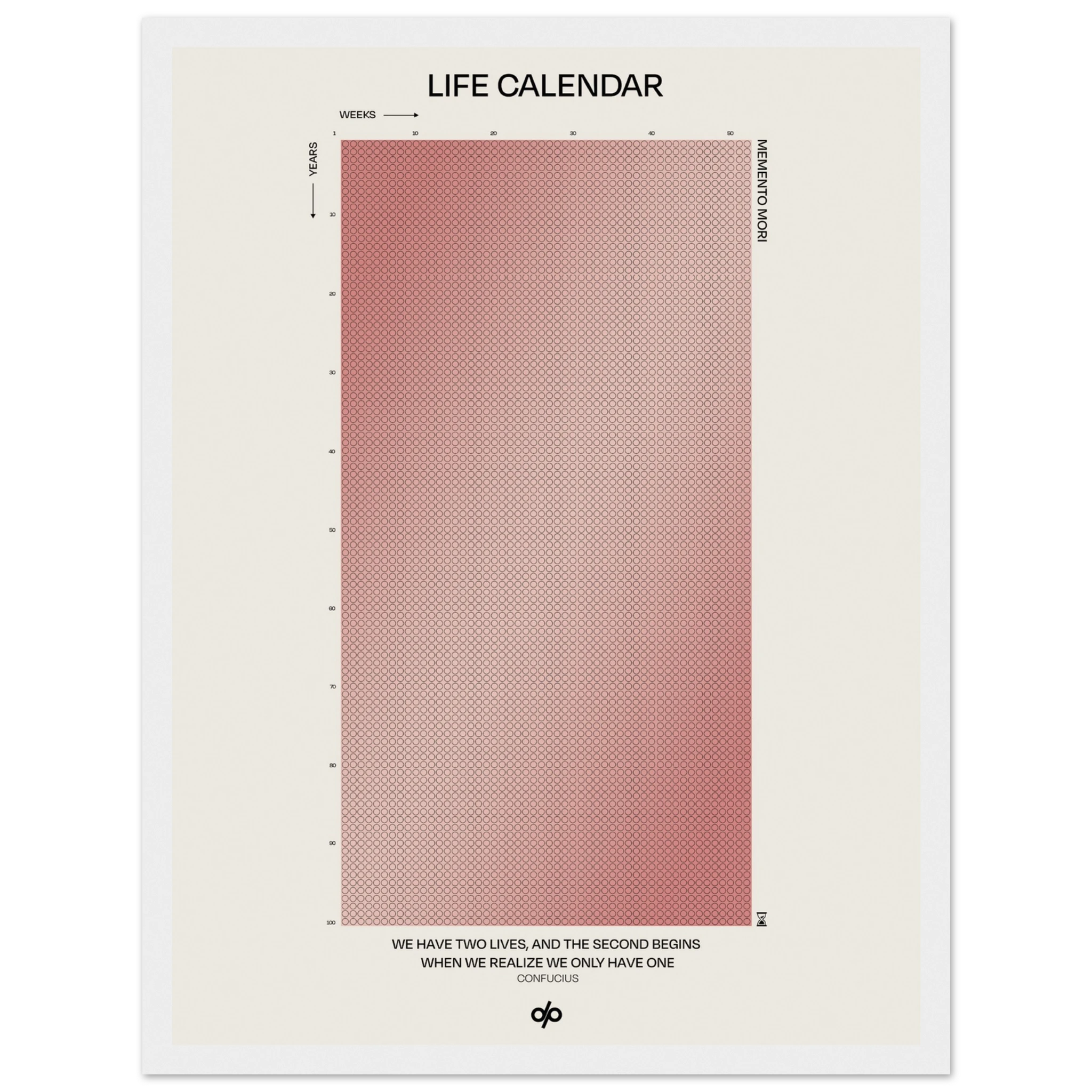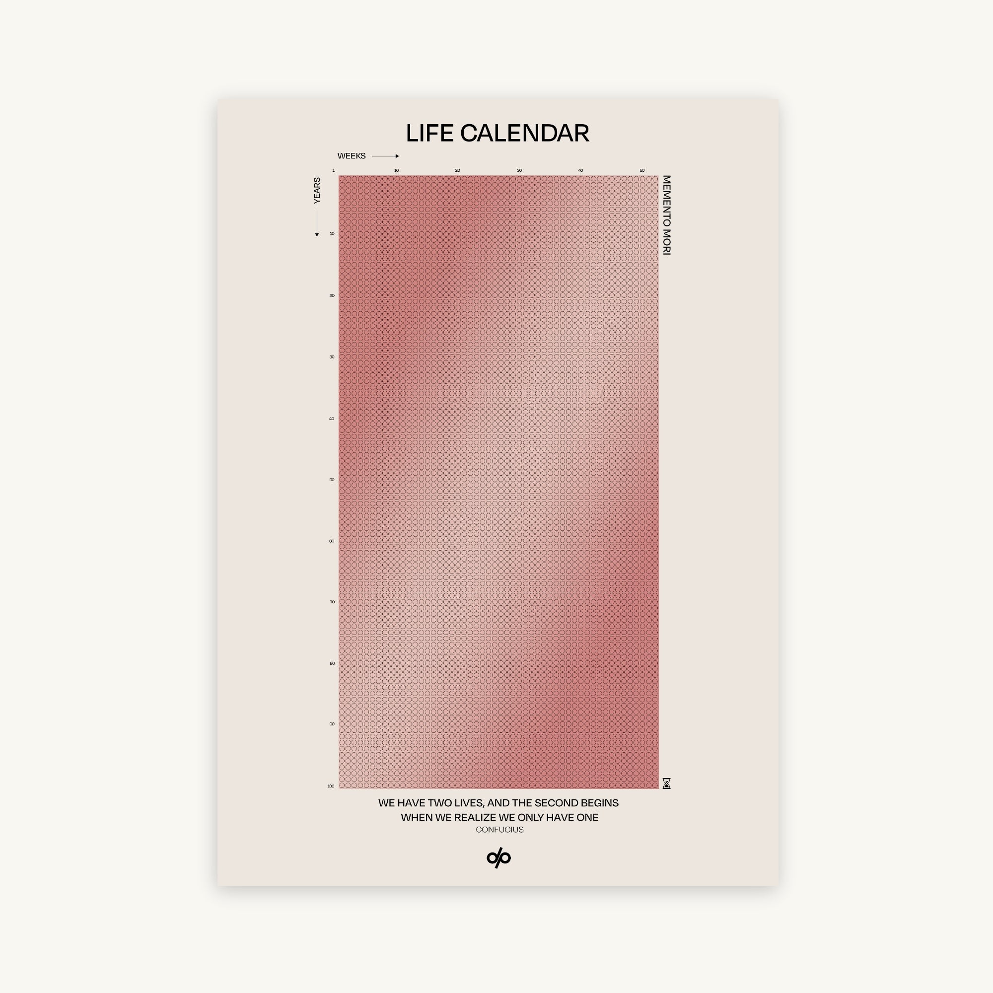 Life Calendar is a visual meditation on time, presented as a grid of small weekly circles spanning a full 100-year lifespan. Inspired by the concept of “Memento Mori” and framed by a powerful quote from Confucius: