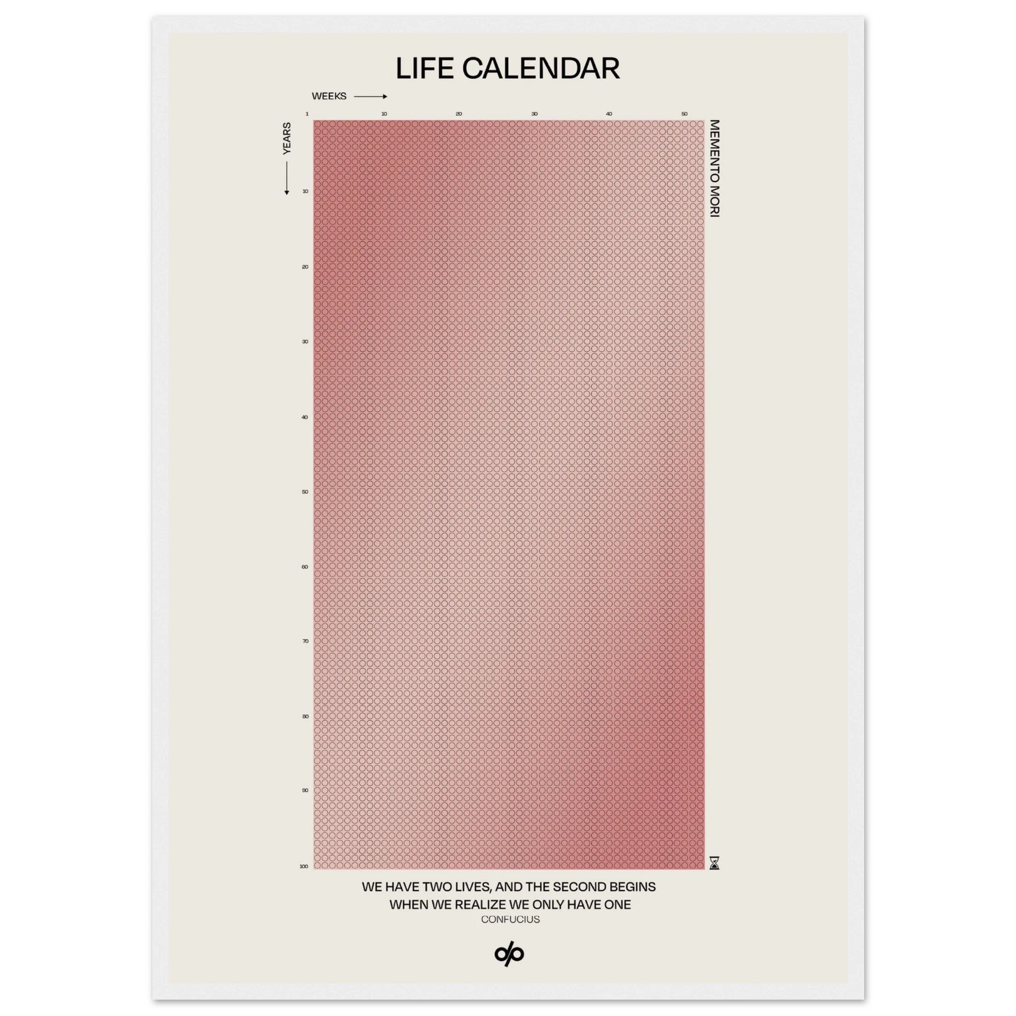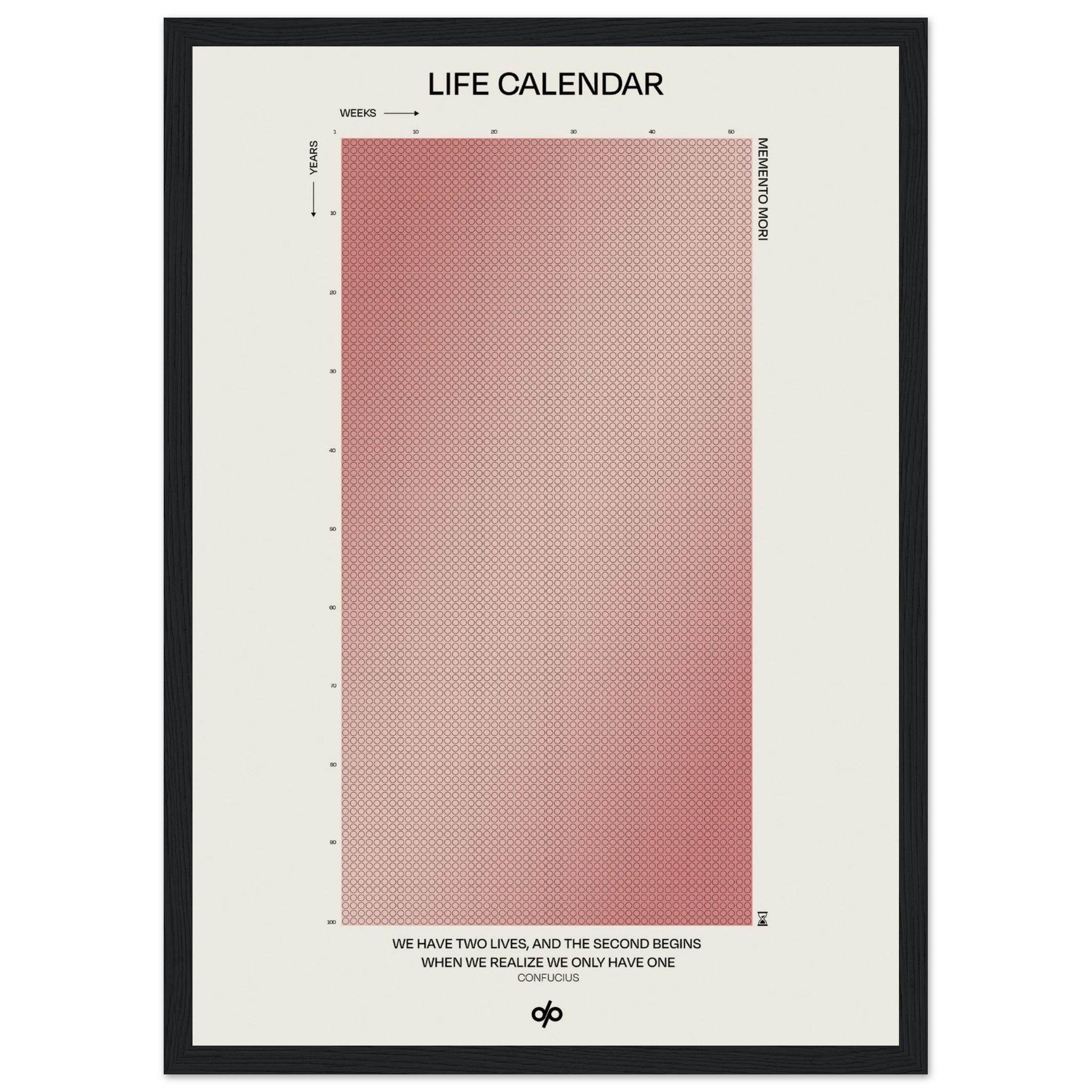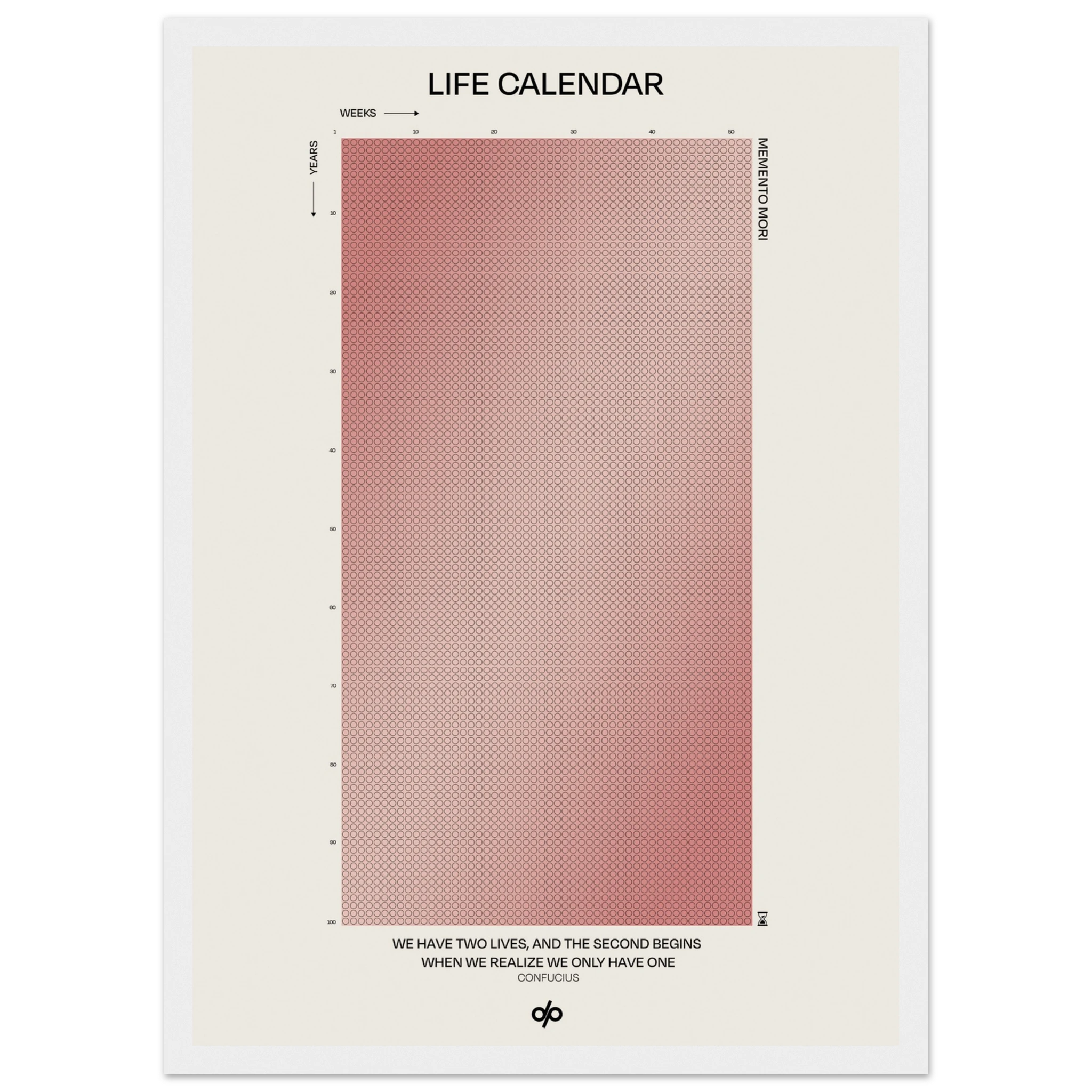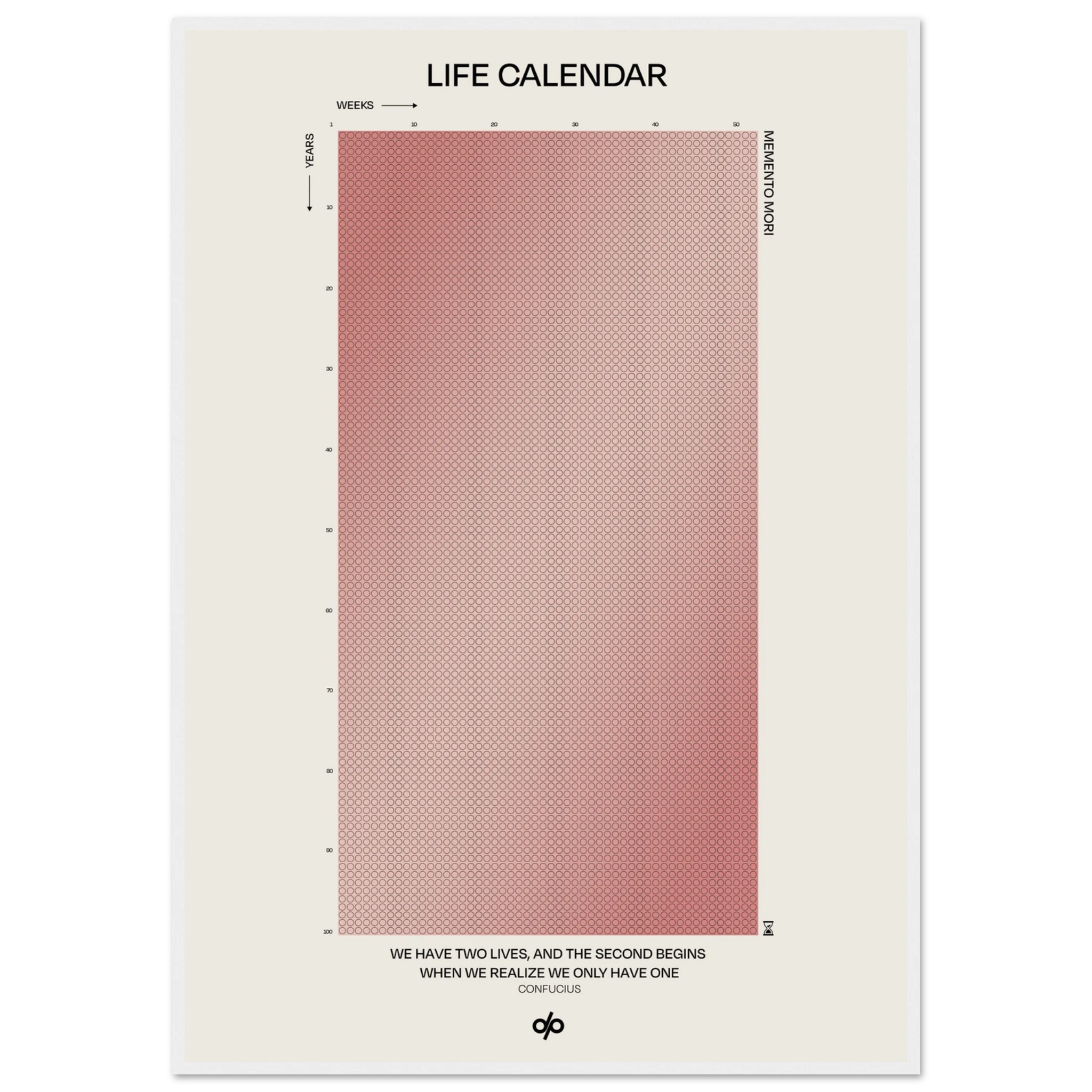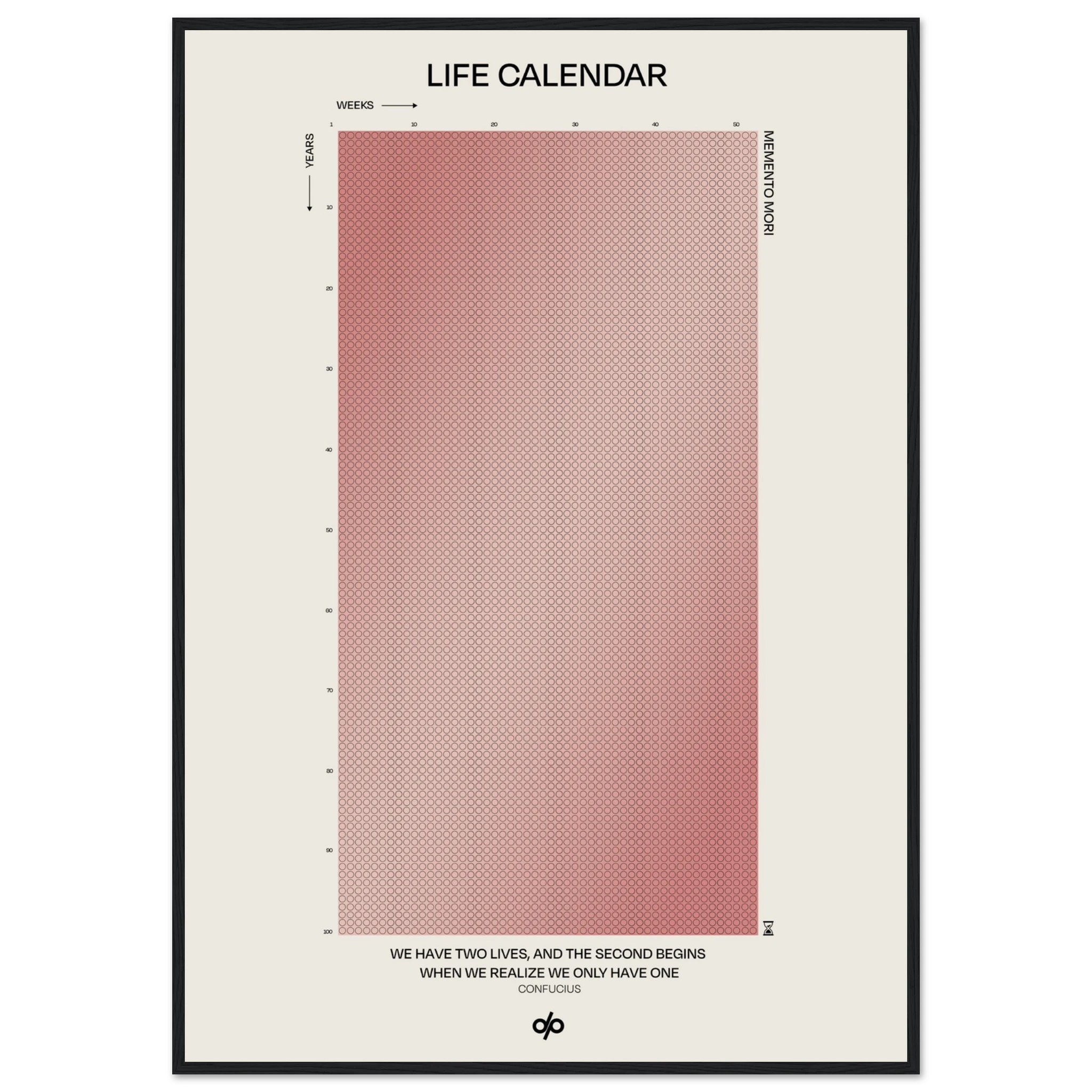 Life Calendar is a visual meditation on time, presented as a grid of small weekly circles spanning a full 100-year lifespan. Inspired by the concept of “Memento Mori” and framed by a powerful quote from Confucius: