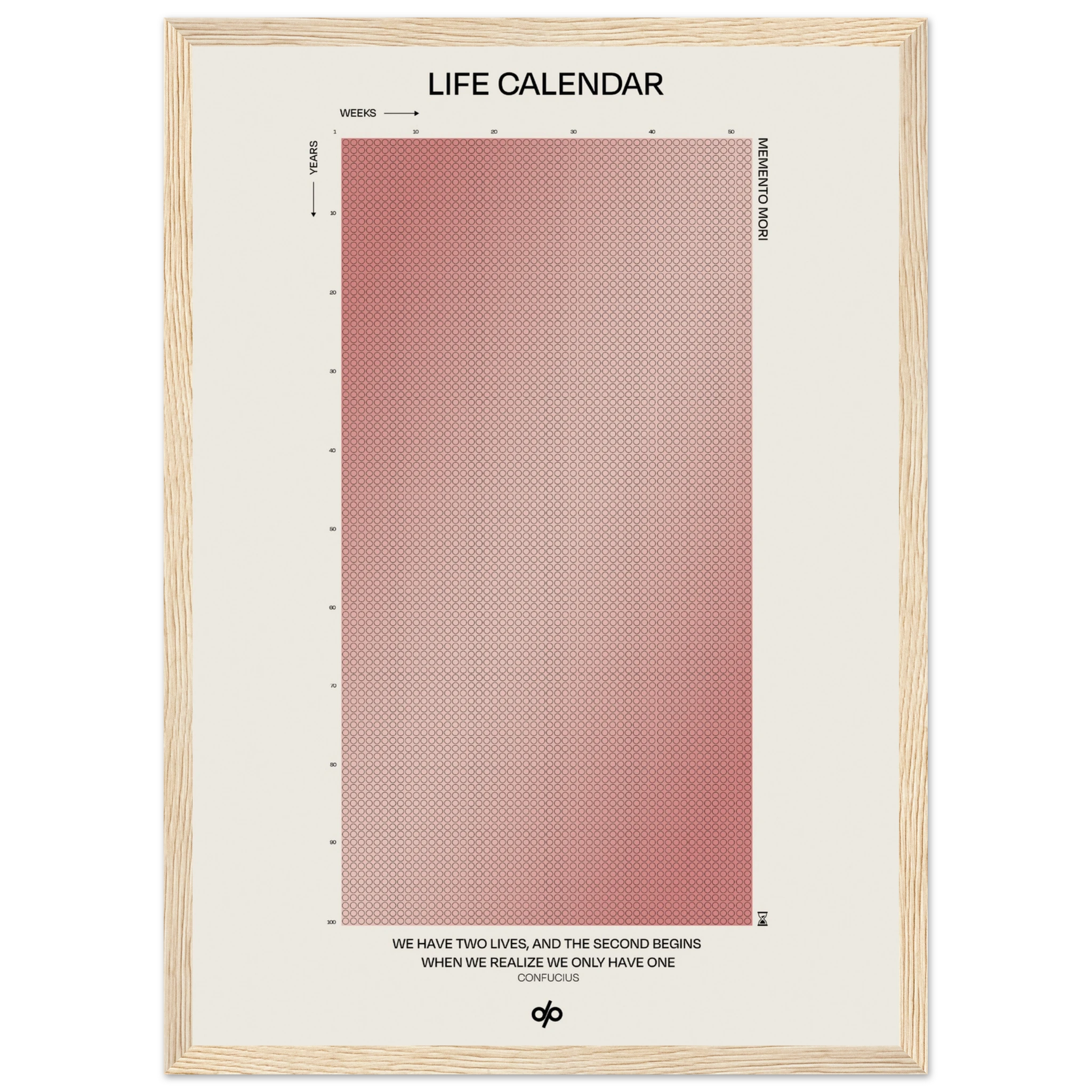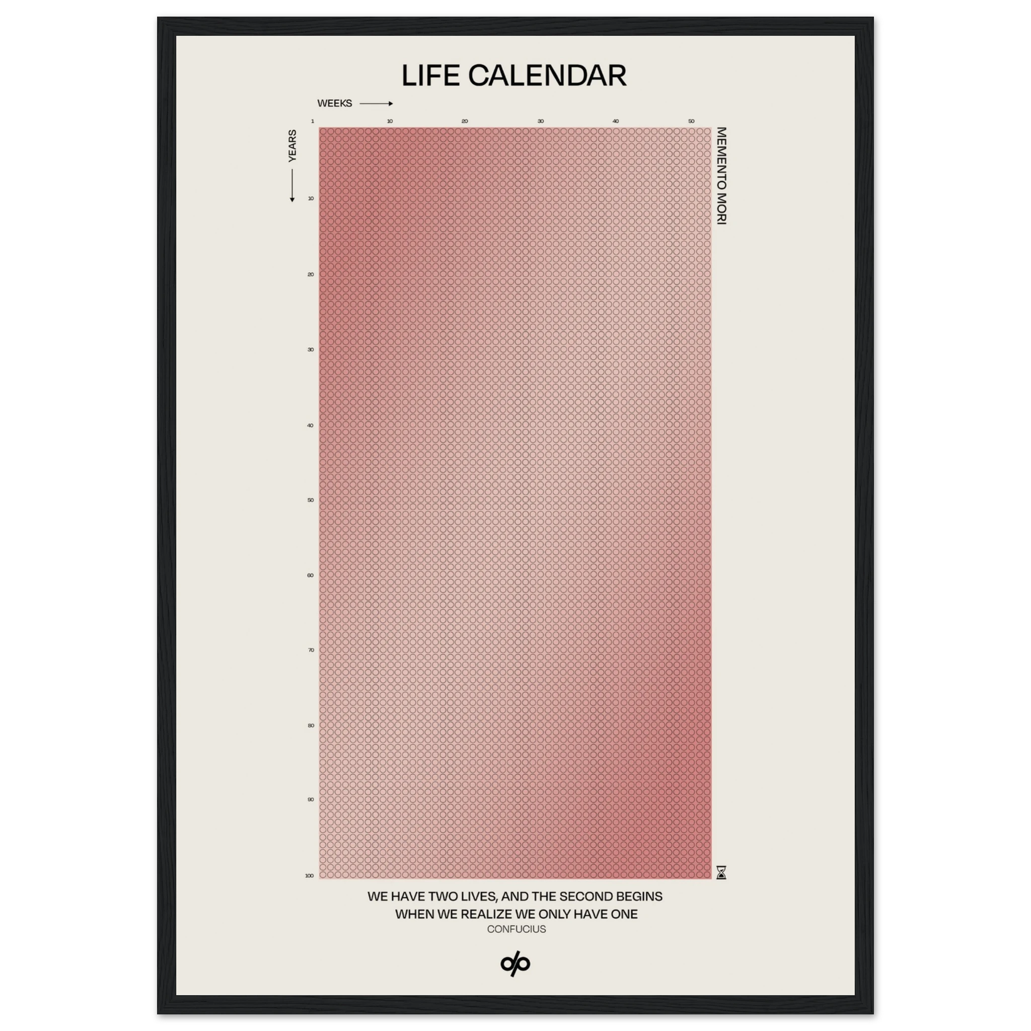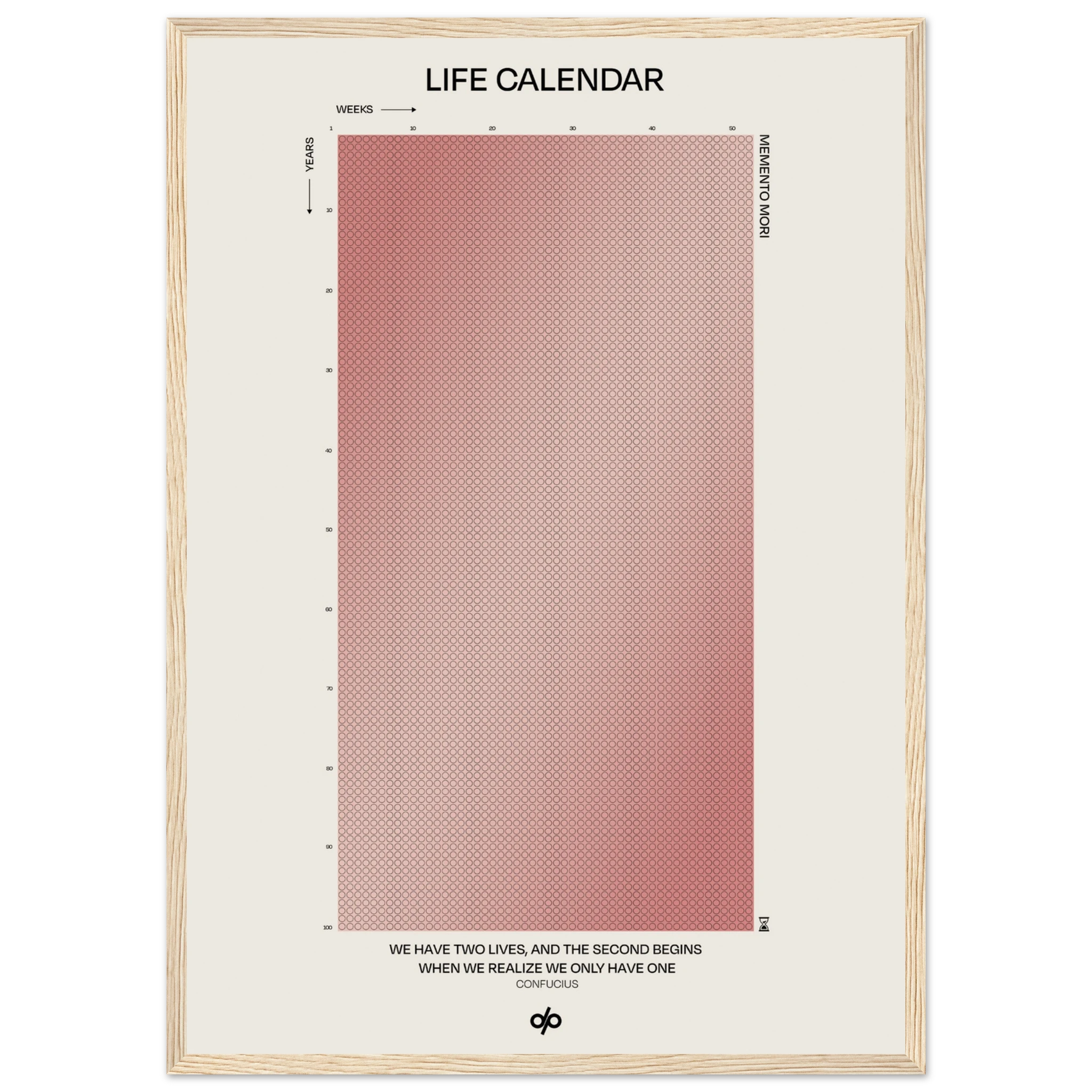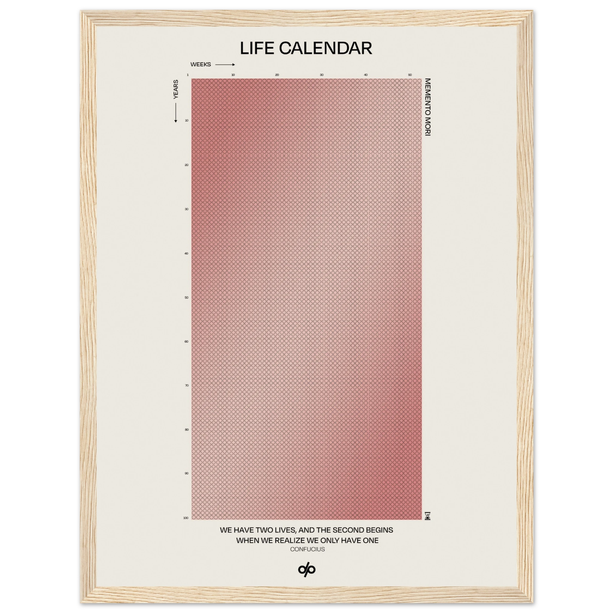 Life Calendar is a visual meditation on time, presented as a grid of small weekly circles spanning a full 100-year lifespan. Inspired by the concept of “Memento Mori” and framed by a powerful quote from Confucius: