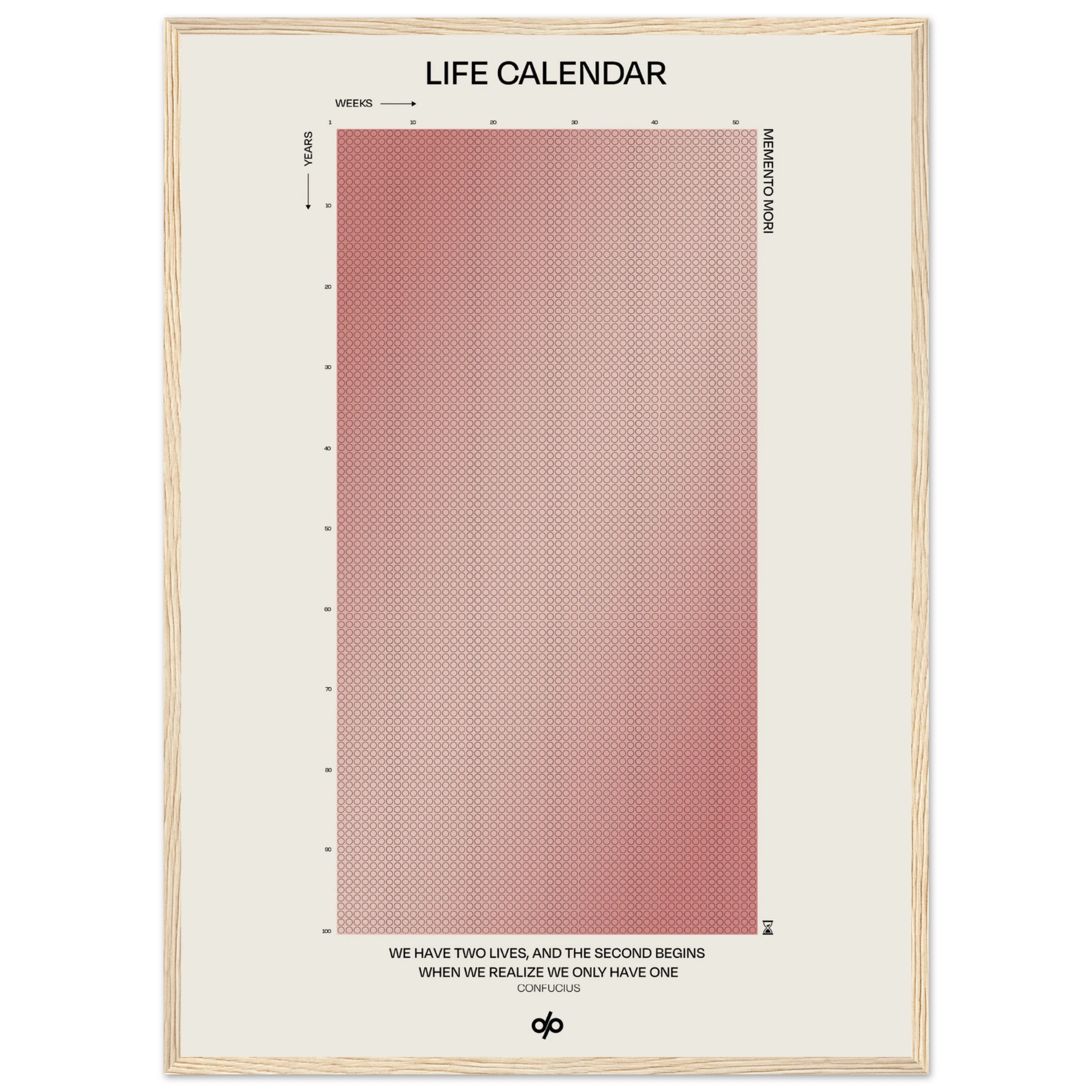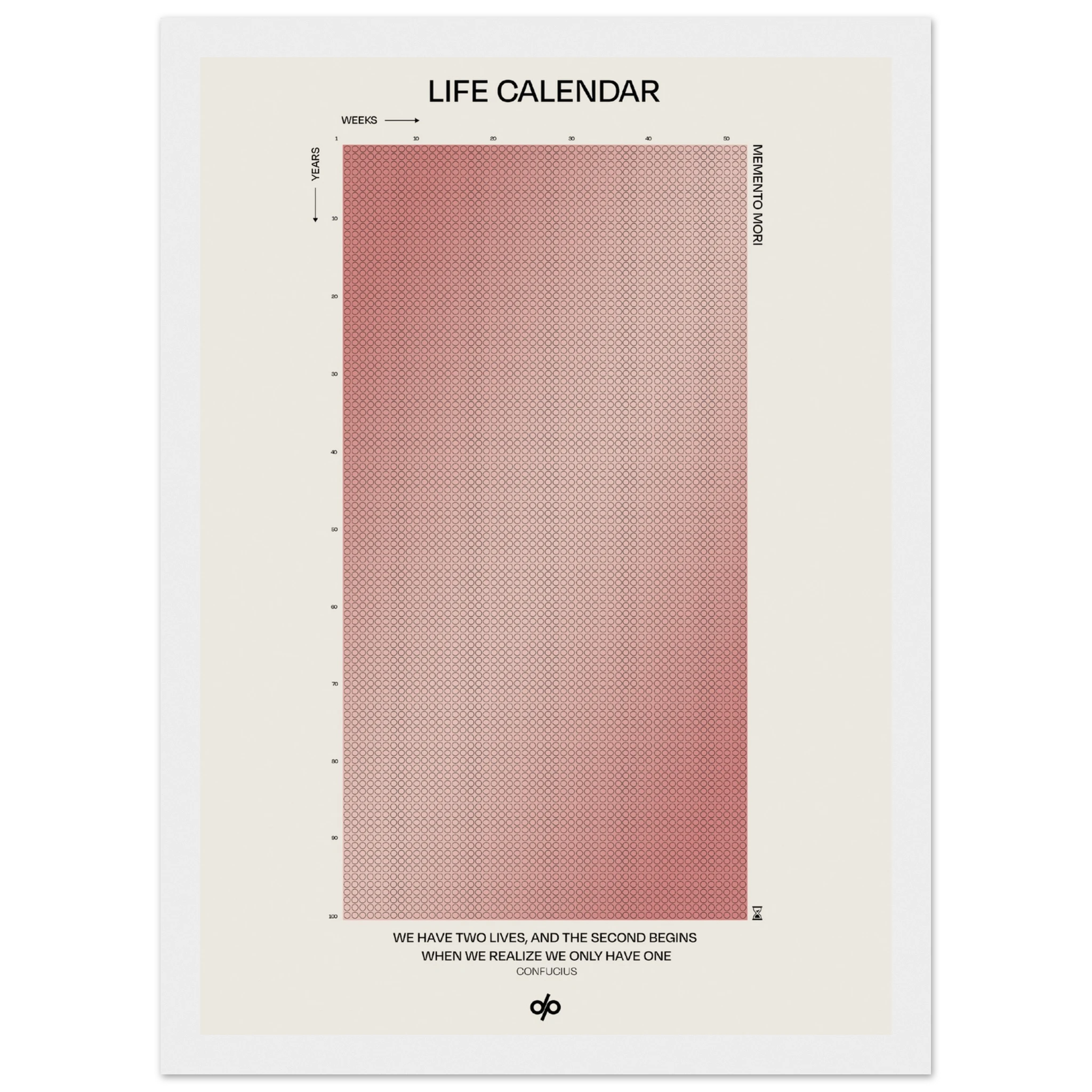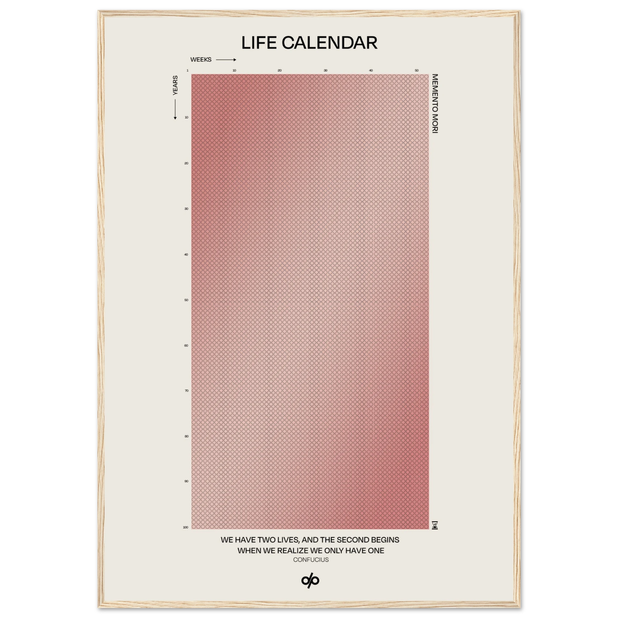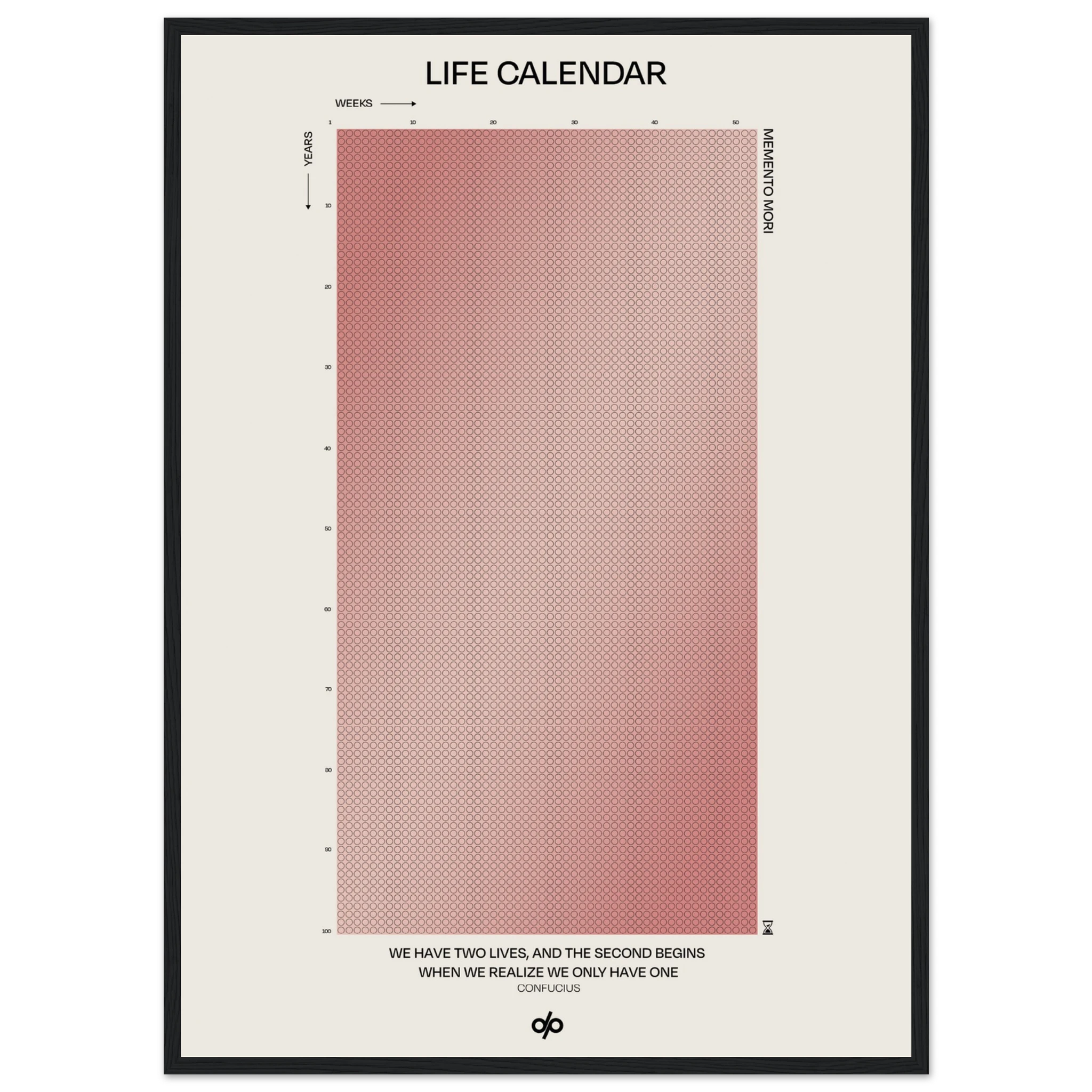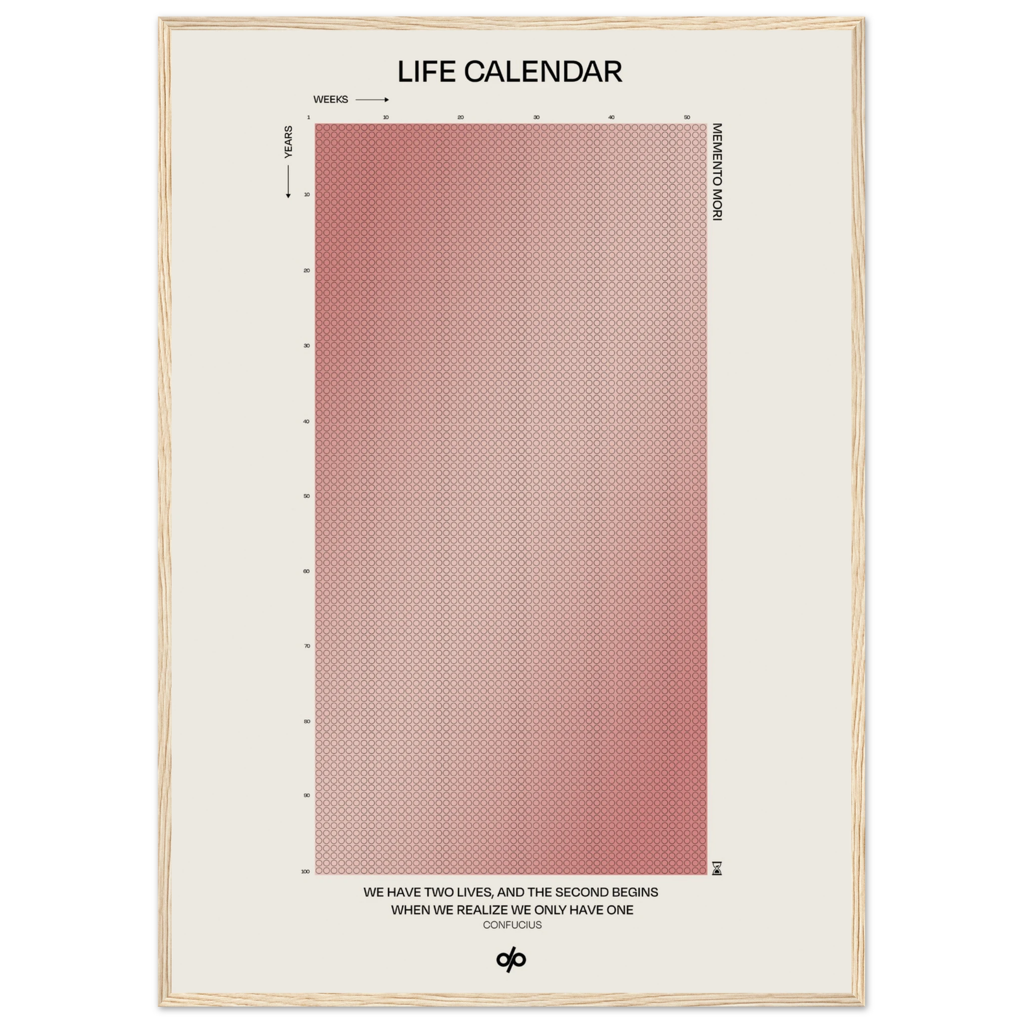 Life Calendar is a visual meditation on time, presented as a grid of small weekly circles spanning a full 100-year lifespan. Inspired by the concept of “Memento Mori” and framed by a powerful quote from Confucius: