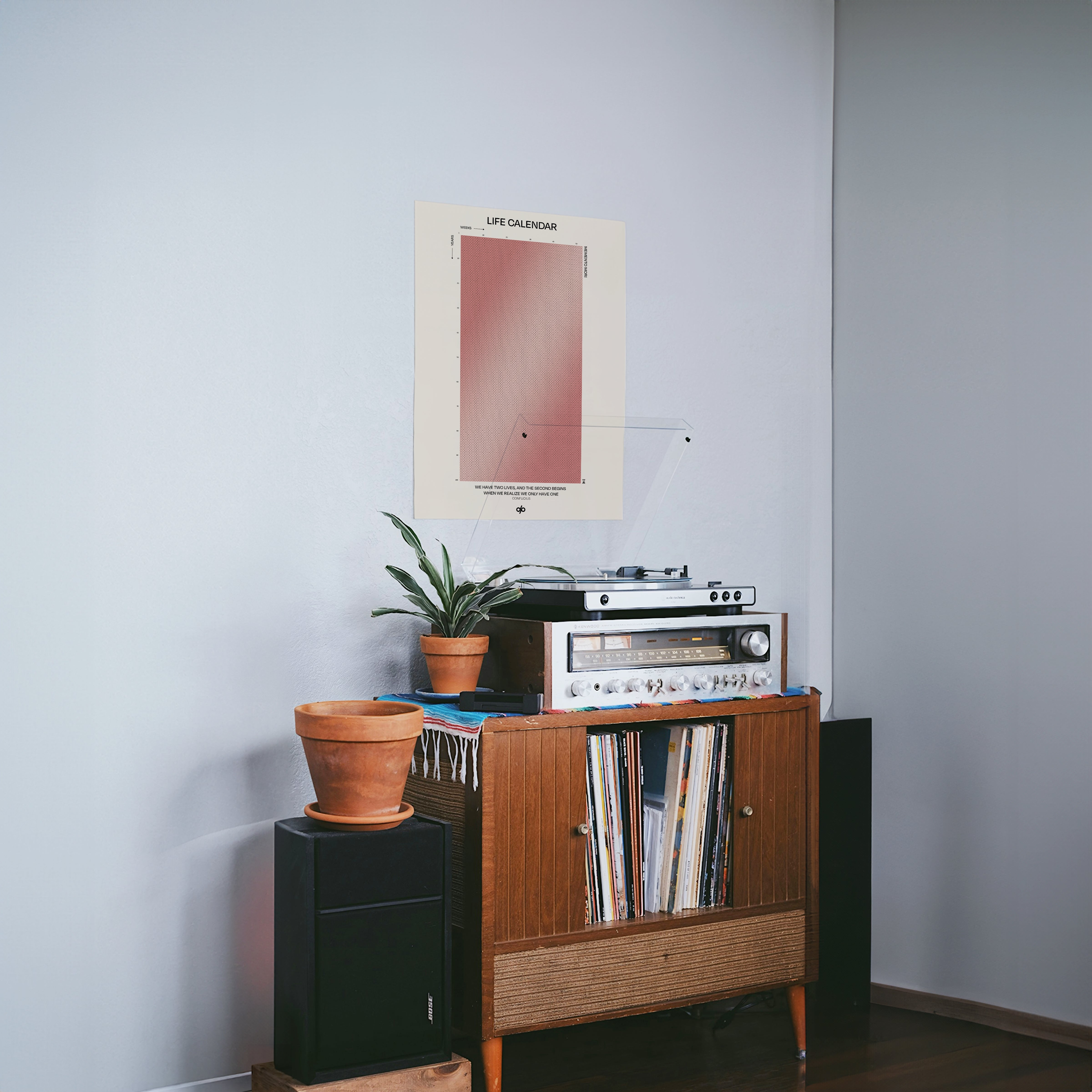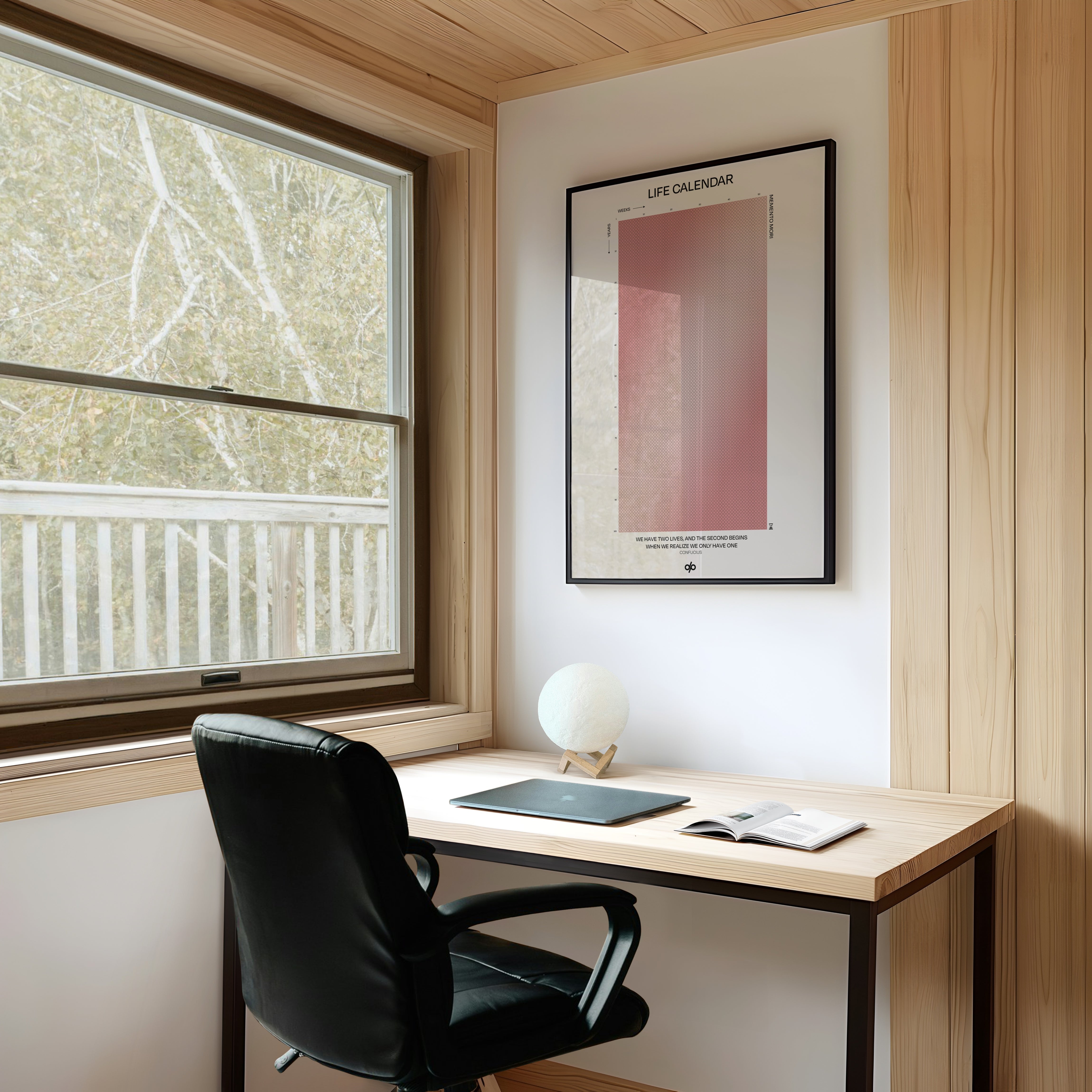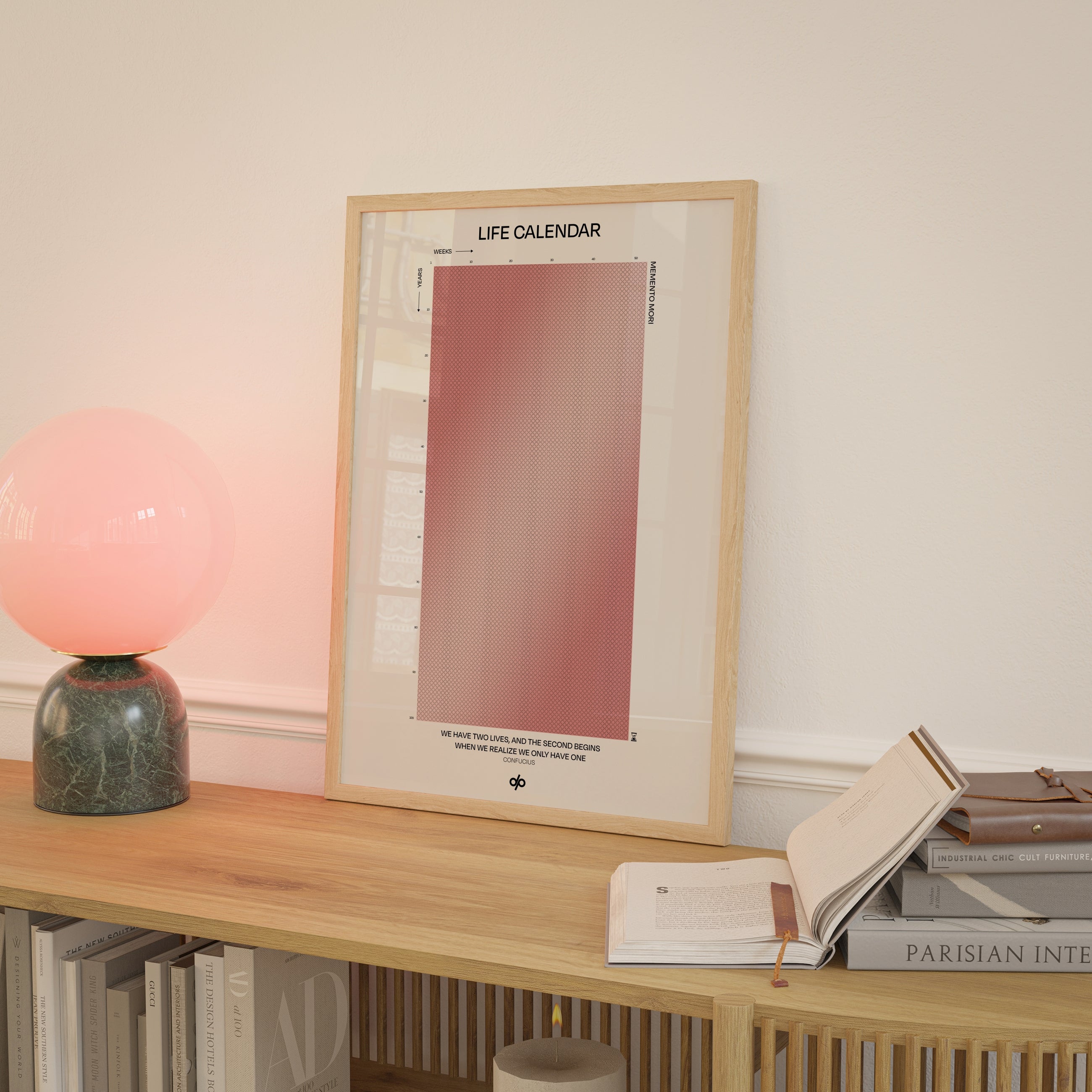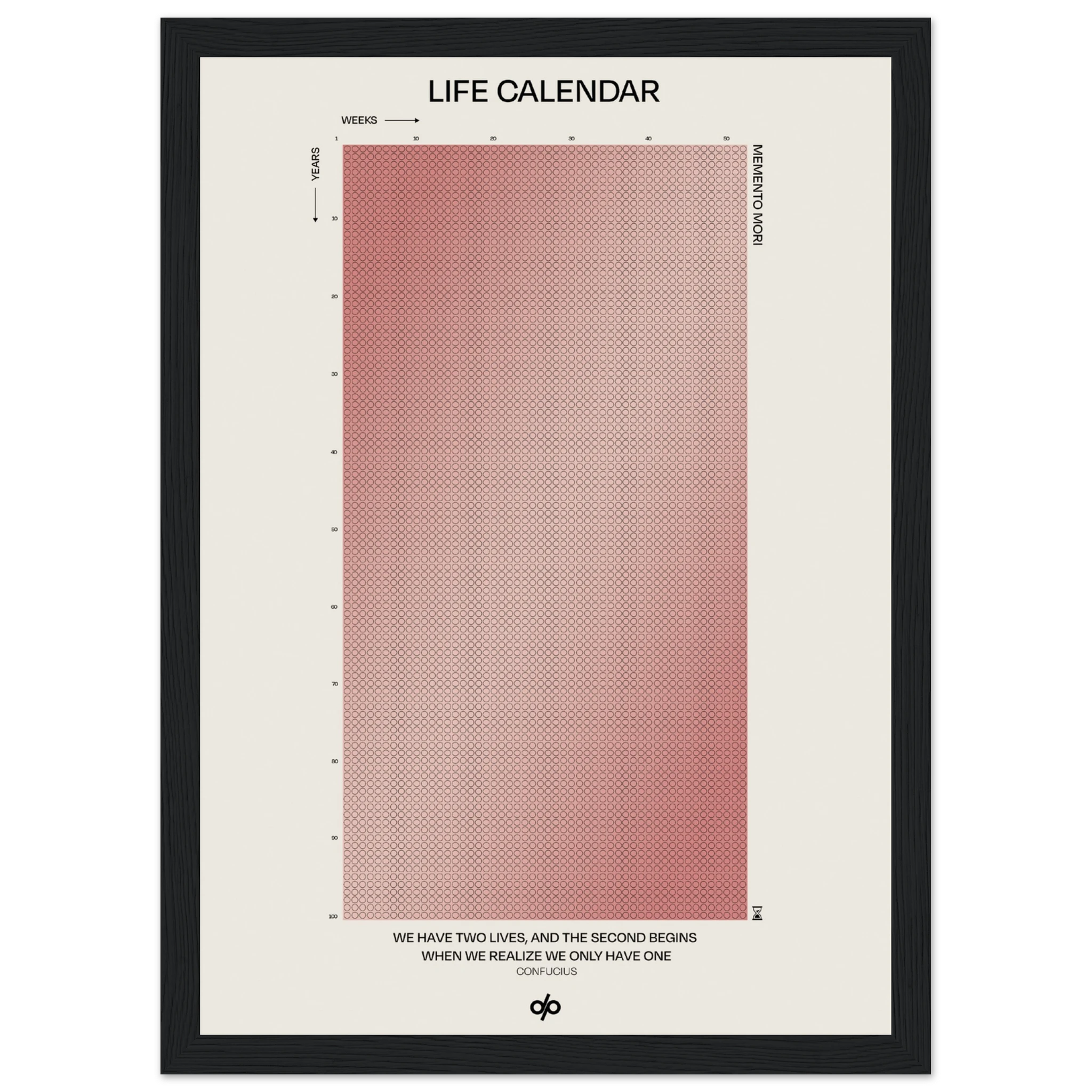 Life Calendar is a visual meditation on time, presented as a grid of small weekly circles spanning a full 100-year lifespan. Inspired by the concept of “Memento Mori” and framed by a powerful quote from Confucius: