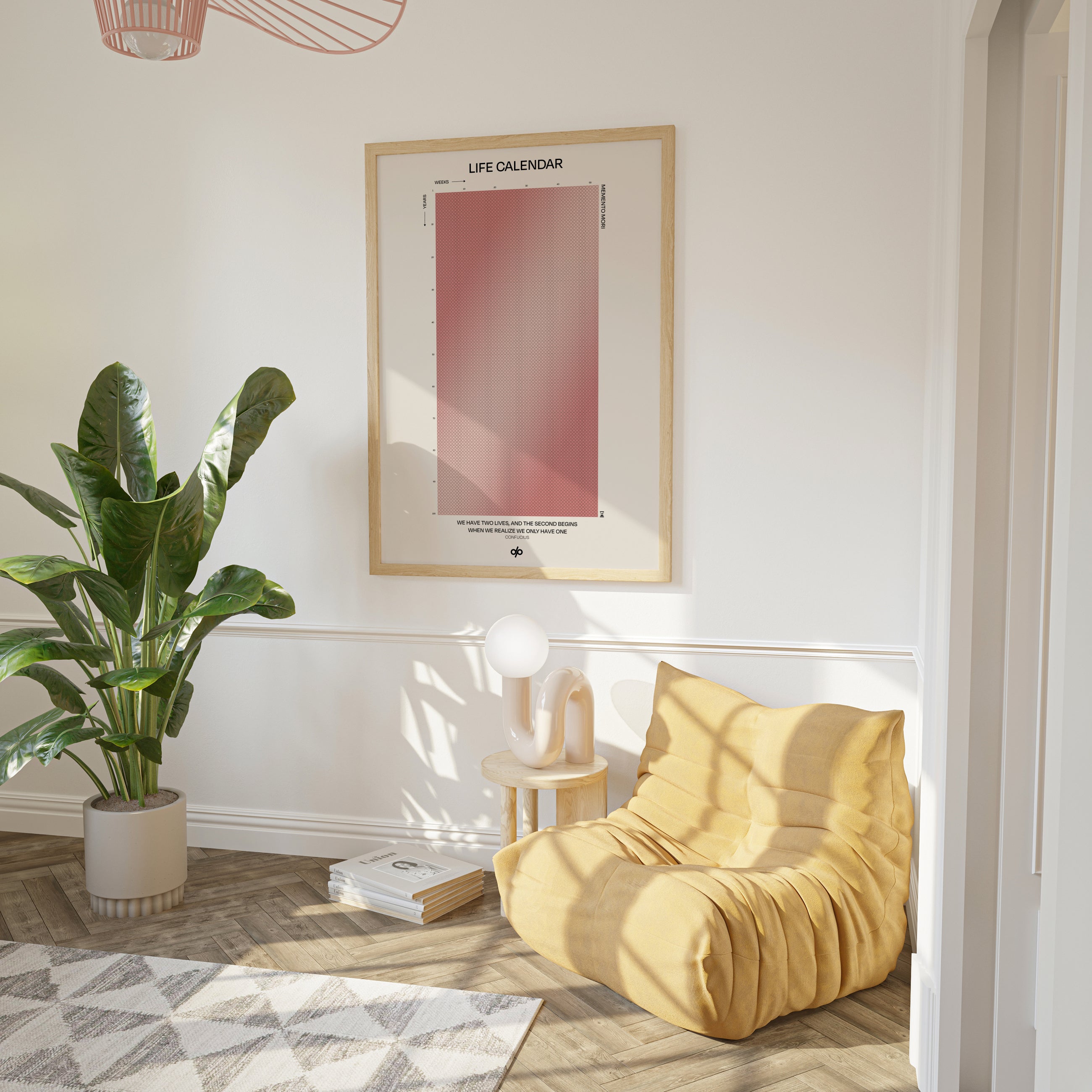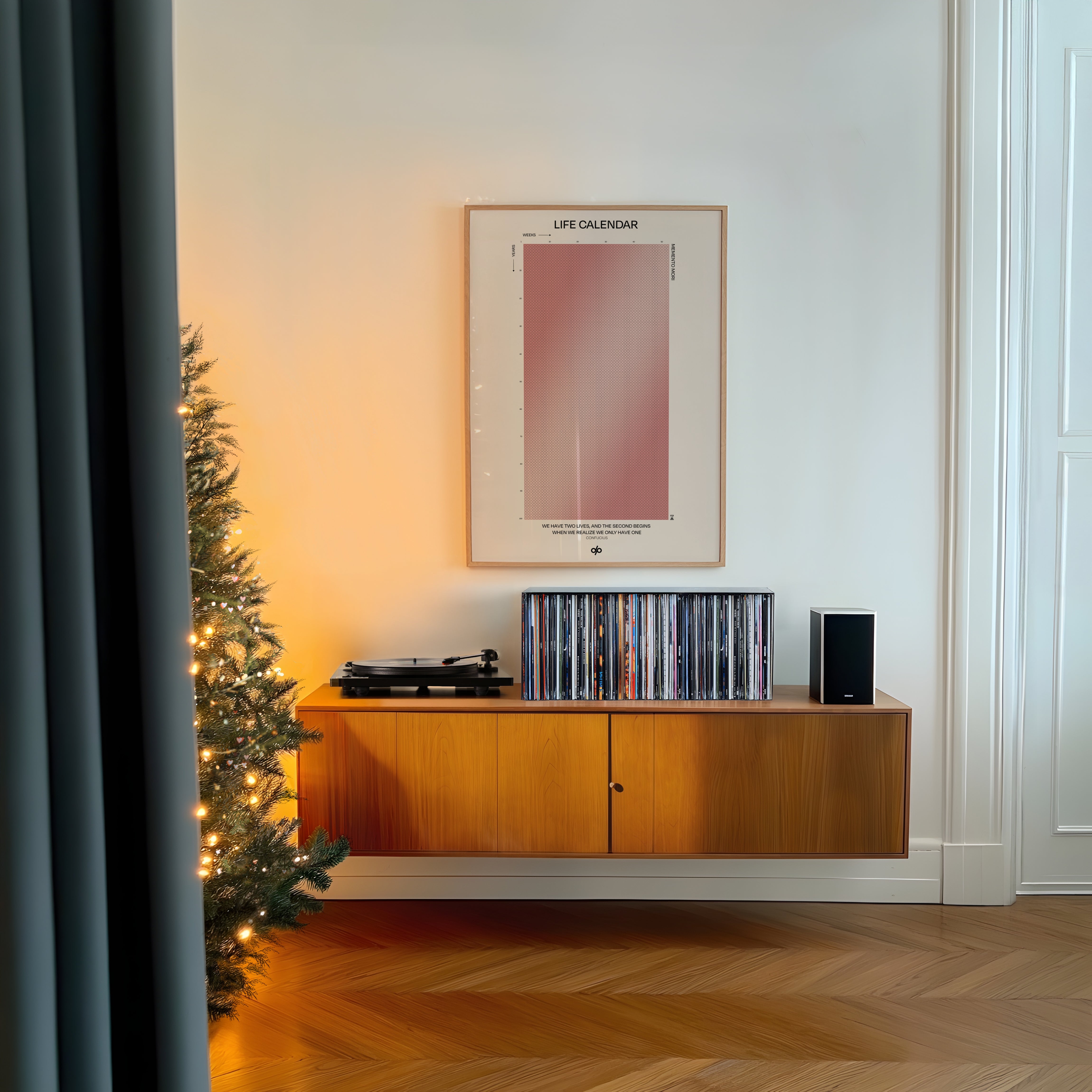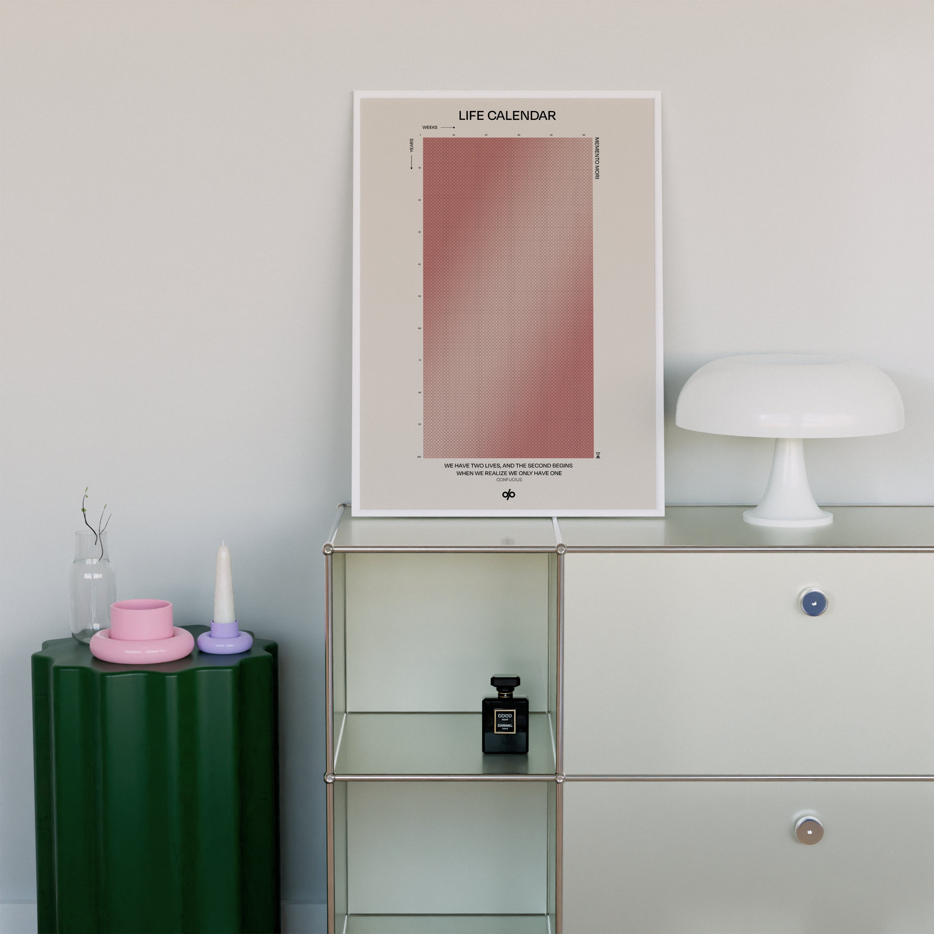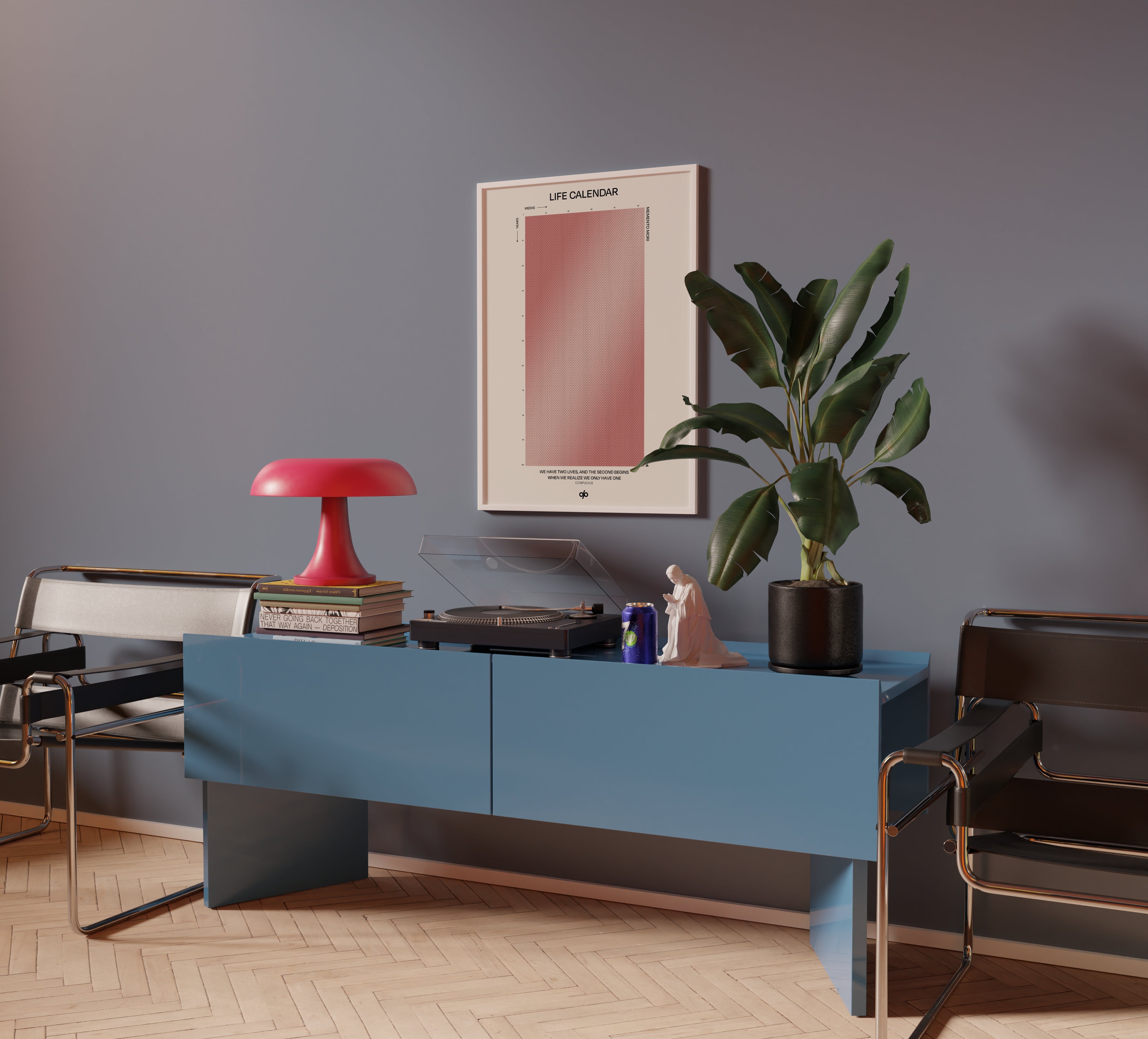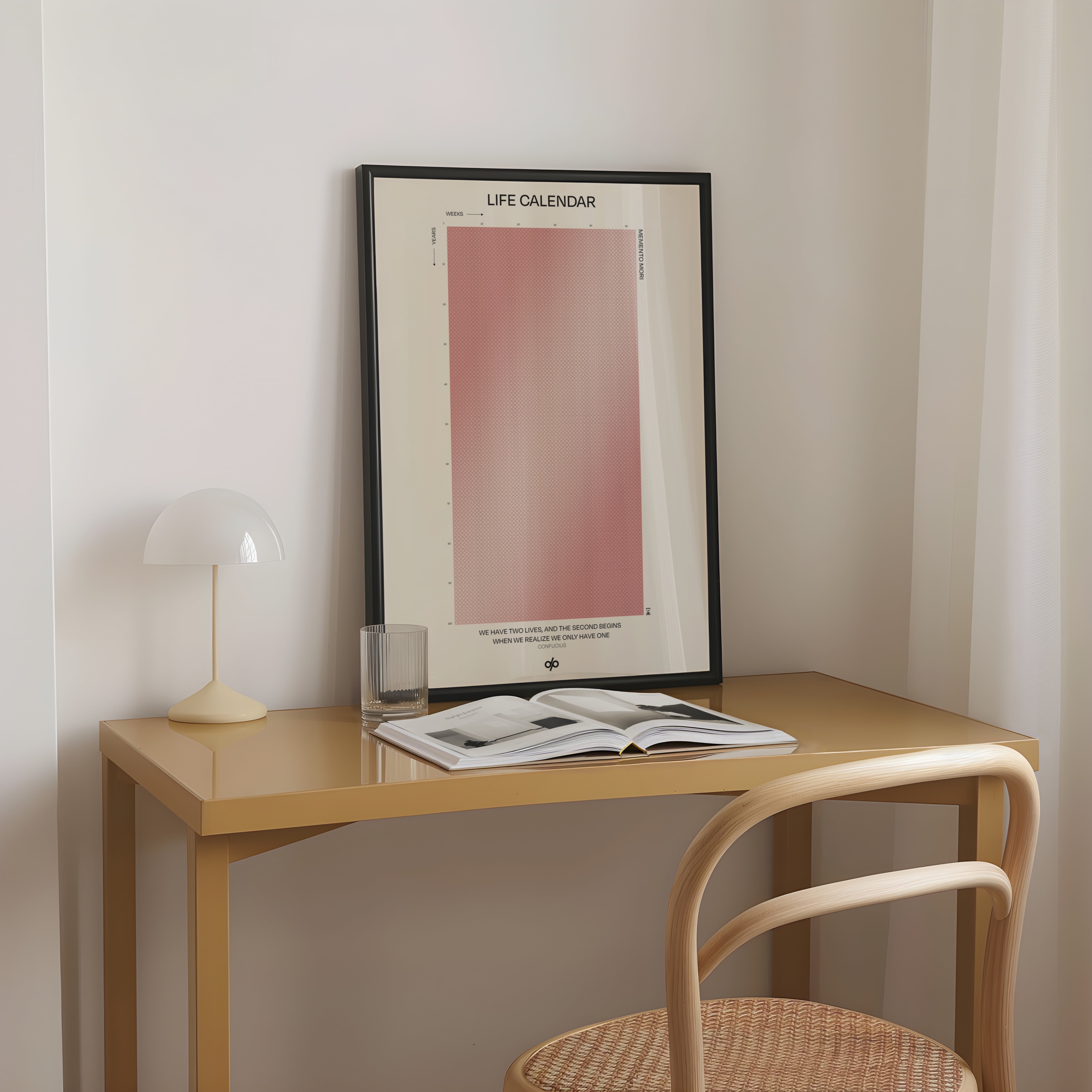 Life Calendar is a visual meditation on time, presented as a grid of small weekly circles spanning a full 100-year lifespan. Inspired by the concept of “Memento Mori” and framed by a powerful quote from Confucius: