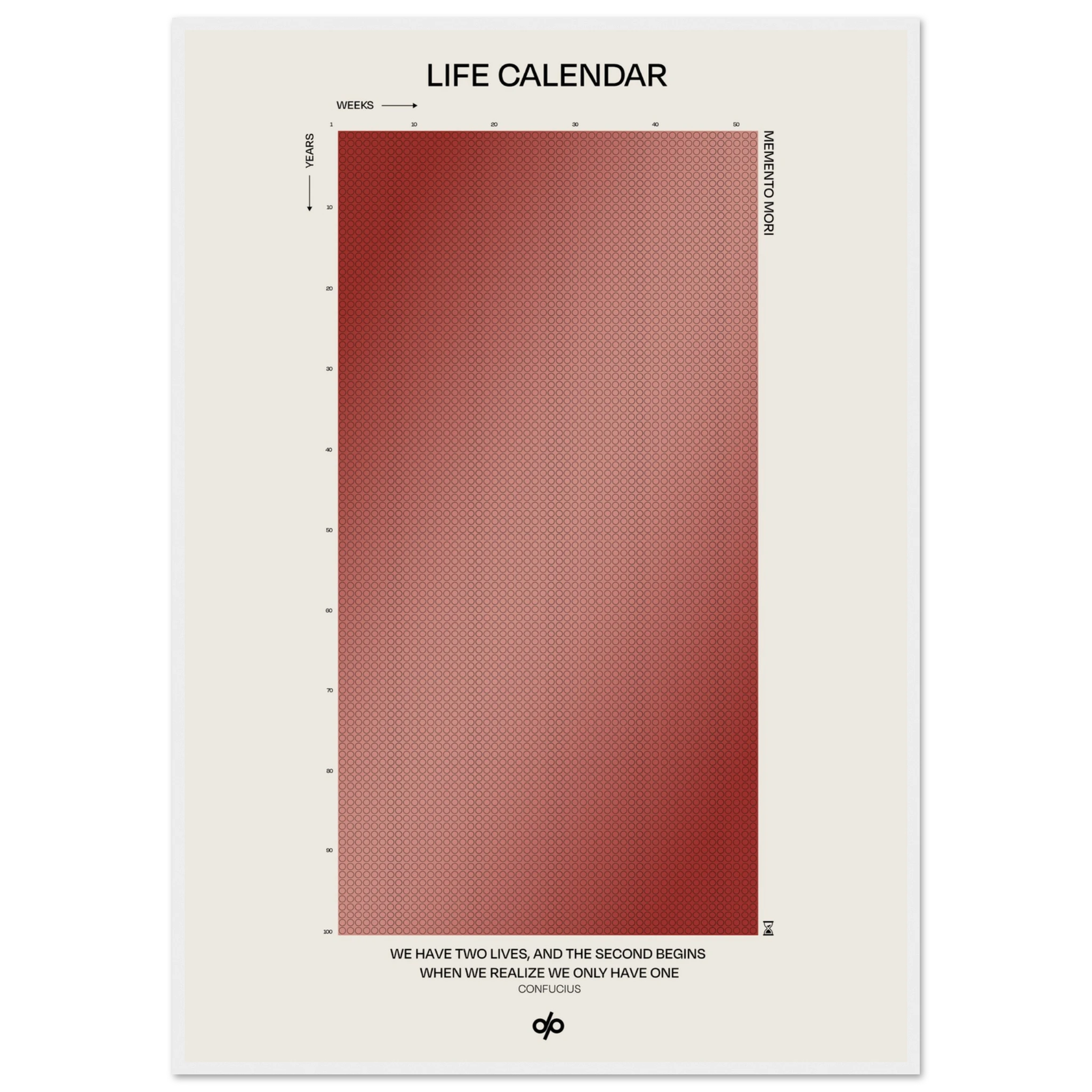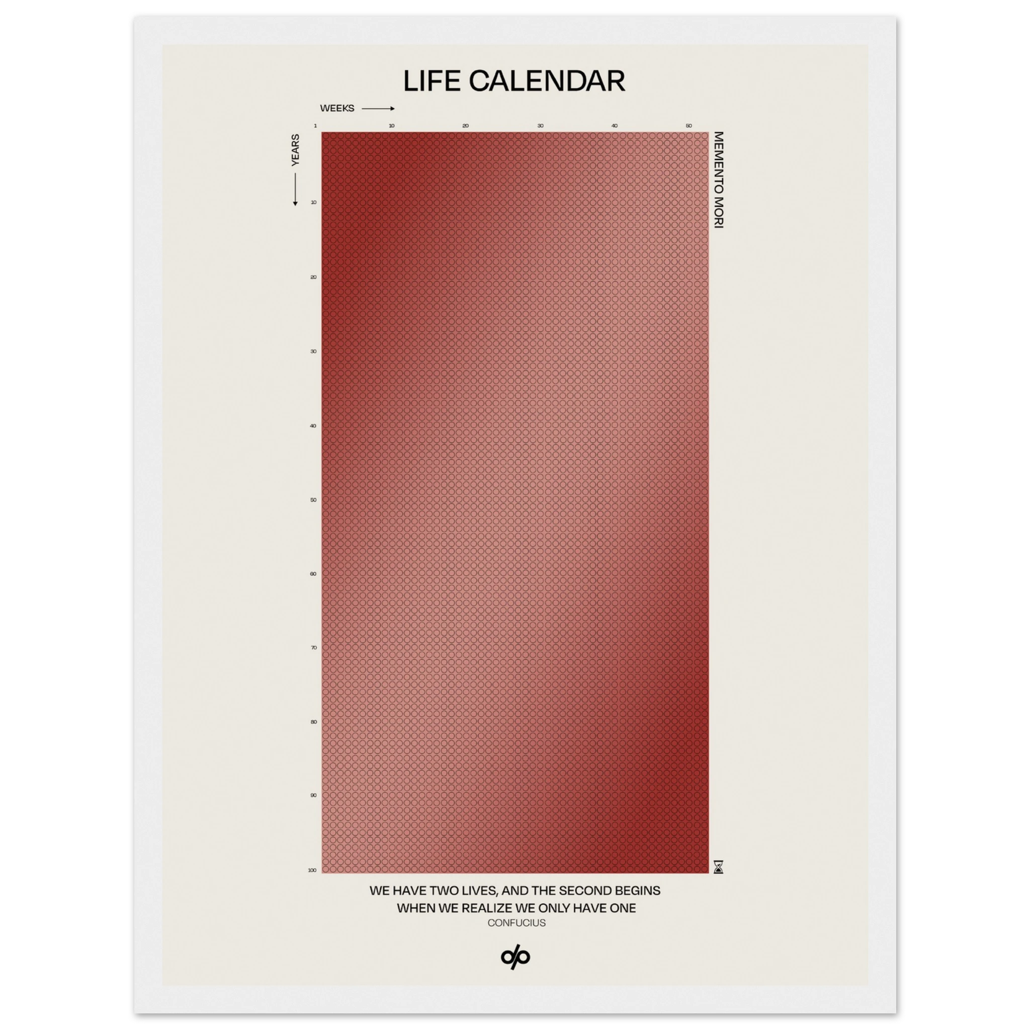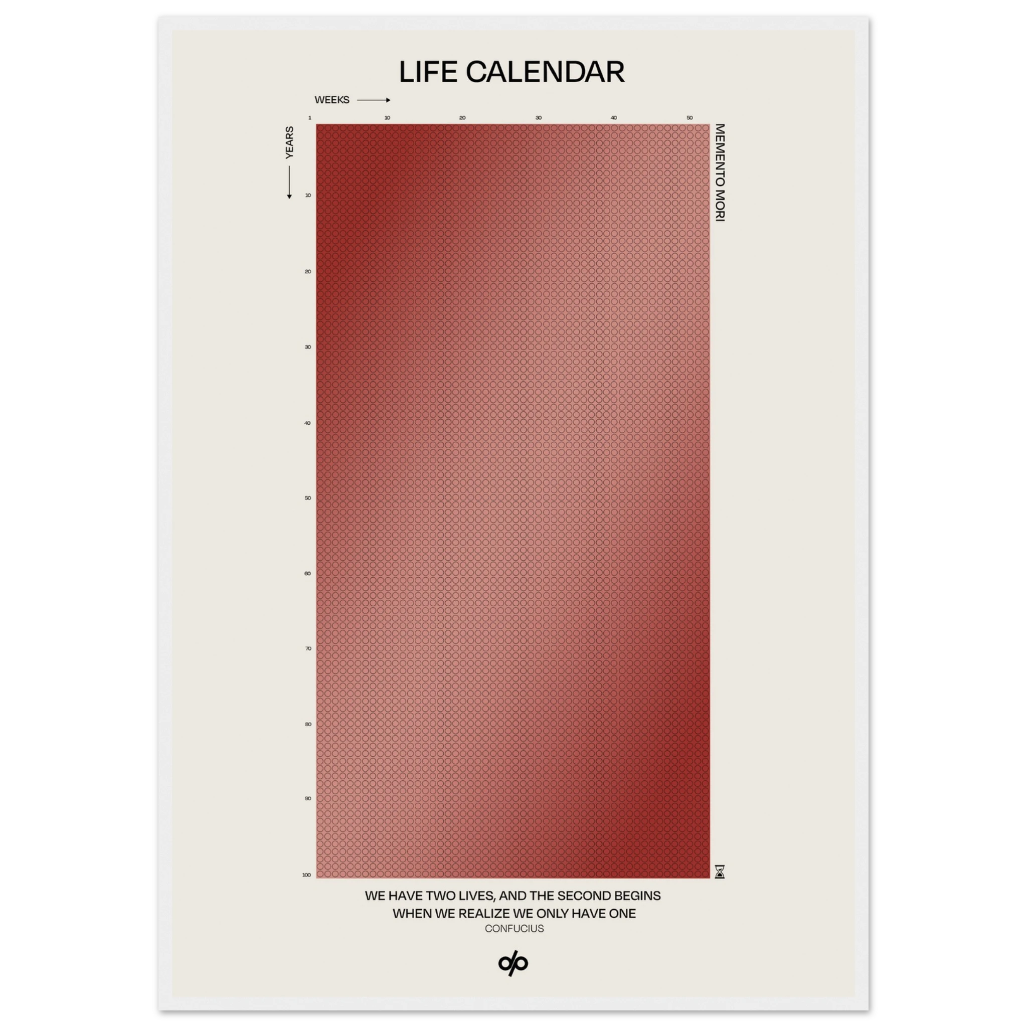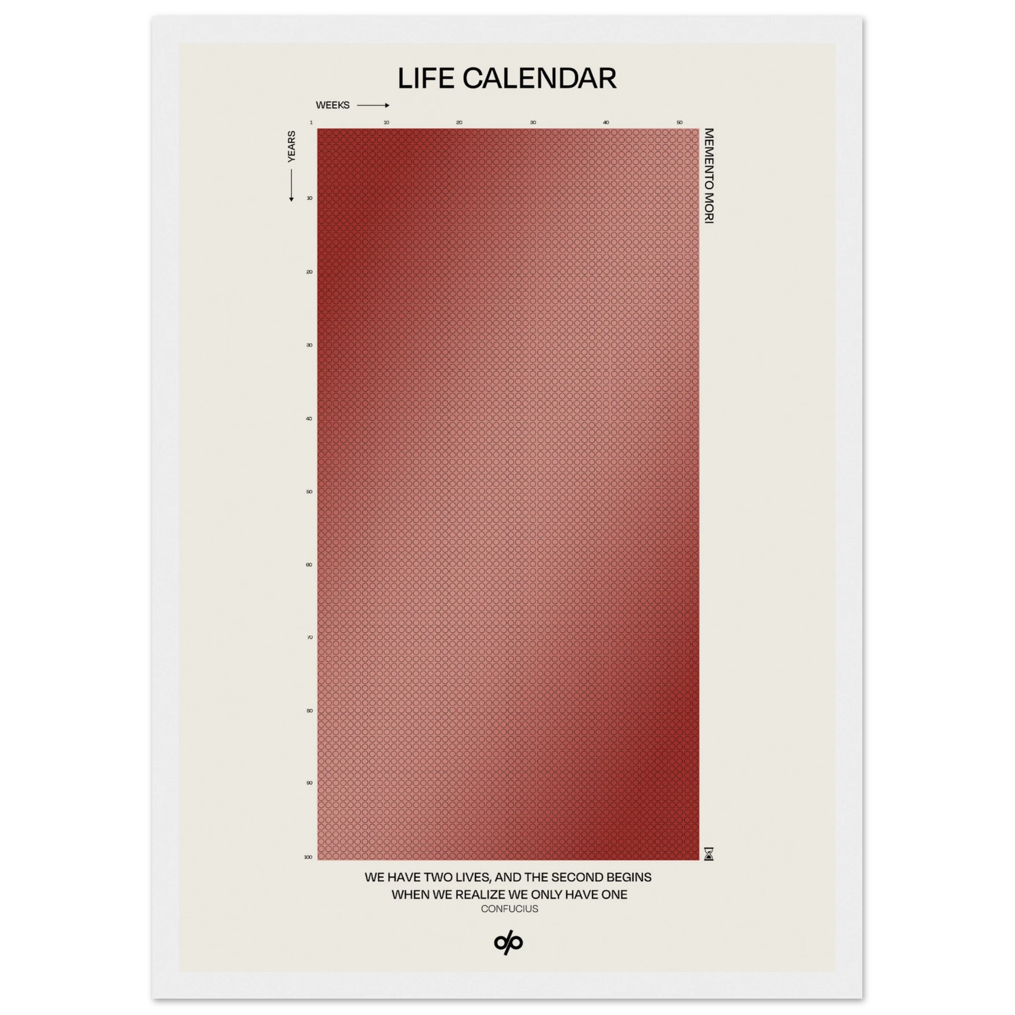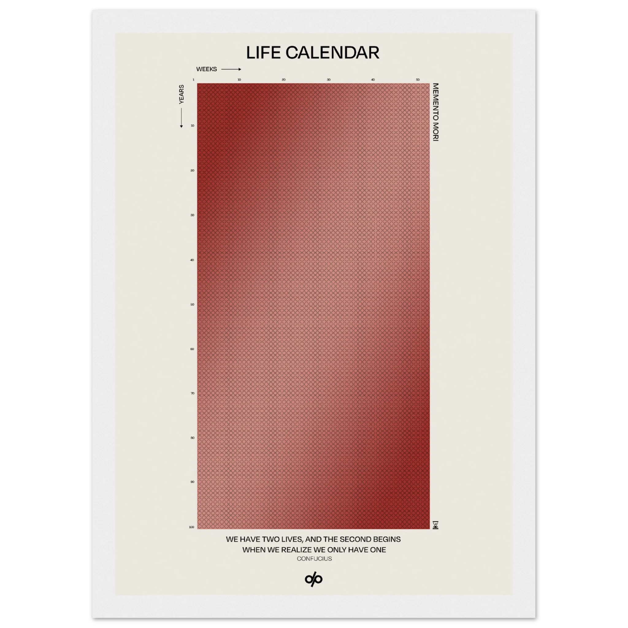 Life Calendar is a visual meditation on time, presented as a grid of small weekly circles spanning a full 100-year lifespan. Inspired by the concept of “Memento Mori” and framed by a powerful quote from Confucius — “We have two lives, and the second begins when we realize we only have one” — this artwork helps viewers reflect on the brevity of life and the value of each passing week.
