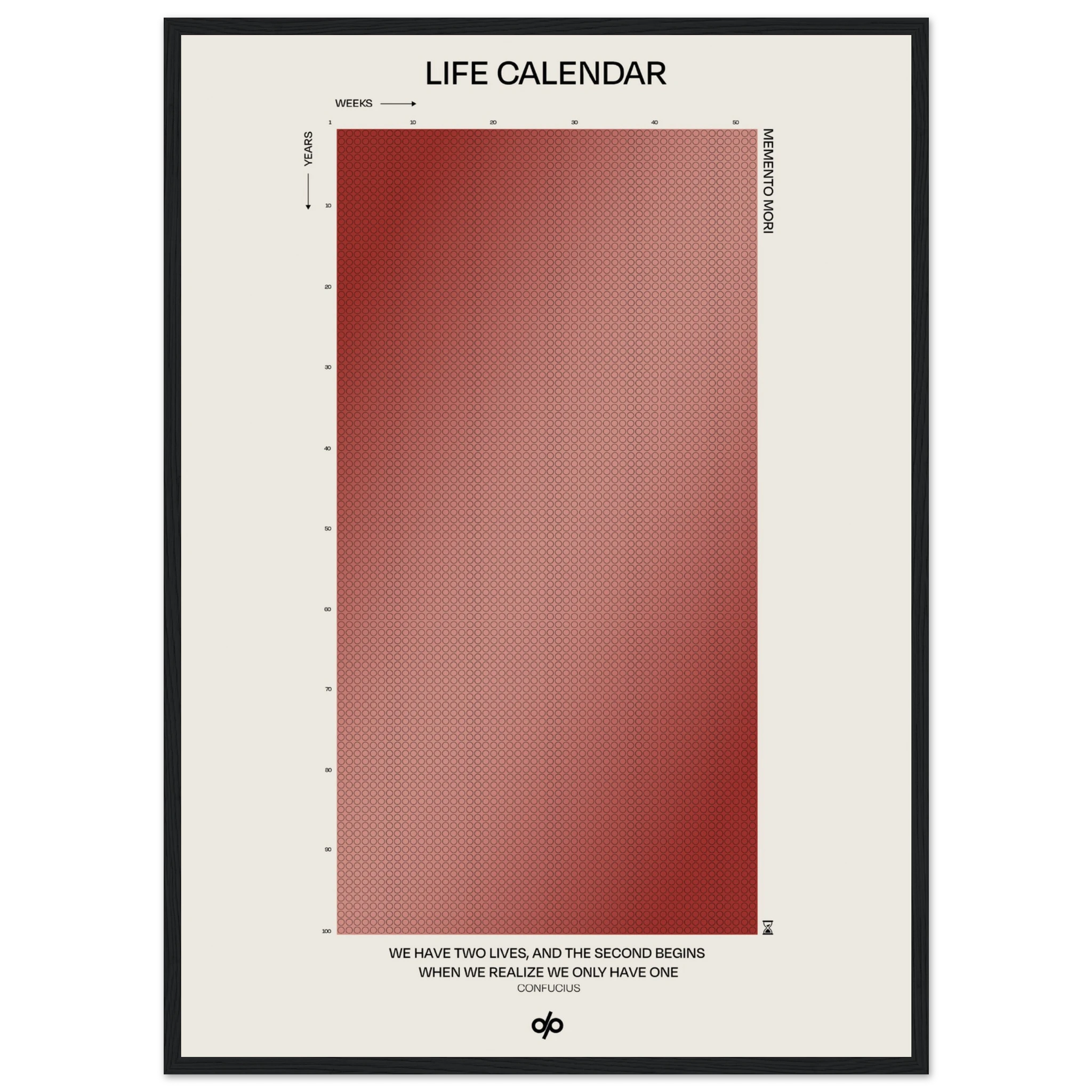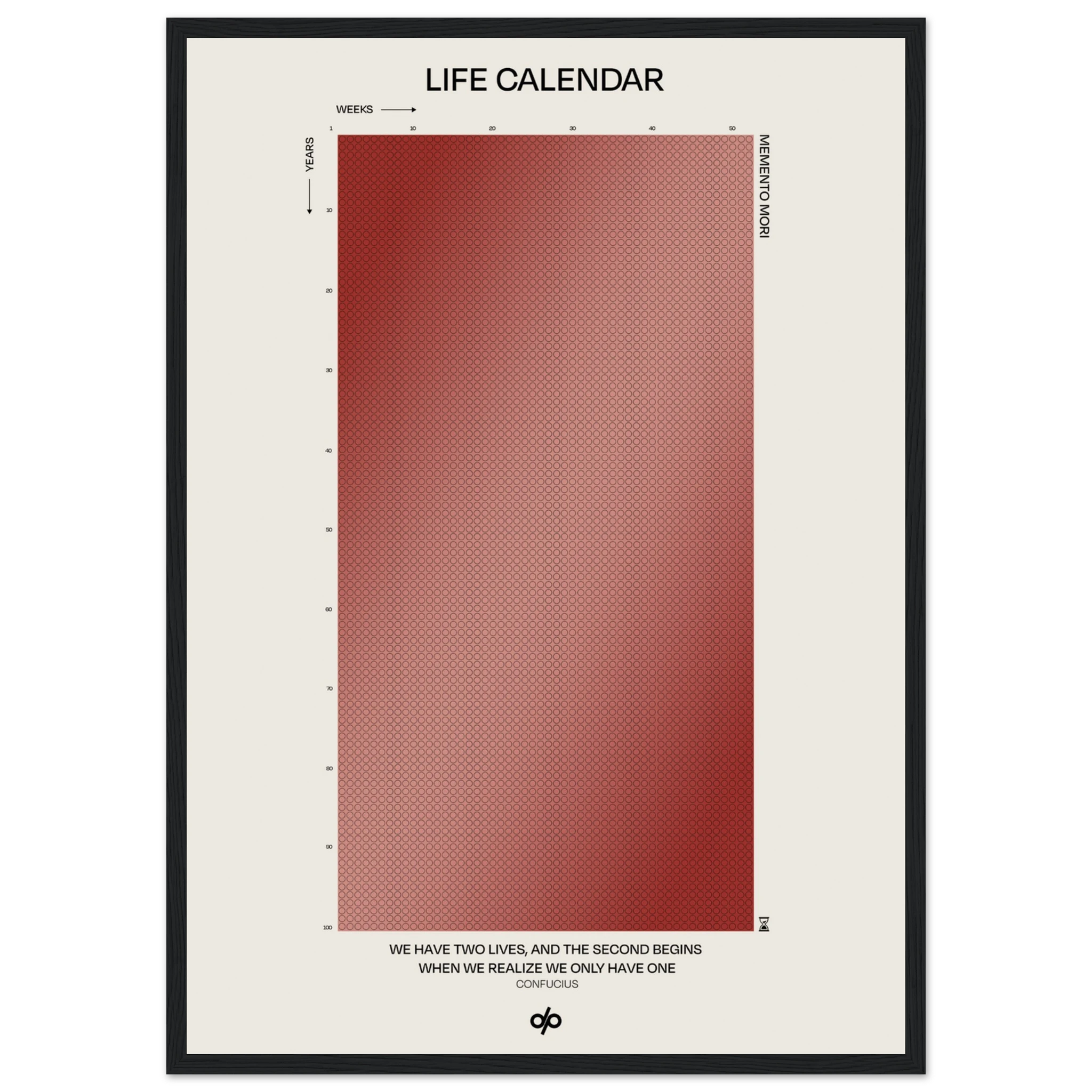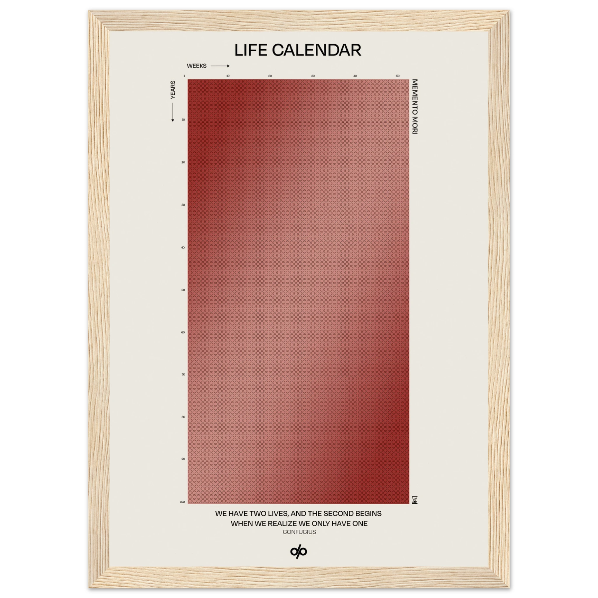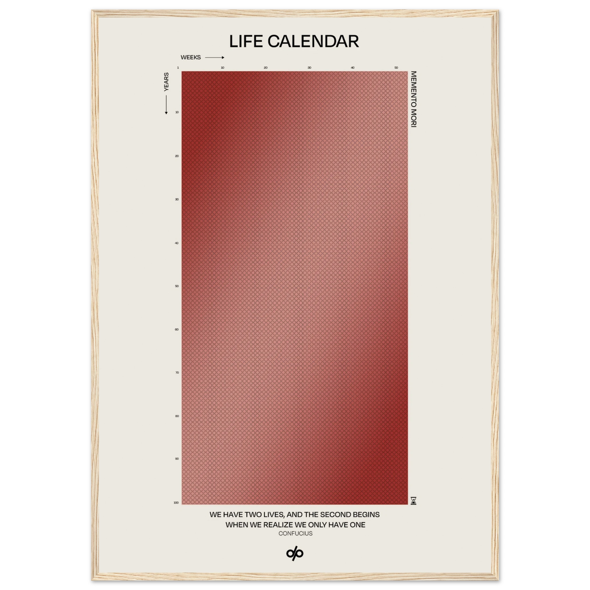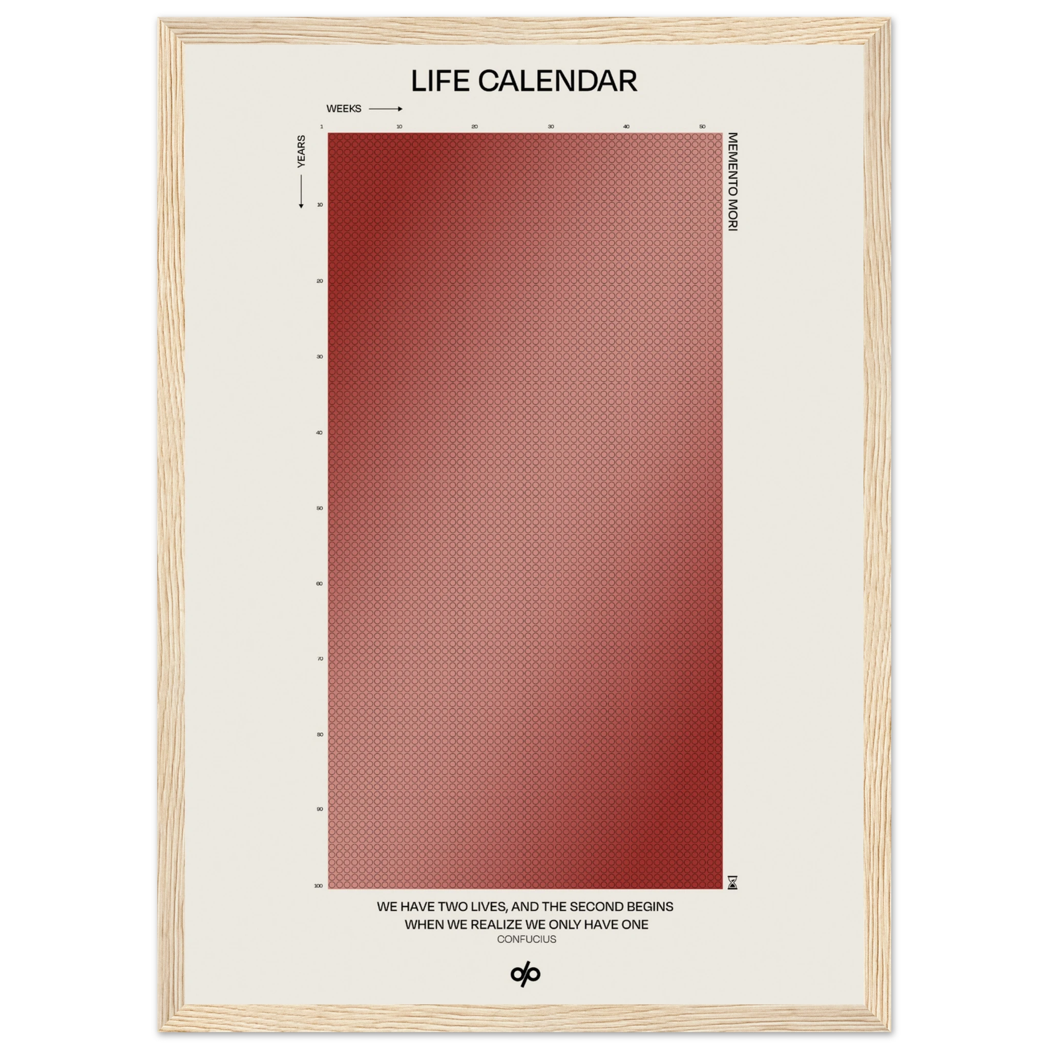 Life Calendar is a visual meditation on time, presented as a grid of small weekly circles spanning a full 100-year lifespan. Inspired by the concept of “Memento Mori” and framed by a powerful quote from Confucius — “We have two lives, and the second begins when we realize we only have one” — this artwork helps viewers reflect on the brevity of life and the value of each passing week.