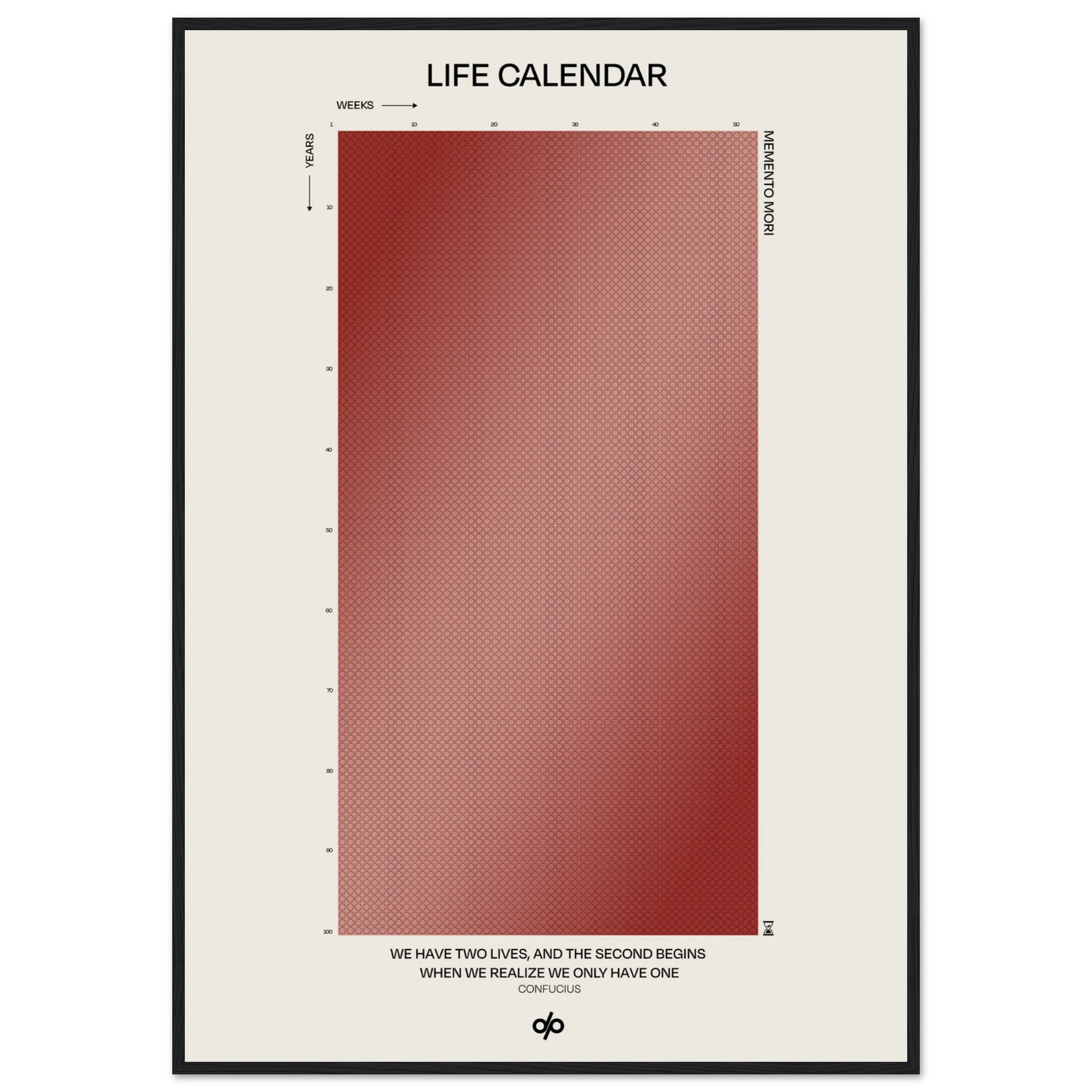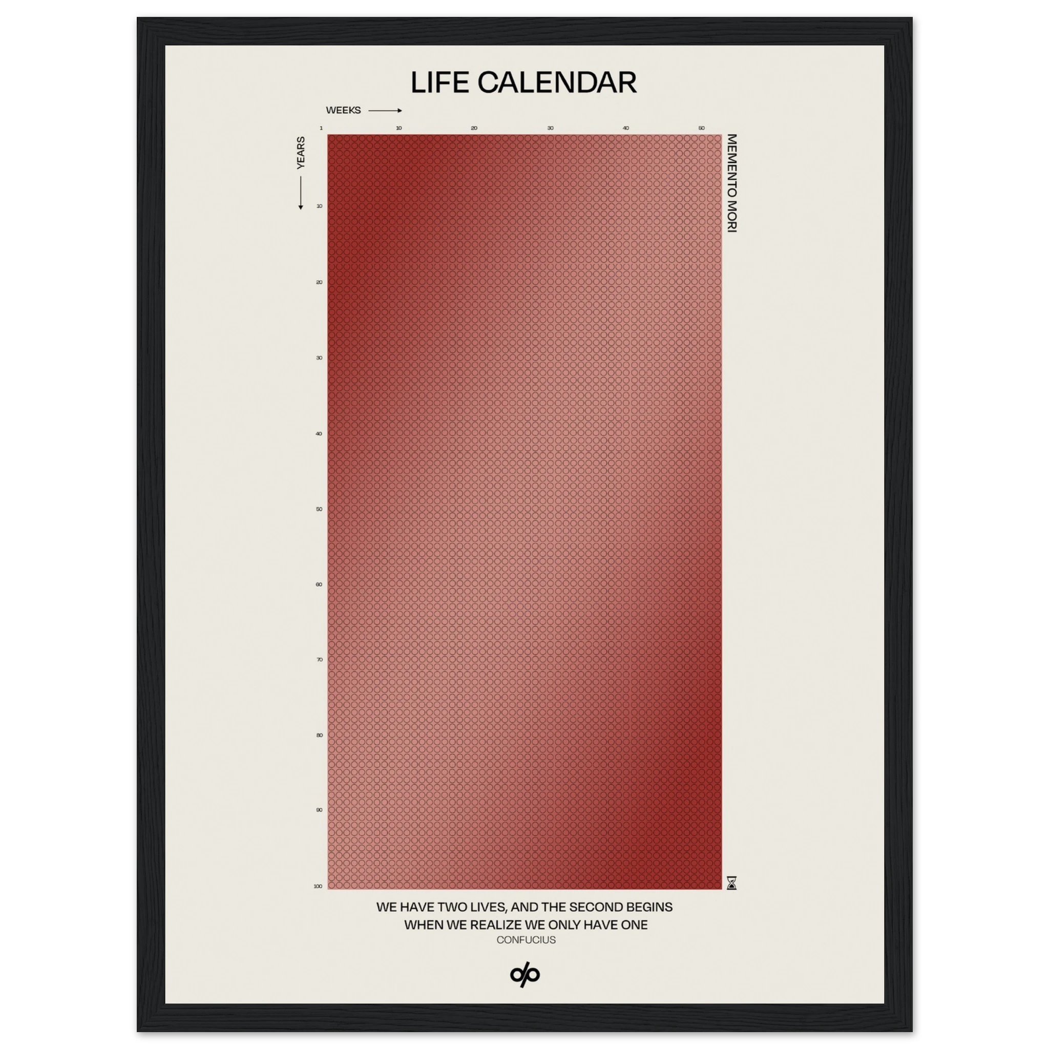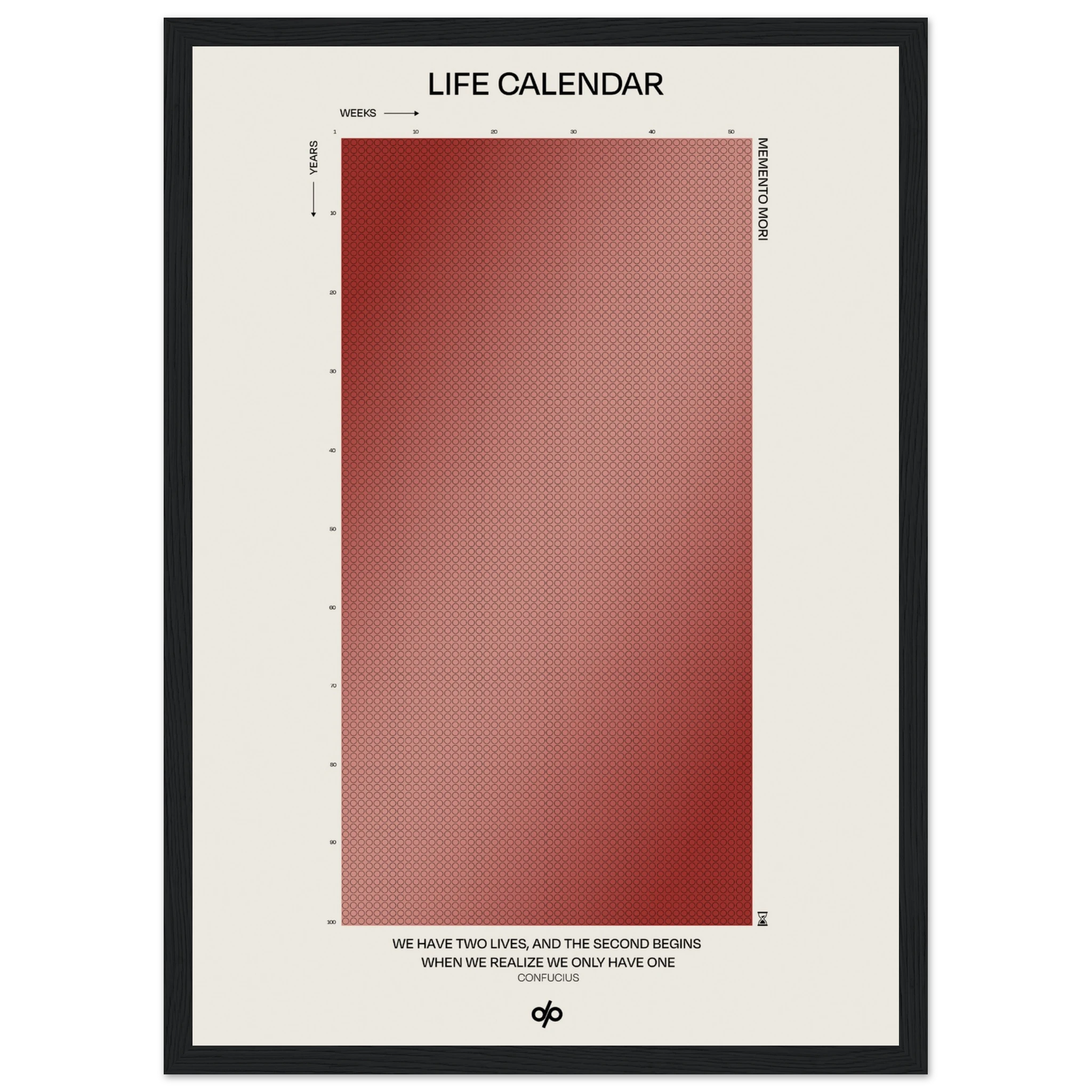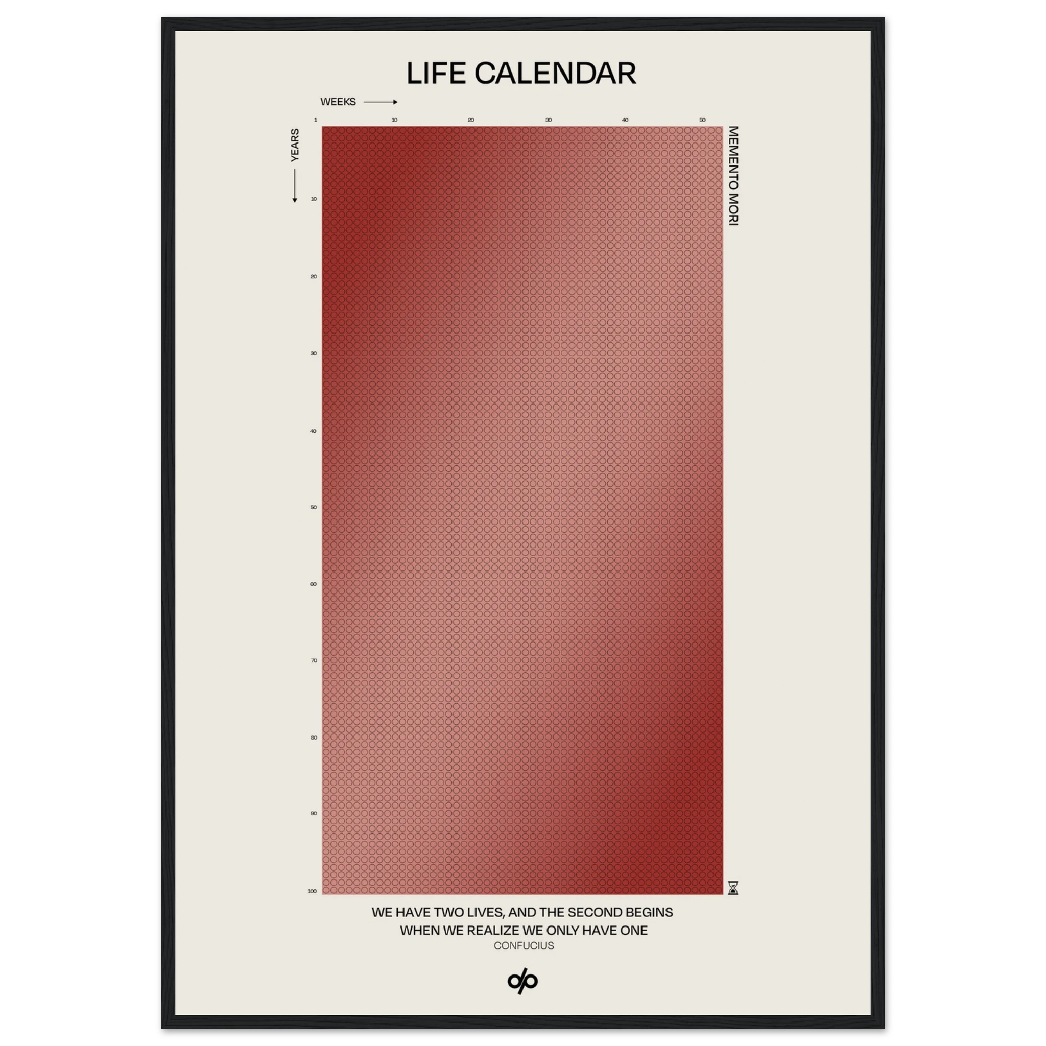 Life Calendar is a visual meditation on time, presented as a grid of small weekly circles spanning a full 100-year lifespan. Inspired by the concept of “Memento Mori” and framed by a powerful quote from Confucius — “We have two lives, and the second begins when we realize we only have one” — this artwork helps viewers reflect on the brevity of life and the value of each passing week.