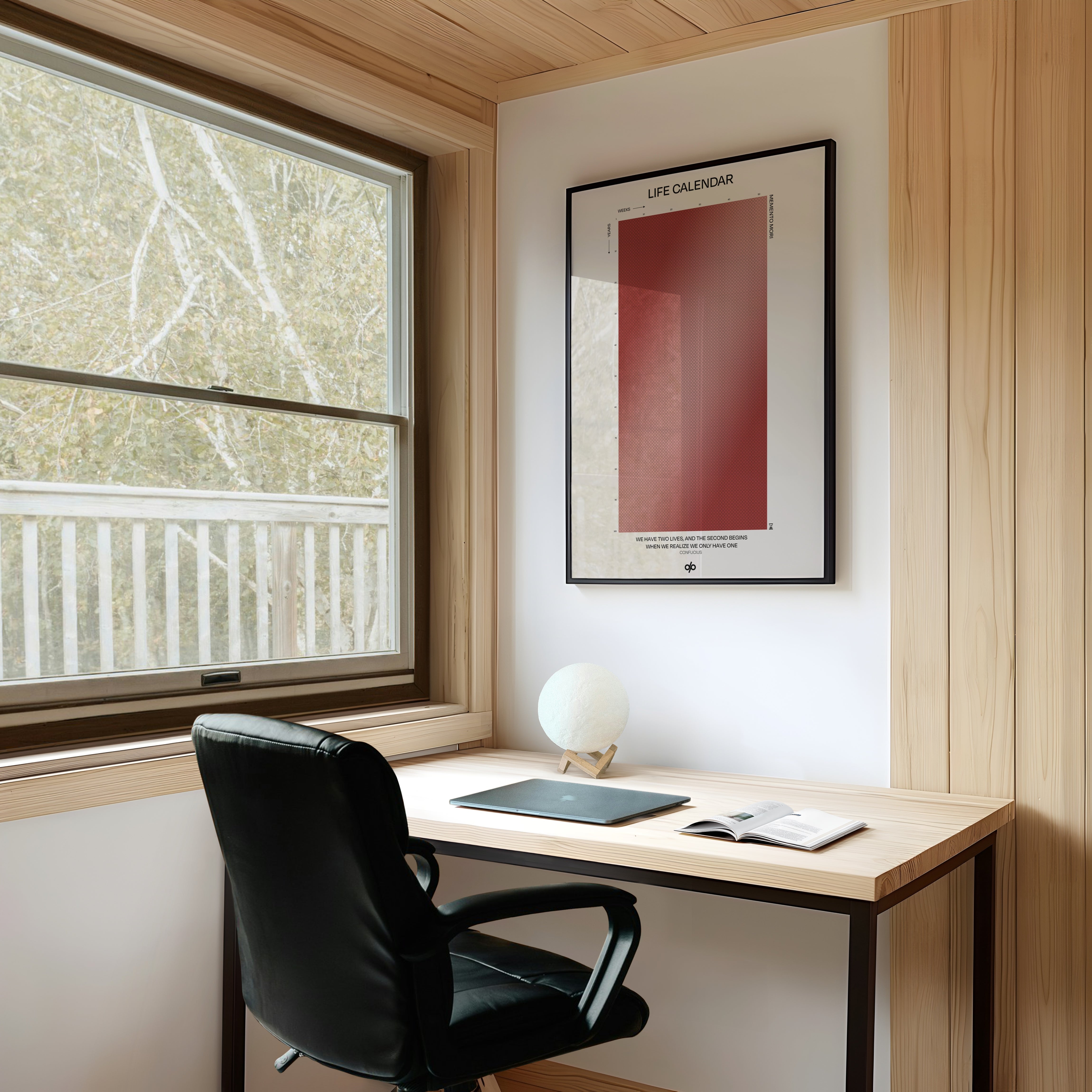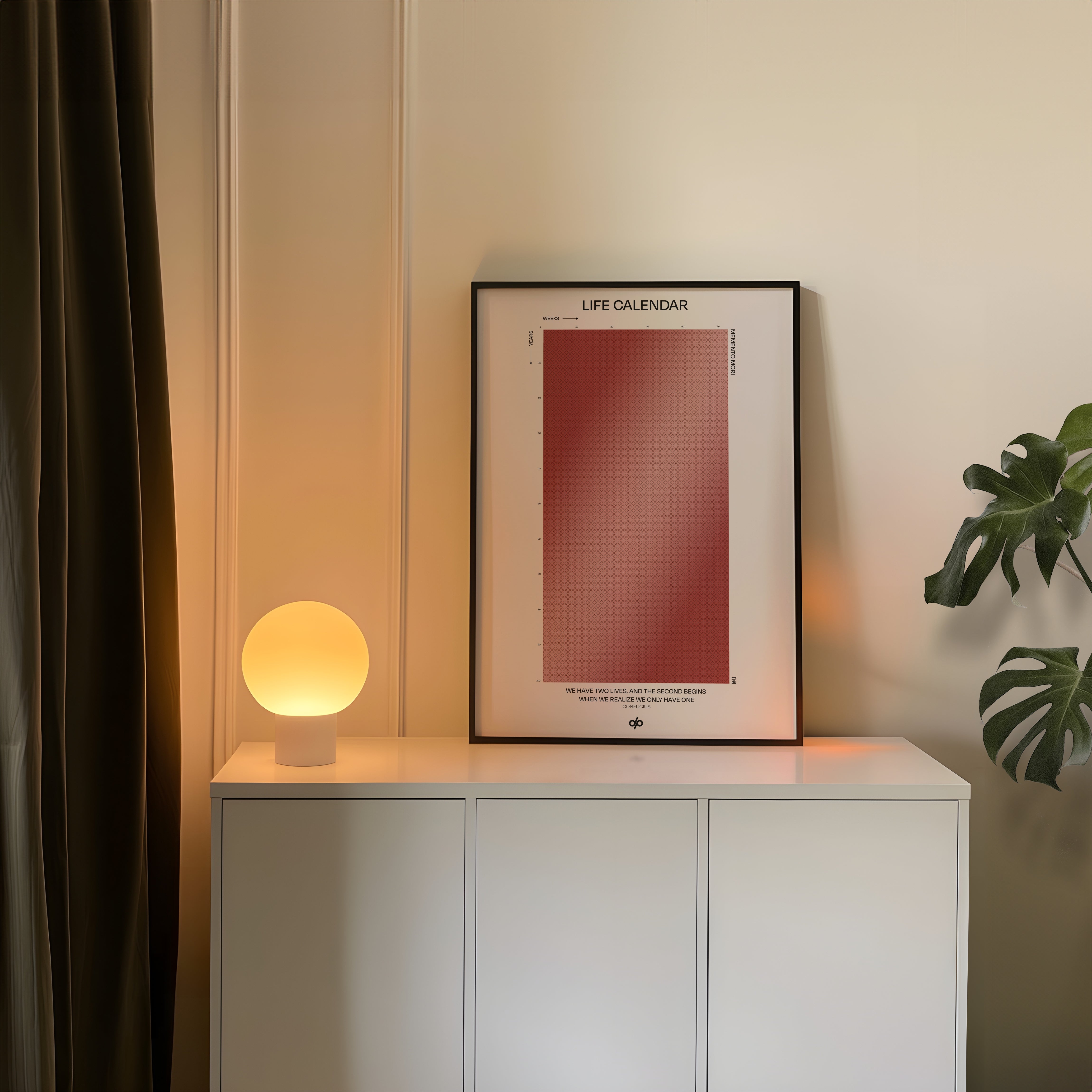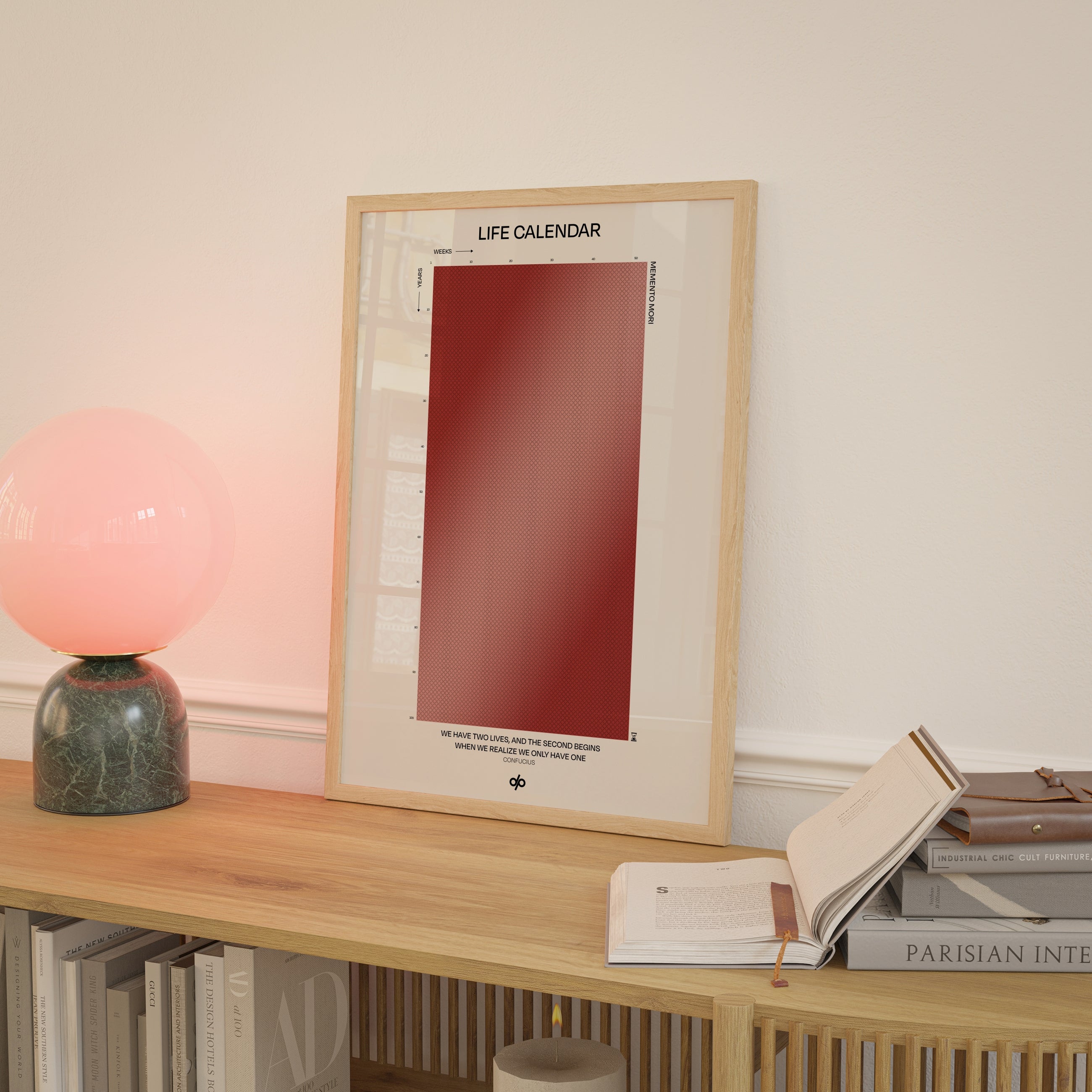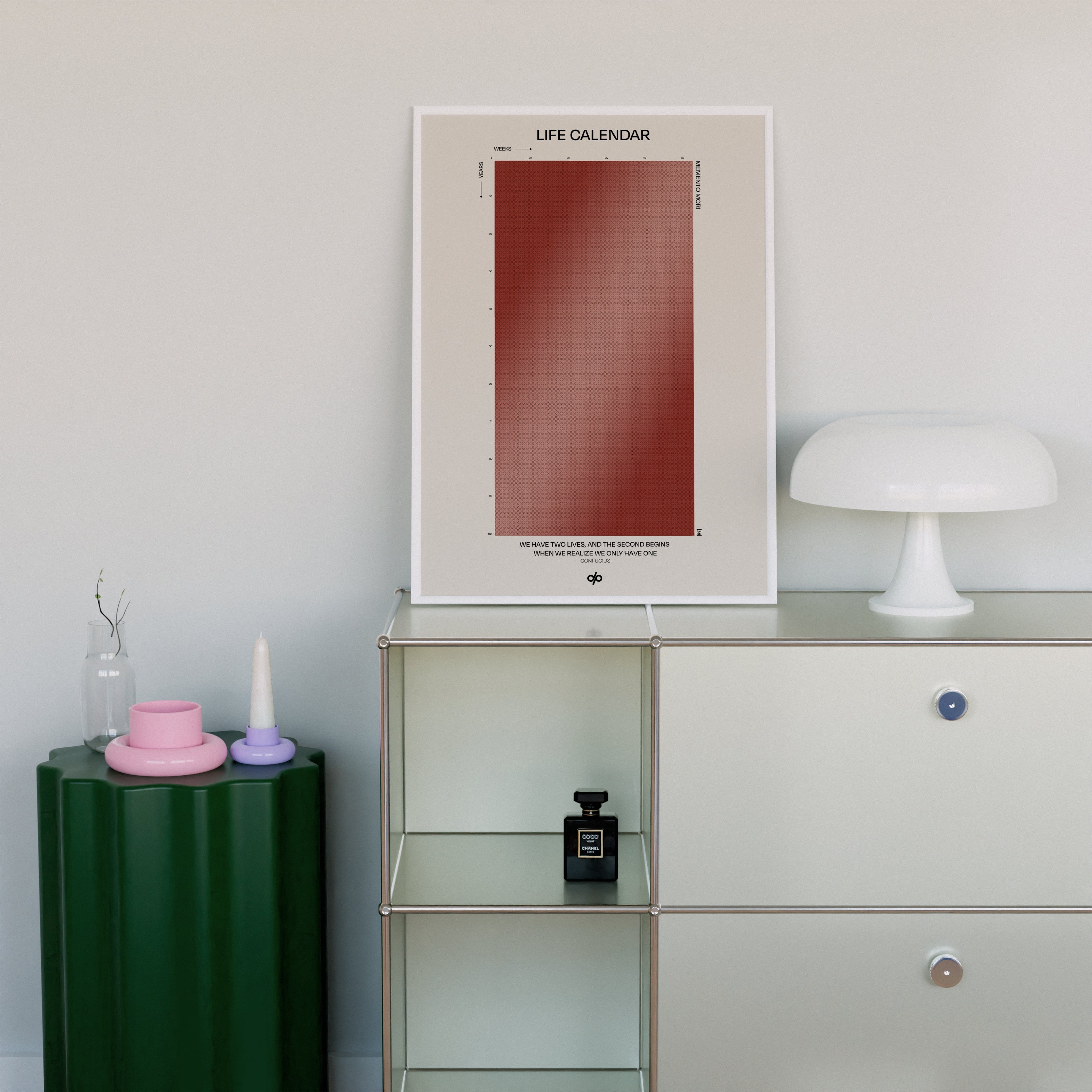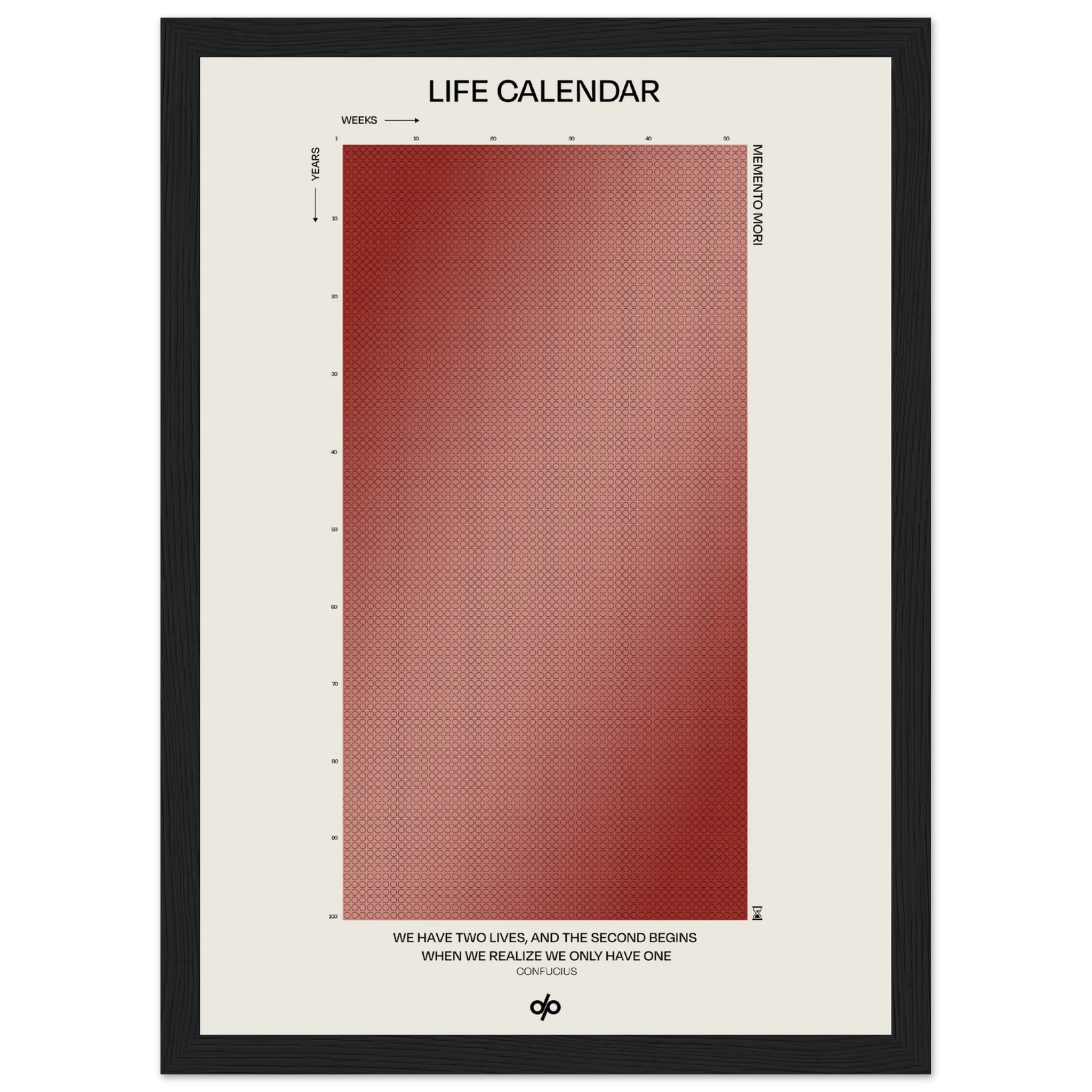 Life Calendar is a visual meditation on time, presented as a grid of small weekly circles spanning a full 100-year lifespan. Inspired by the concept of “Memento Mori” and framed by a powerful quote from Confucius — “We have two lives, and the second begins when we realize we only have one” — this artwork helps viewers reflect on the brevity of life and the value of each passing week.