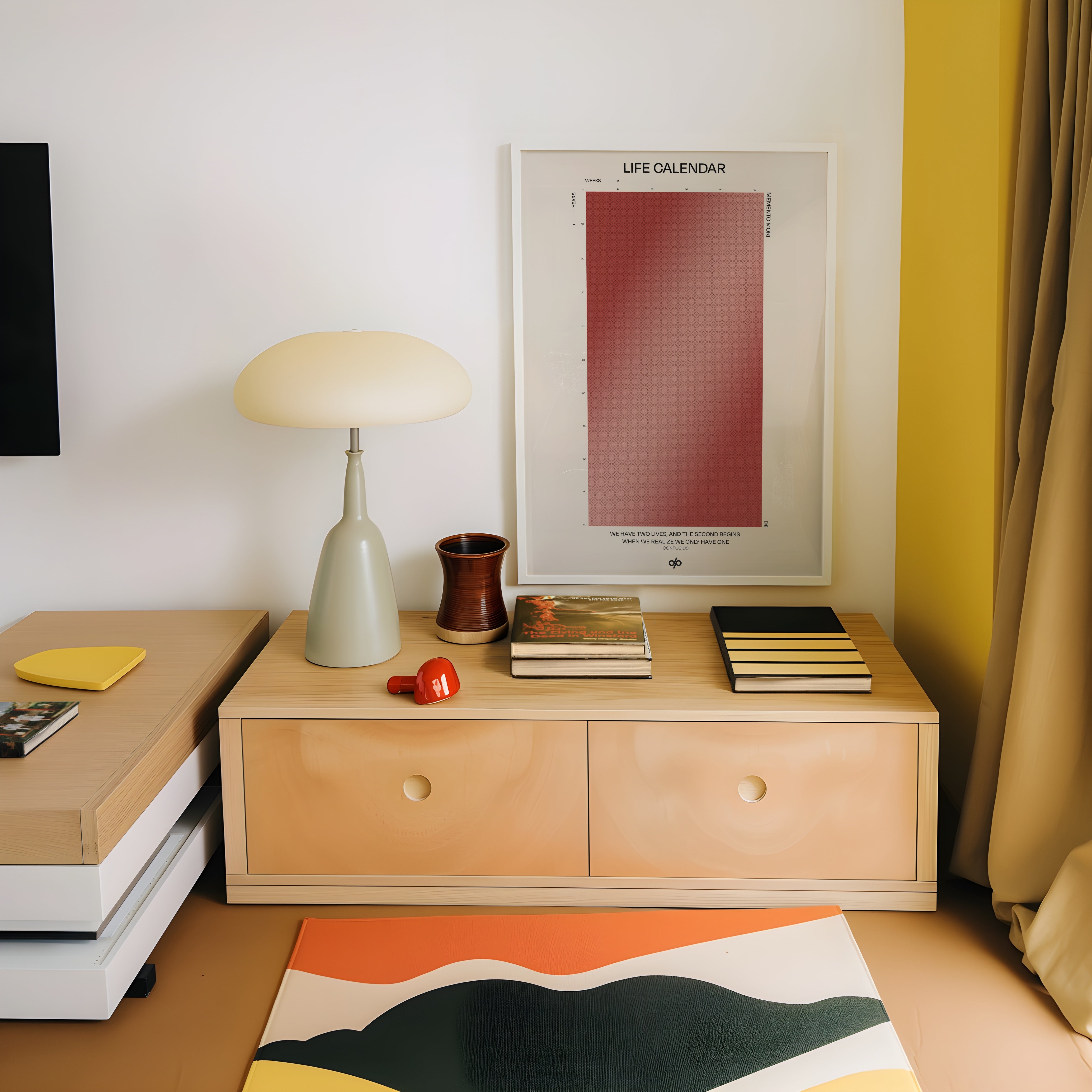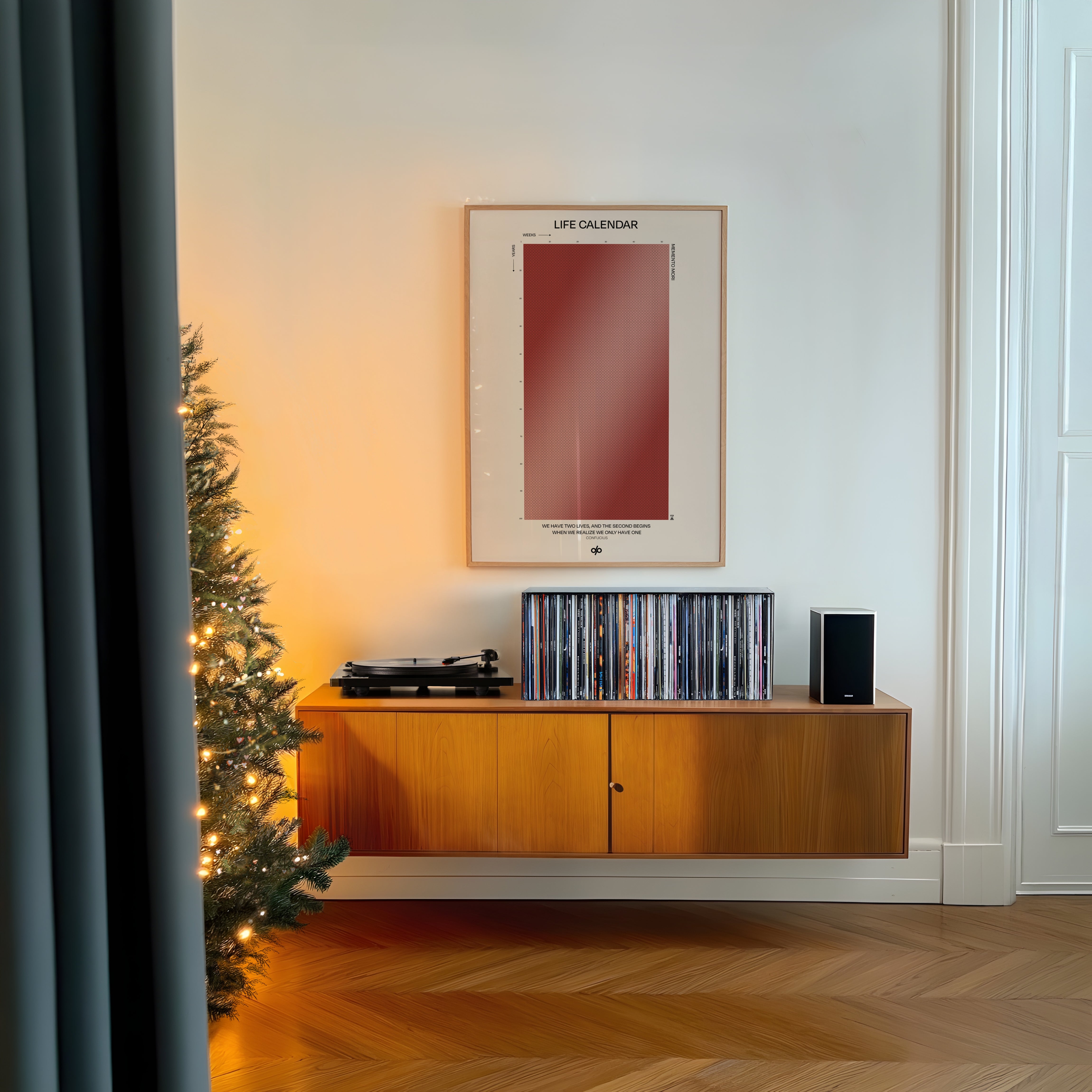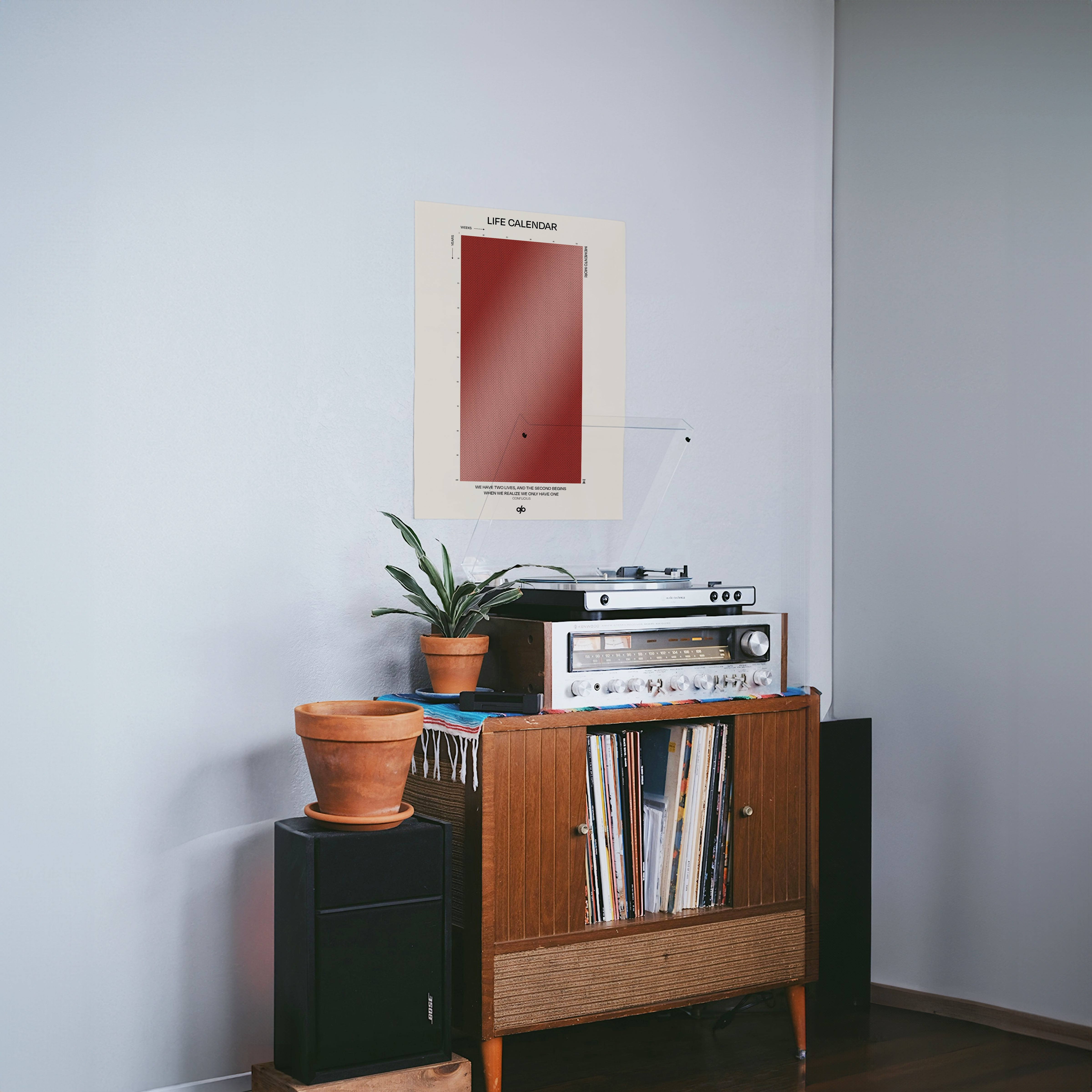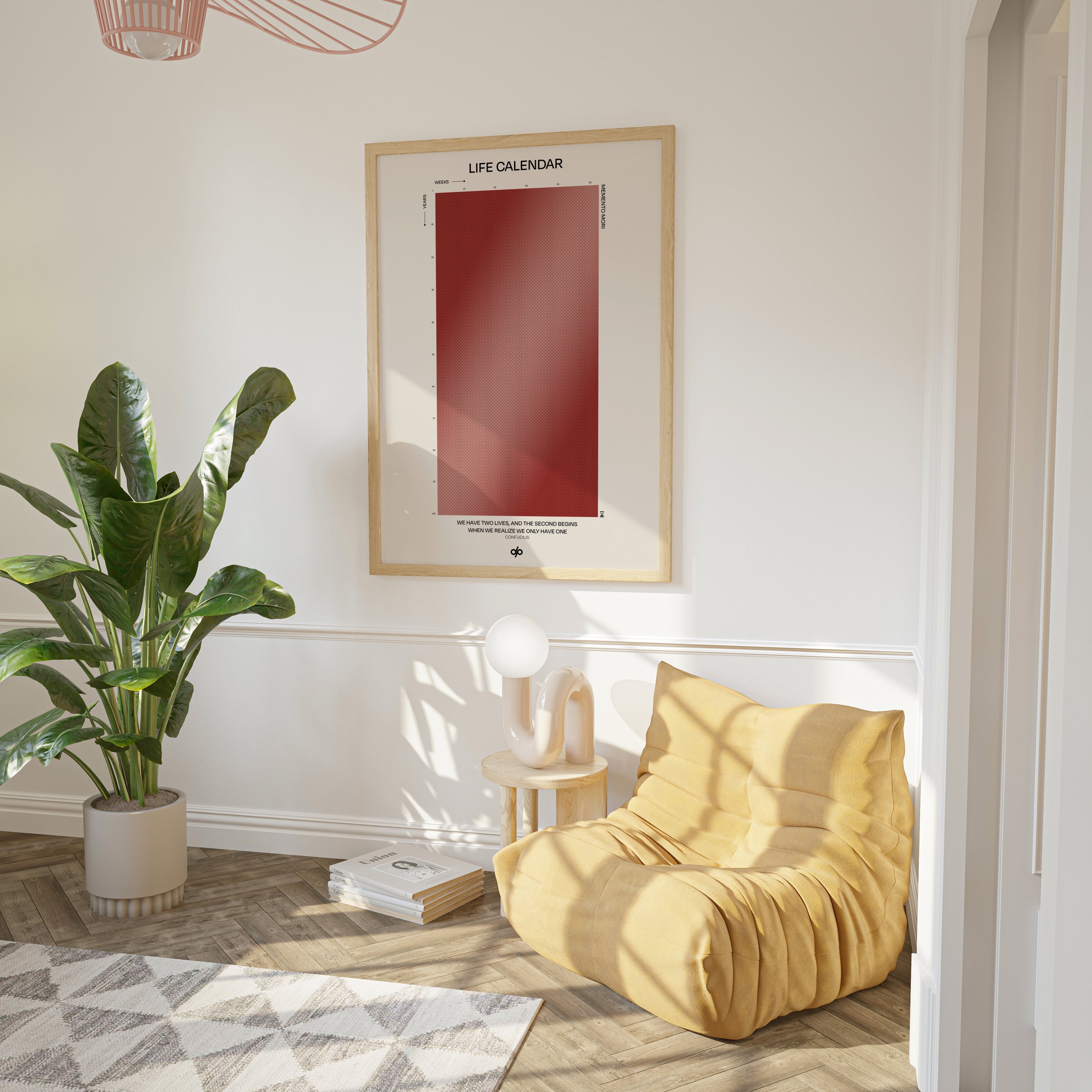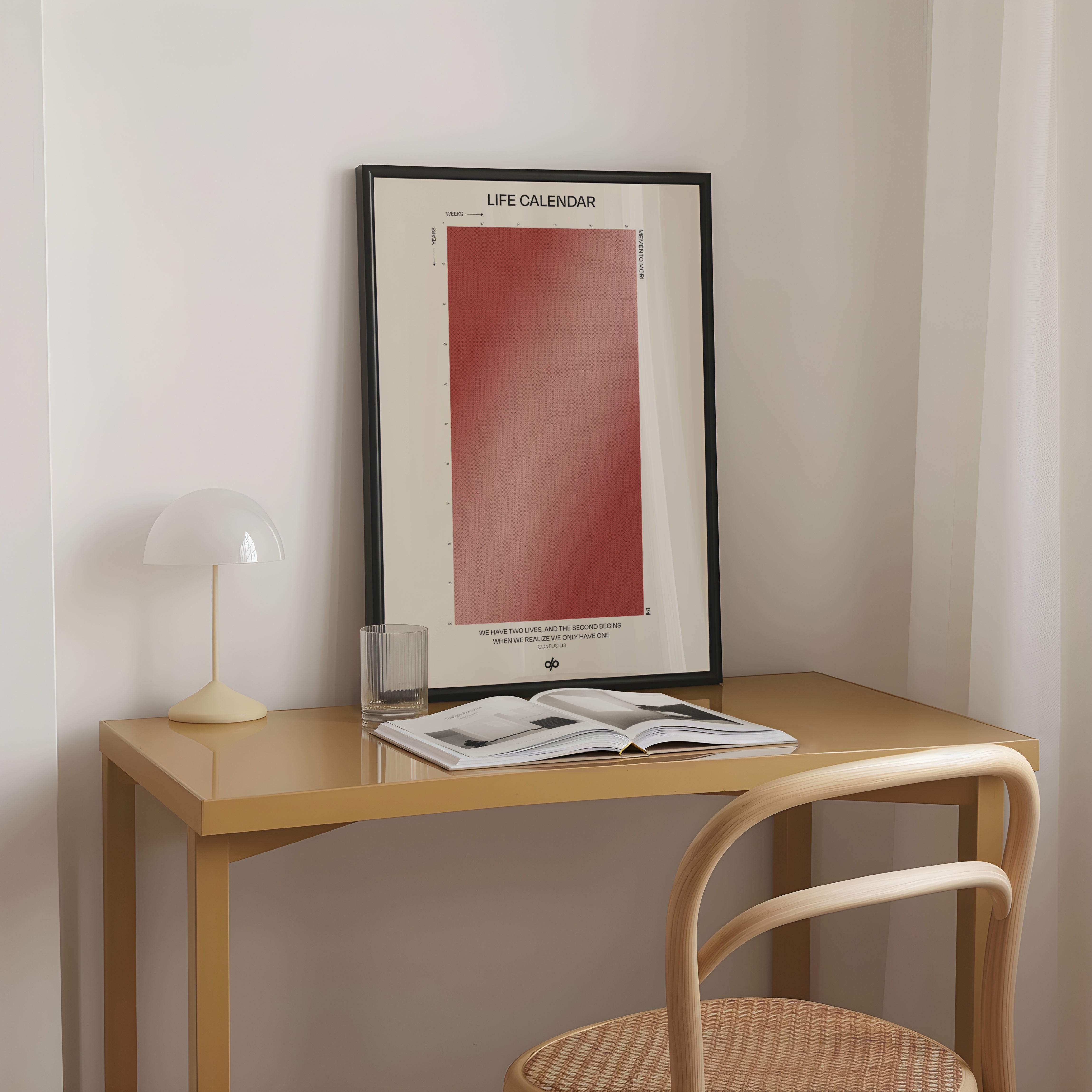Life Calendar is a visual meditation on time, presented as a grid of small weekly circles spanning a full 100-year lifespan. Inspired by the concept of “Memento Mori” and framed by a powerful quote from Confucius — “We have two lives, and the second begins when we realize we only have one” — this artwork helps viewers reflect on the brevity of life and the value of each passing week.