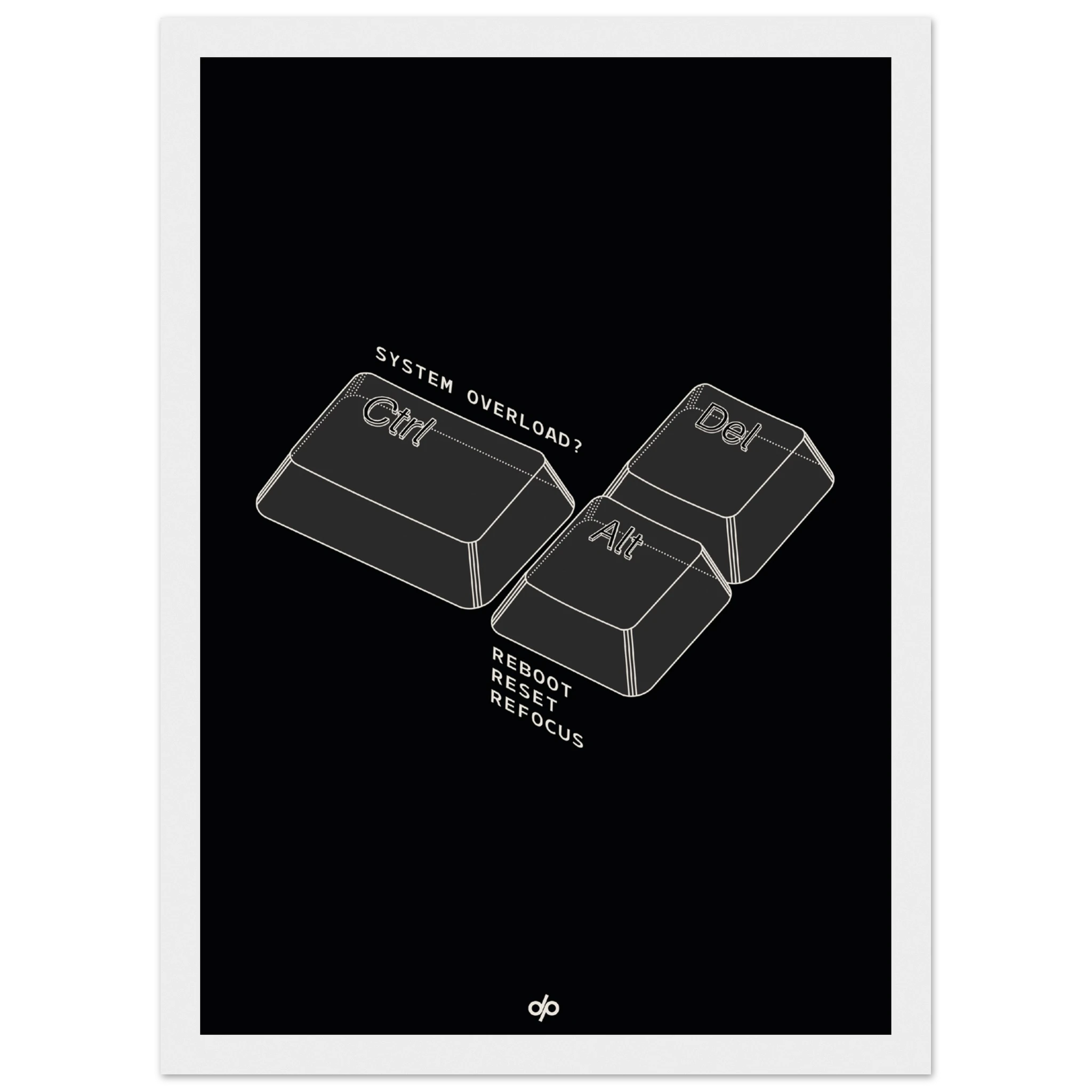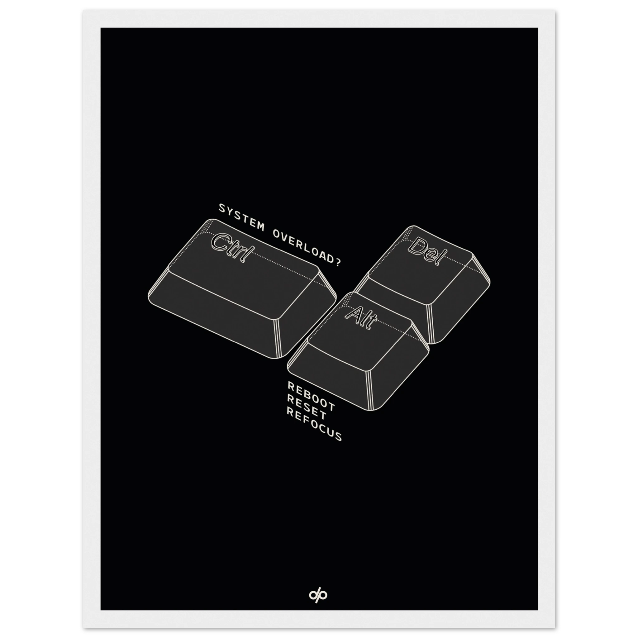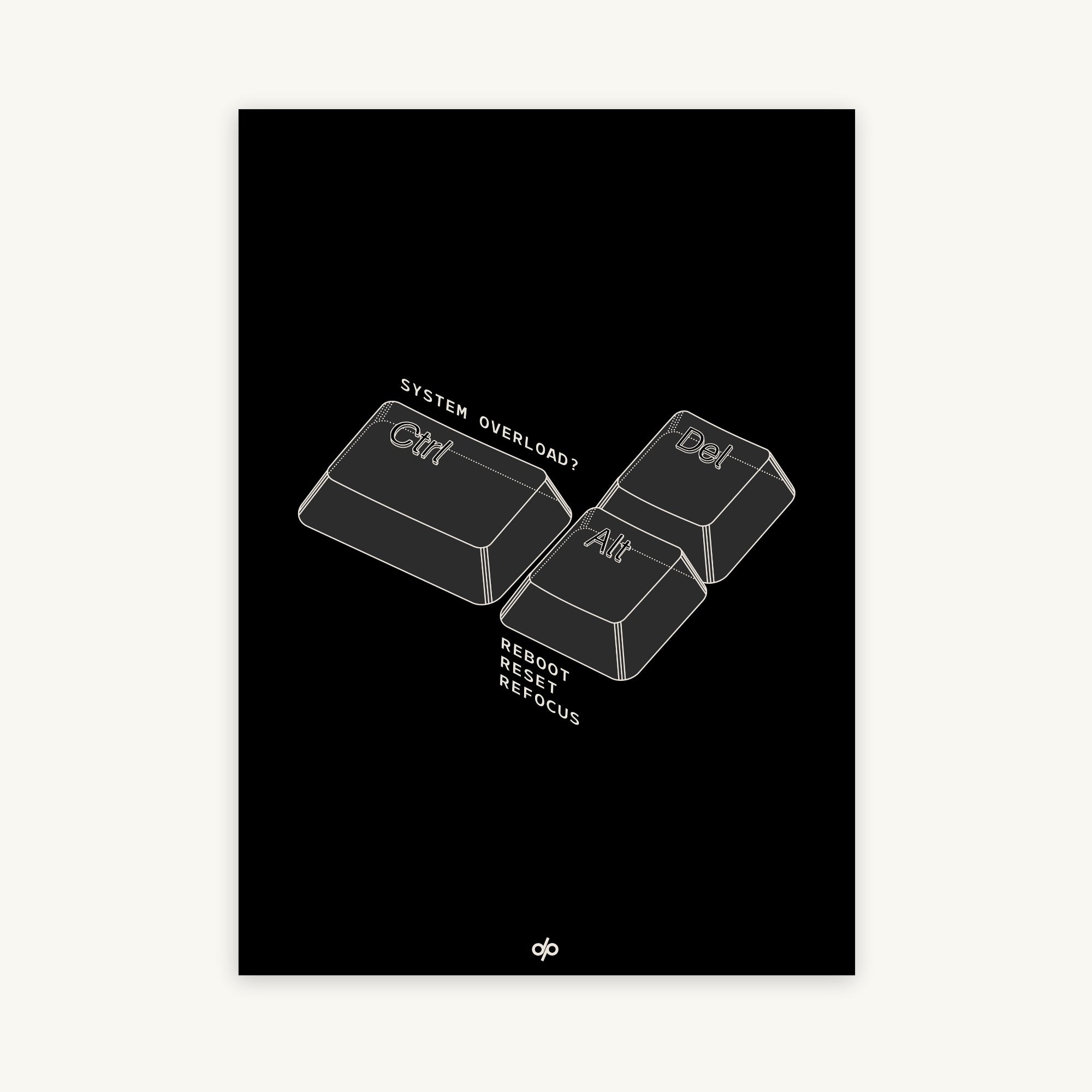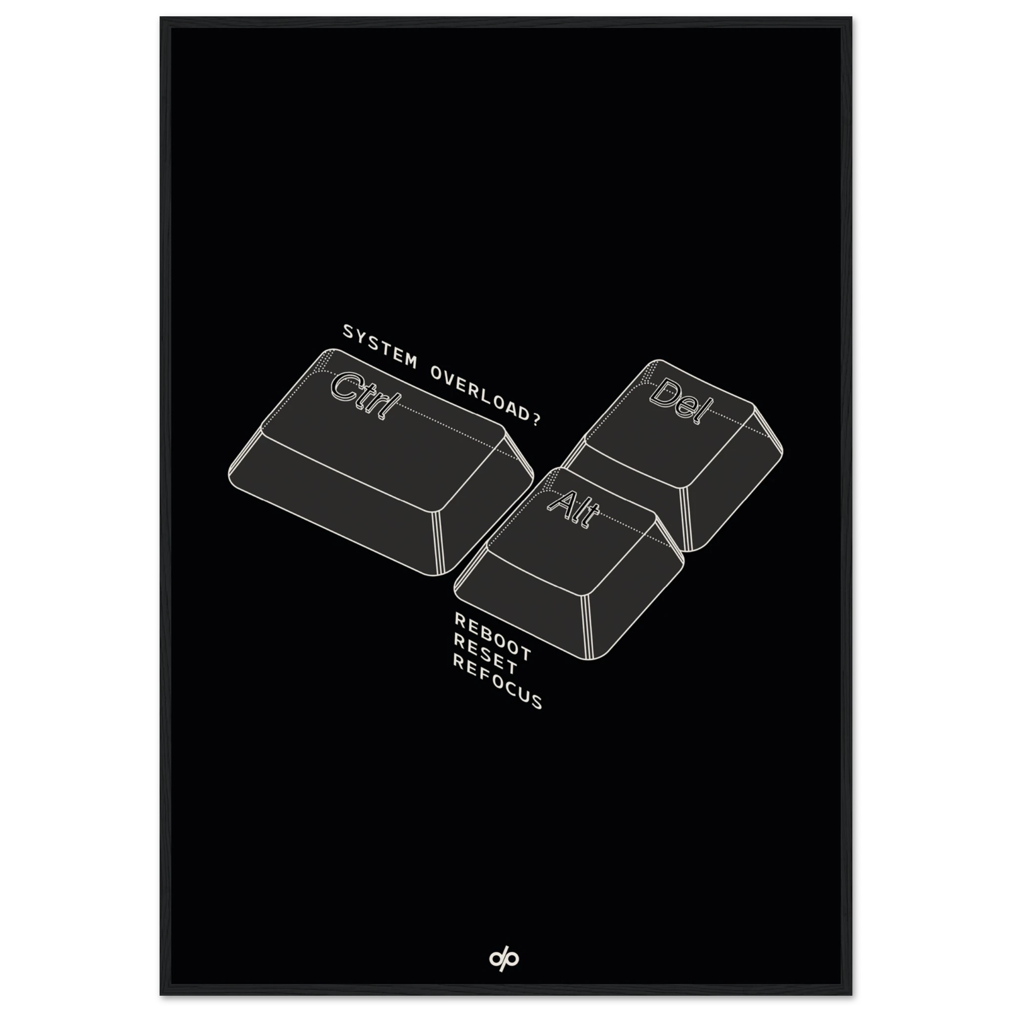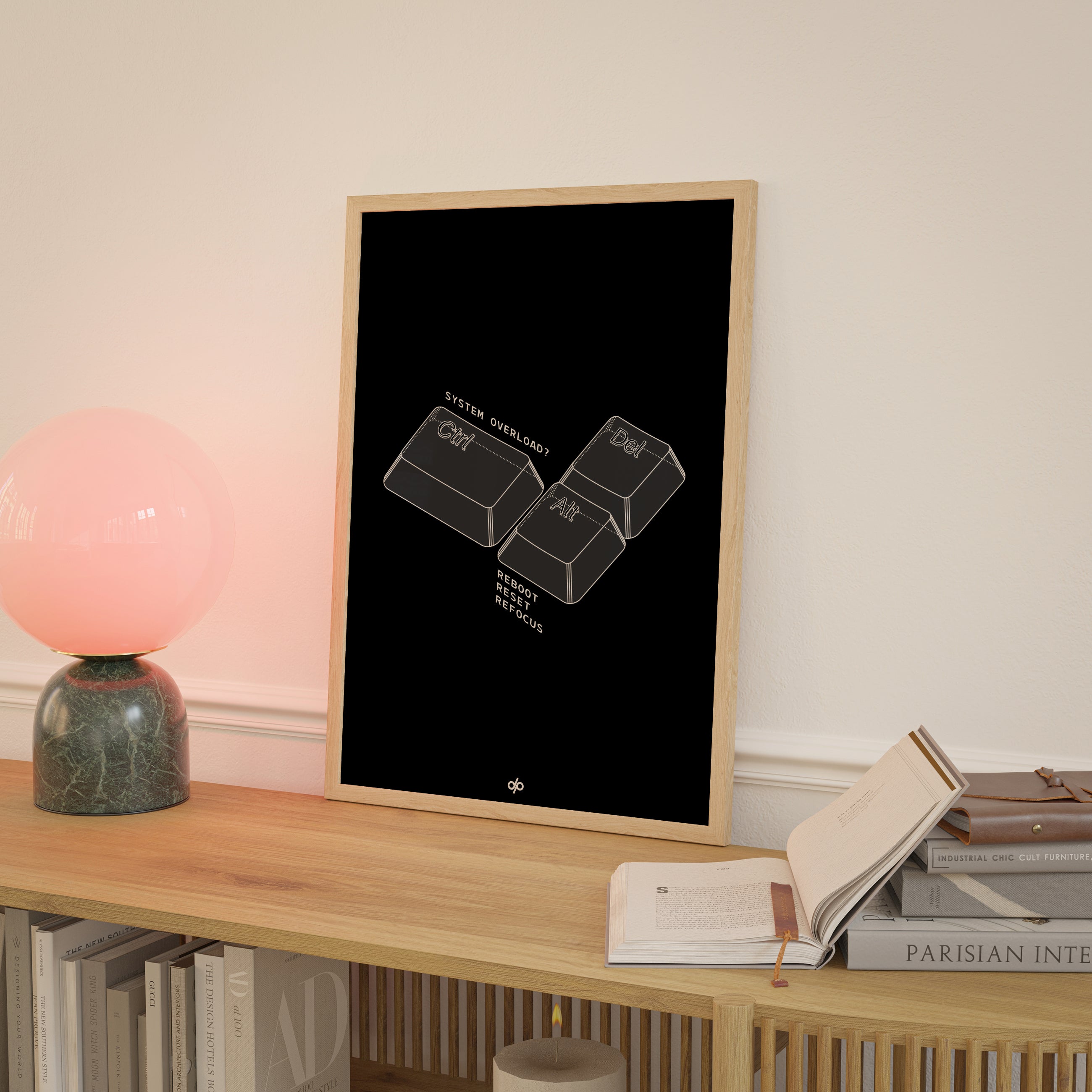 System Overload? art poster transforms the iconic Windows shortcut—Ctrl + Alt + Del—into a bold call to reset your mental system. With the words “Reboot. Reset. Refocus.” beneath the keys, this piece is designed for those moments when everything feels like too much—and a fresh start is the smartest move. It’s a minimalist reminder that even when pressure builds, you can always interrupt the cycle, take a breath, and return stronger.