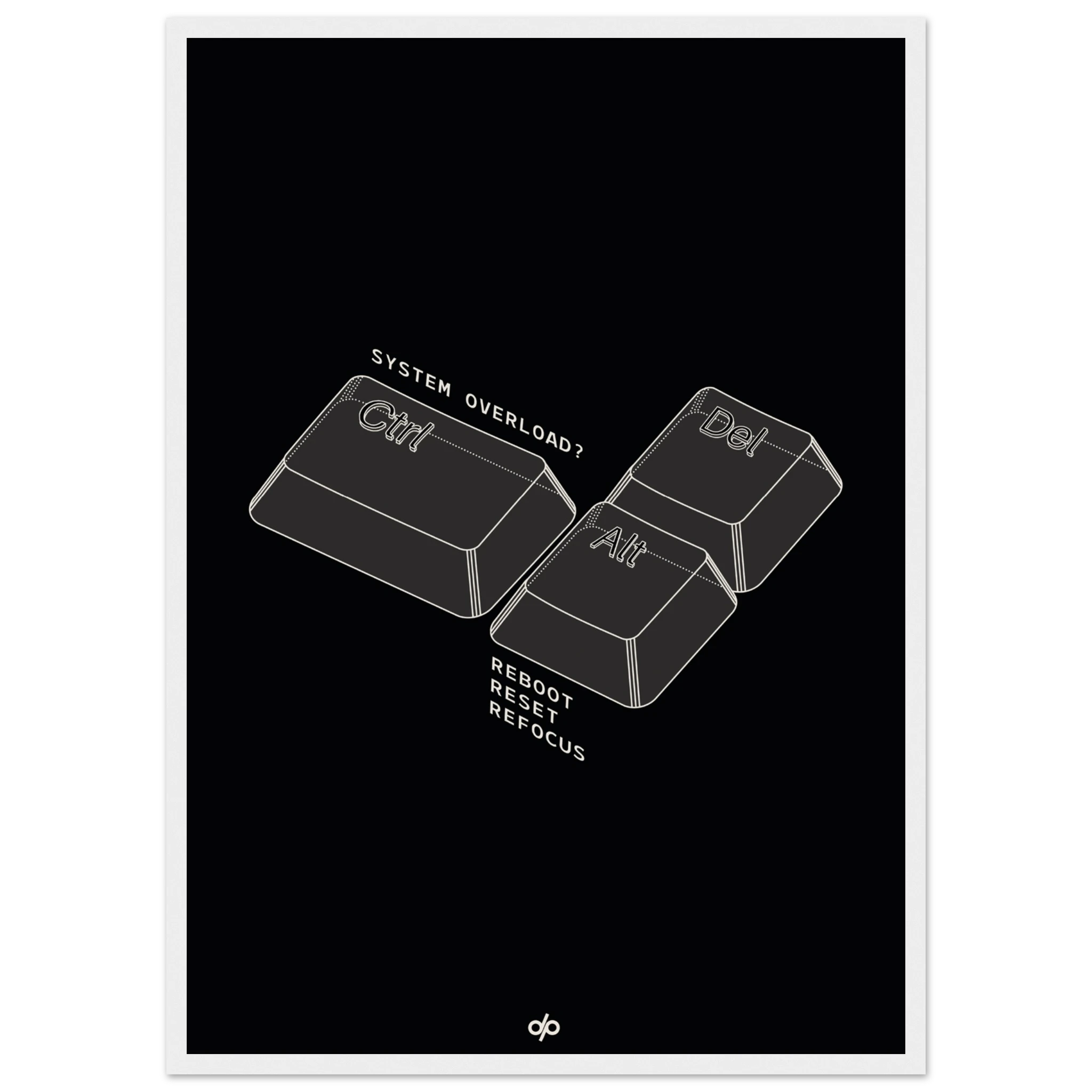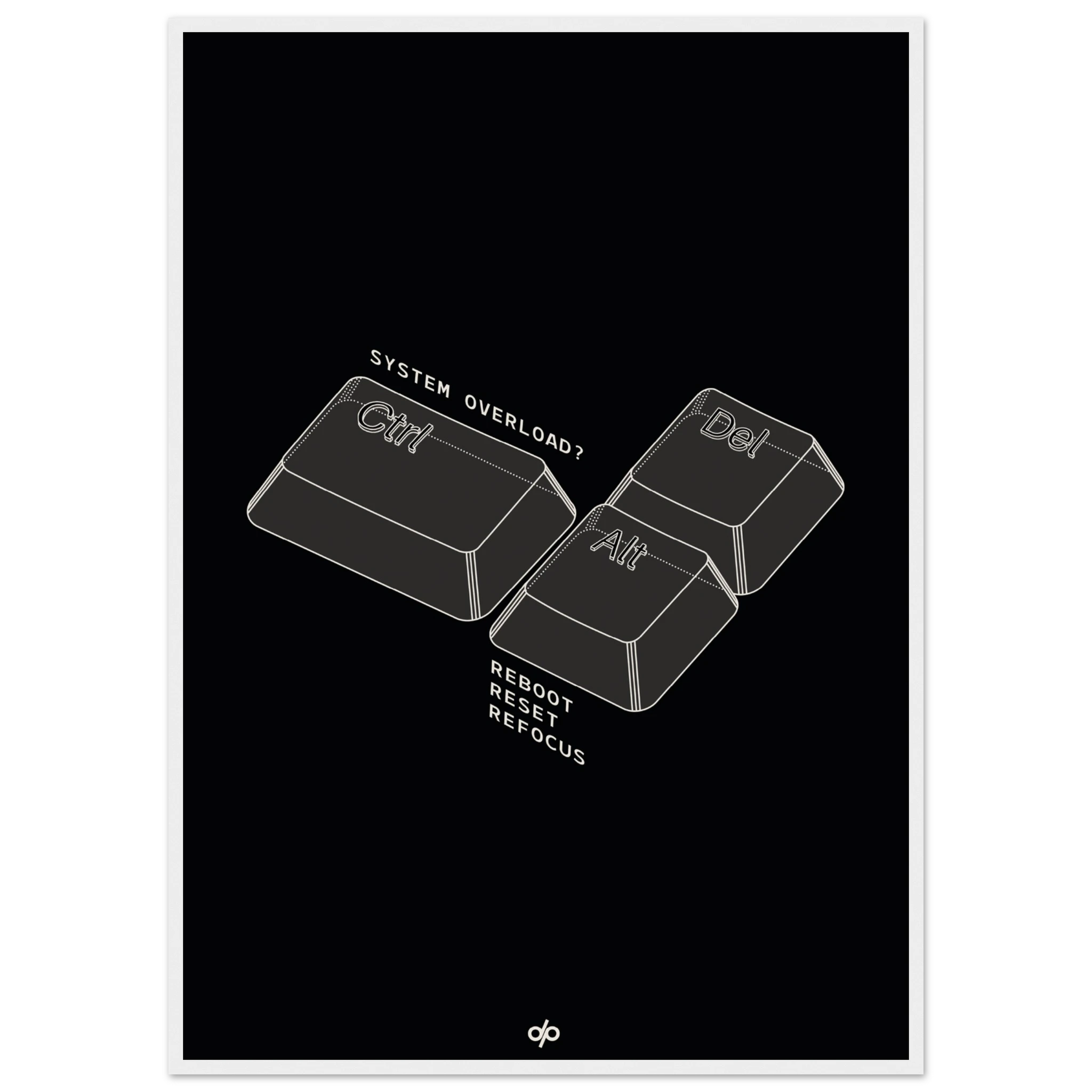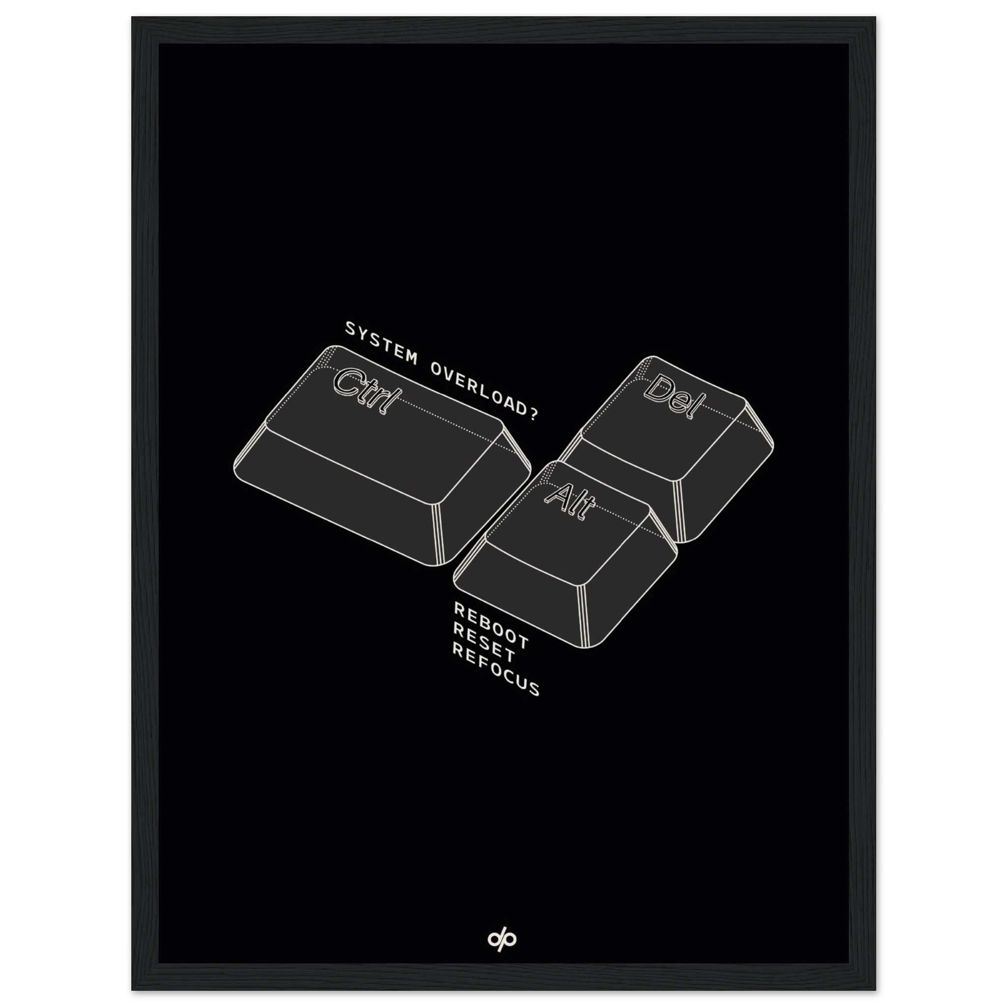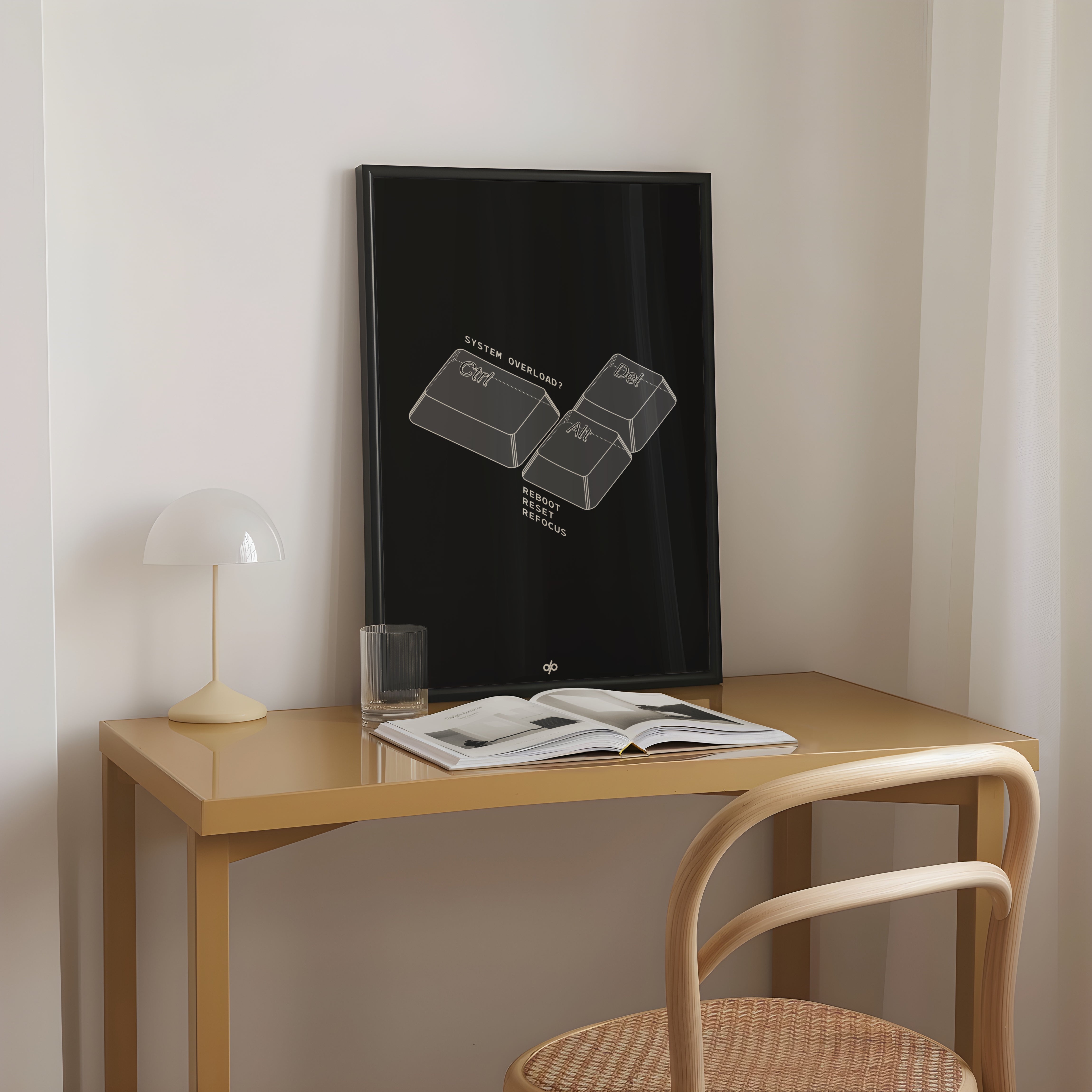 System Overload? art poster transforms the iconic Windows shortcut—Ctrl + Alt + Del—into a bold call to reset your mental system. With the words “Reboot. Reset. Refocus.” beneath the keys, this piece is designed for those moments when everything feels like too much—and a fresh start is the smartest move. It’s a minimalist reminder that even when pressure builds, you can always interrupt the cycle, take a breath, and return stronger.