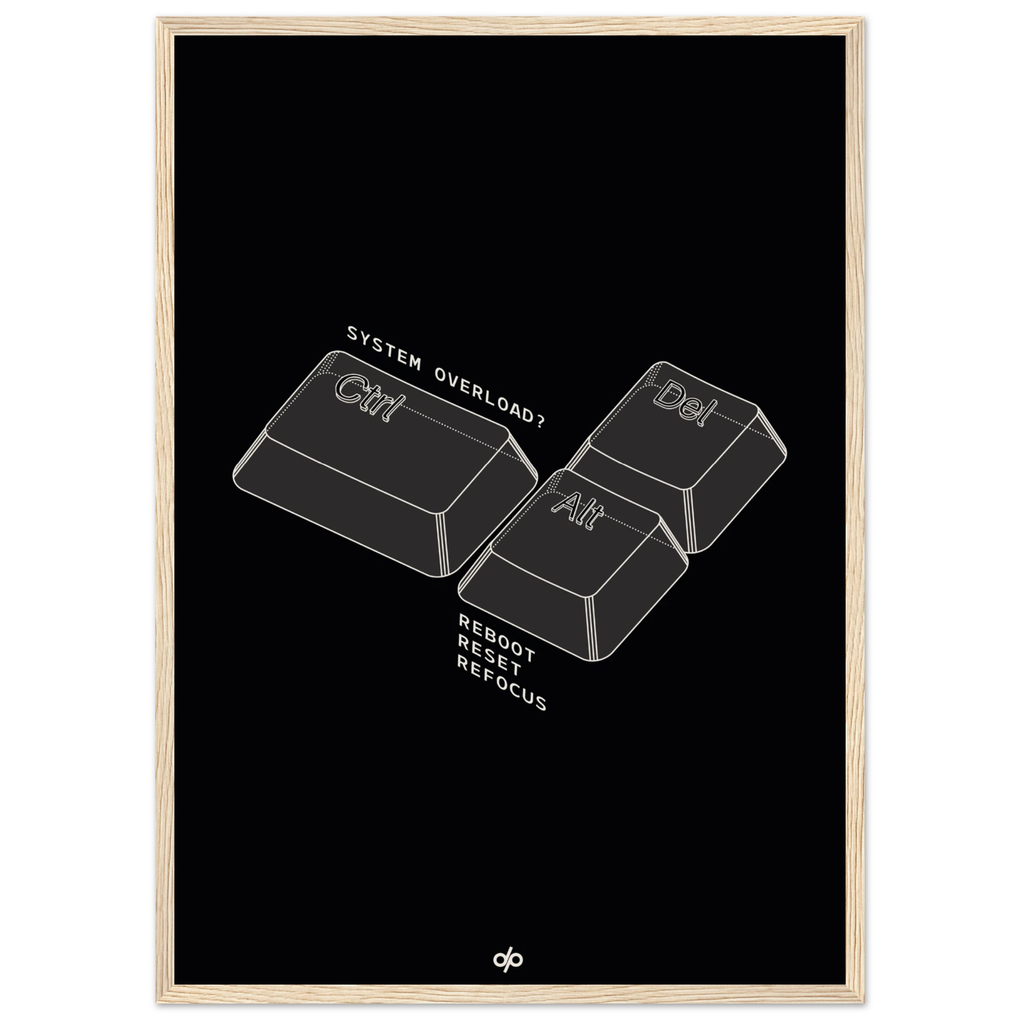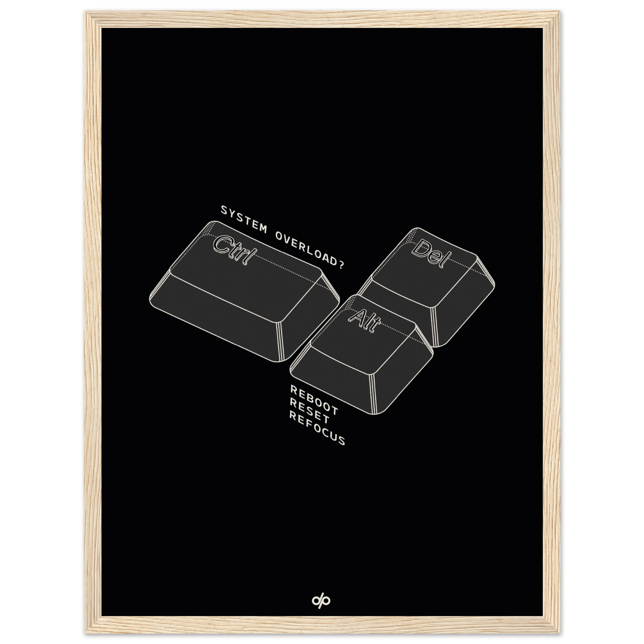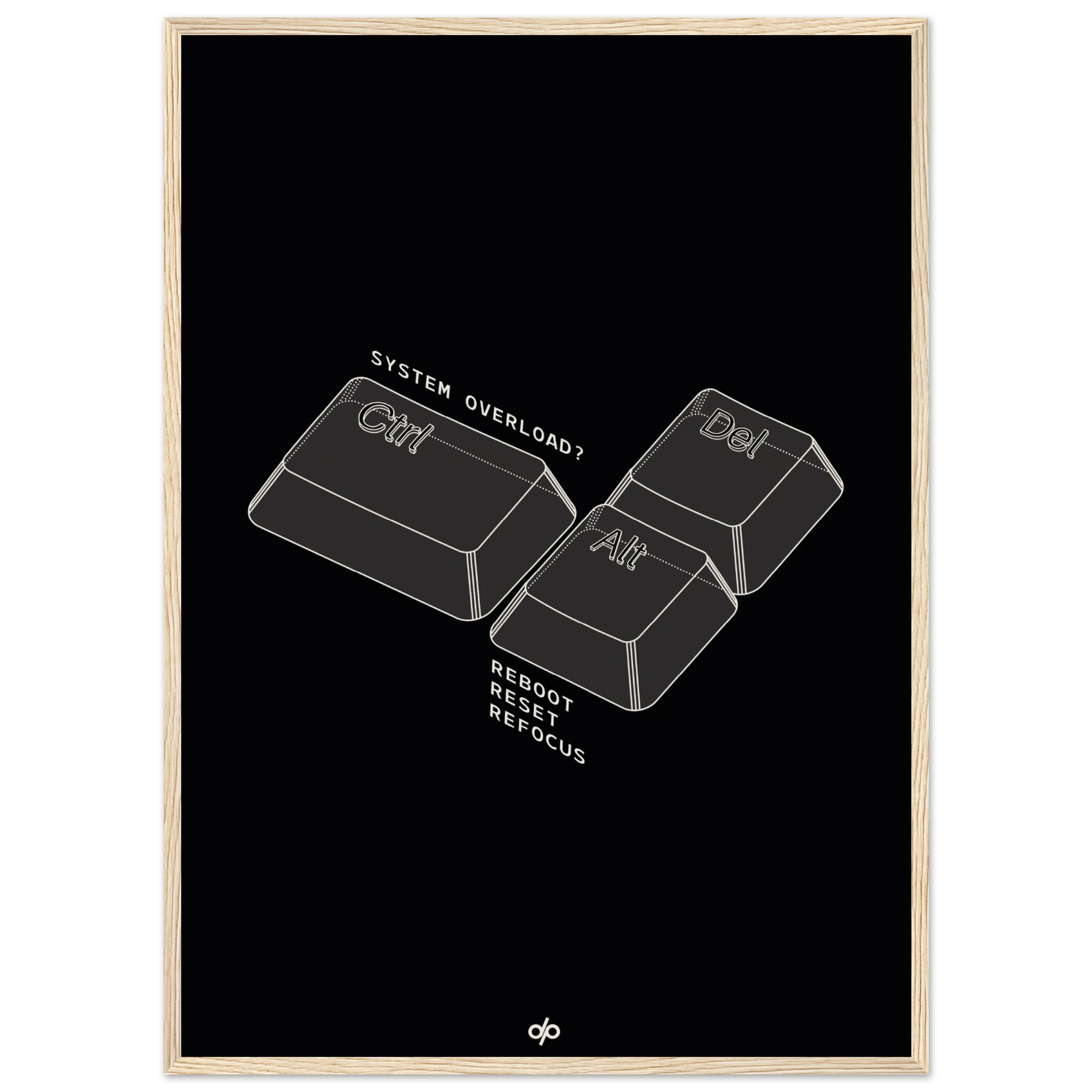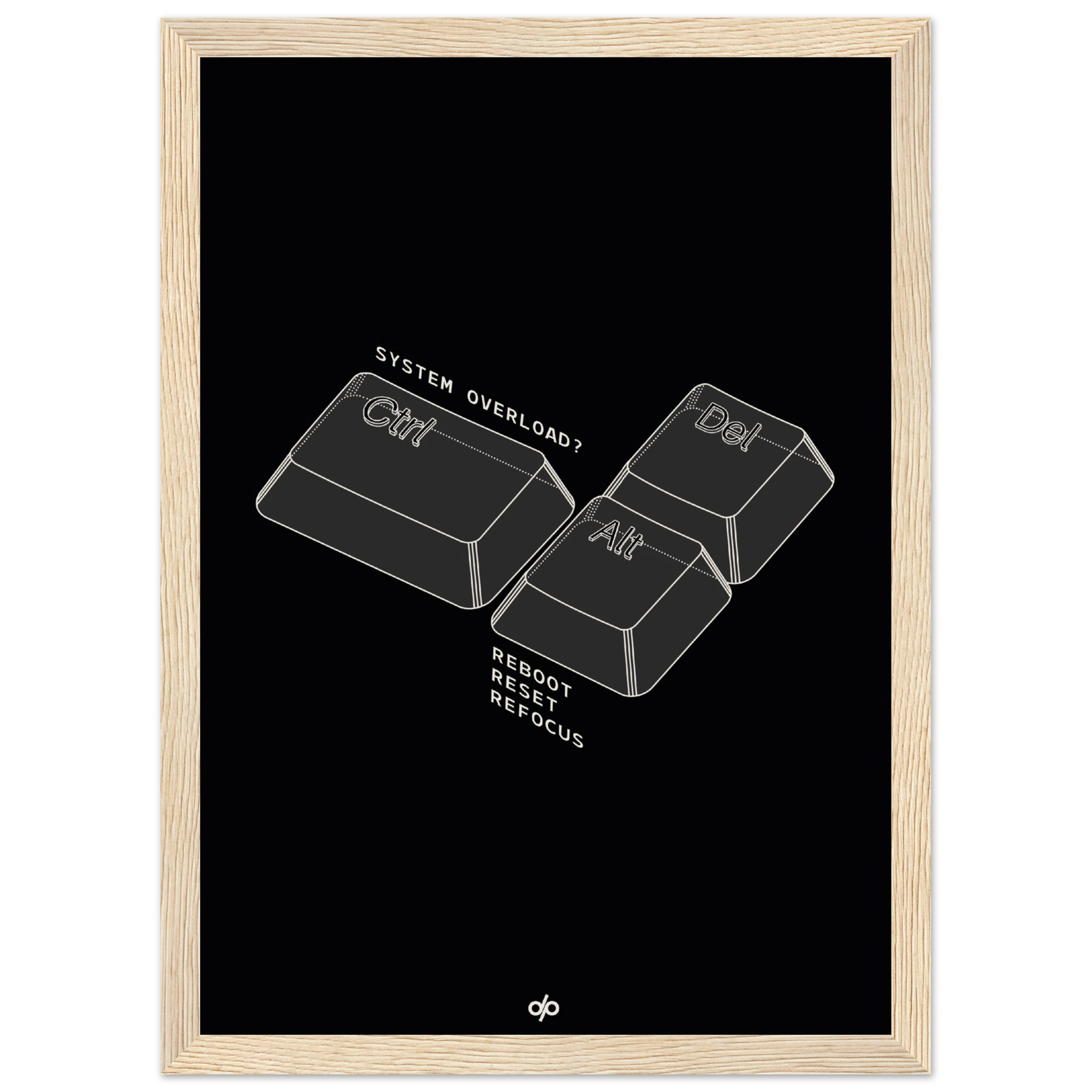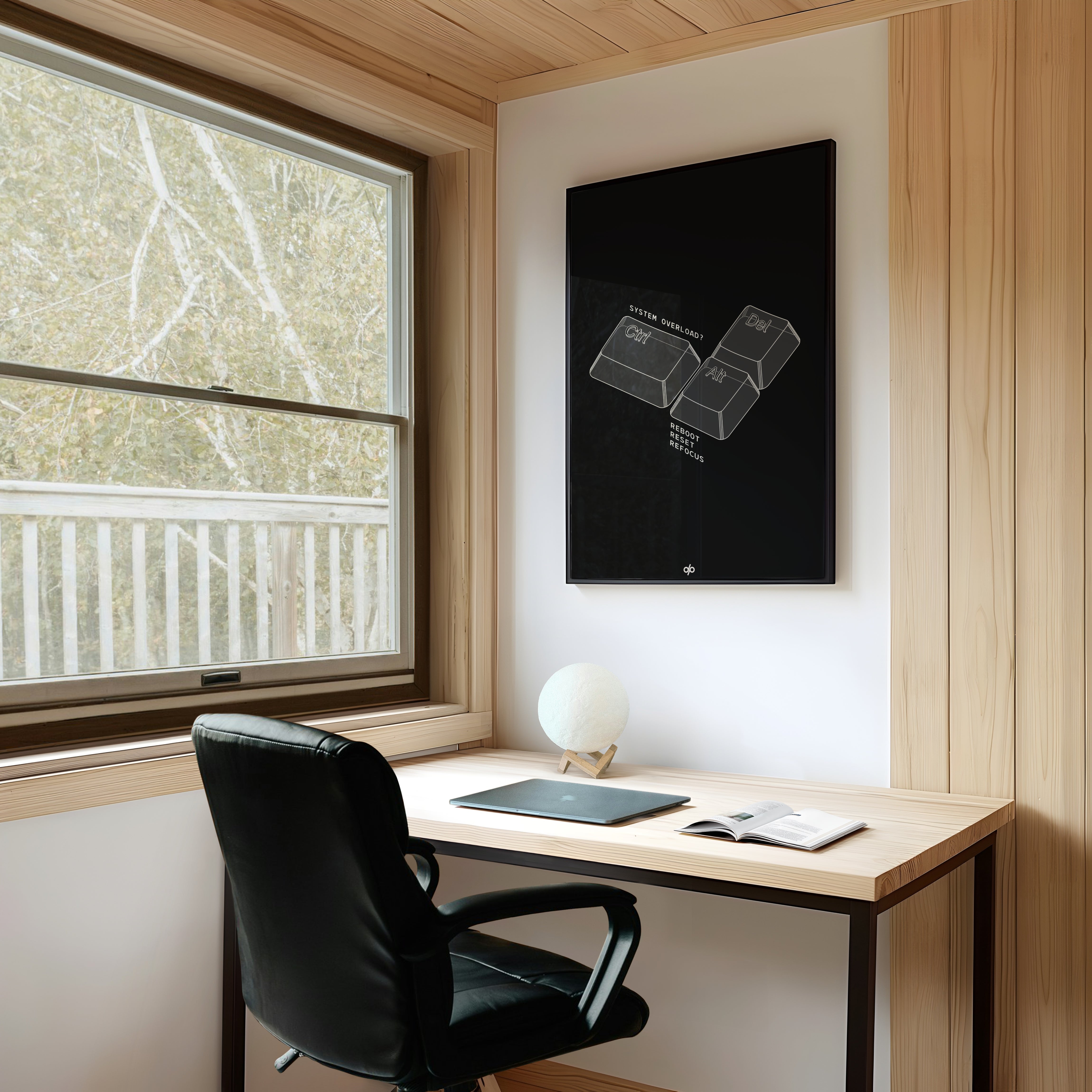 System Overload? art poster transforms the iconic Windows shortcut—Ctrl + Alt + Del—into a bold call to reset your mental system. With the words “Reboot. Reset. Refocus.” beneath the keys, this piece is designed for those moments when everything feels like too much—and a fresh start is the smartest move. It’s a minimalist reminder that even when pressure builds, you can always interrupt the cycle, take a breath, and return stronger.