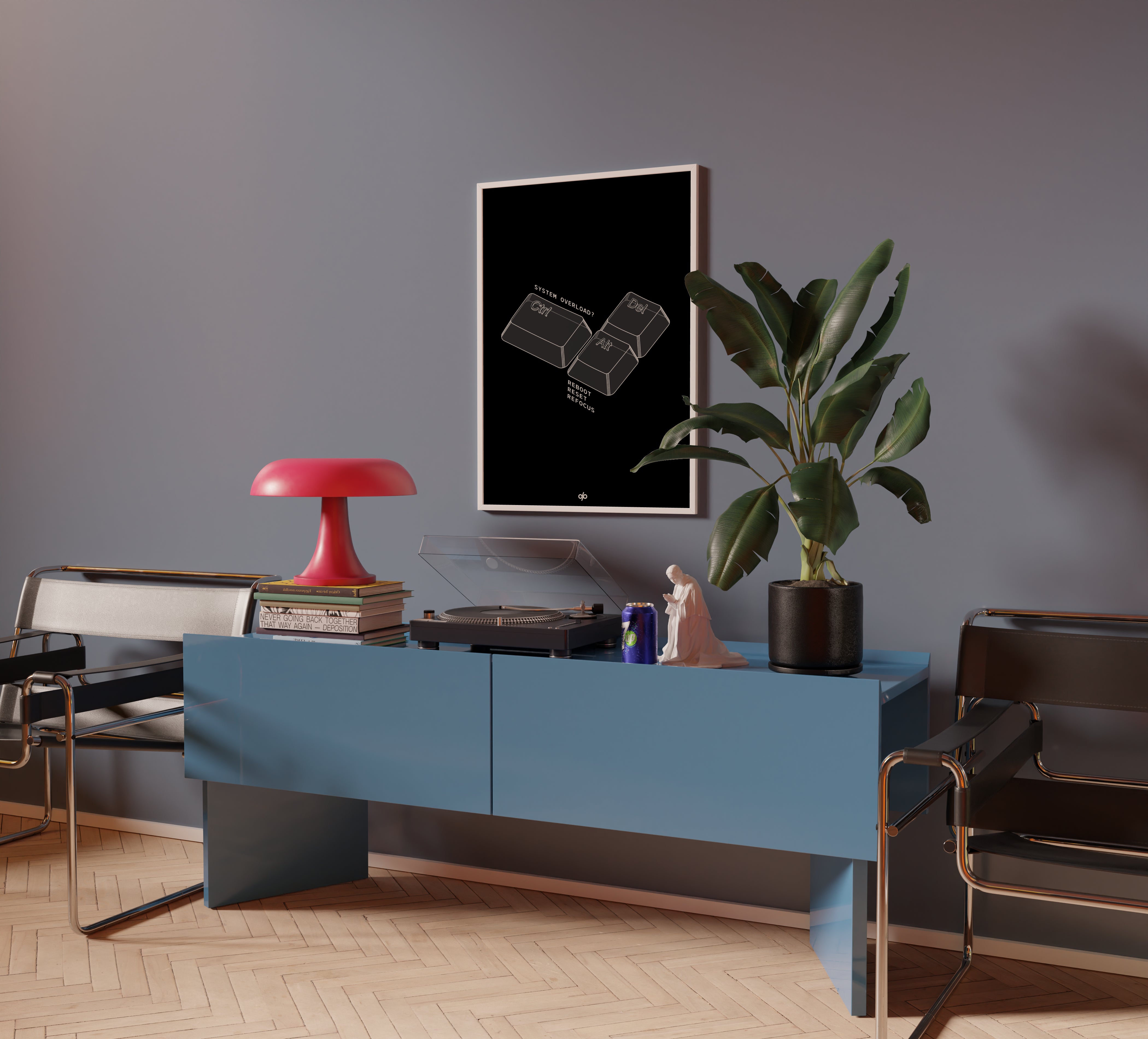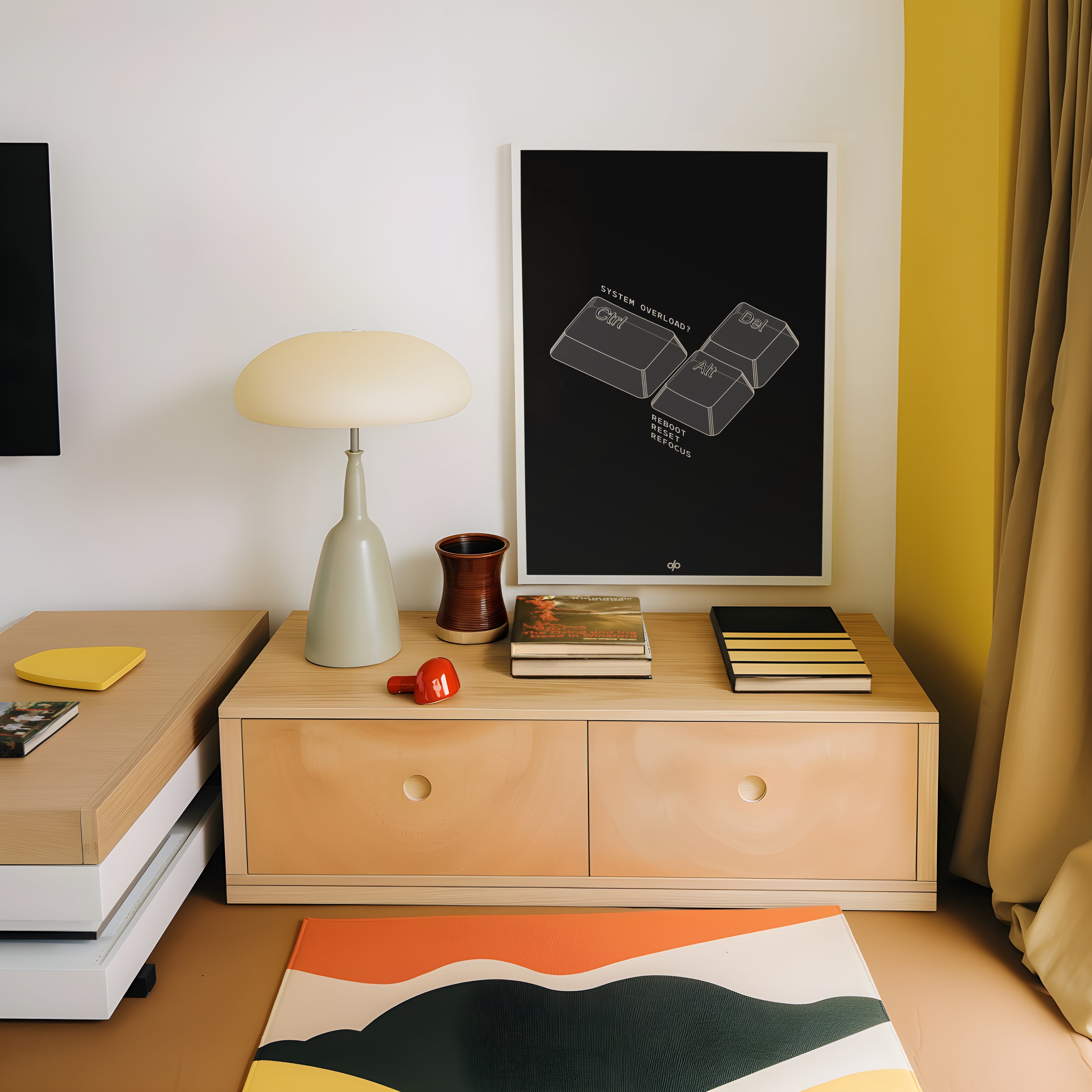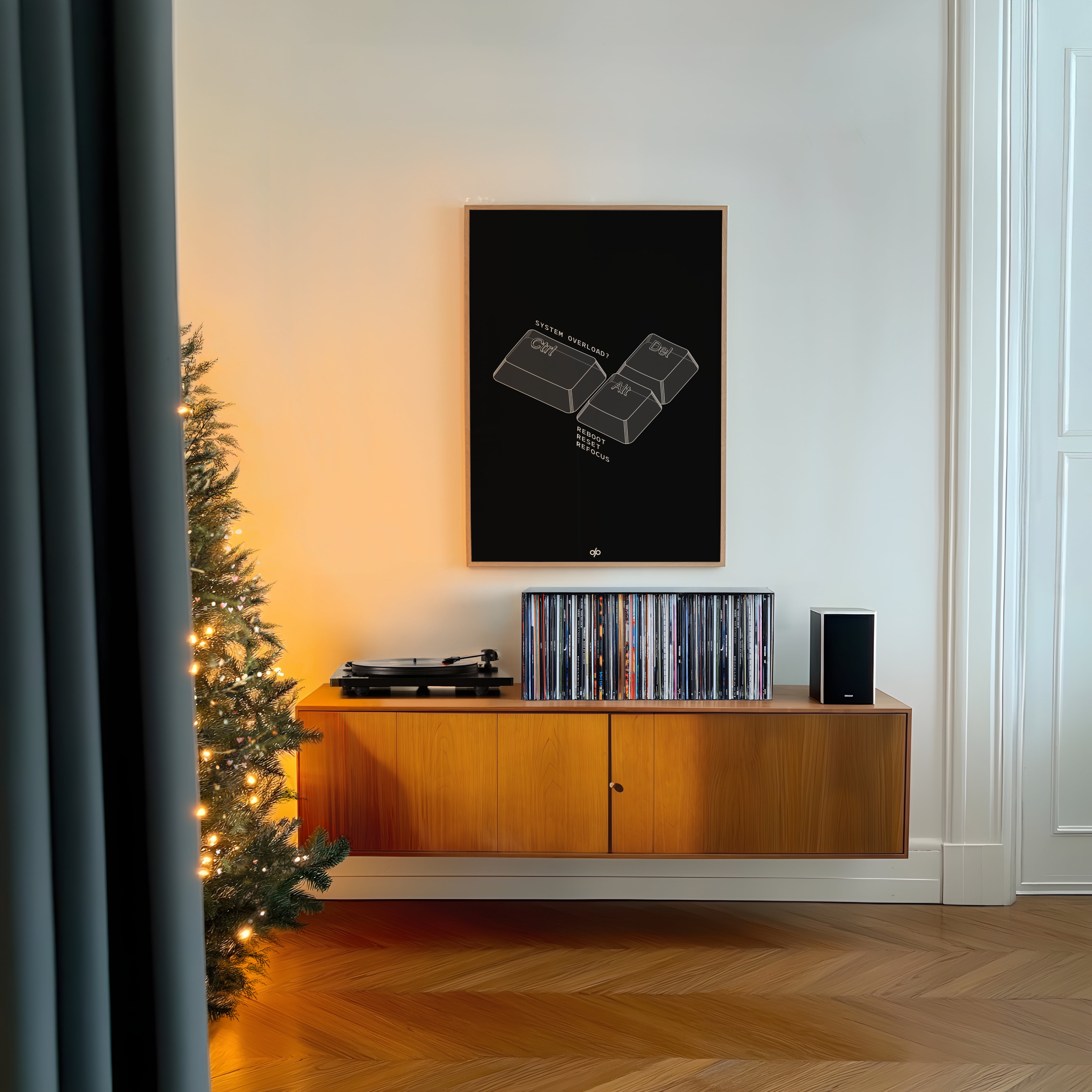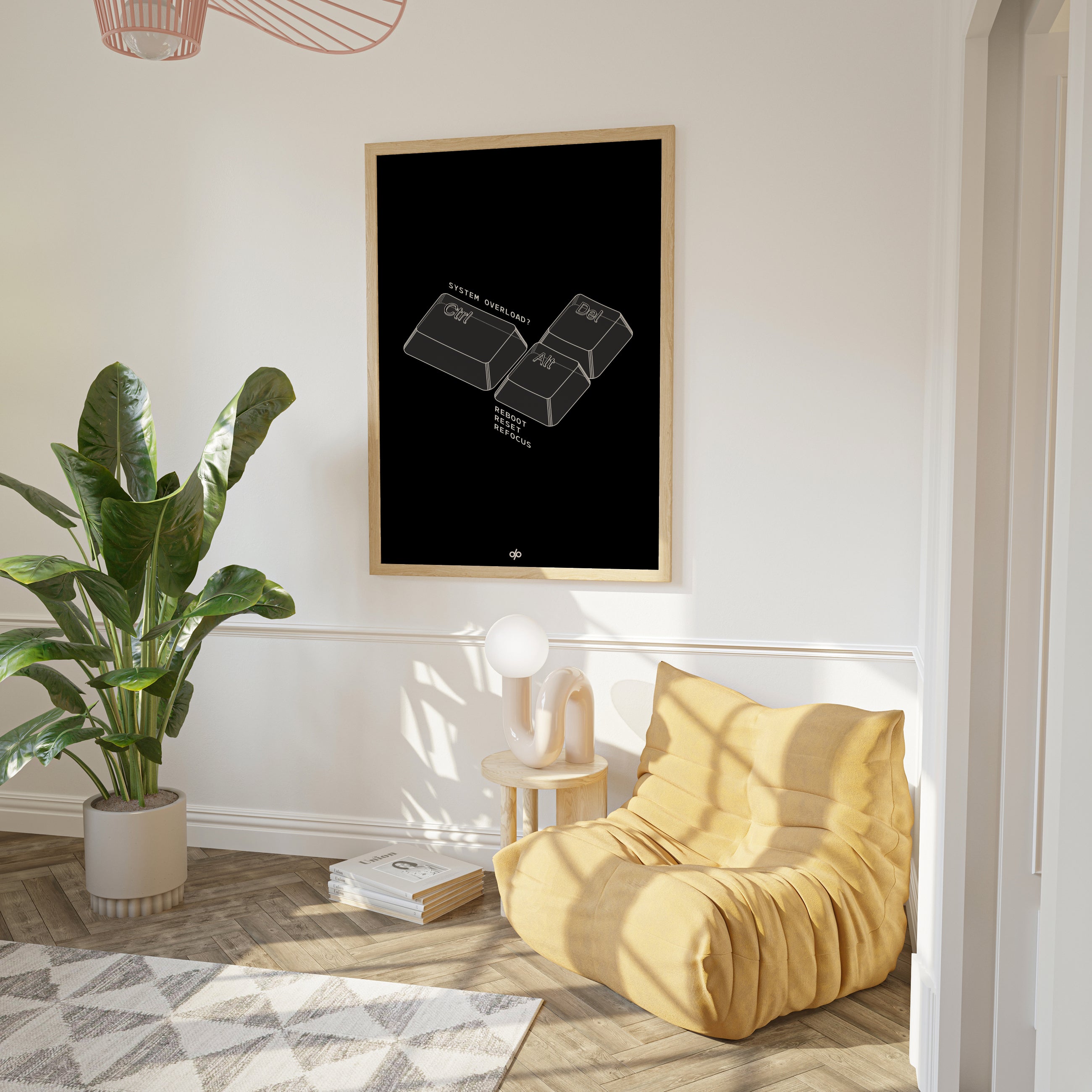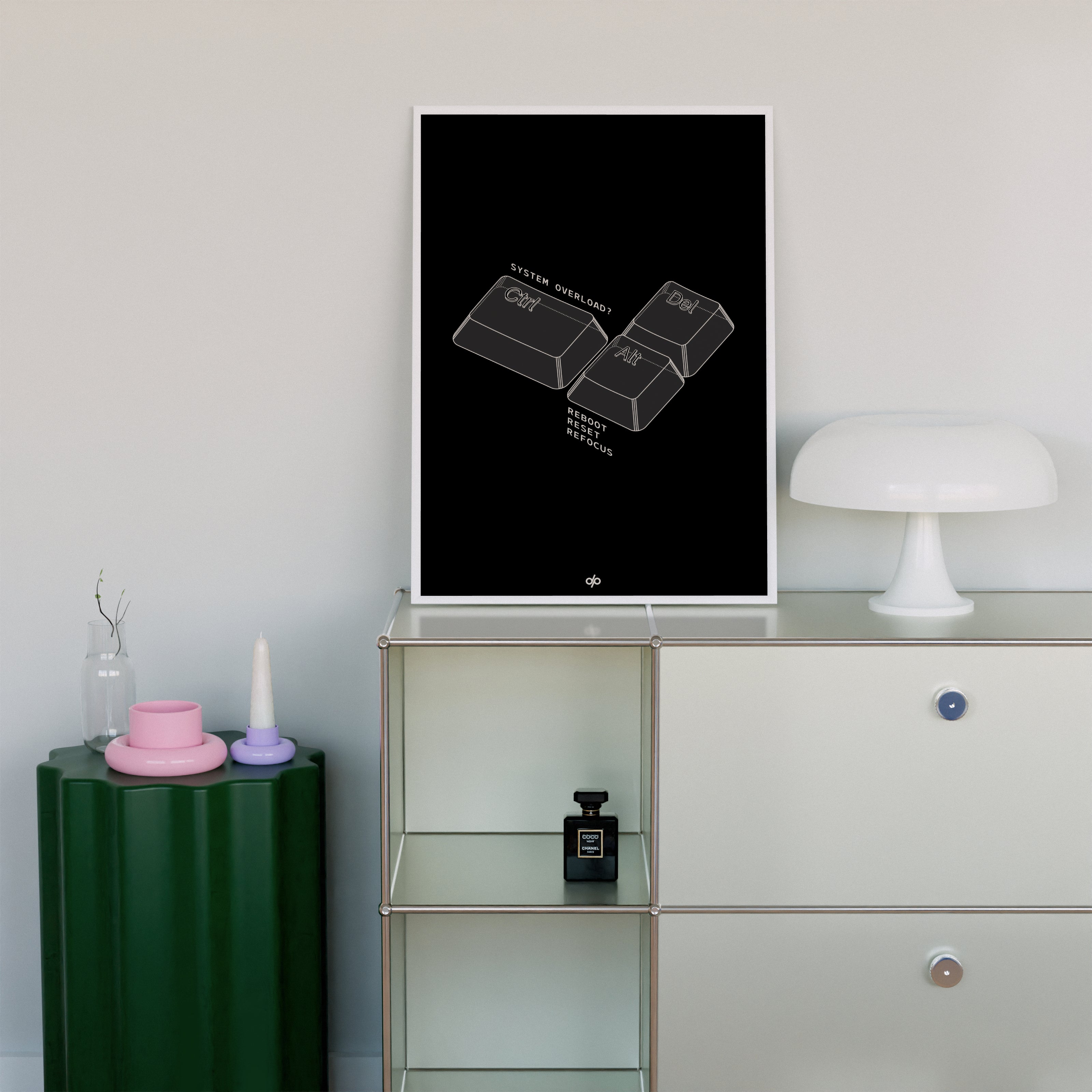 System Overload? art poster transforms the iconic Windows shortcut—Ctrl + Alt + Del—into a bold call to reset your mental system. With the words “Reboot. Reset. Refocus.” beneath the keys, this piece is designed for those moments when everything feels like too much—and a fresh start is the smartest move. It’s a minimalist reminder that even when pressure builds, you can always interrupt the cycle, take a breath, and return stronger.
